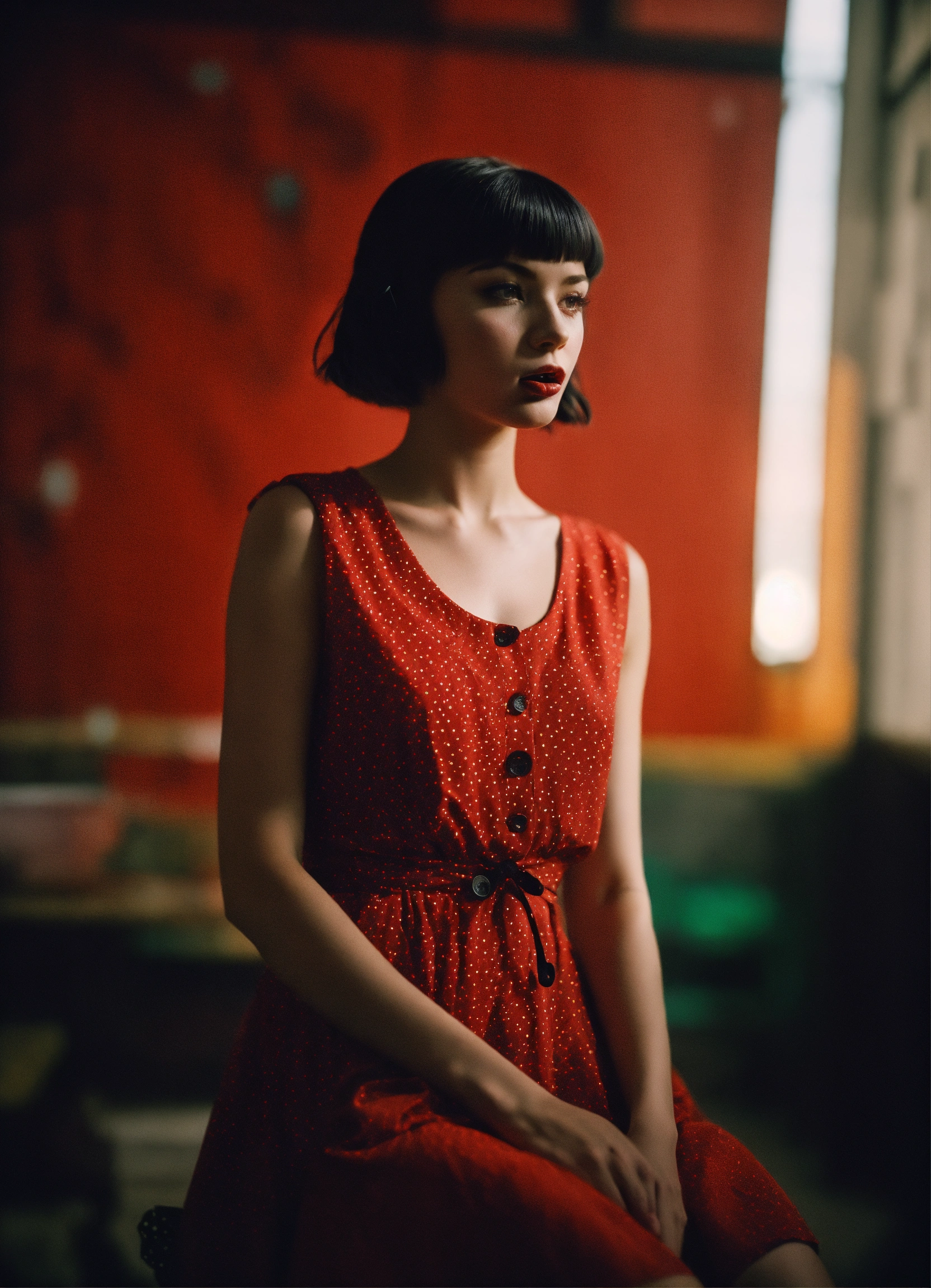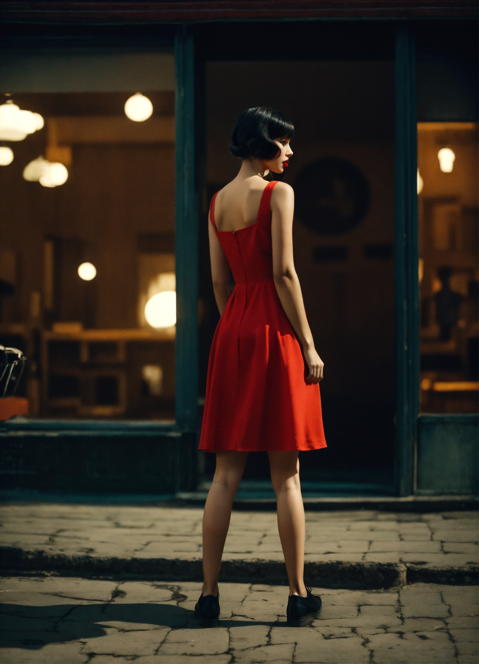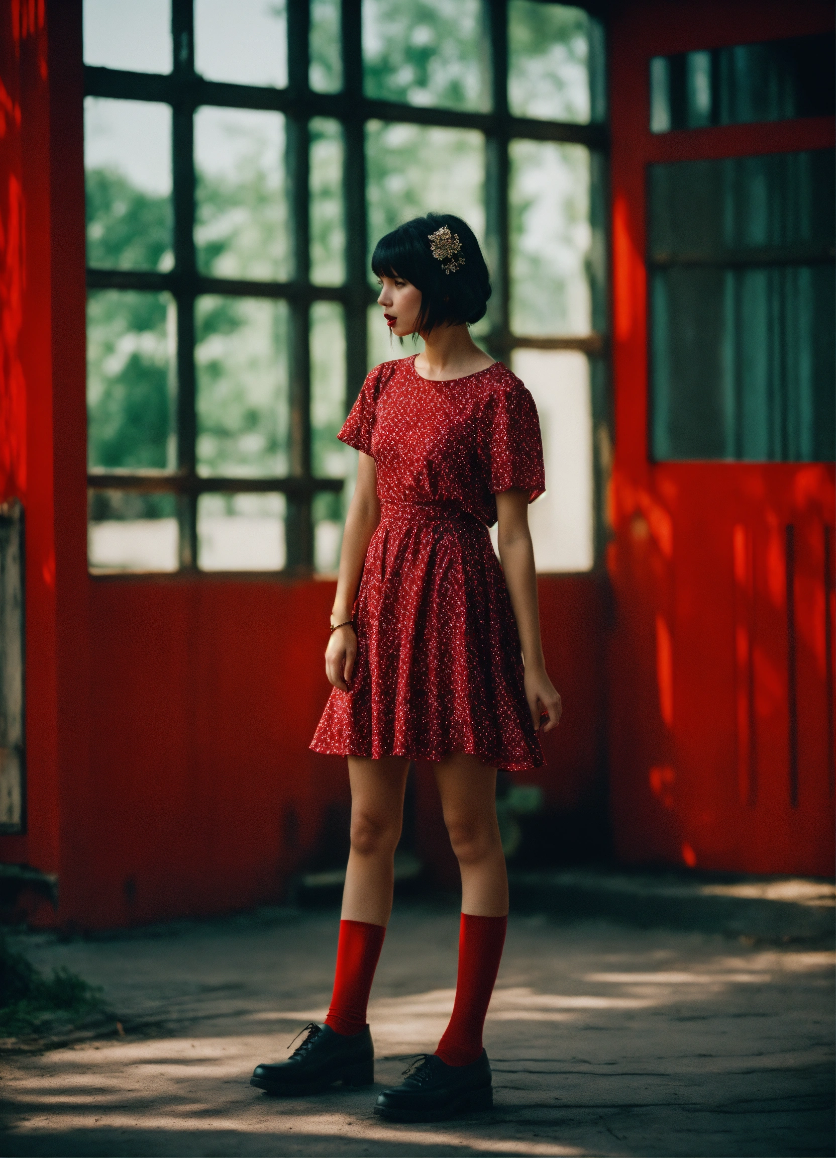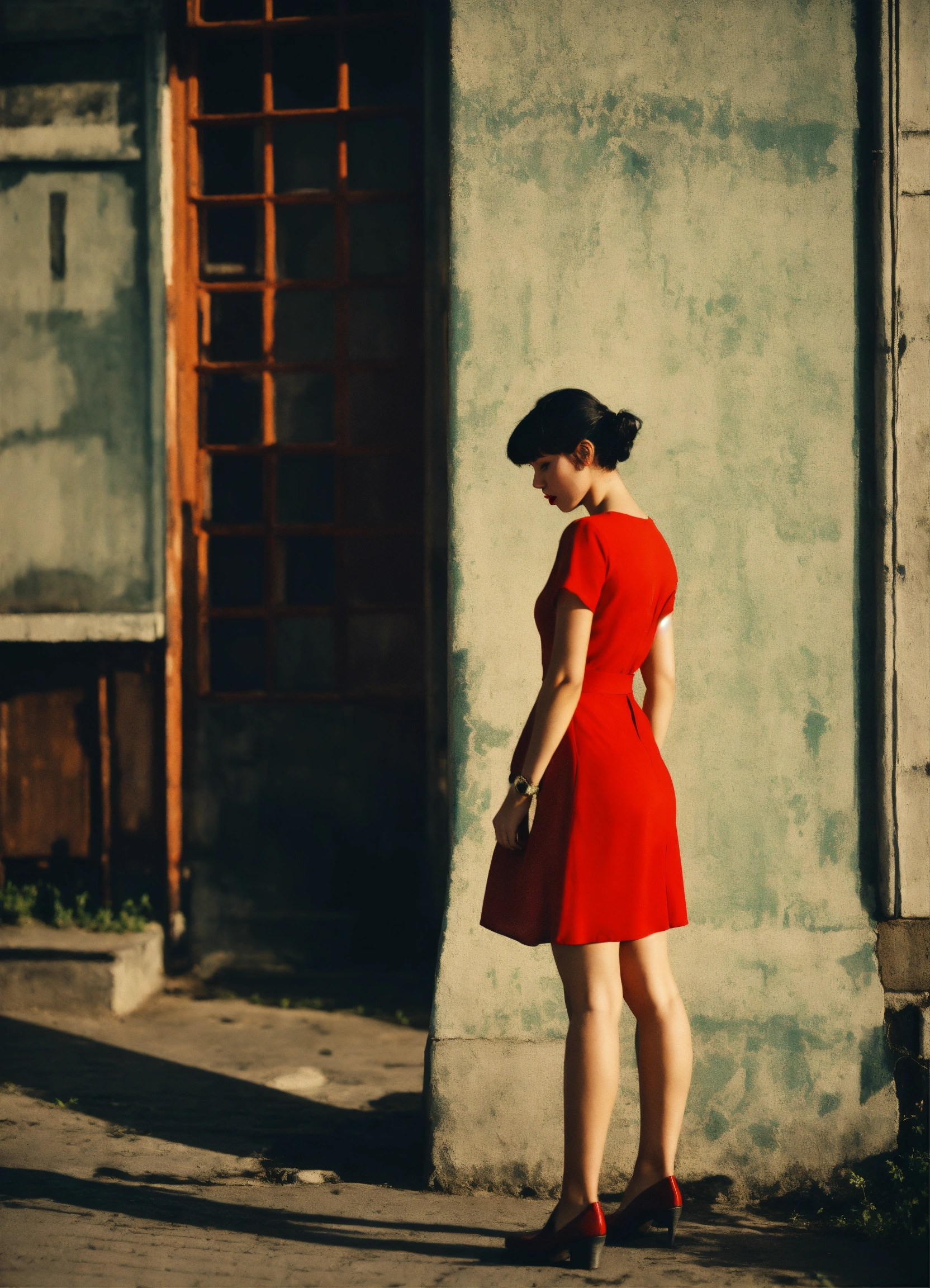 Girl, red dress, short hair, summer, twintails, black hair, legs, stuck out his tongue, ussr, coded patterns, sparse and simple, uhd image, urbancore, sovietwave, shadowplay, film grain, dark hues, moody, stunning masterpiece