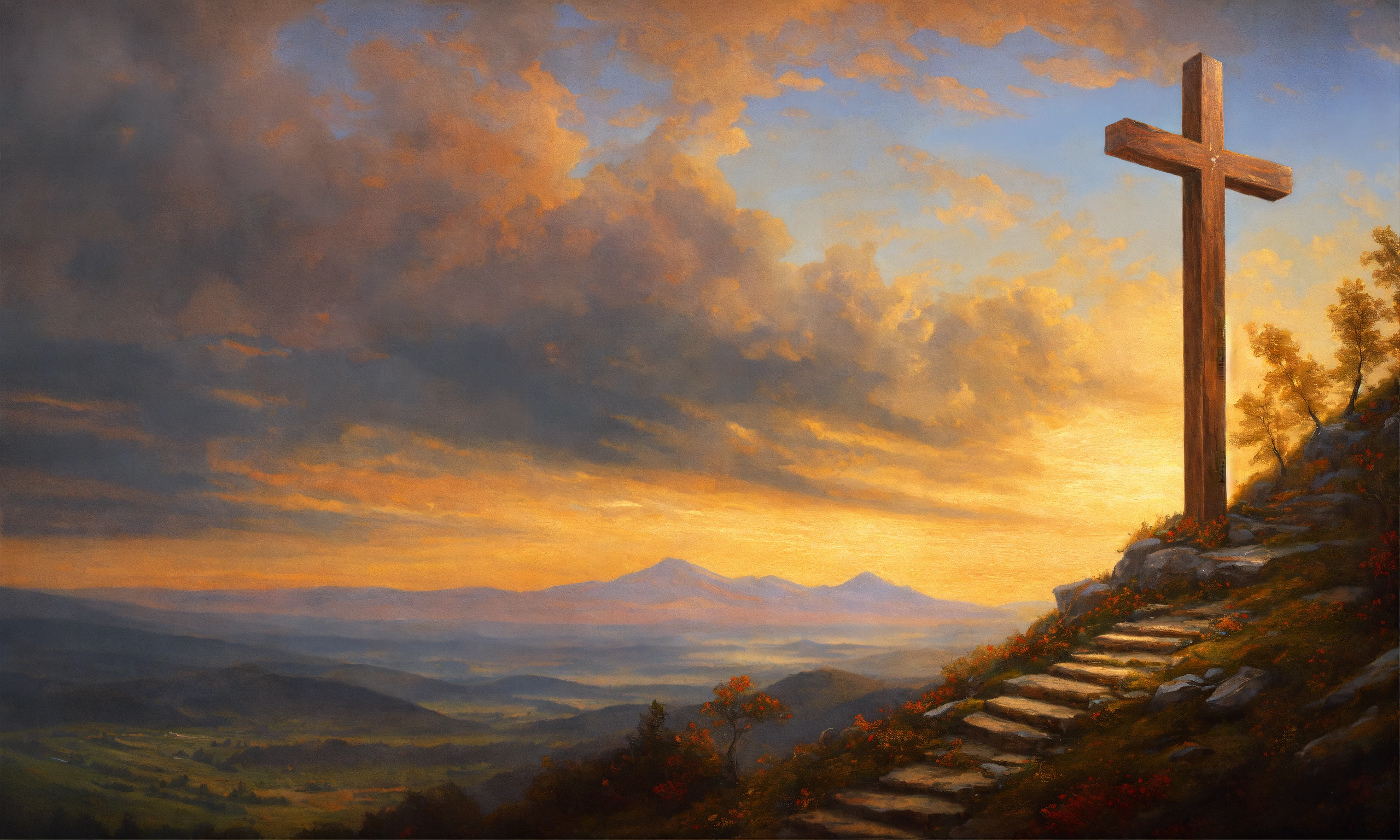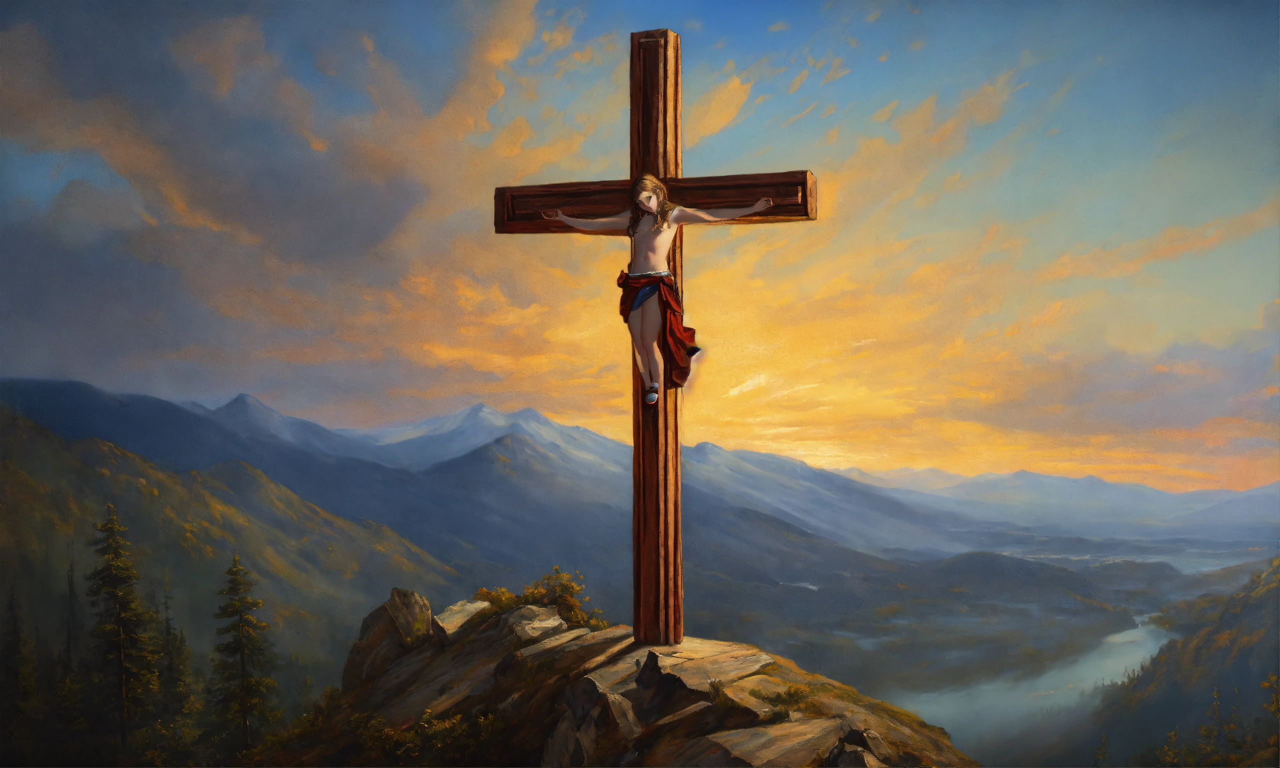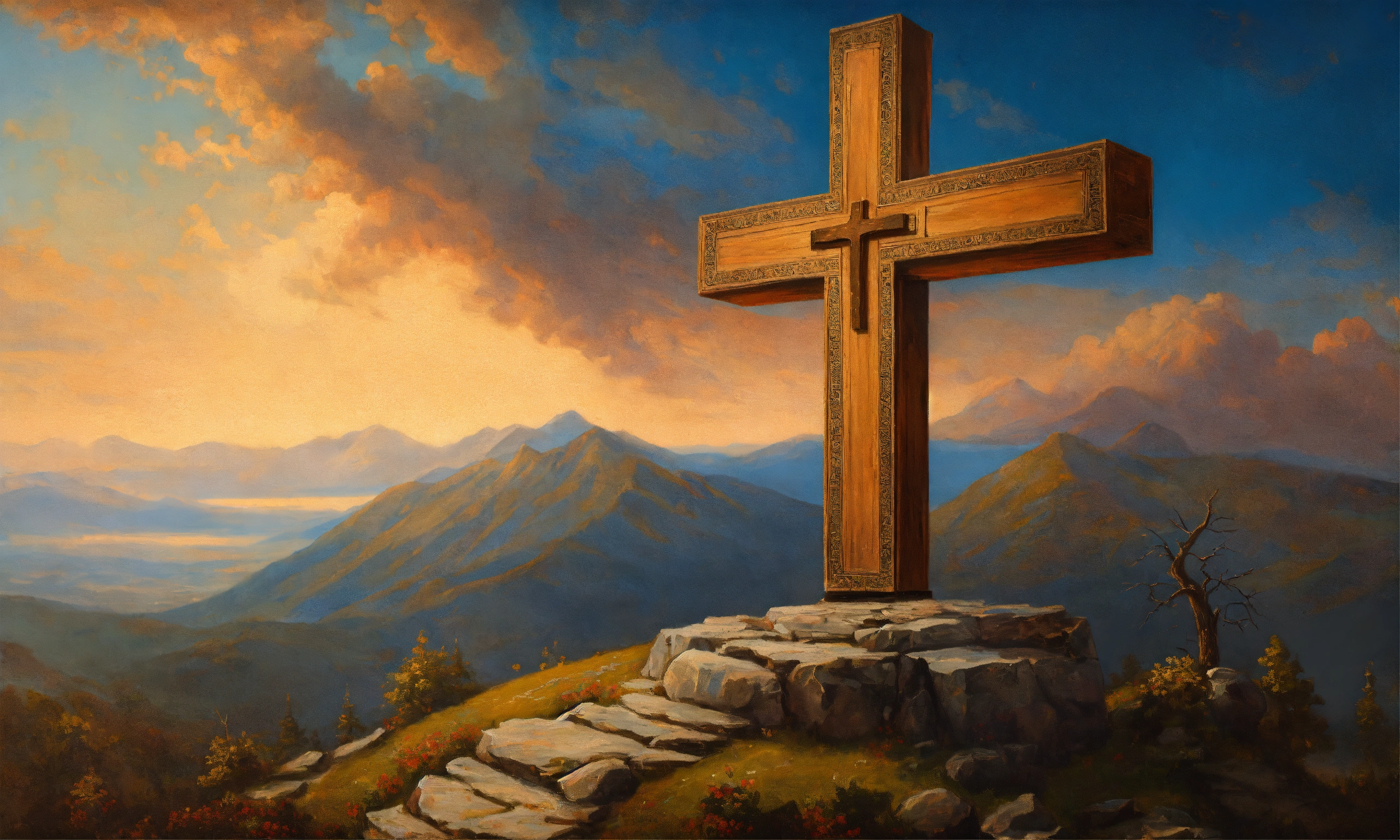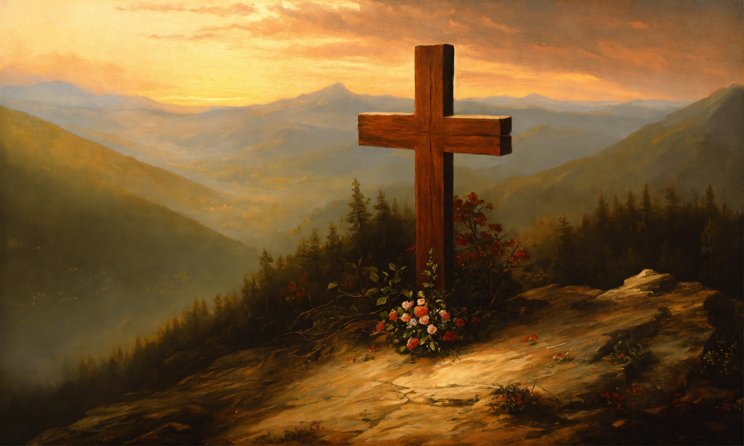 Renaissance oil painting of a wooden cross on top of a mountain