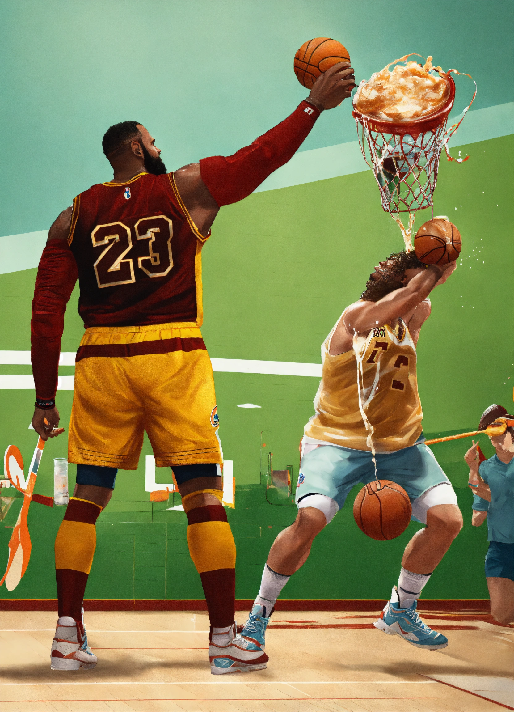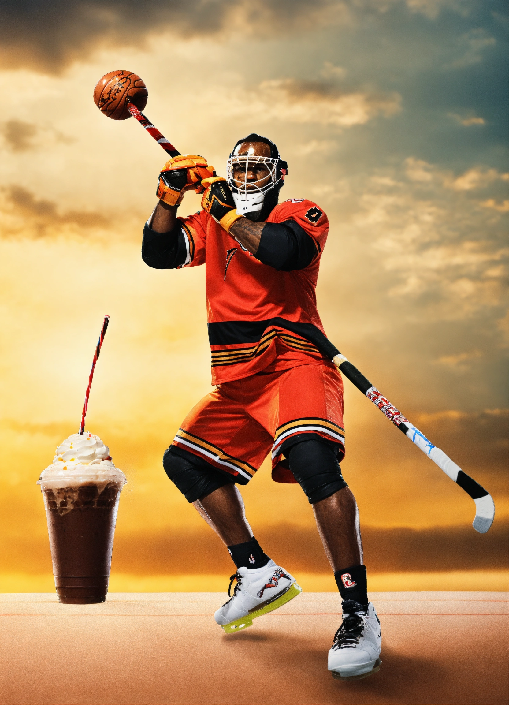 Hockey goalie dunking on lebron while drinking a milkshake and throwing a spear