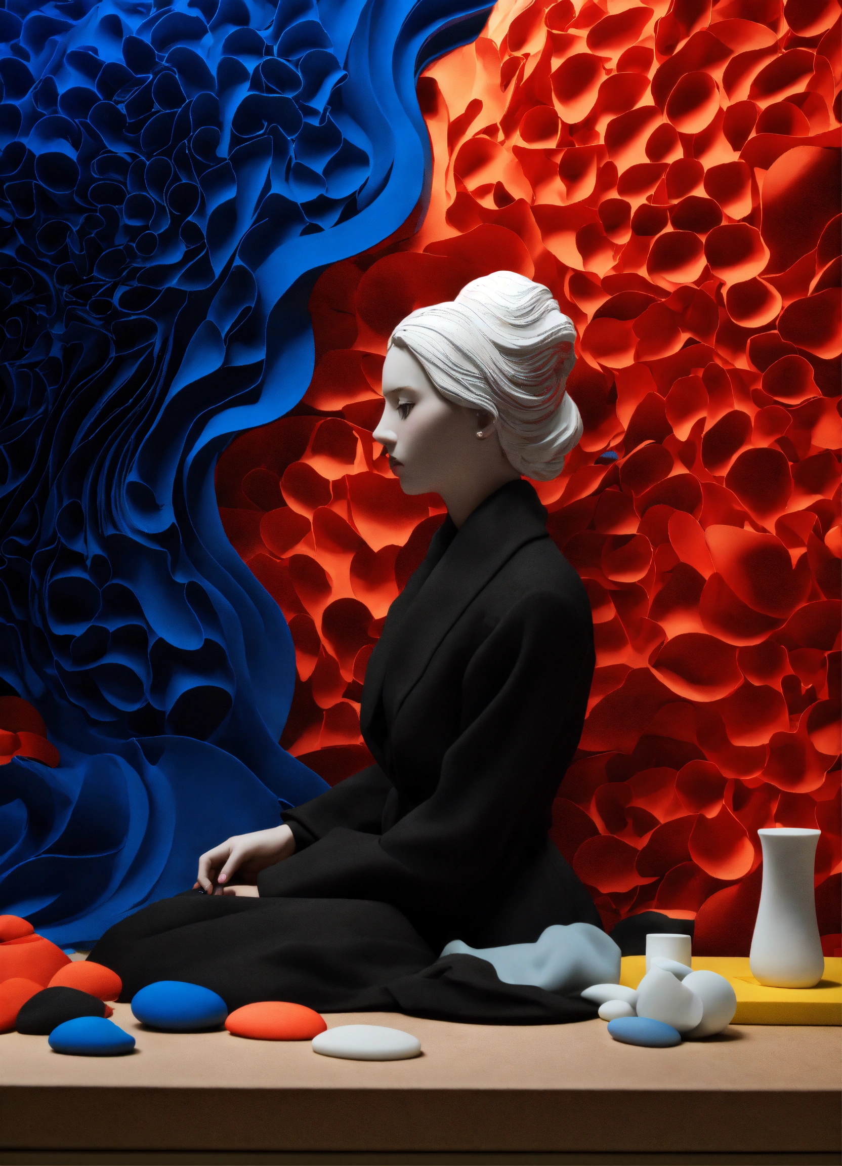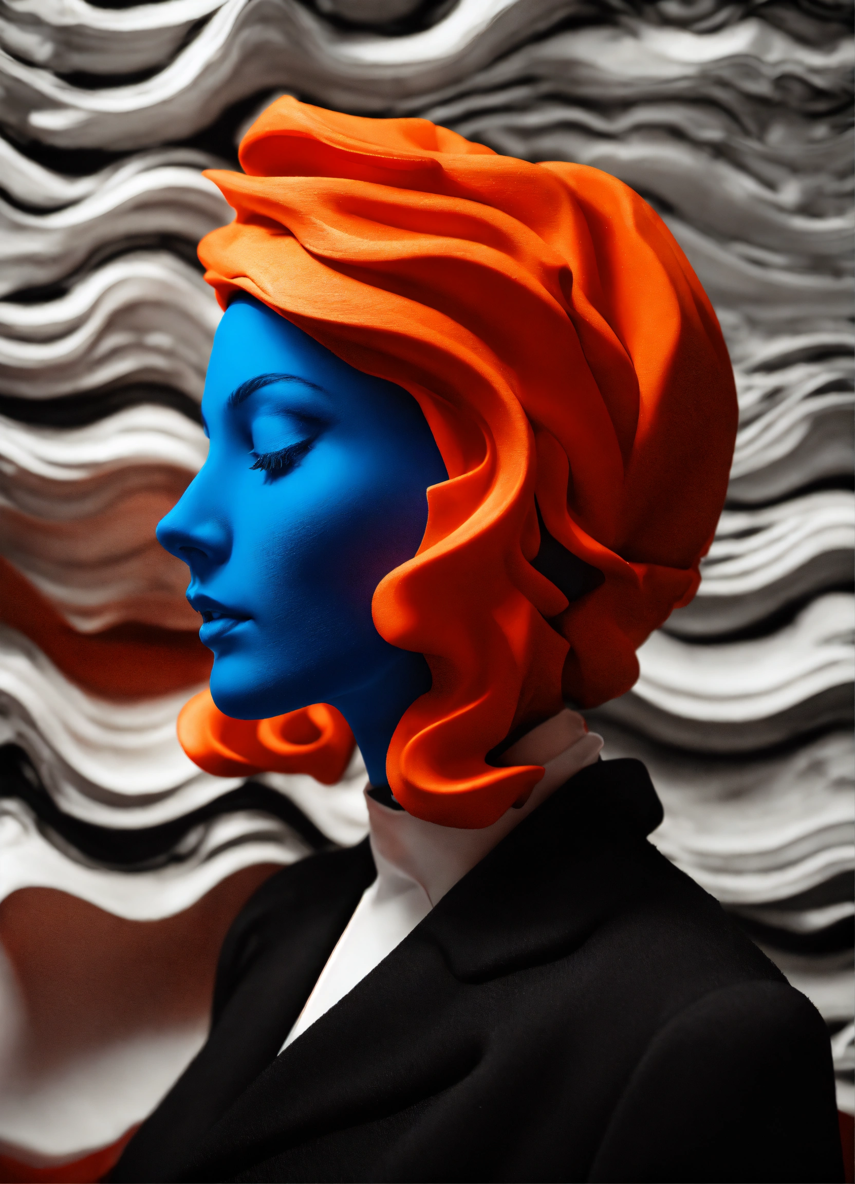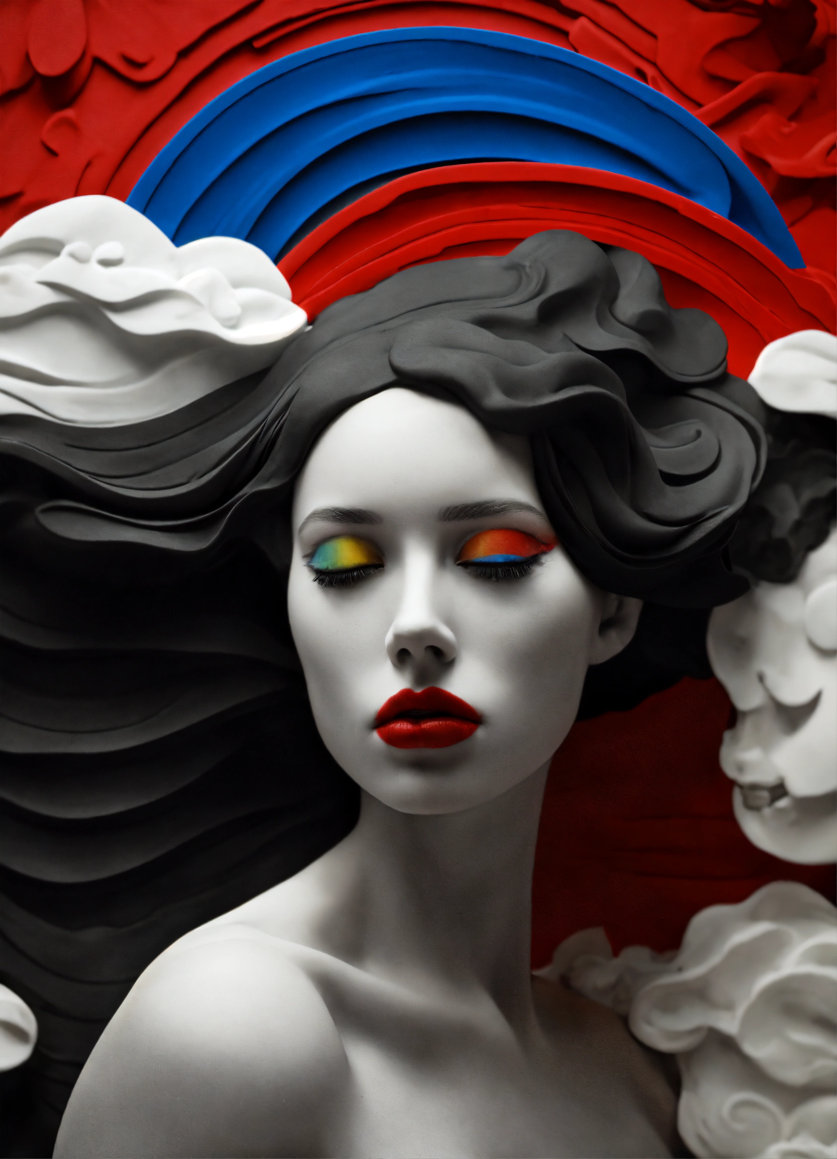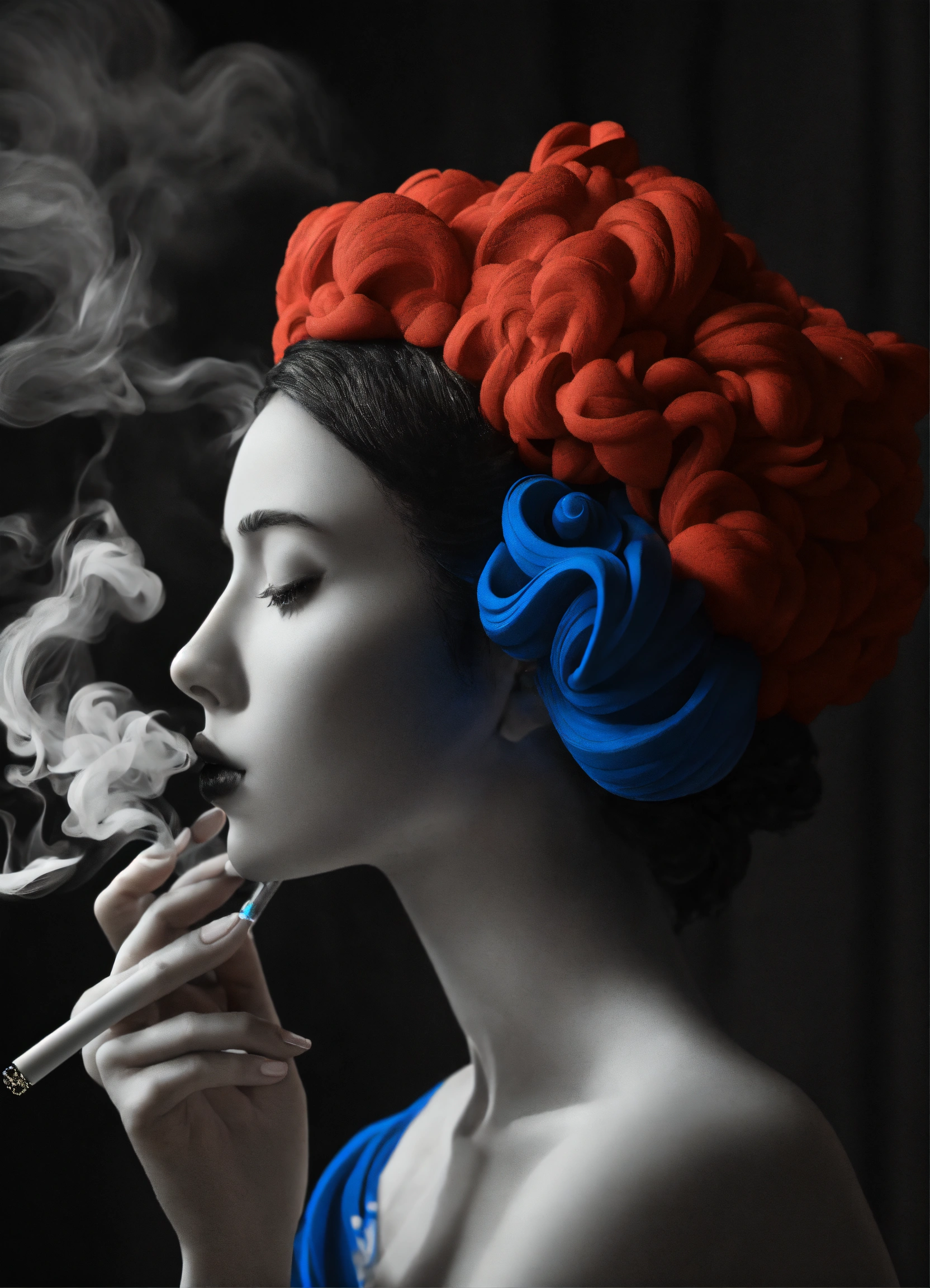 Black and white and primary colors, 3d modeling clay abstract waves, realistic smoking woman photography, immersive inspired dremascape, dystopic, rené magritte inspiration.