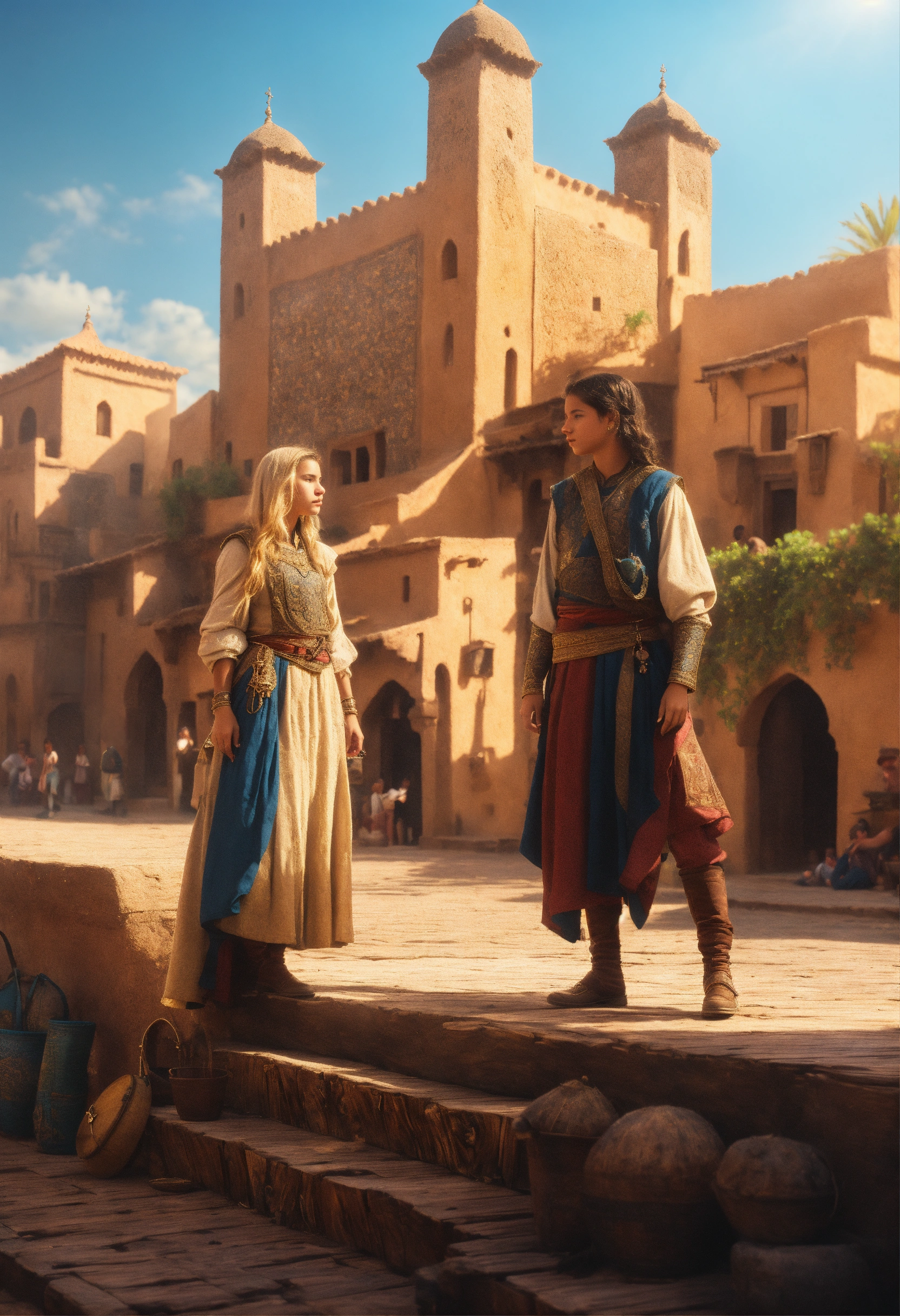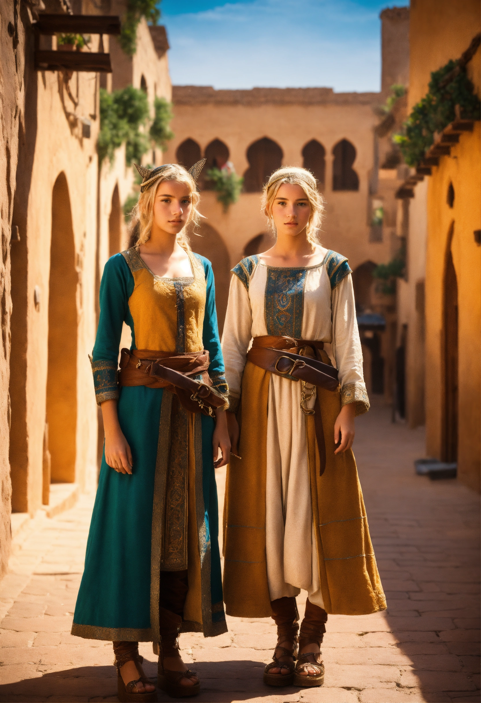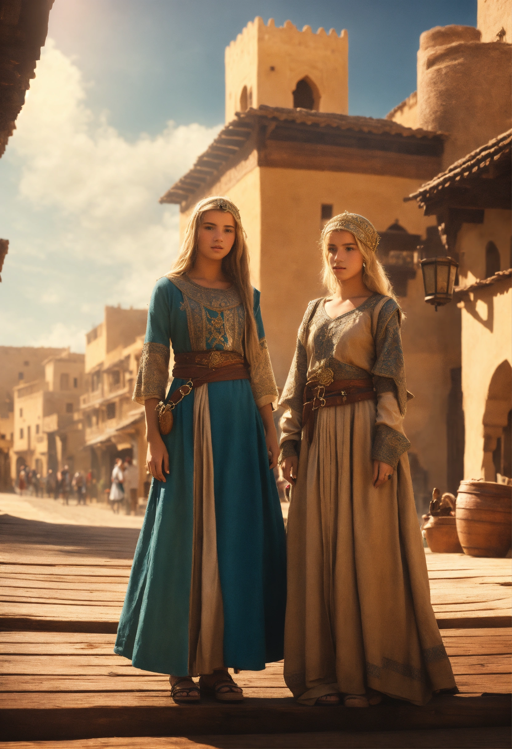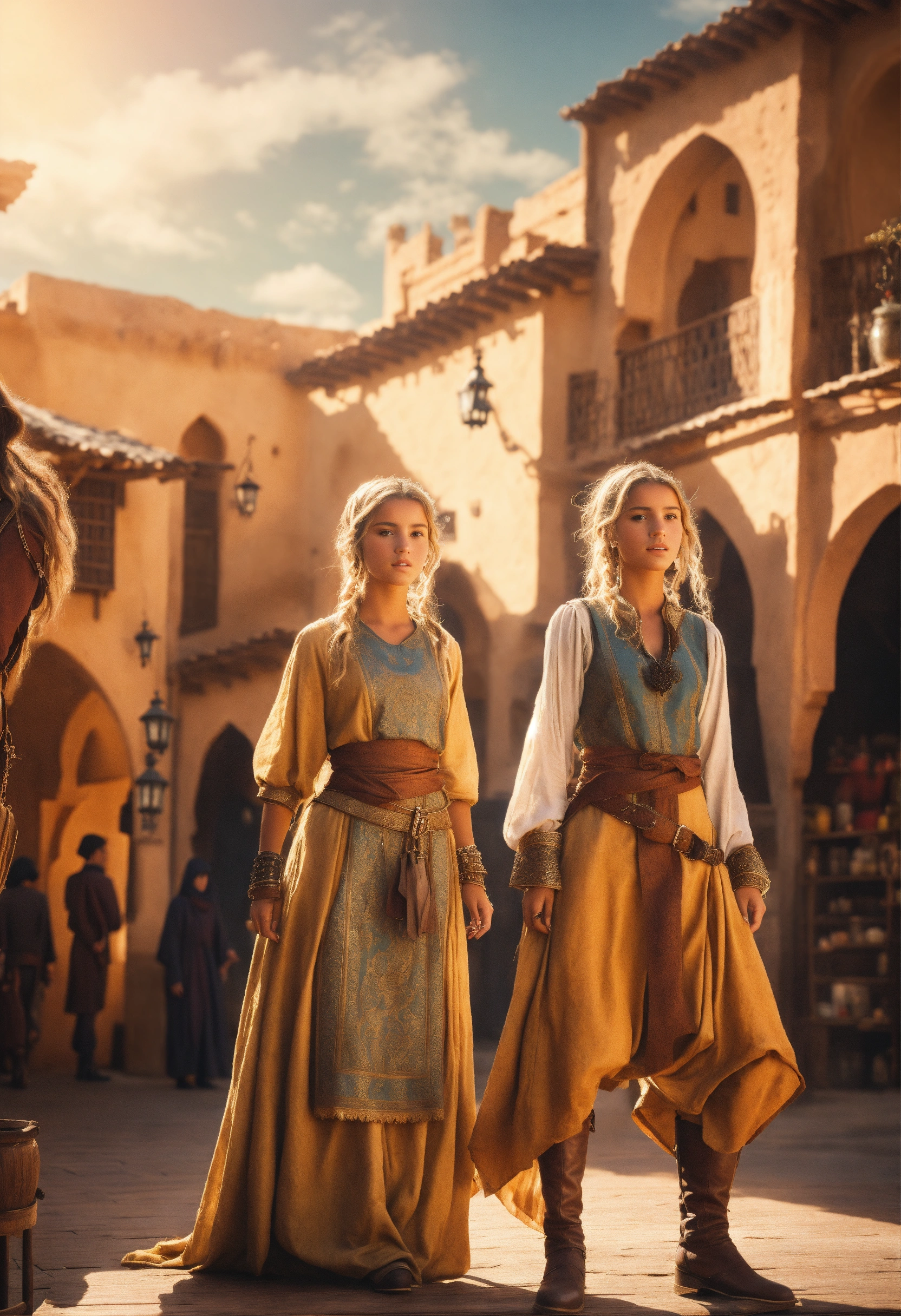 An epic fantasy scene featuring 15-years old french twins - a blonde and brunette mounted on a wooden platform to be seen from arabian merchants around in a medieval morroco town. sunny day. cinematic view, sharp detail.