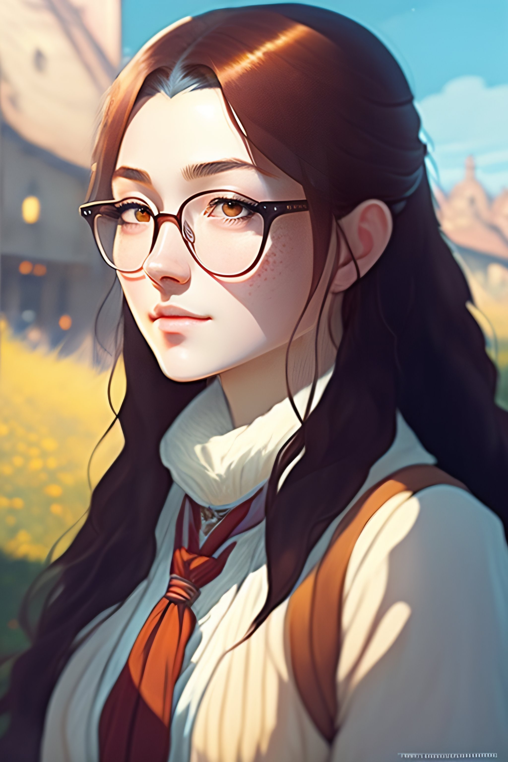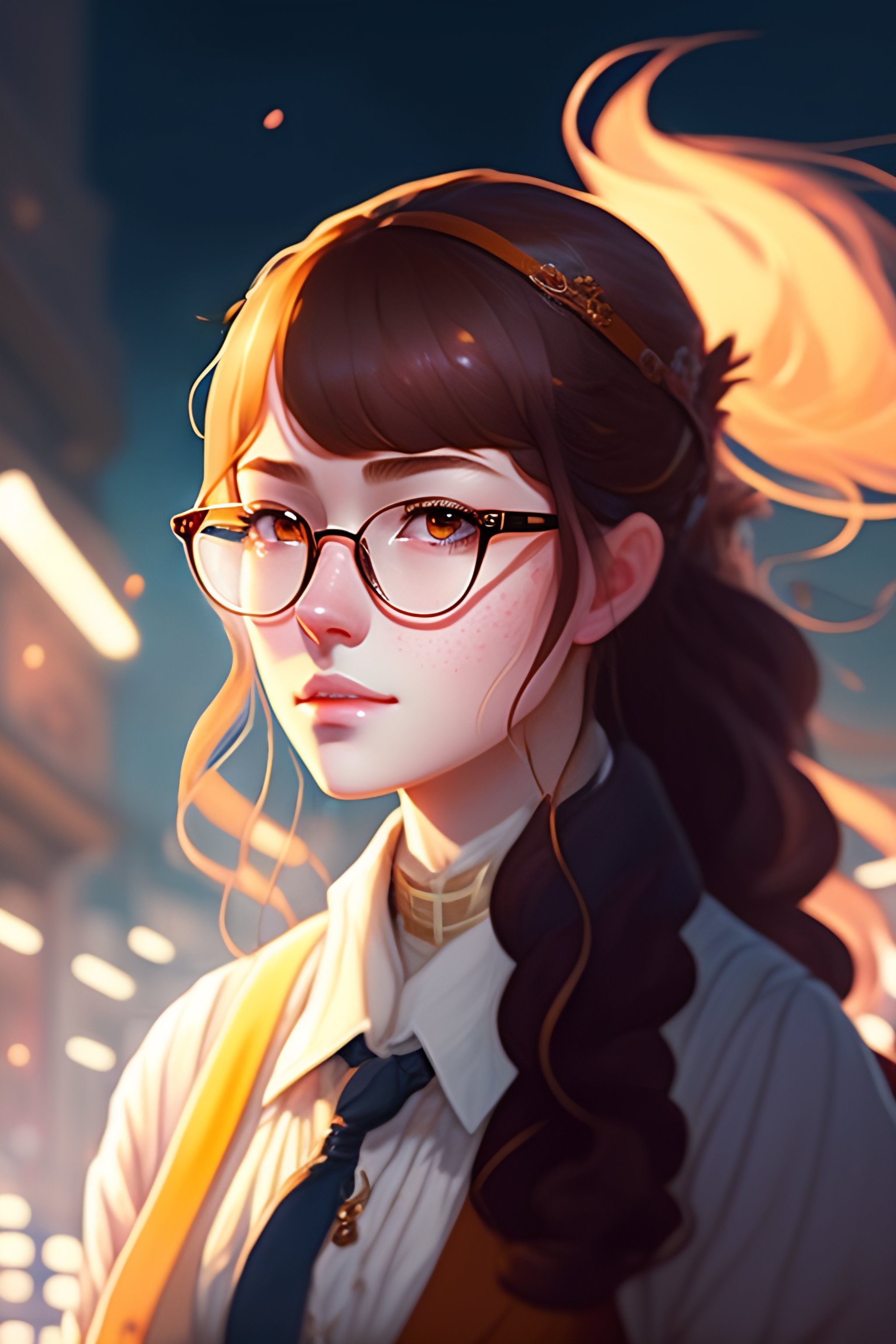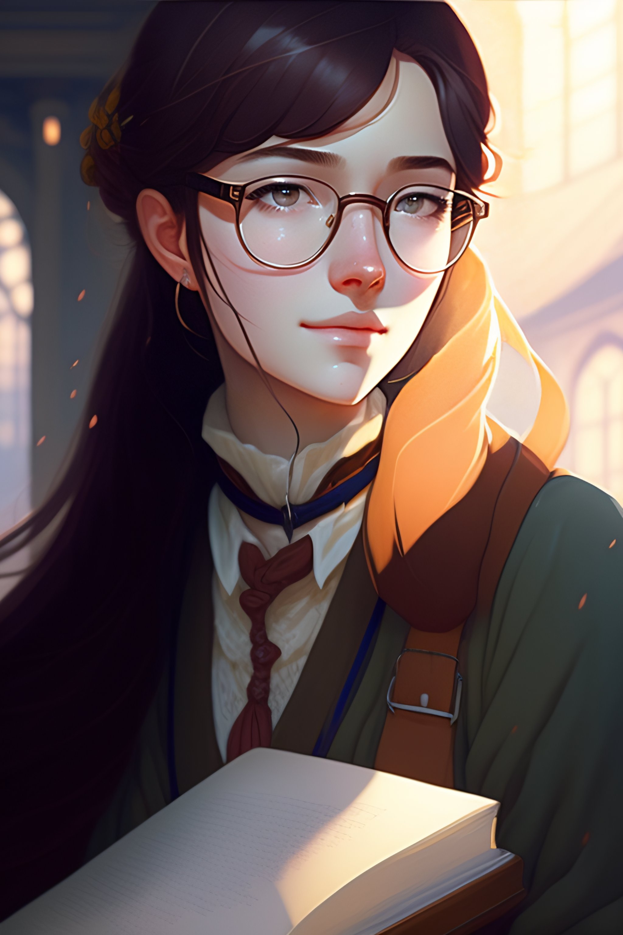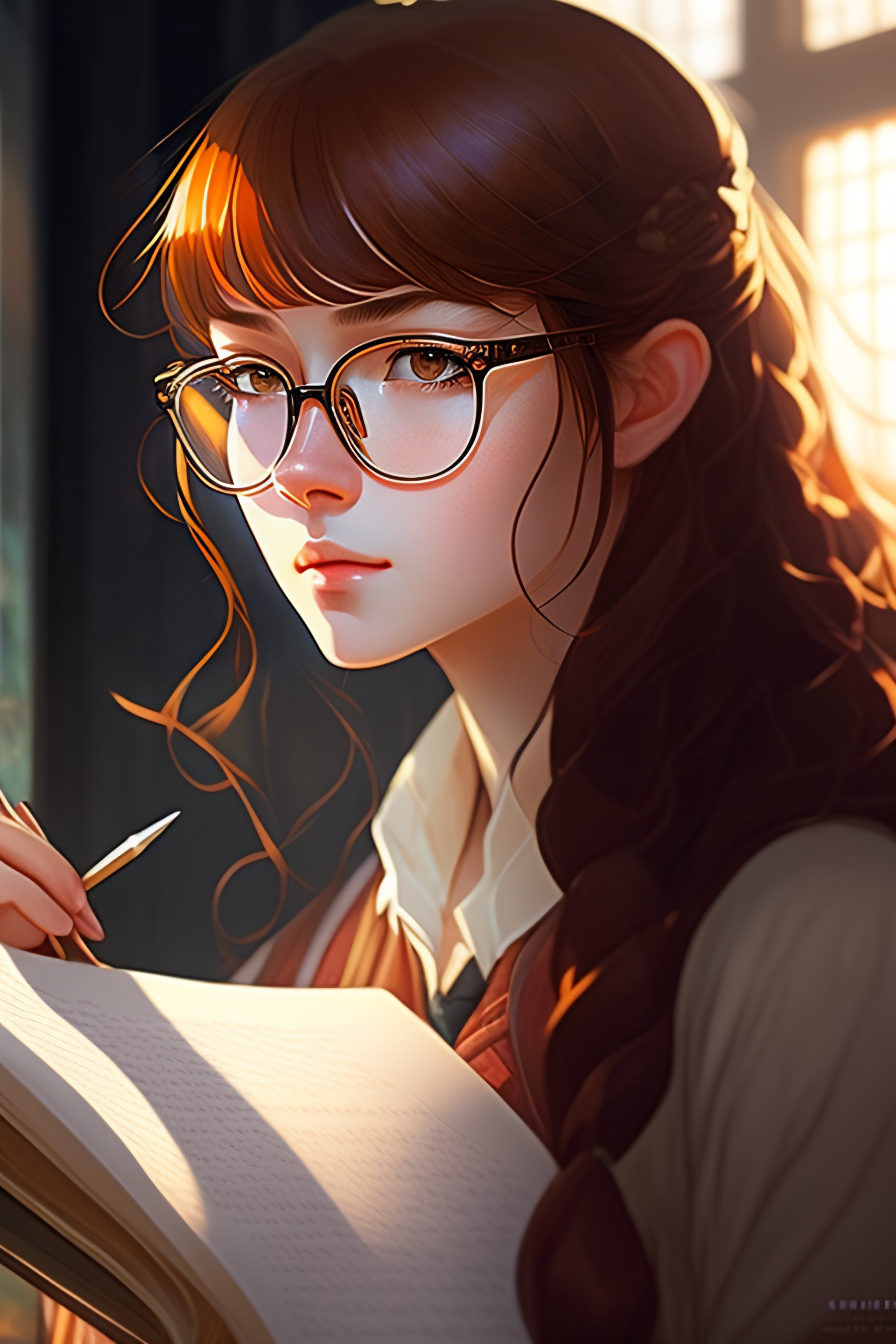 Freckles freckled cheeks freckled wearing spectacles renaissance reporter writing in a journal with a quill baroque oil painting rachel weisz ln illustration concept art lotr anime key visual portrait long flowing brown hair brown eyes fine detail delicate features gapmoe kuudere trending pixiv by victo ngai fanbox by greg rutkowski makoto shinkai takashi takeuchi studio ghibli