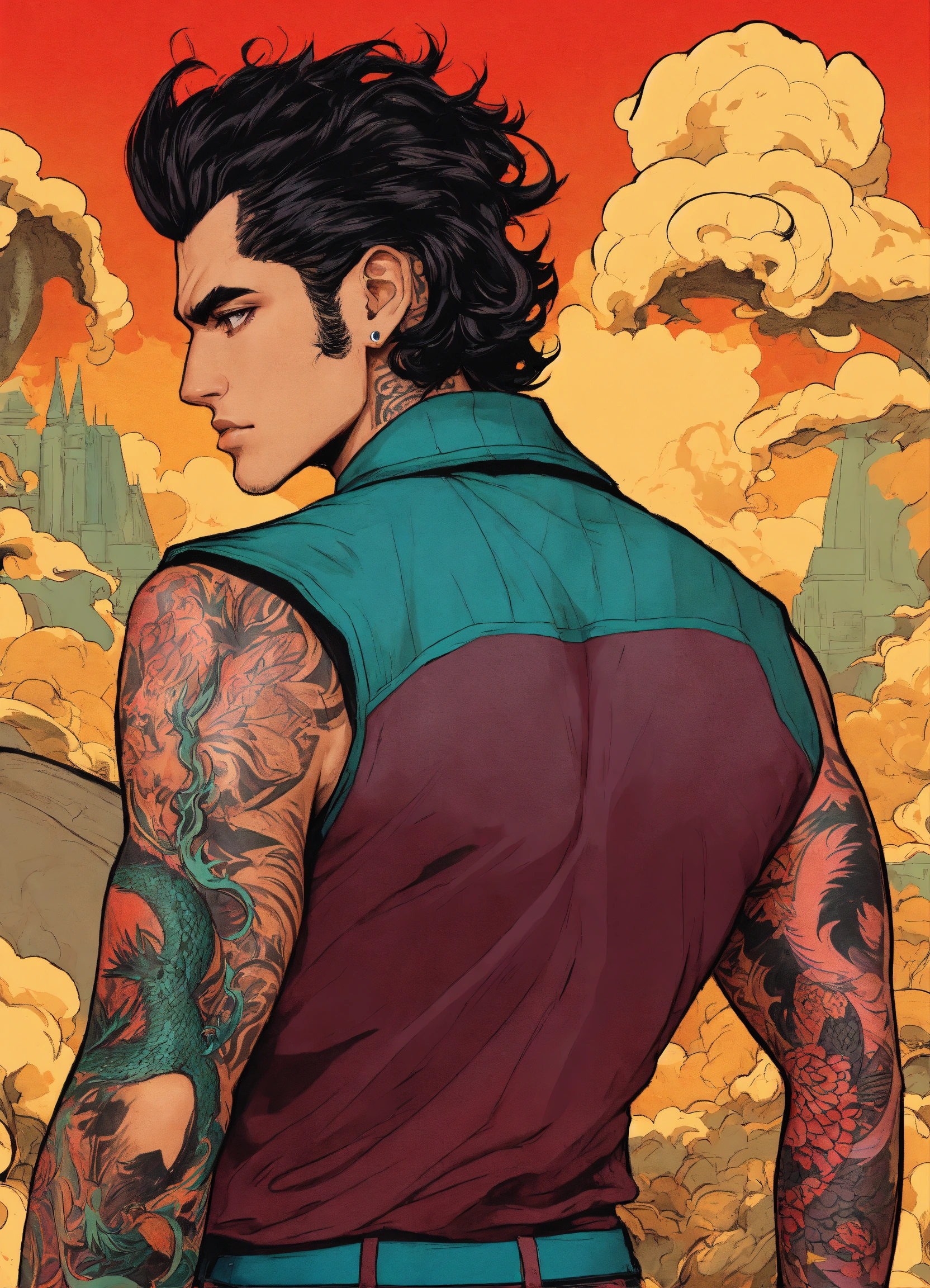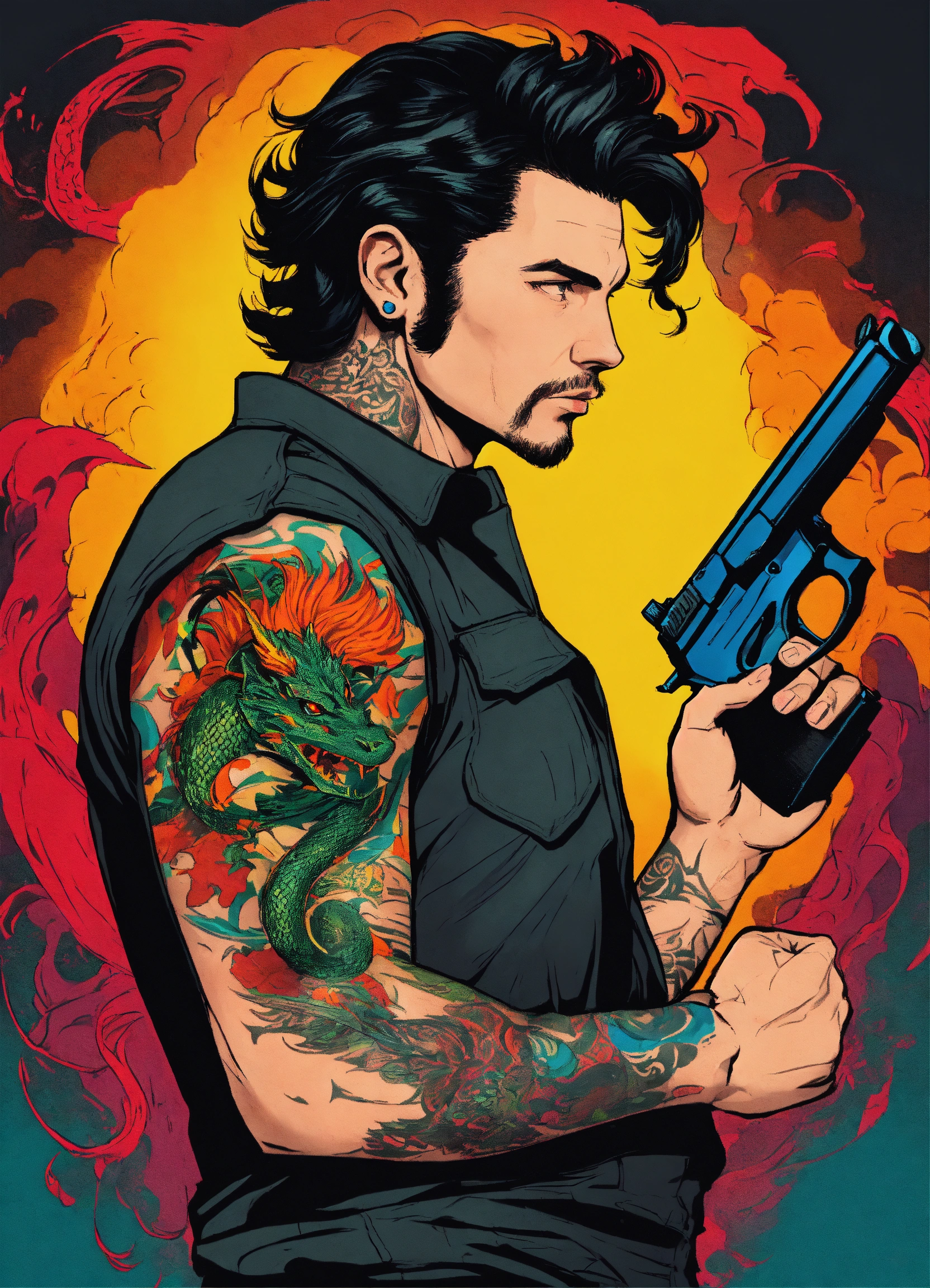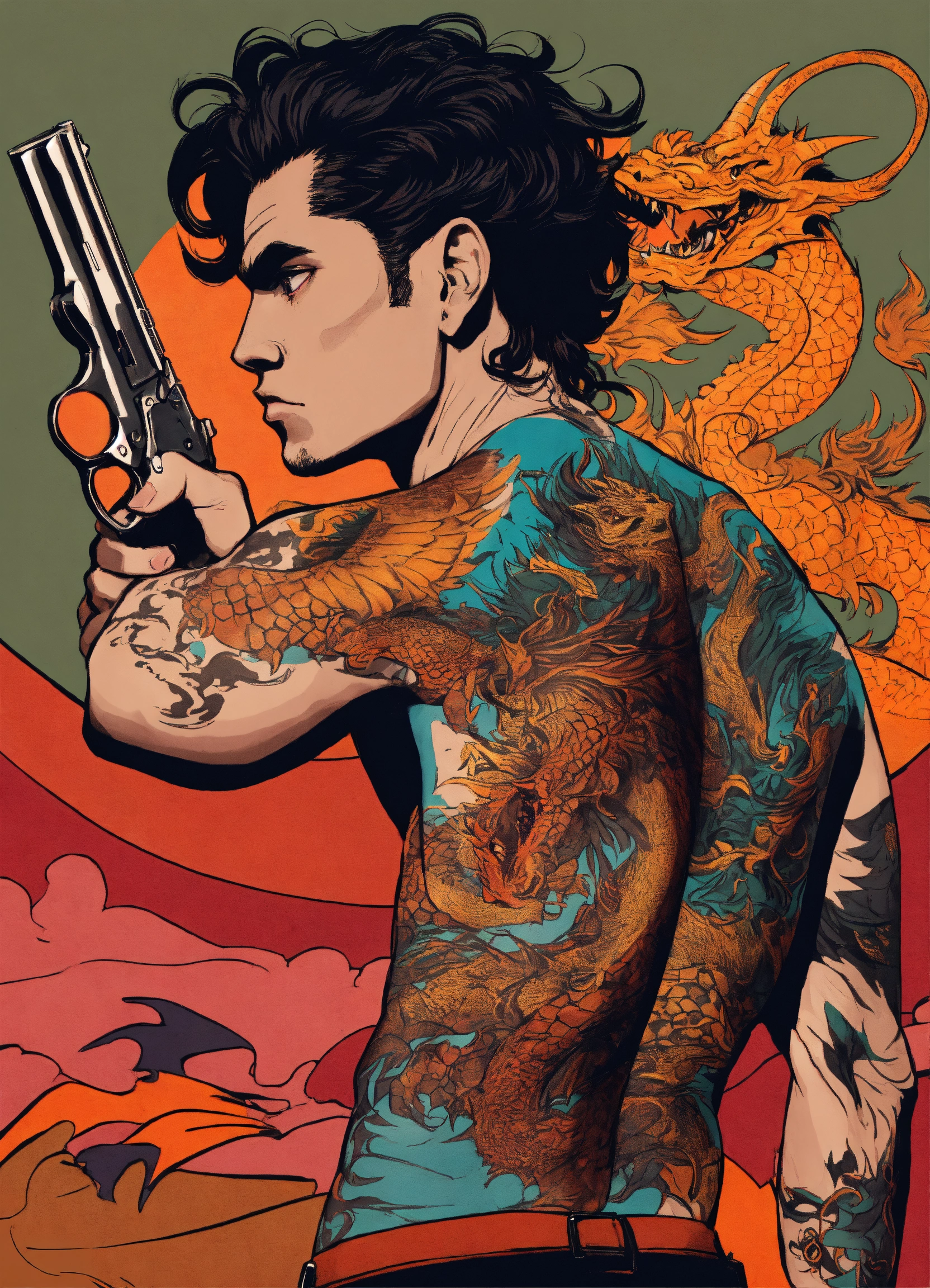 Pop art, the back of a black wavy hair caucasian man with a massive tattoo of dark dragon and a revolver in his hand