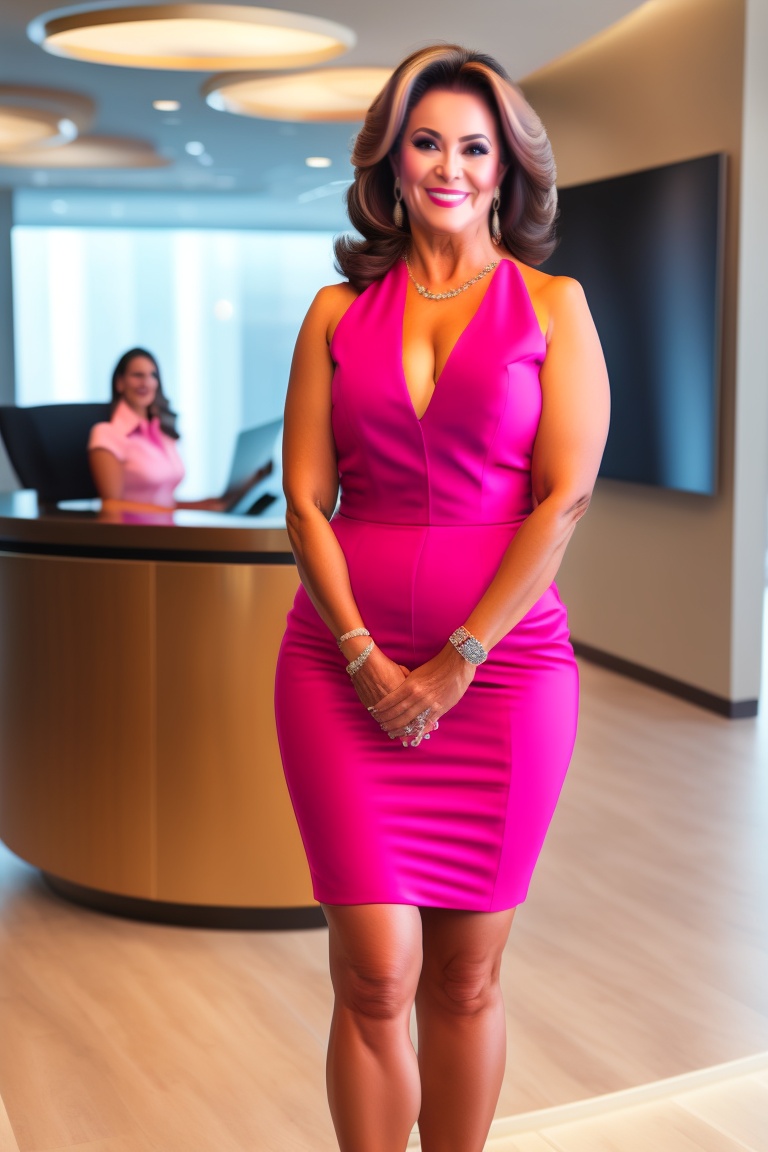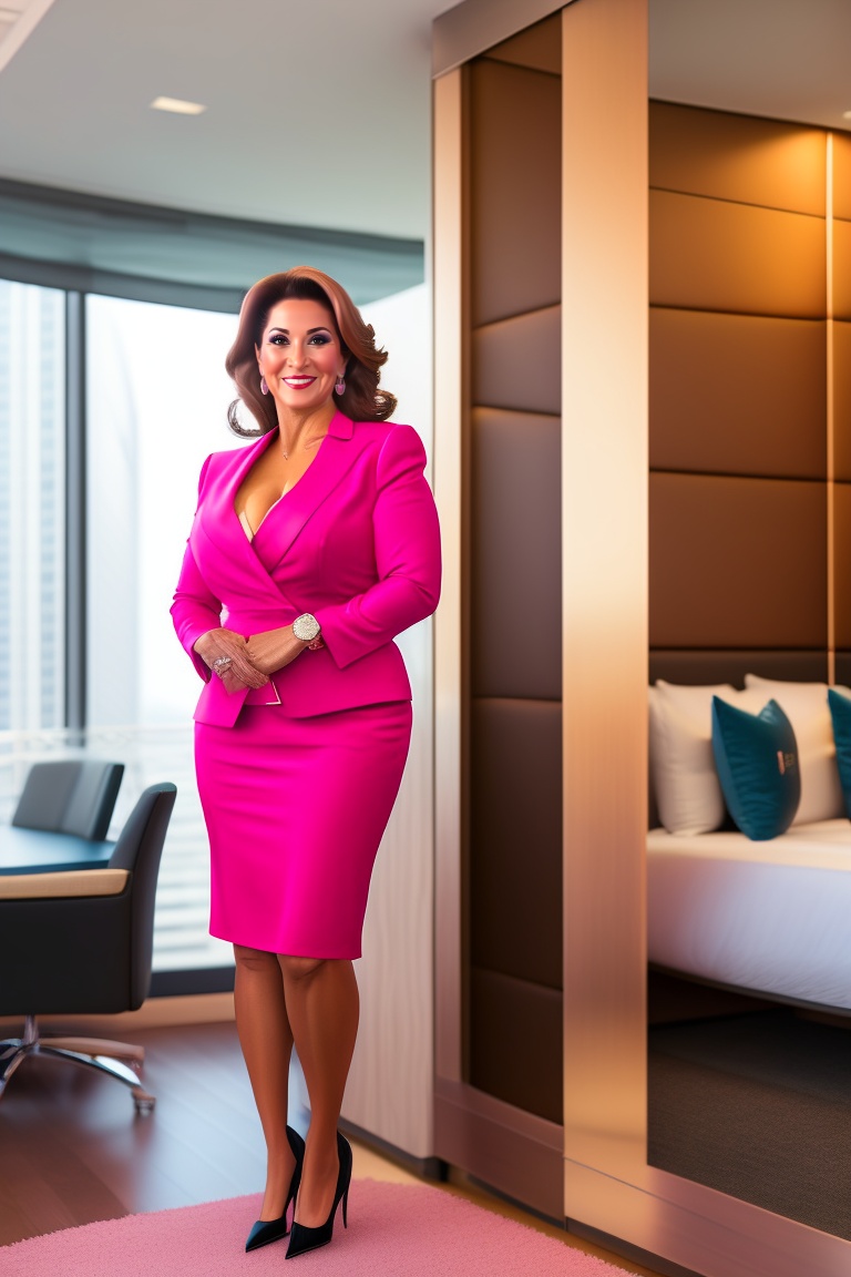Happy middle-aged mexican business woman ceo standing in office arm across. smiling mature confident, wearing pink bodycon short dress with heels executive manager. standing in an expensive las vegas suite, with a heart-shaped bed.