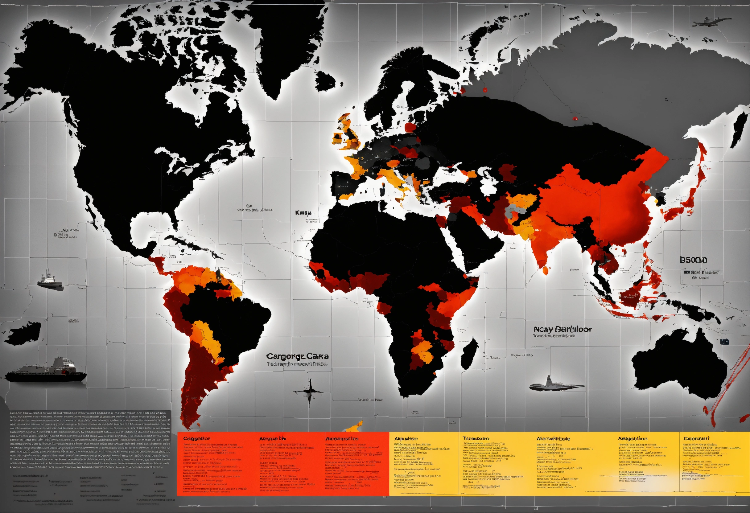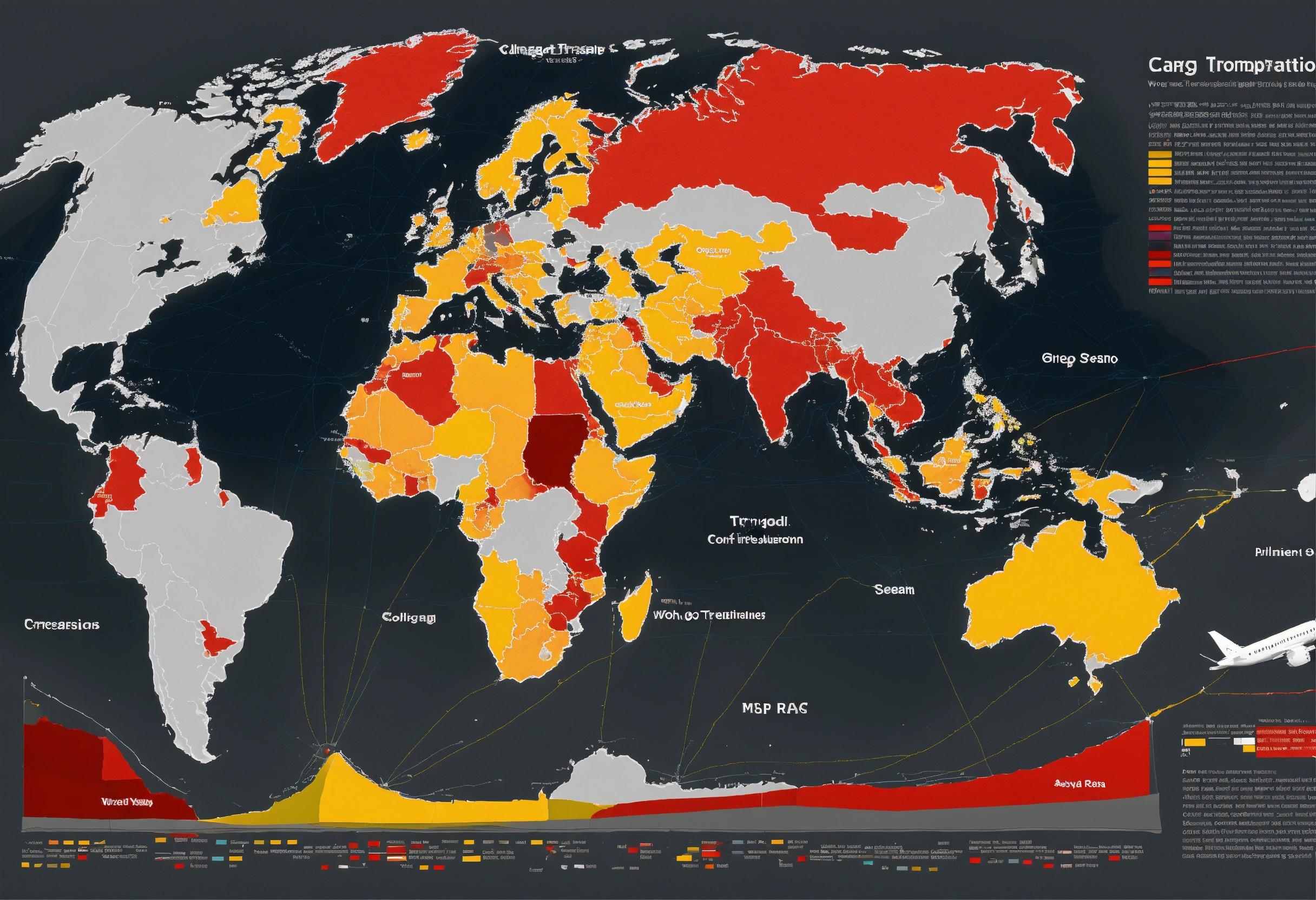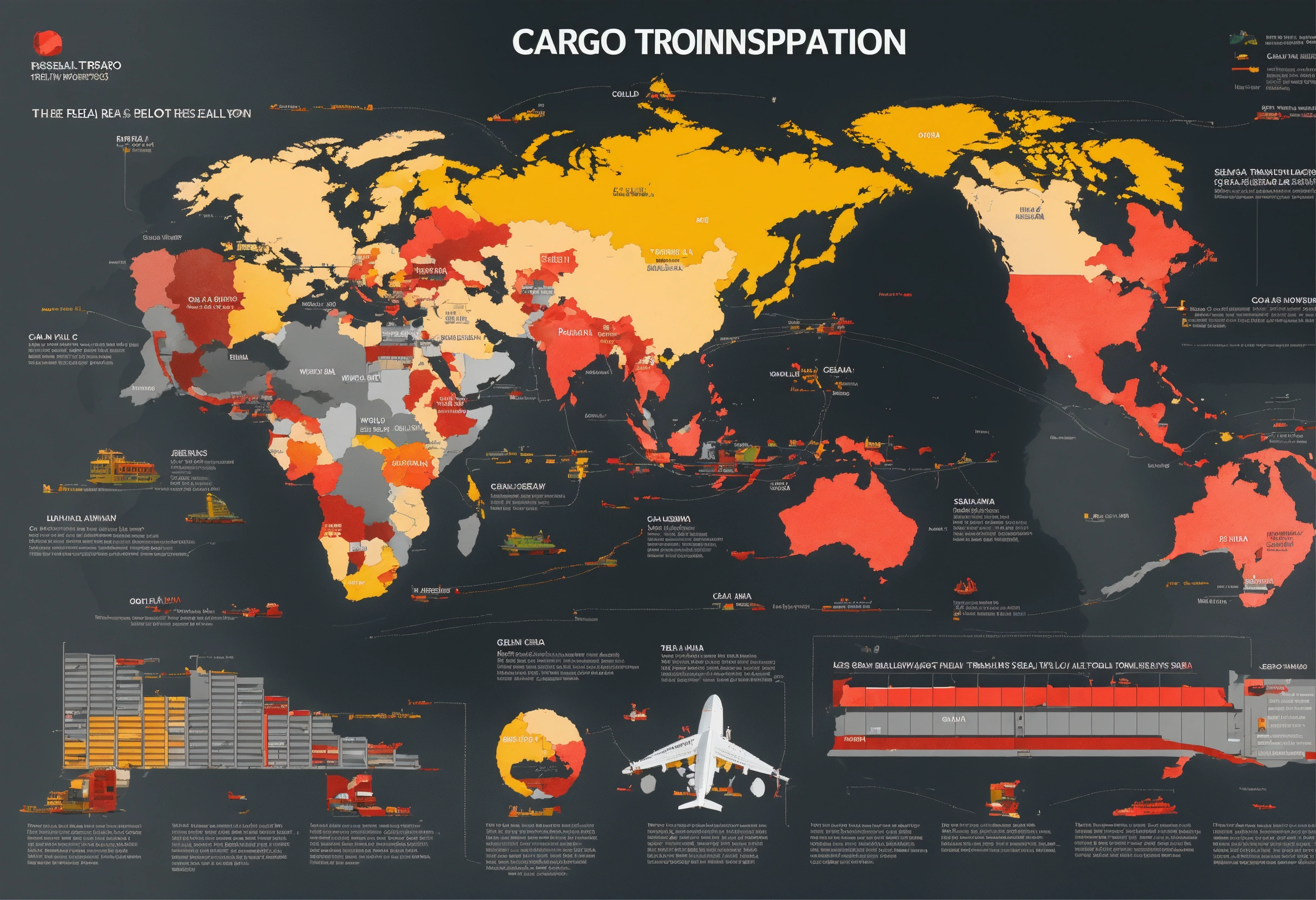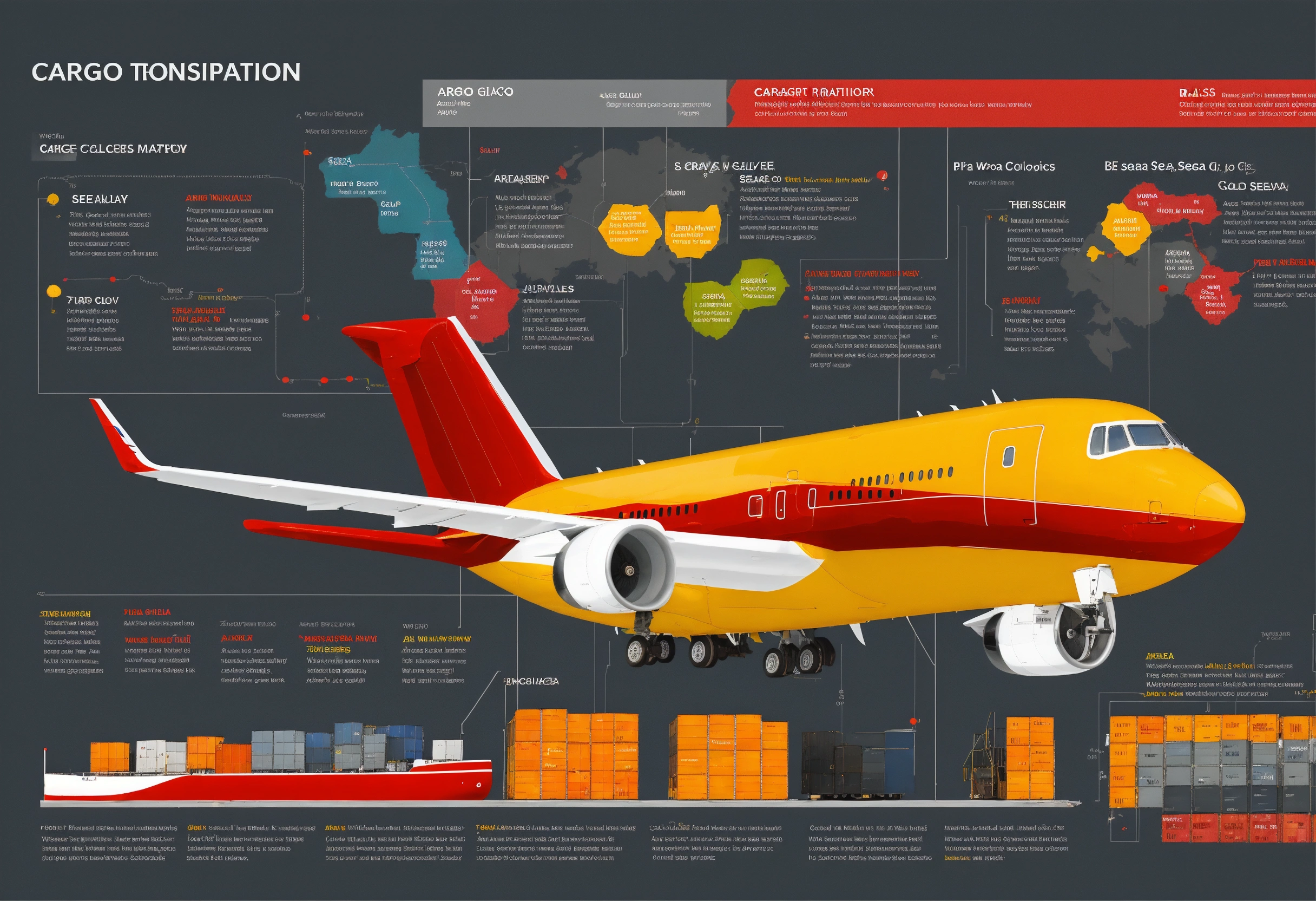 Cargo transportation, plane, sea delivery, train, beautiful infographics. map. world. colors gray, red yellow, black