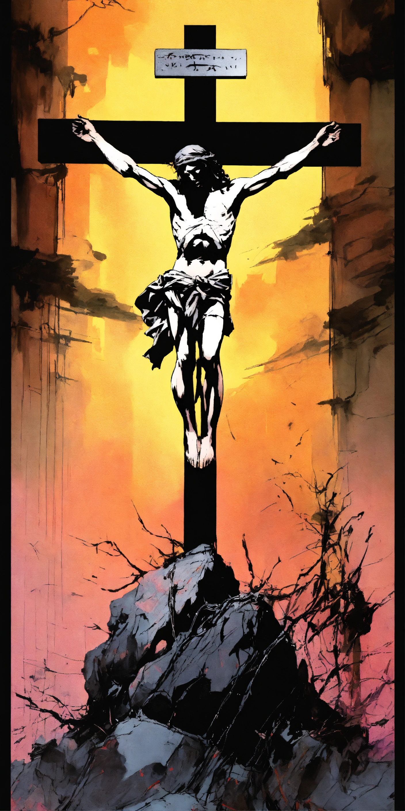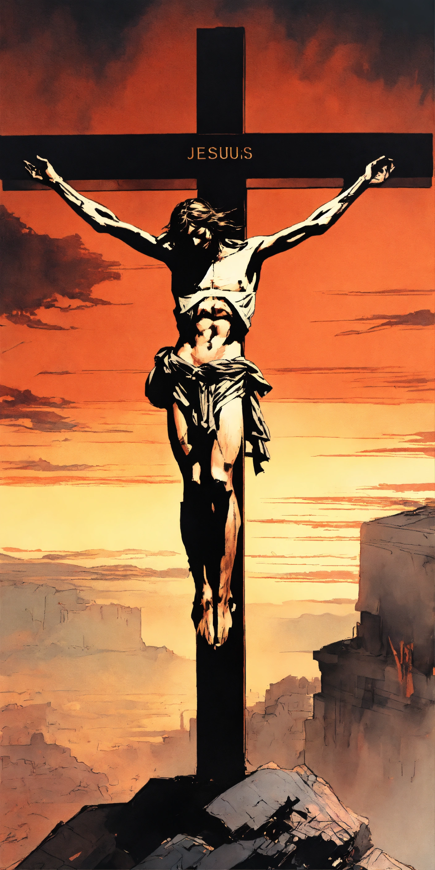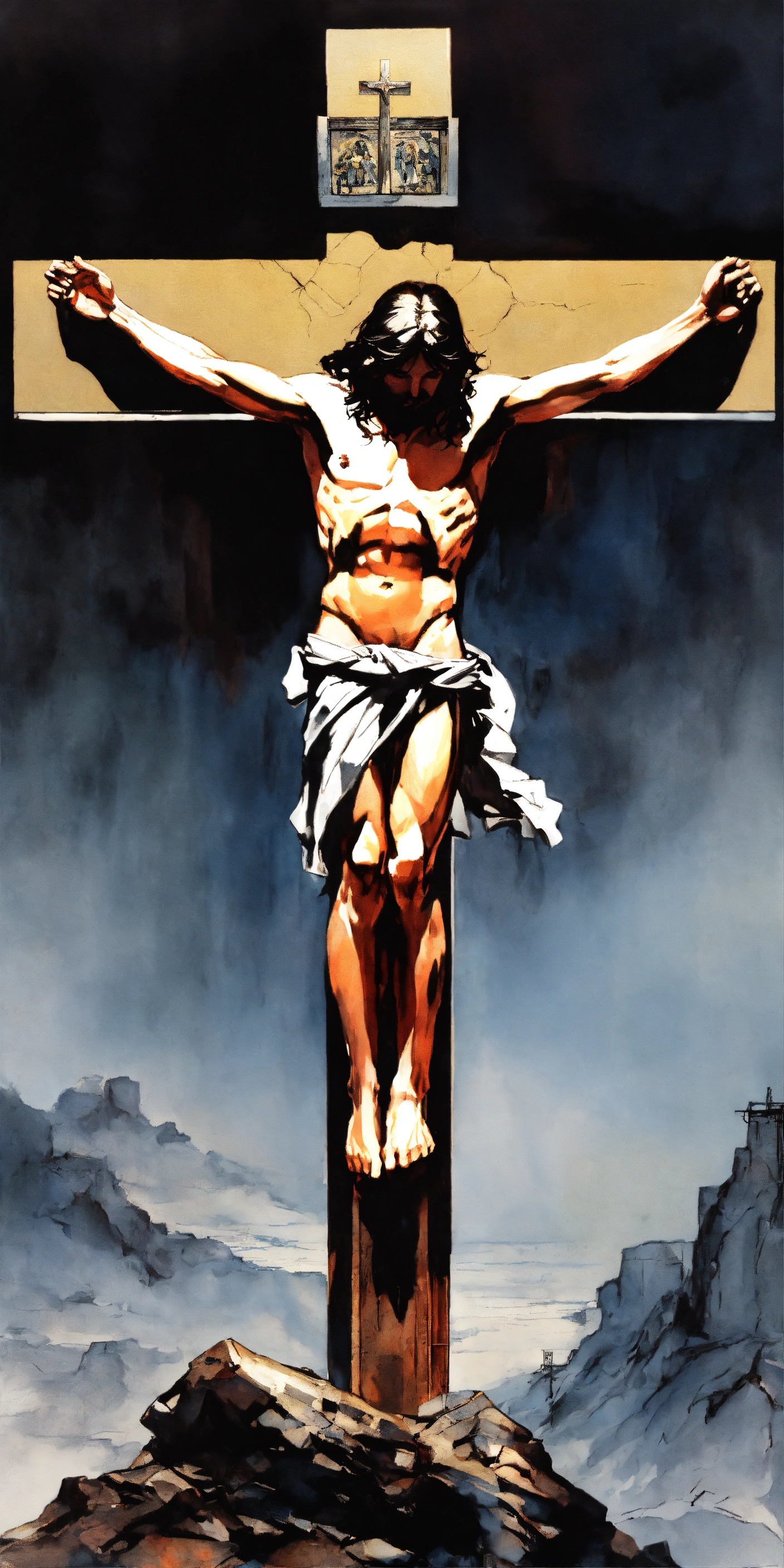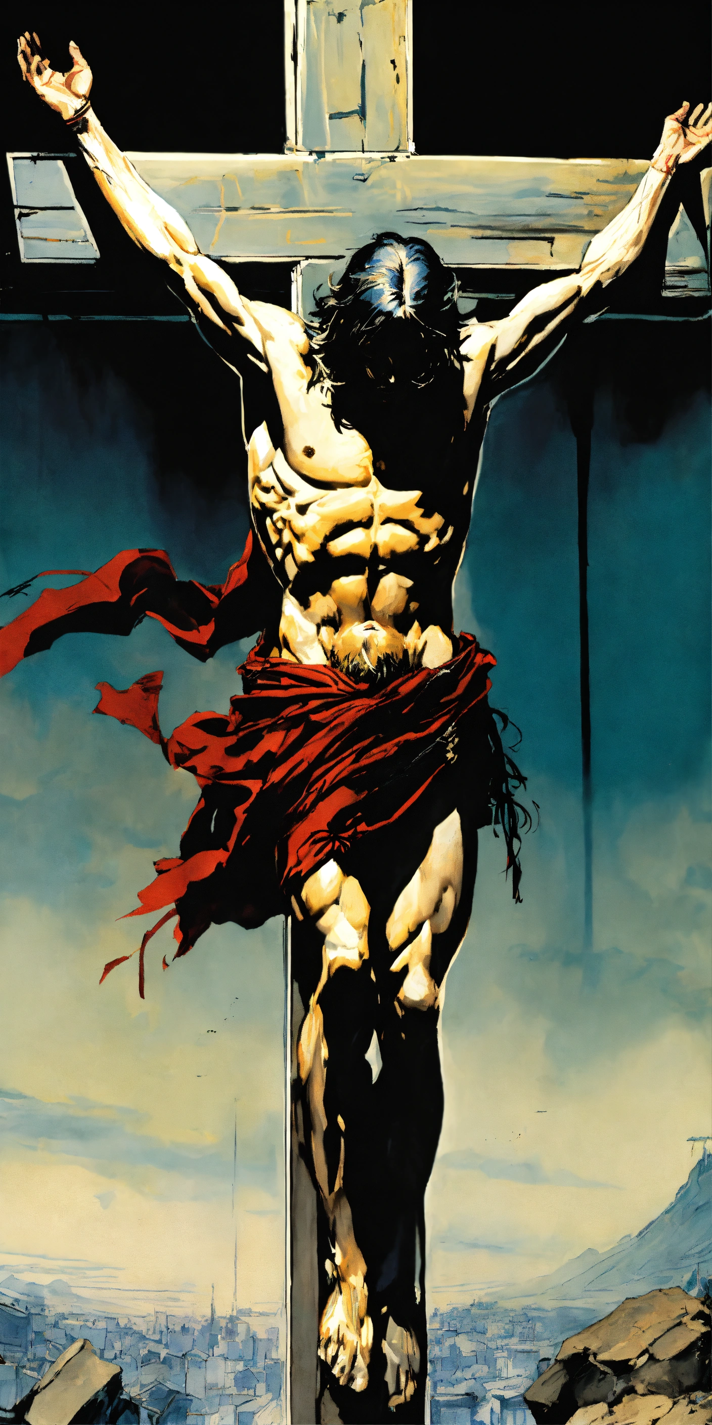 The crucifiction of jesús christ. as a dark fantasy 80s ánime in yoji shinkawa style, godly and holy.