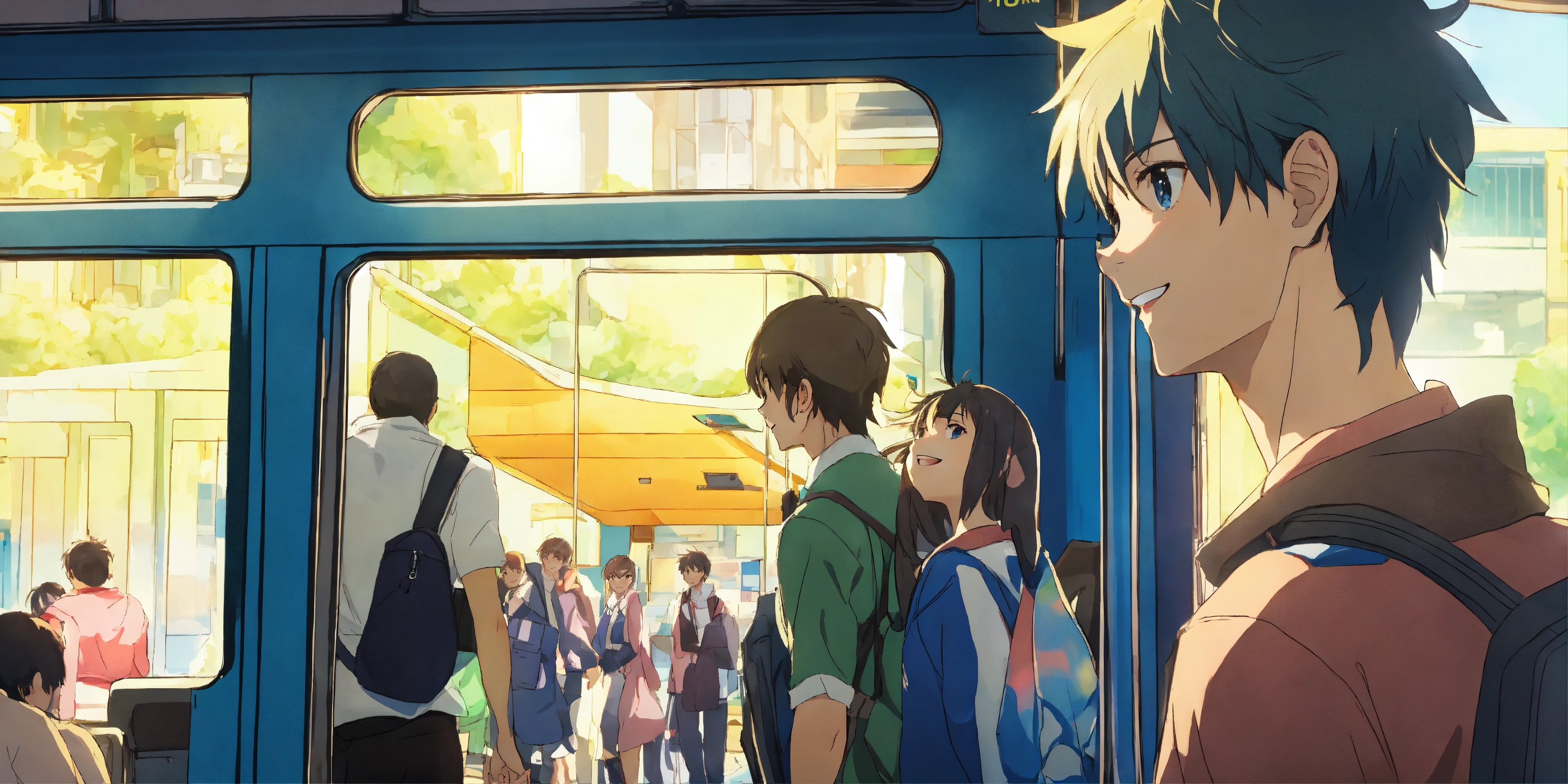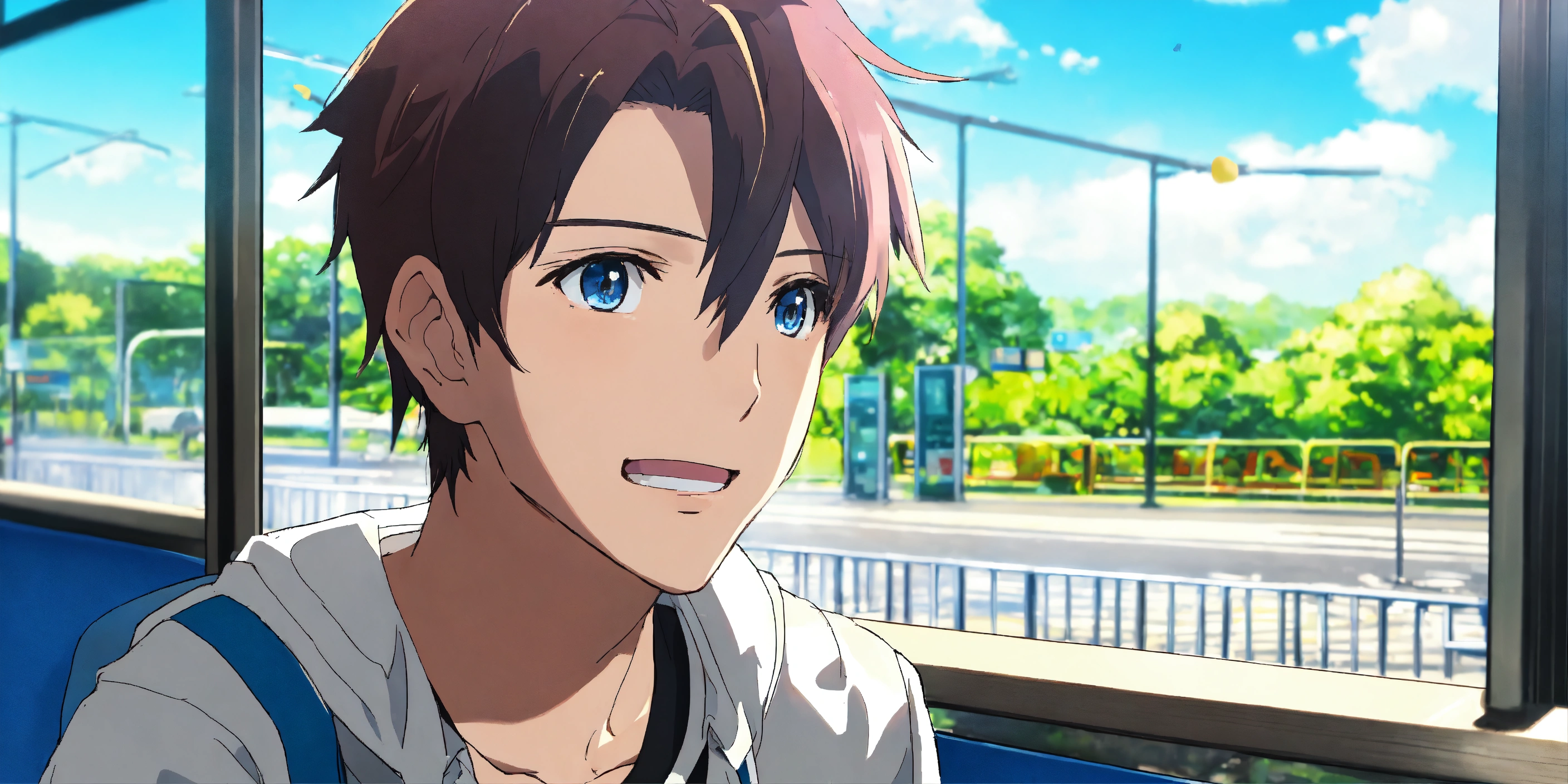 A young guy looking at girl on a bus station sunny day in anime world excitment in his eyes and smile