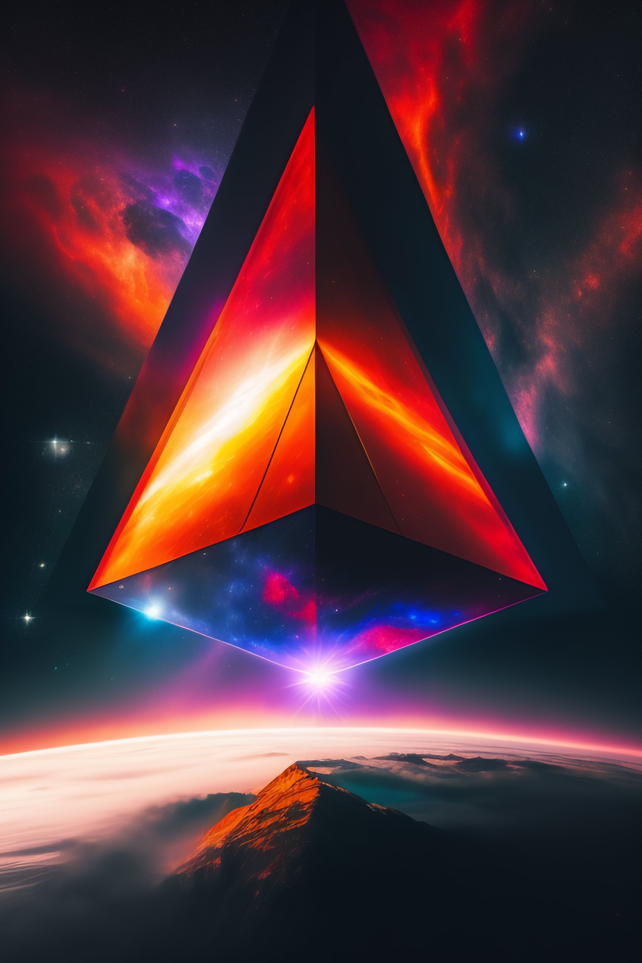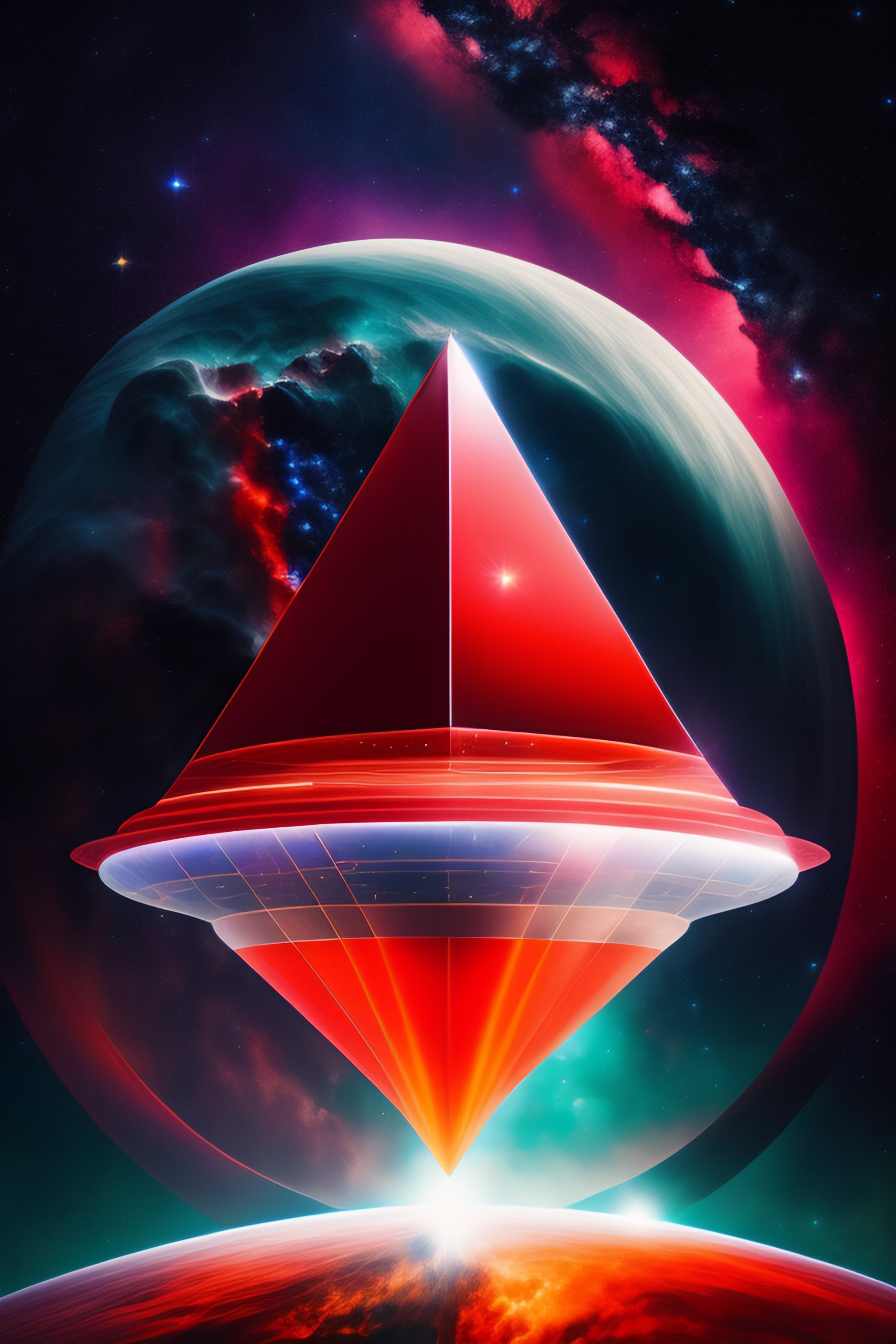 Metallic red triangular prism artifact floating in space with arcs of energy that become energized clouds, beams of energy coming out of artifact, floating in a nebula, stars being born