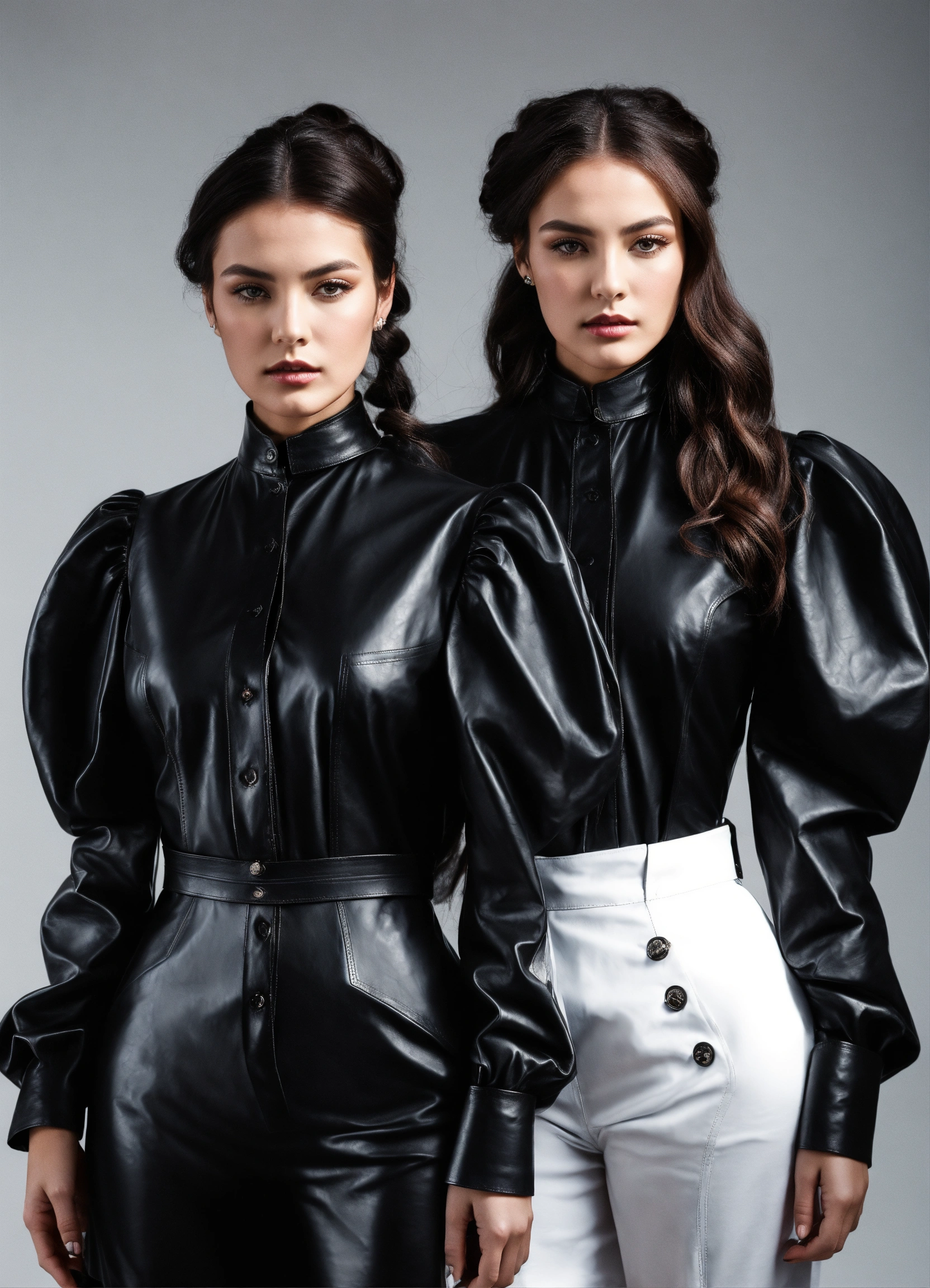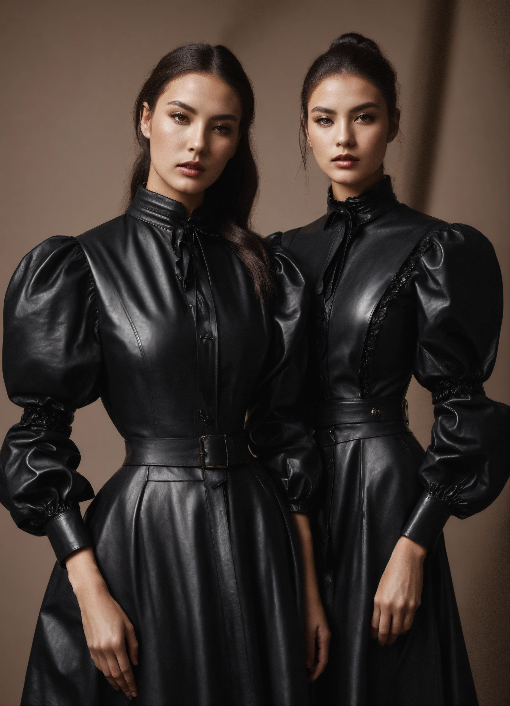 Two stunning arrogant women fashion model, strict victorian black leather governess shirt dress big long puff sleeves, leather shirt collar, black straight high ponytai, ultra-realistic; solid white background; no background