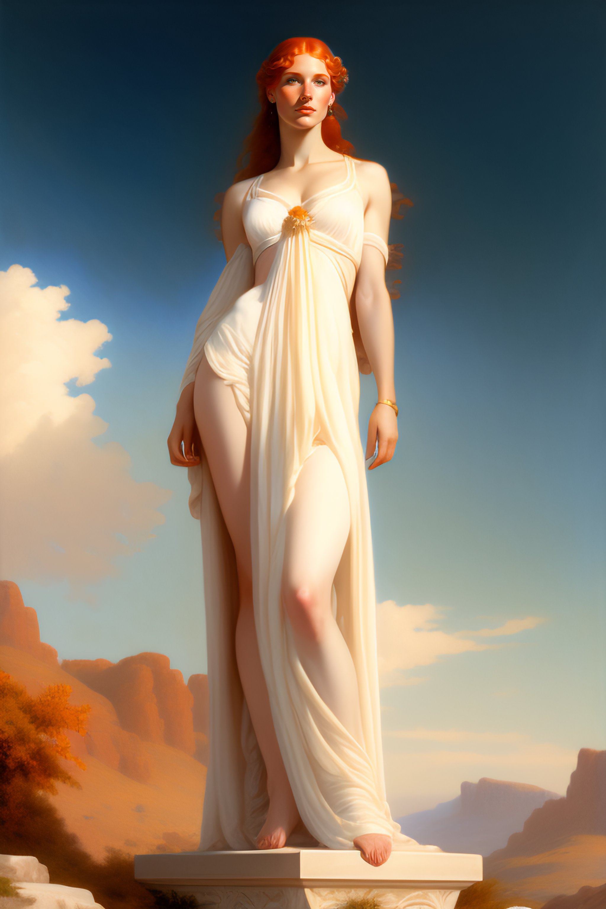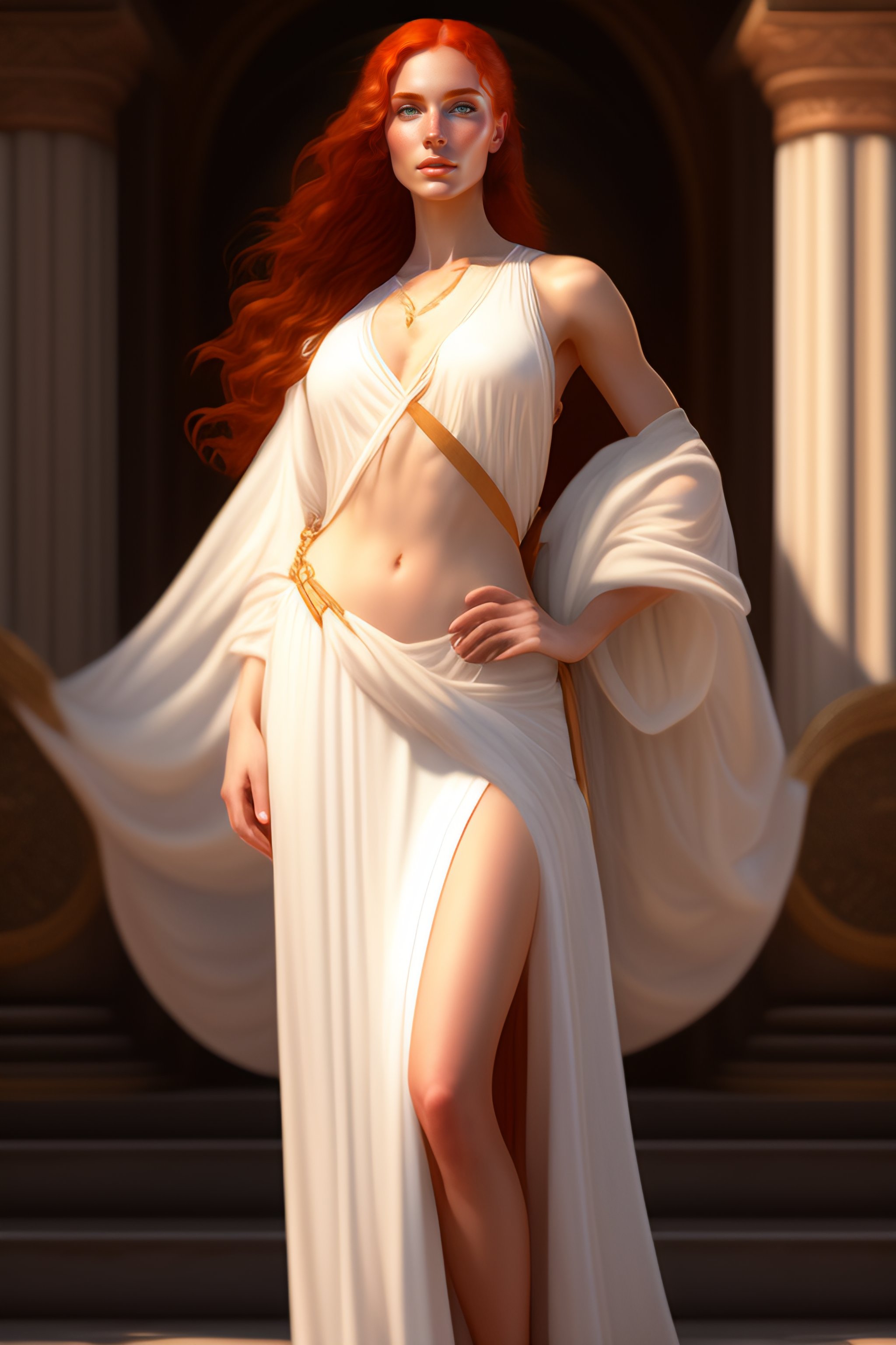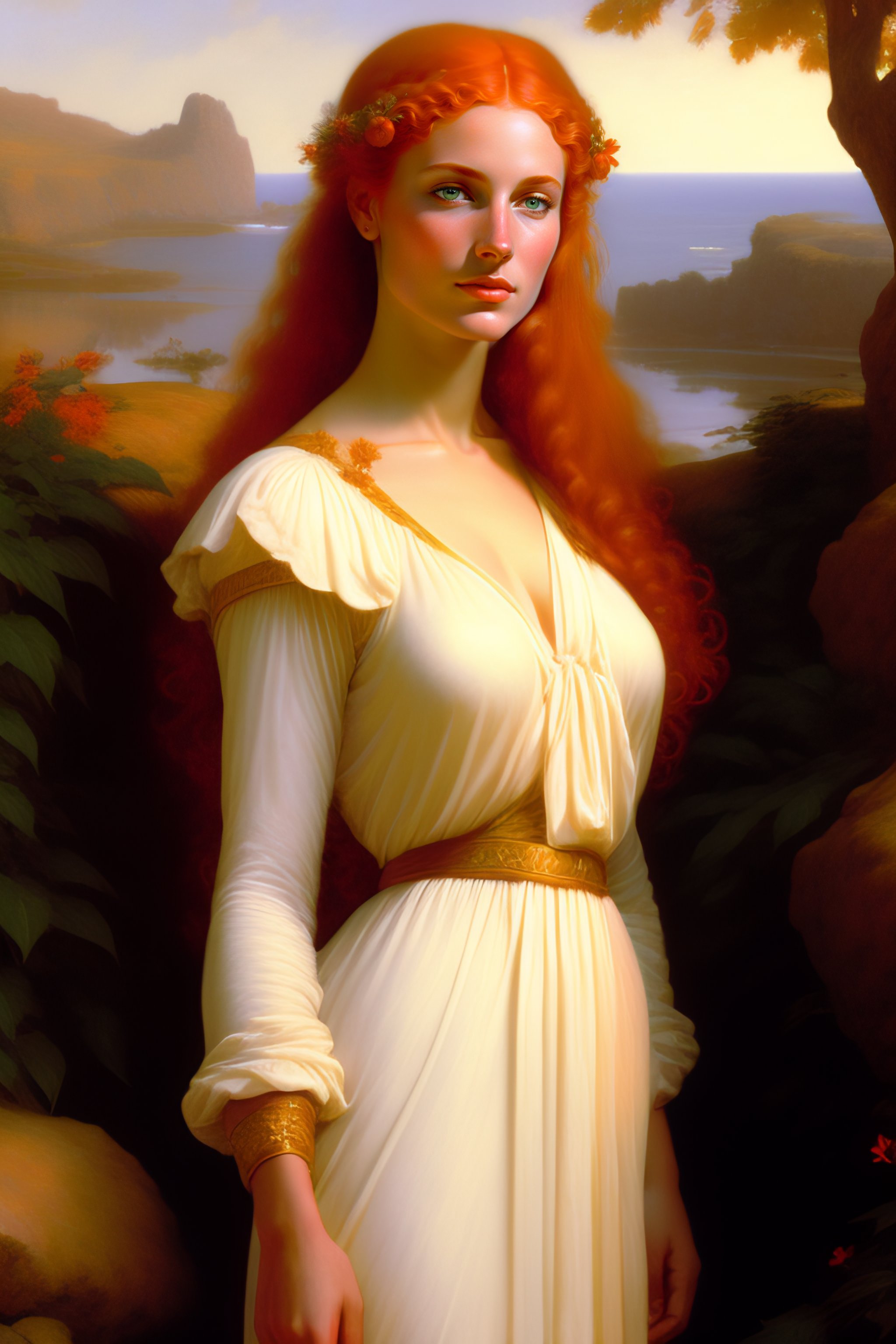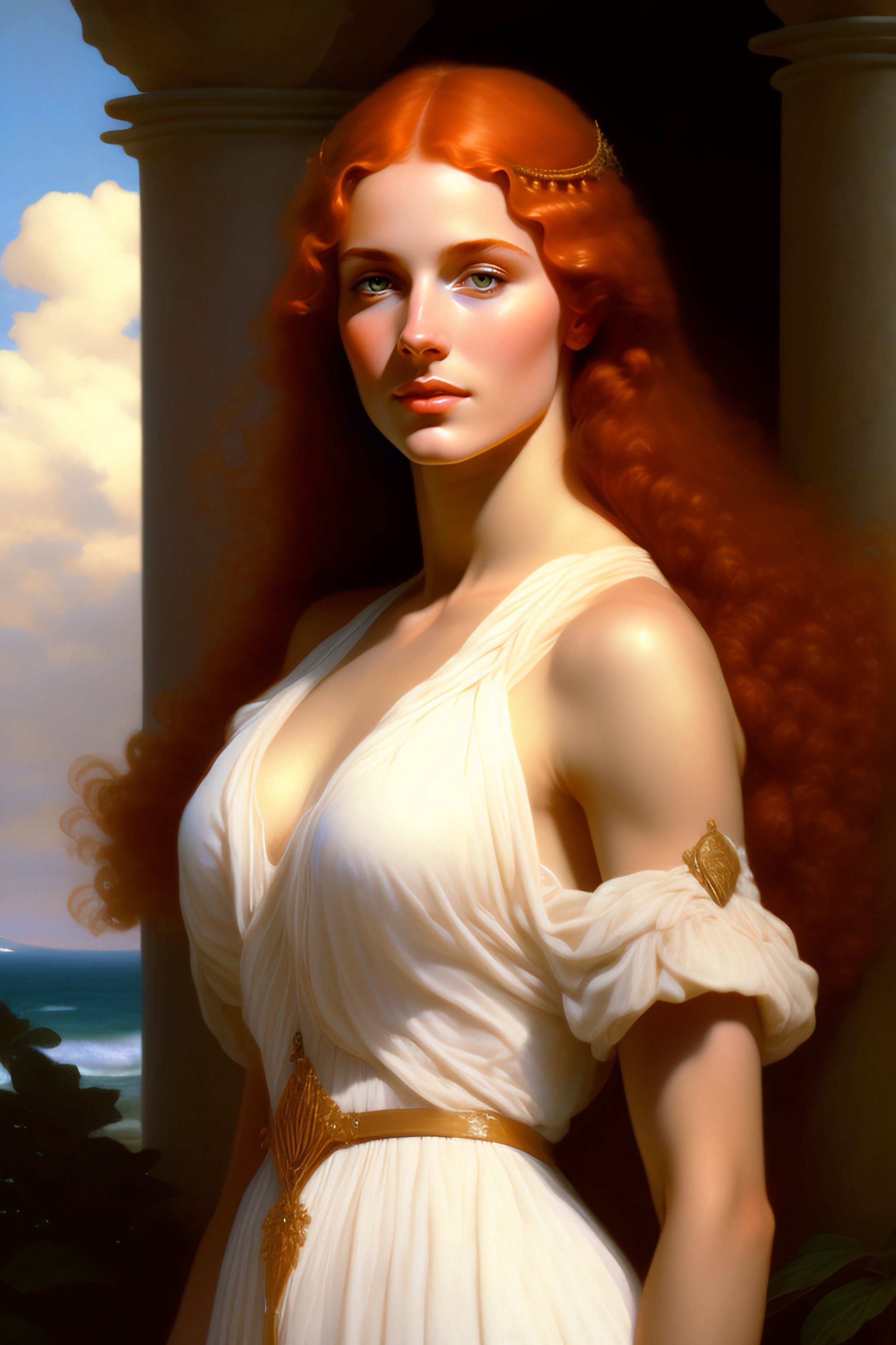 Young redhead woman with big bossom and white wet greek tunic, full body fantasy character portrait, ultra realistic, concept art, intricate details, highly detailed by soft light, volumetric light, misty, william adolphe bouguereau, munch, maxfield parrish, james bama, and frank frazetta, 8k