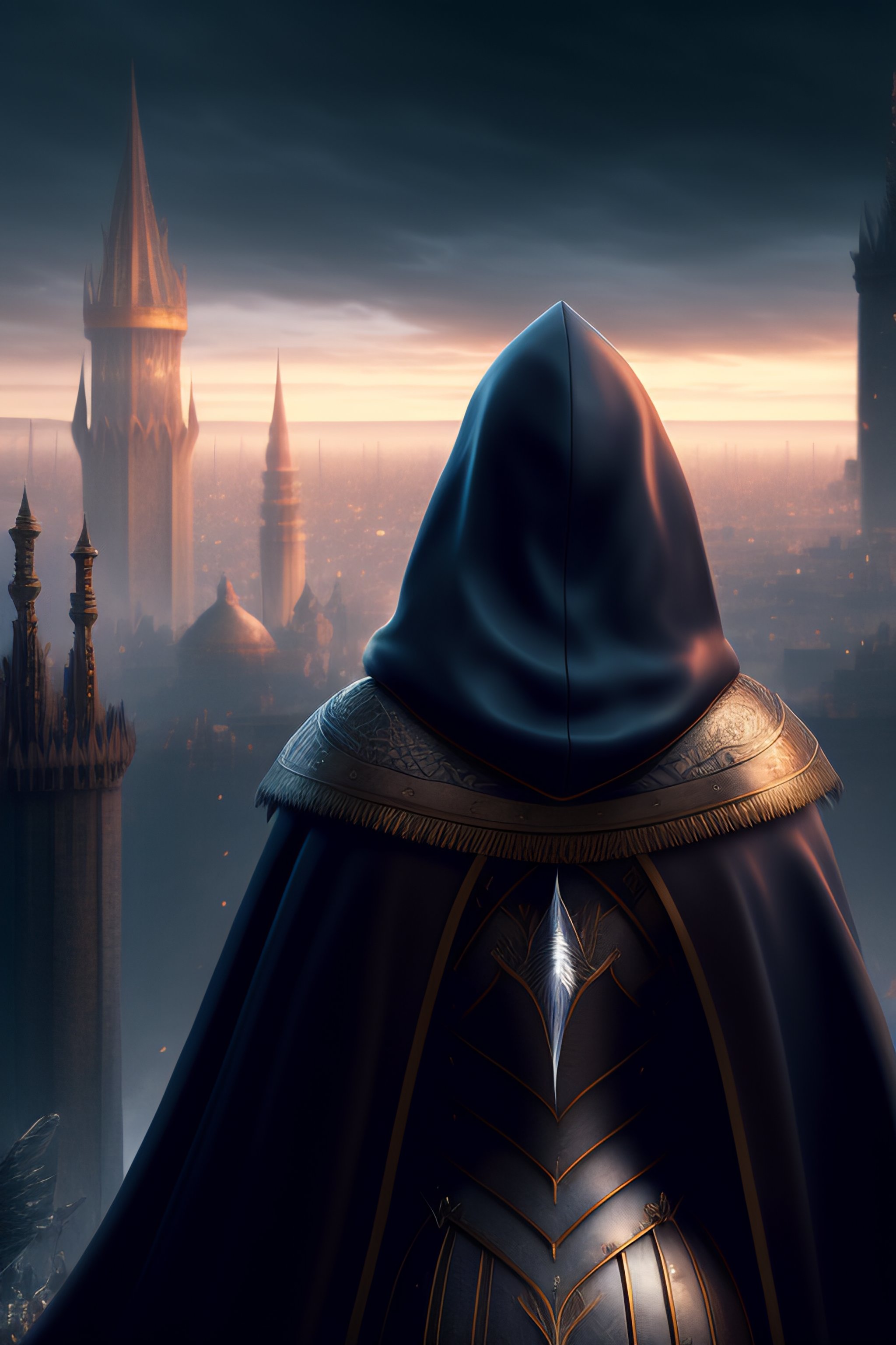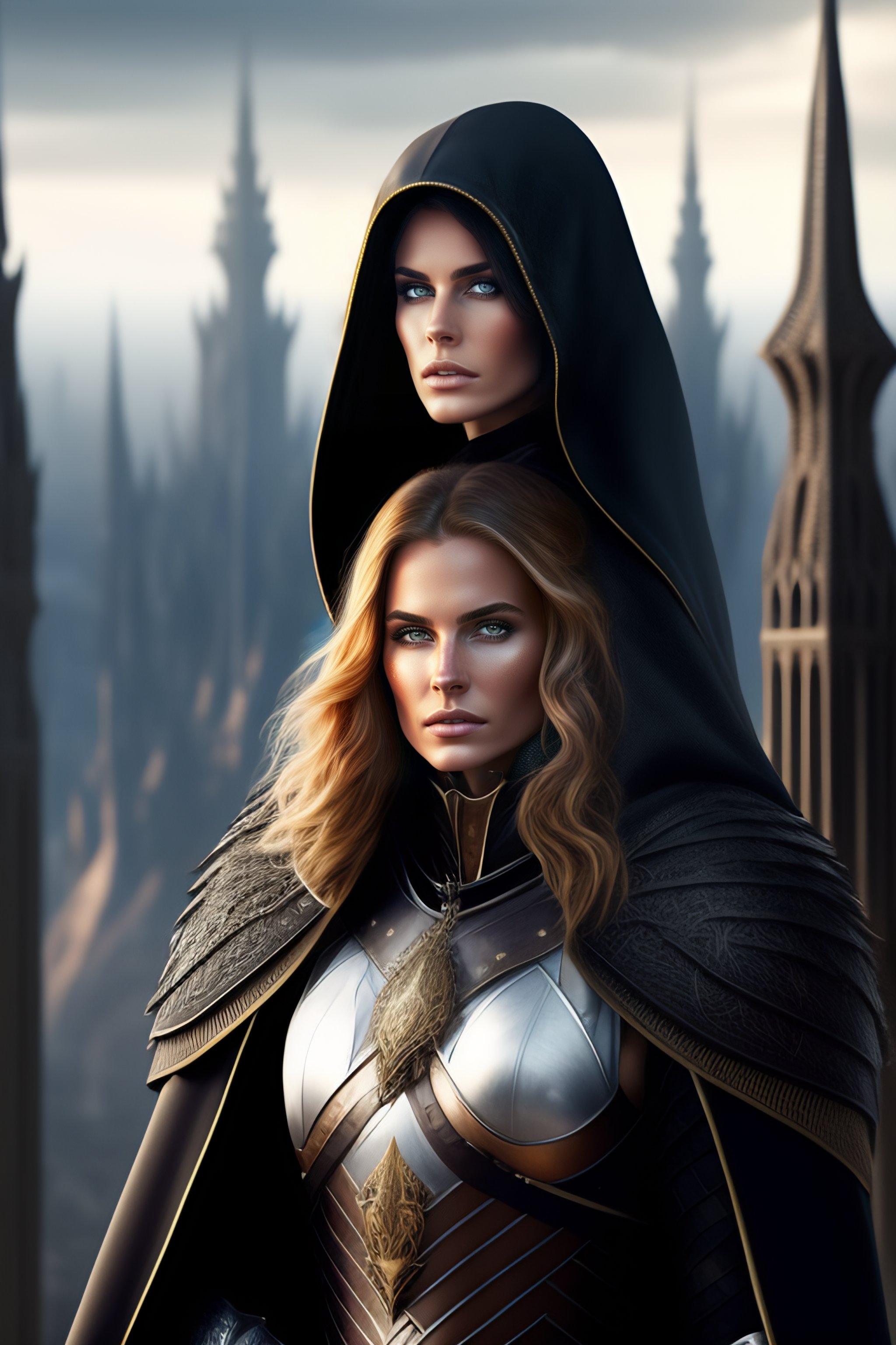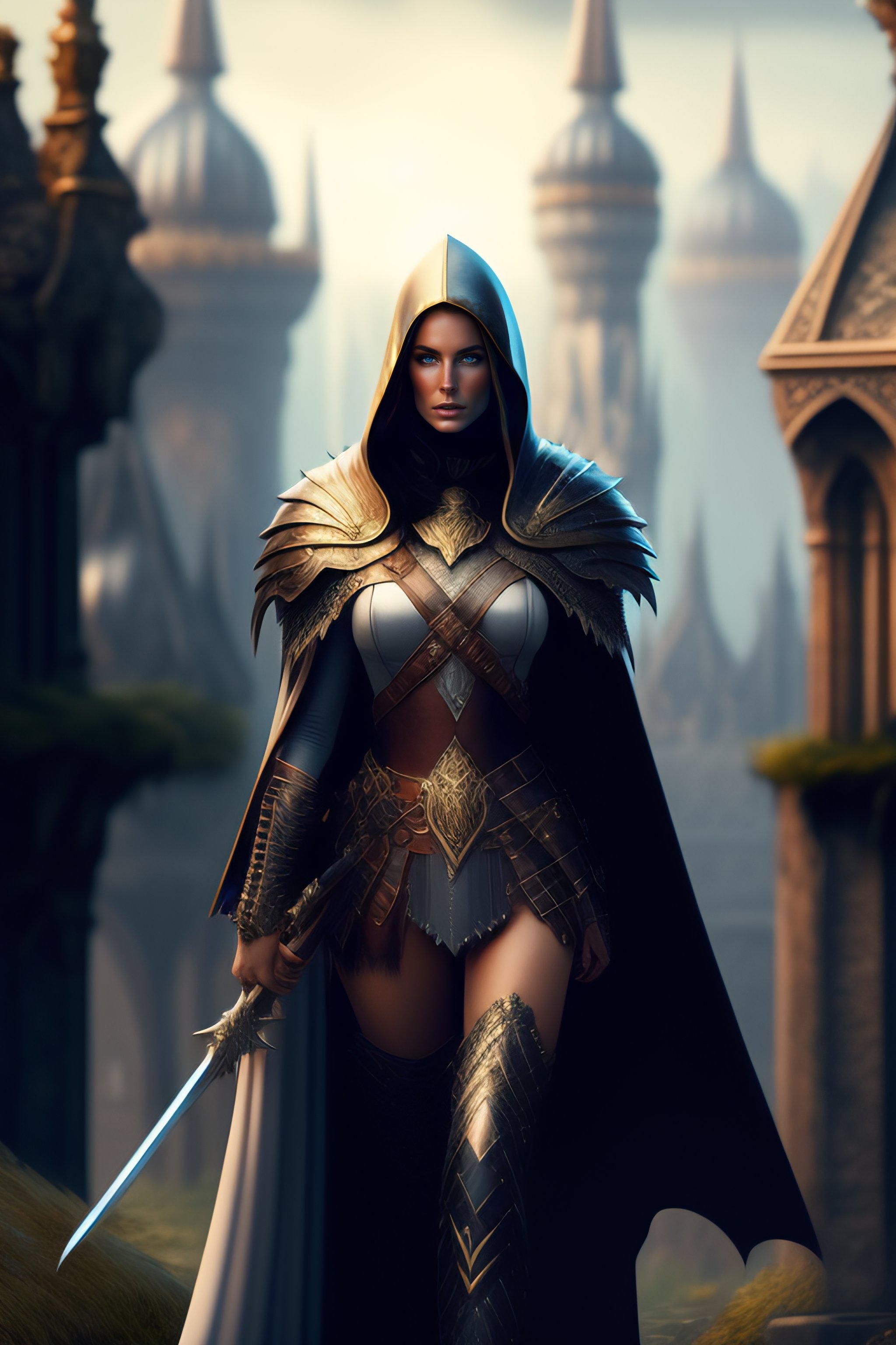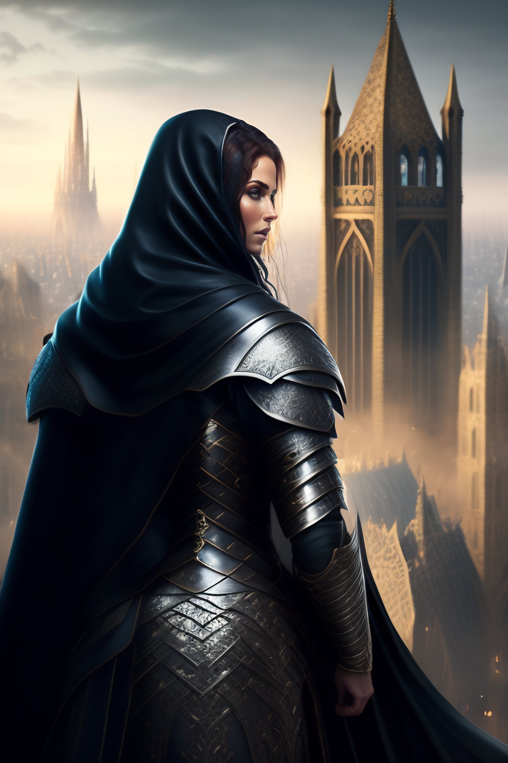 White female warrior brunette hair with metal full body armour and a hooded cloak, overlooking a gothic massive city