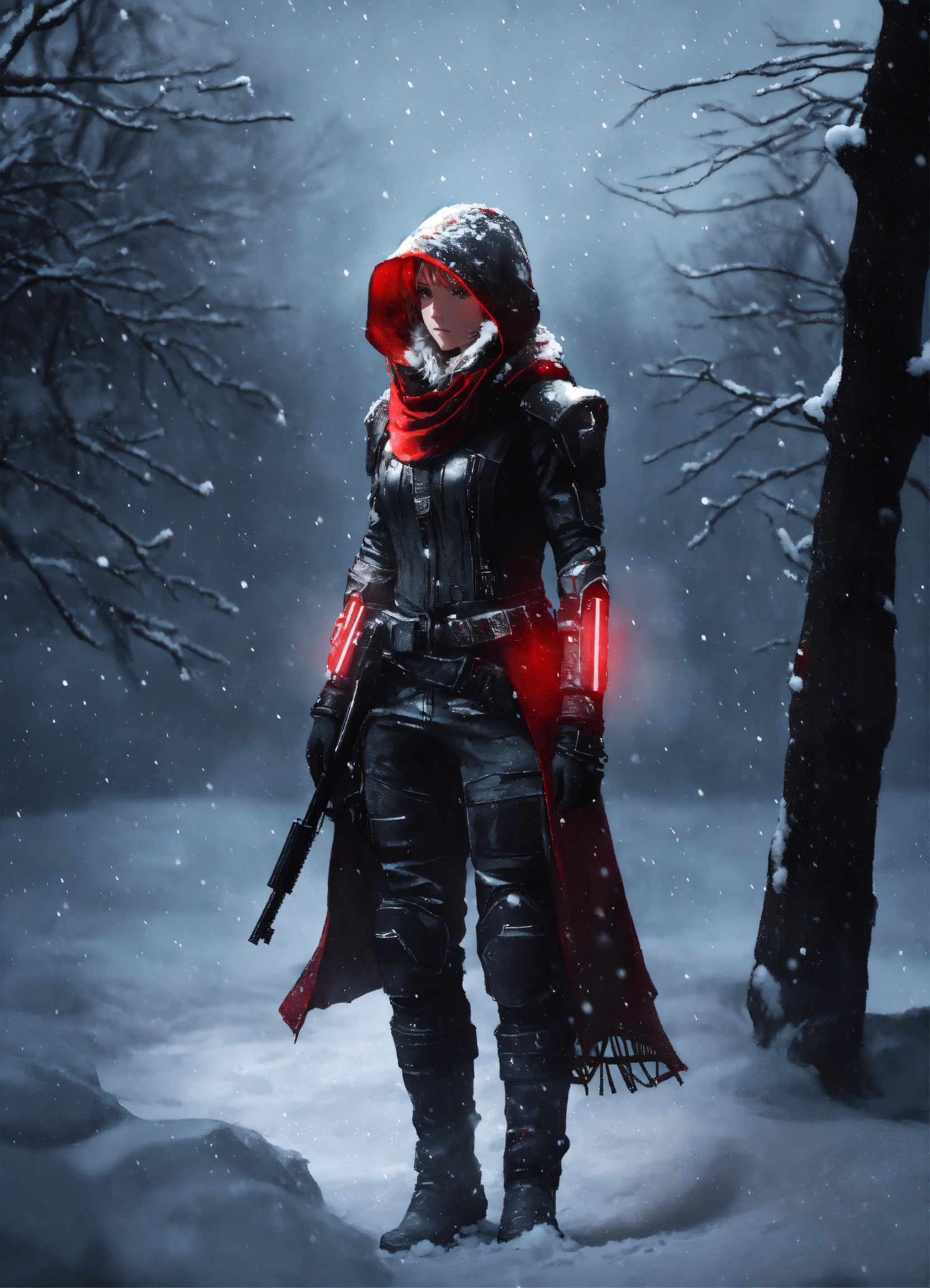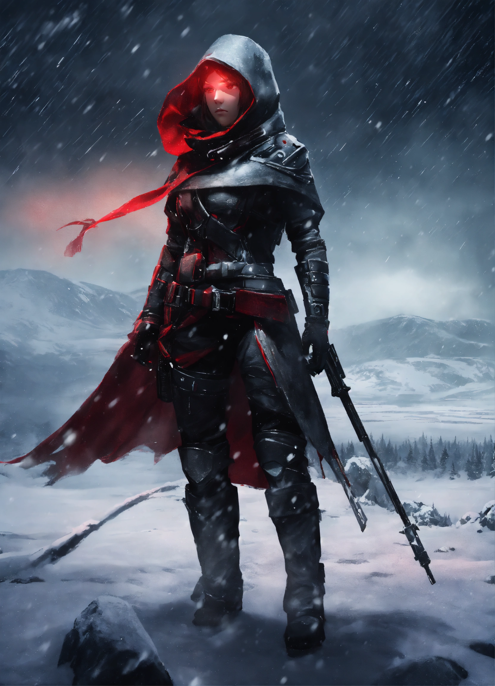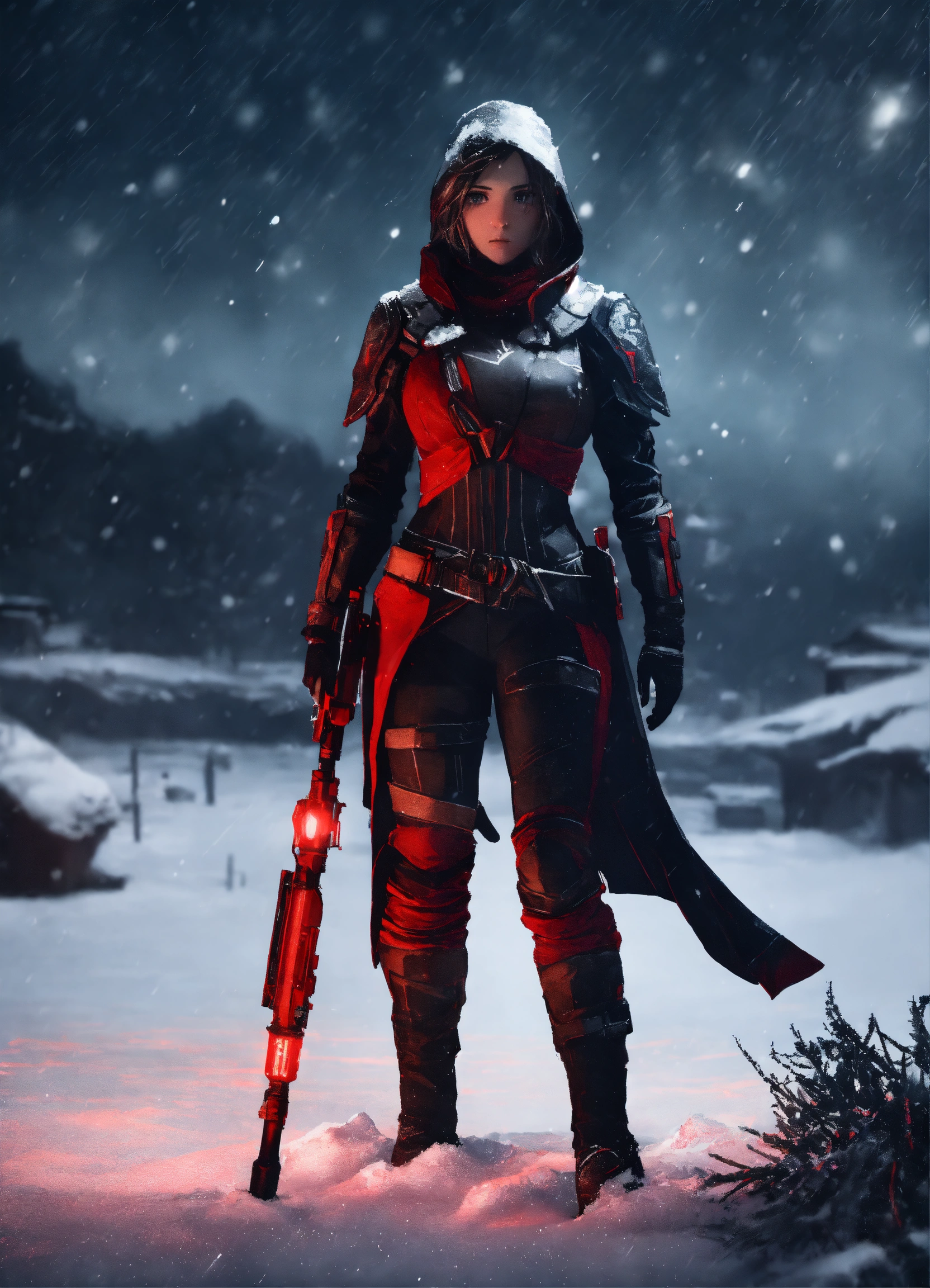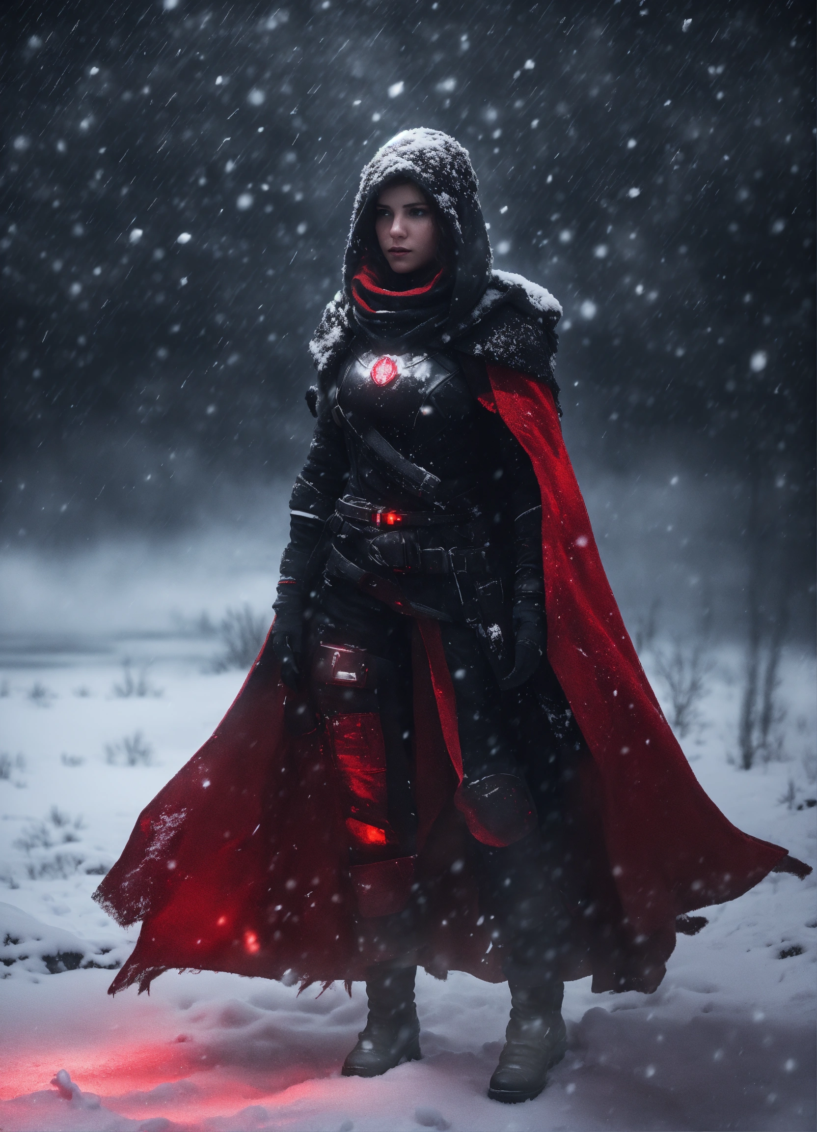 A femal hunter from the game destiny, sad, distant full body portrait in a landscape, wearing black whit red lights, during a snow storm, ice, cold, dark lighting, intricate details, depth of field, in a cold snowstorm, outdoors, night