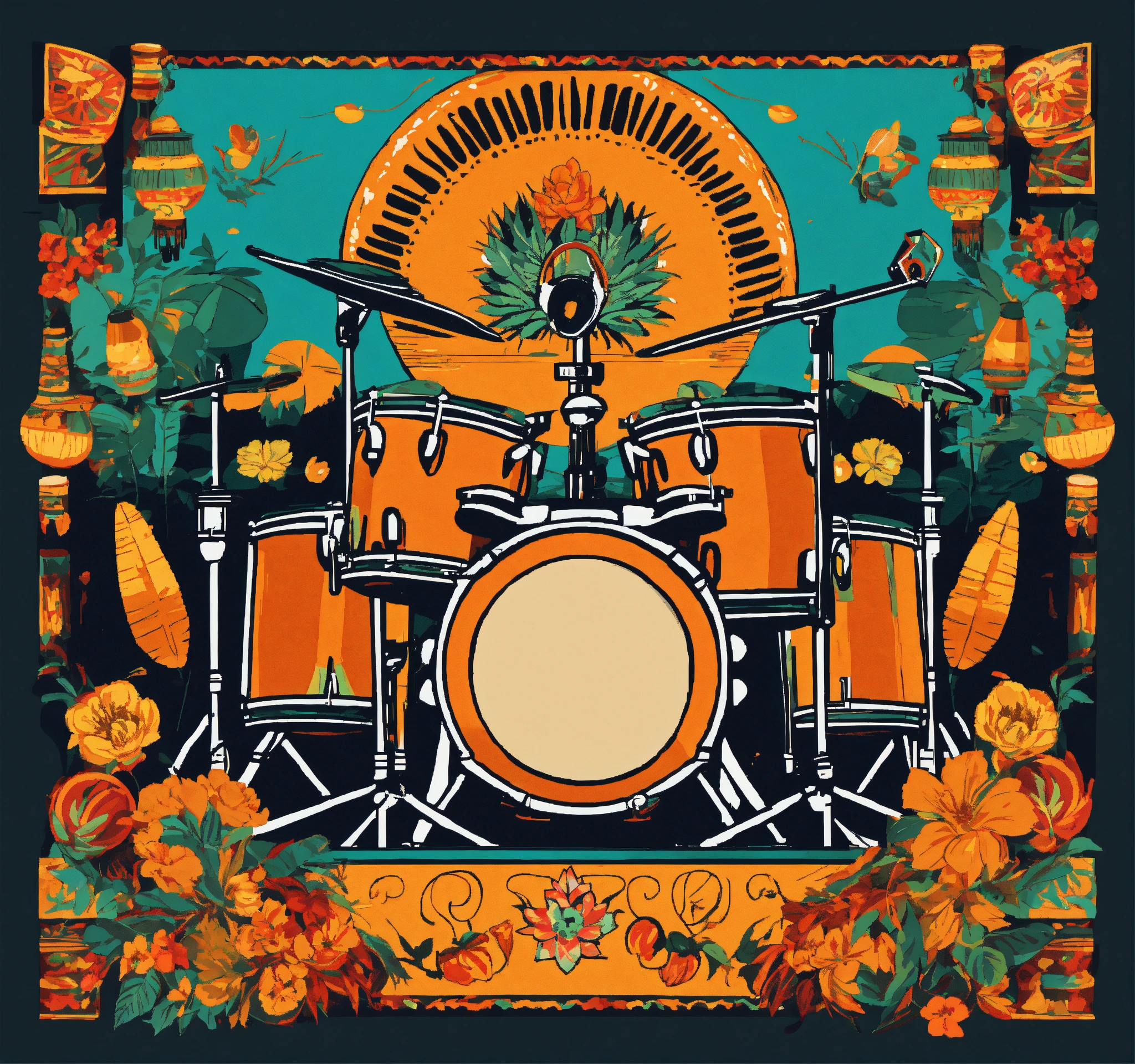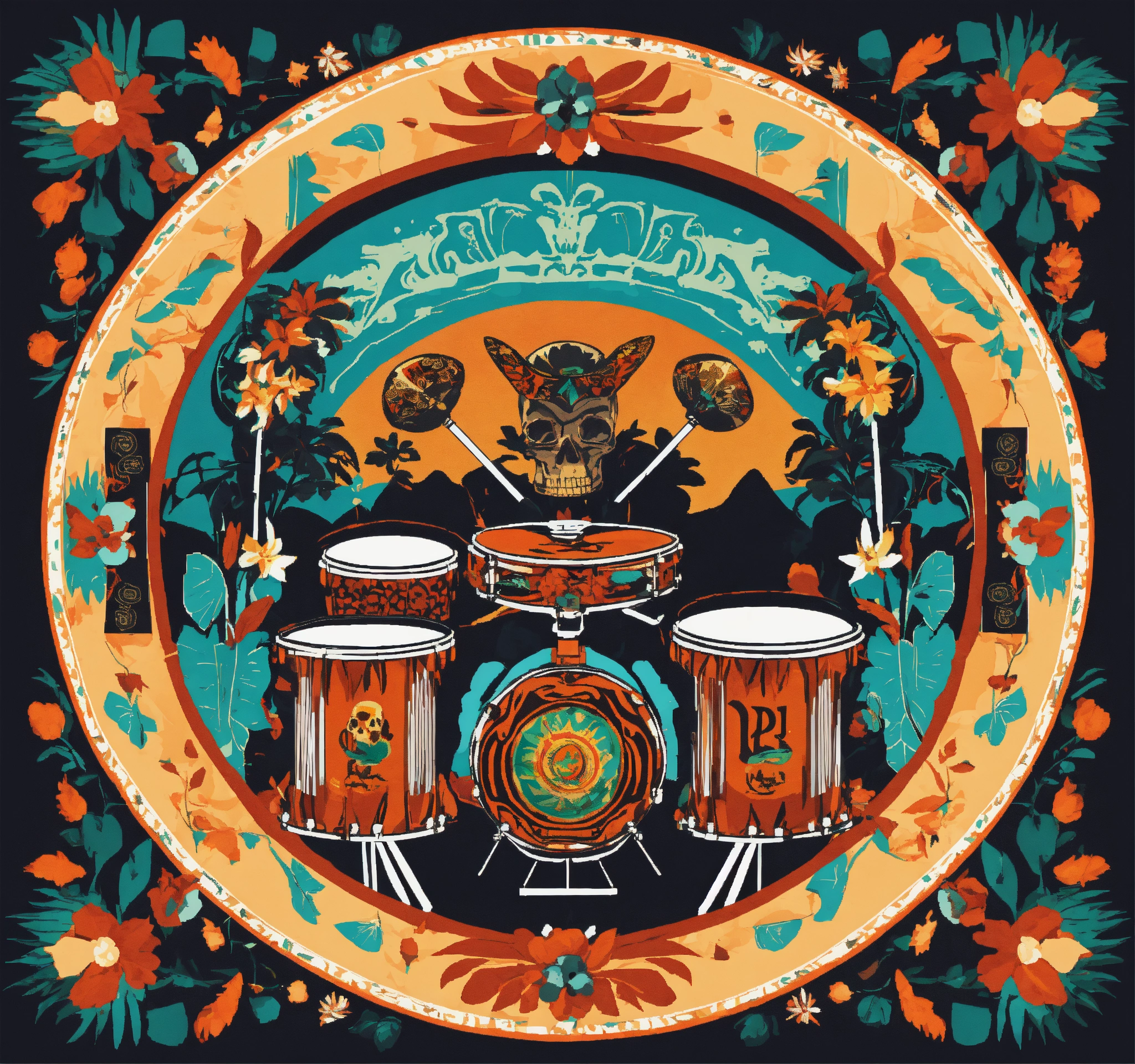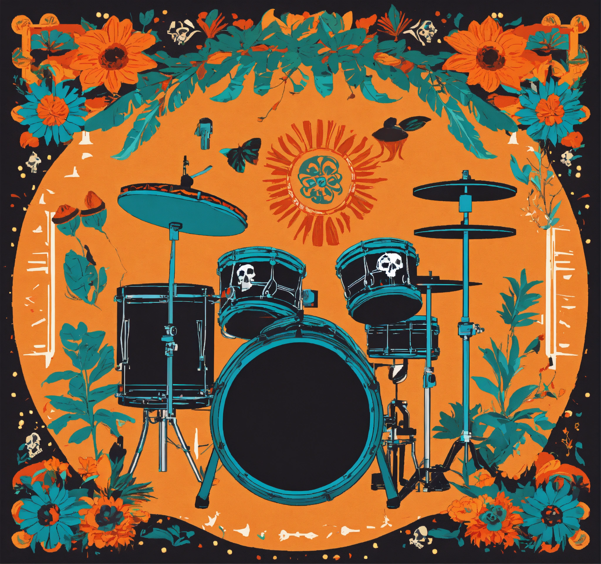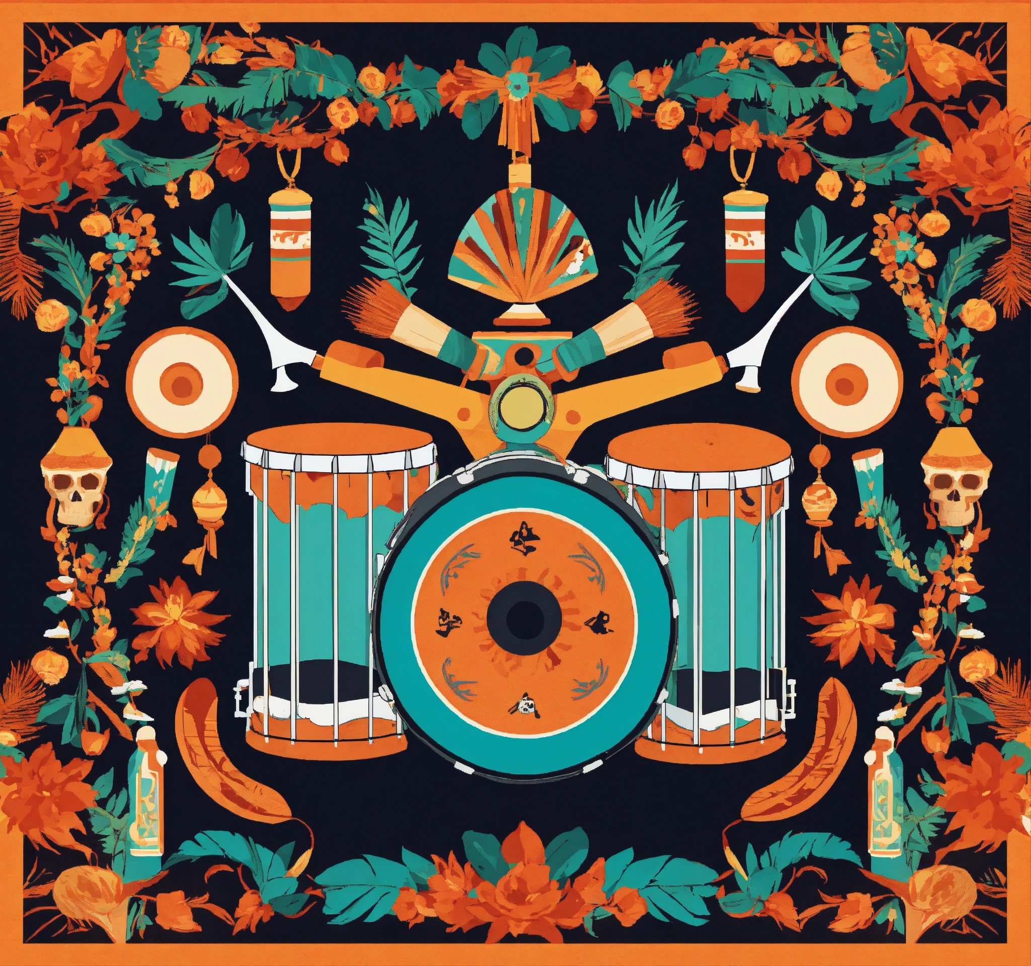 Vector flat flyer, flyer flat vector 2d image of a drum set surrounded by mexican ornamental elements such as mates, skulls, garlands of lights and native plants, colors orange, turquoise and black