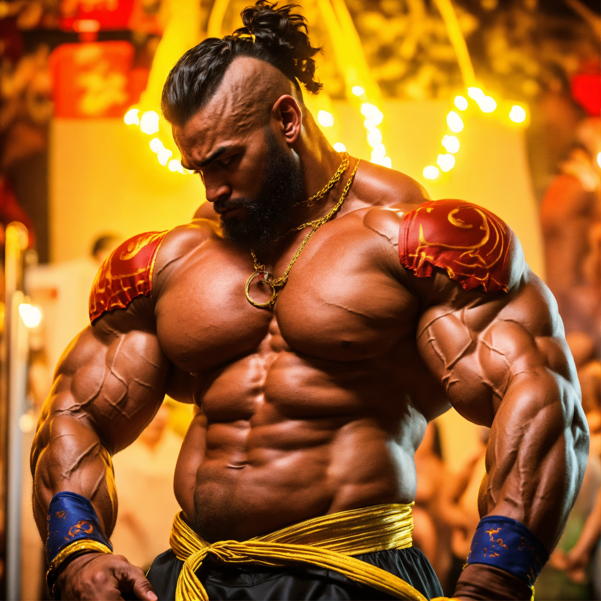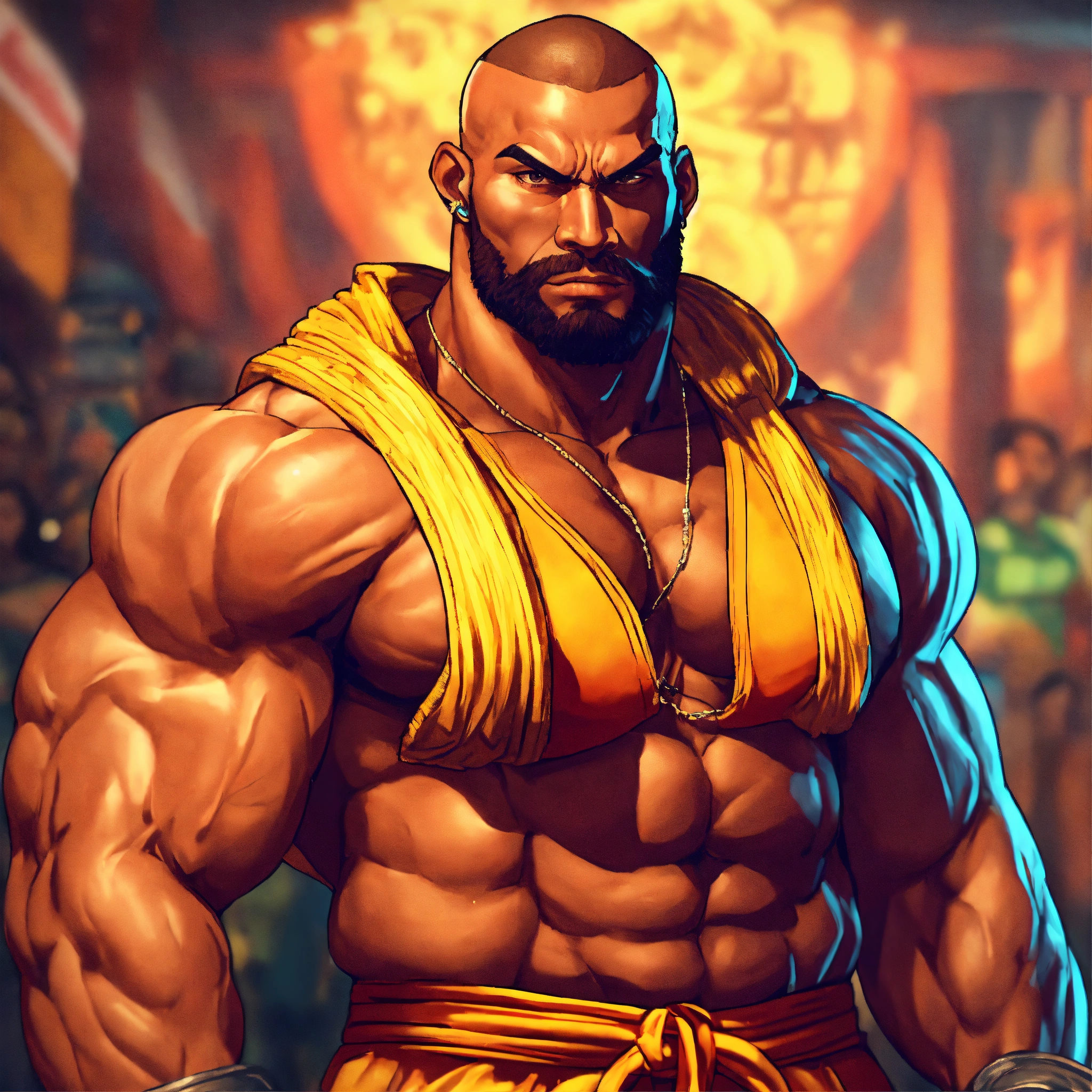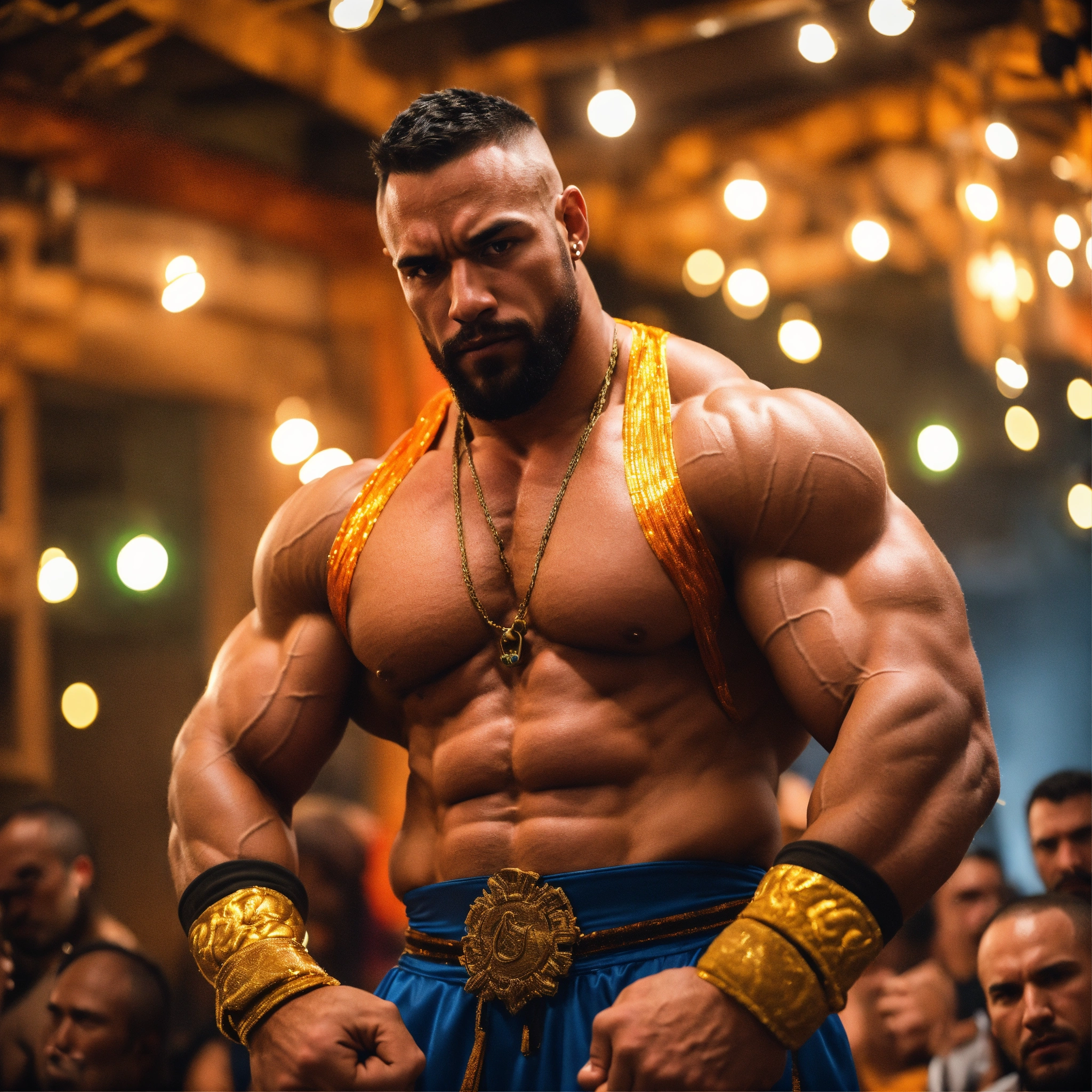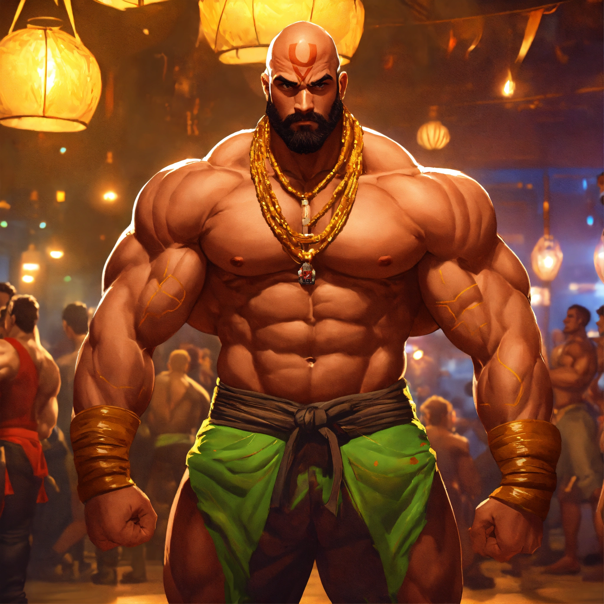 30-year-old man with big muscles, big bodybuilder, body like a wrestler, dhalsim from street fighter, at a party
