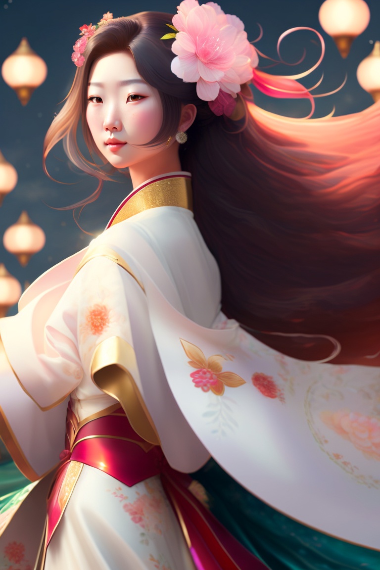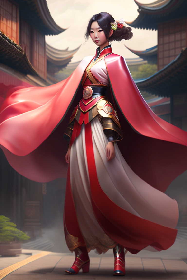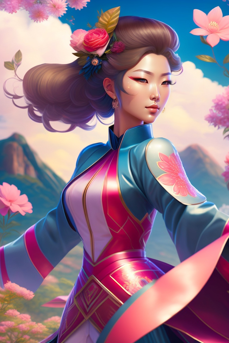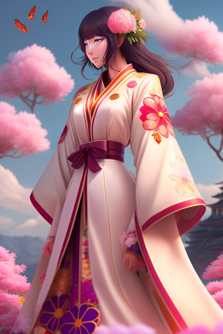 The female japanese superhero stands resolute, her kimono-like dress flowing gracefully, each petal-shaped motif representing a beacon of healing and hope as she channels her hanami hikari power, her entire ensemble emanating an aura of strength and resilience.