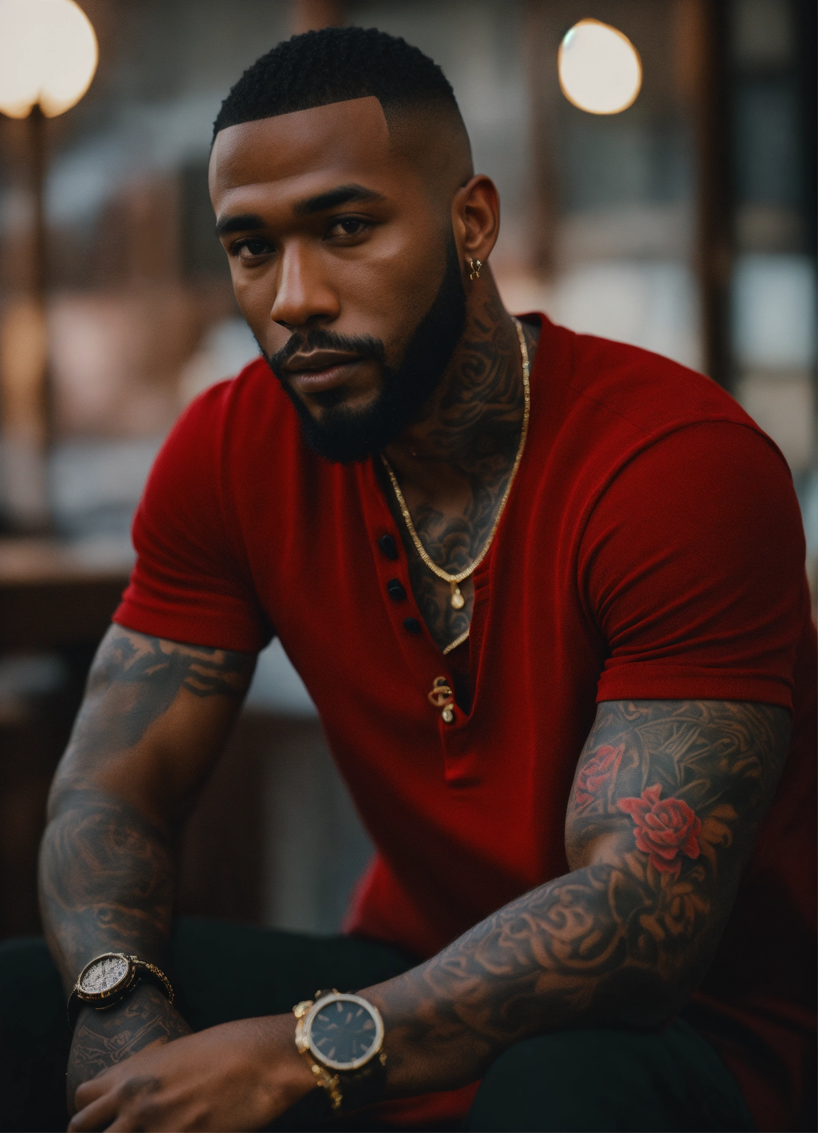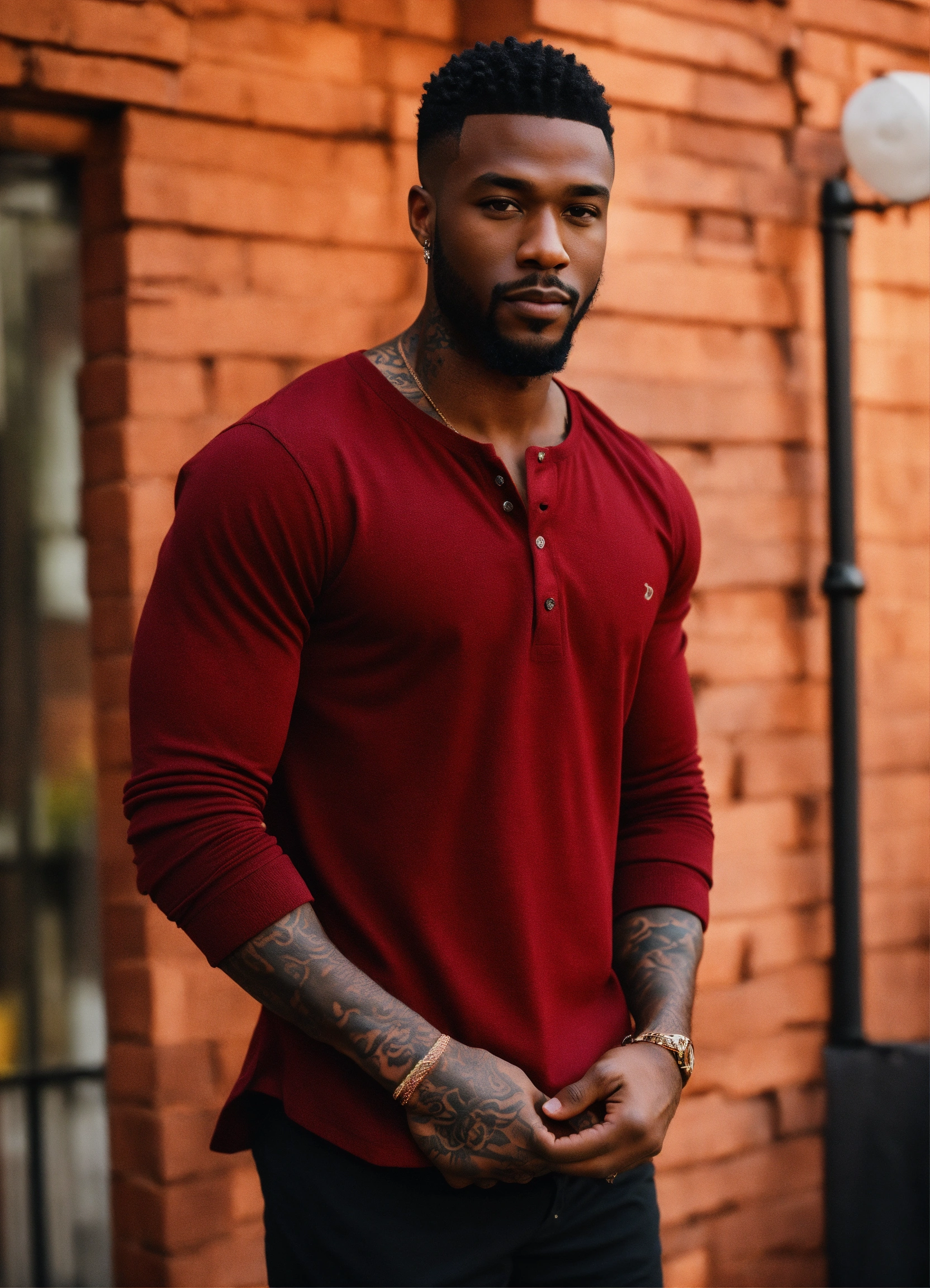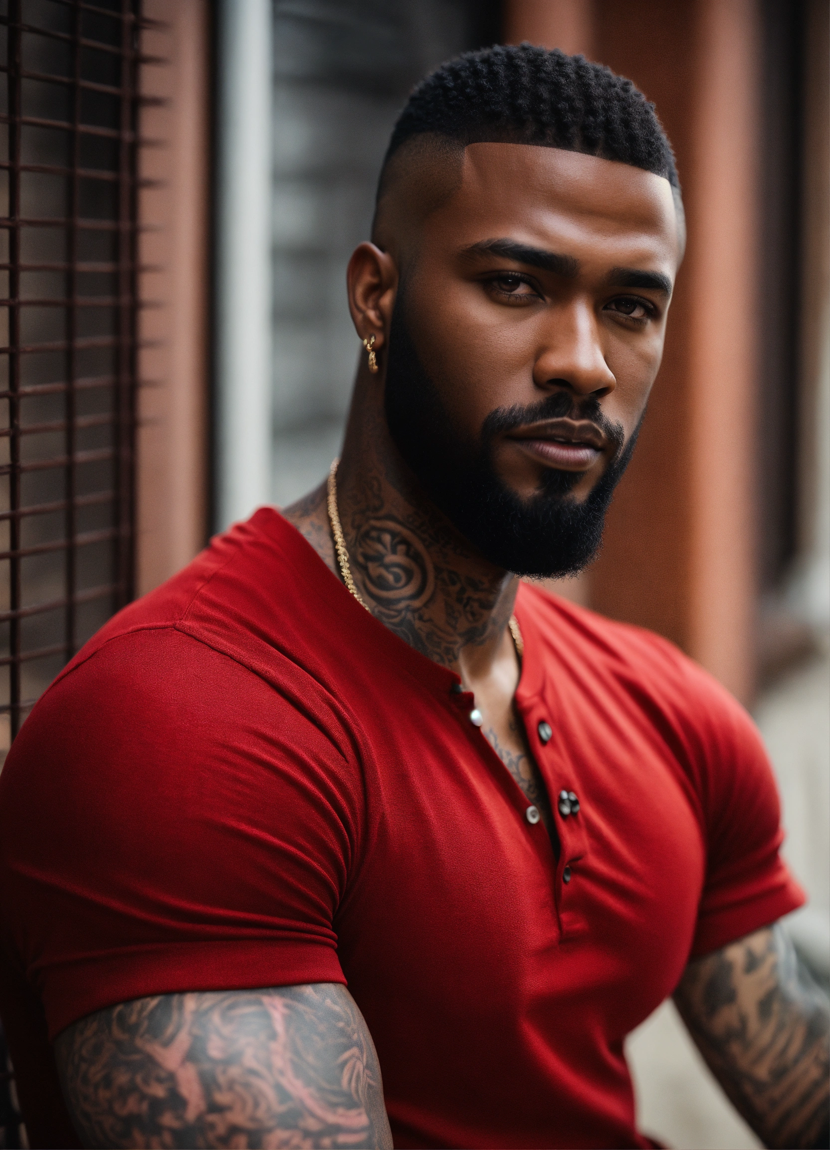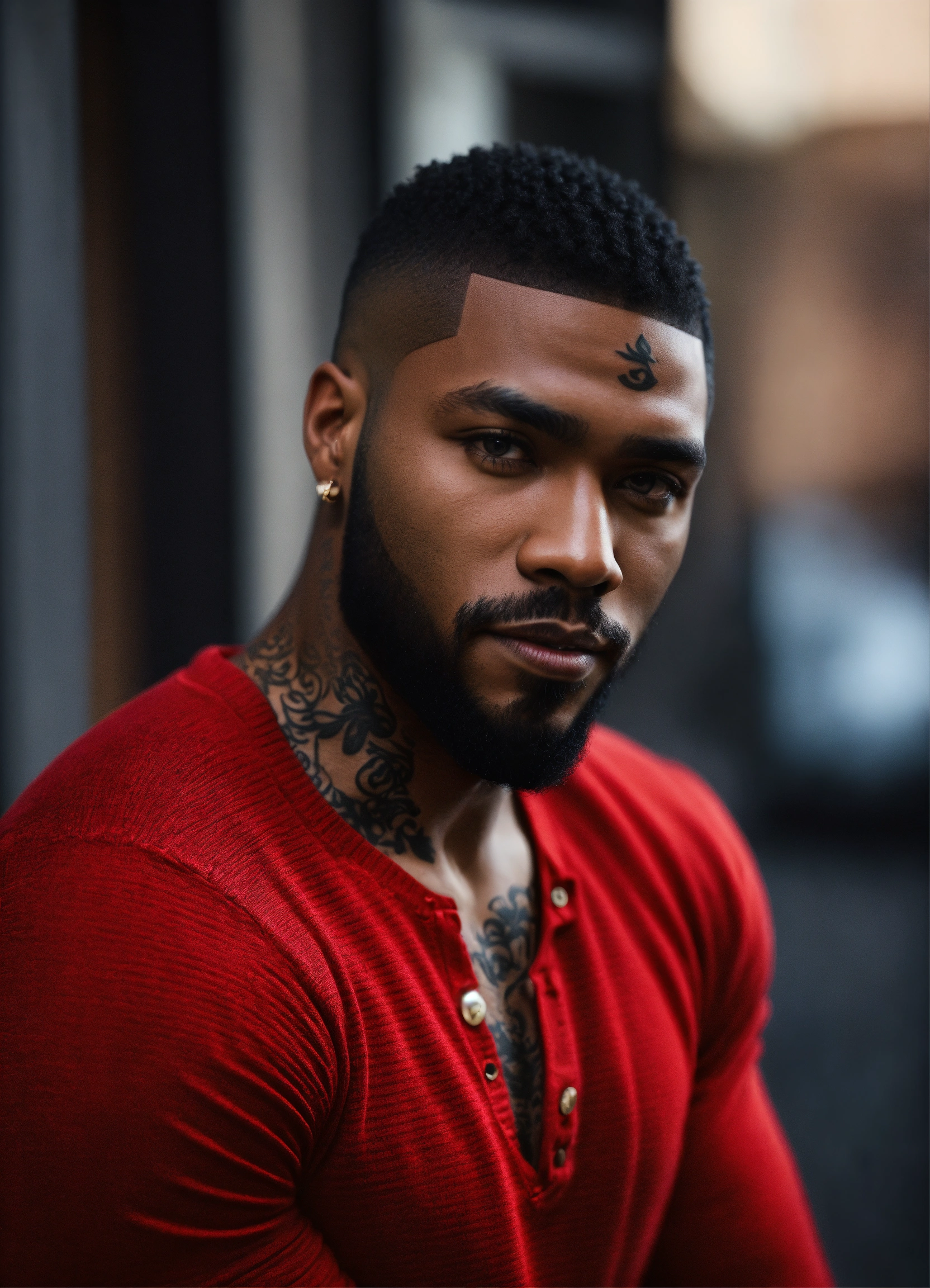Handsome black man, low hair, caesar cut. cut beard, dark eyes, dark skin, tattoos on arms, red long sleeve henley, realistic portrait