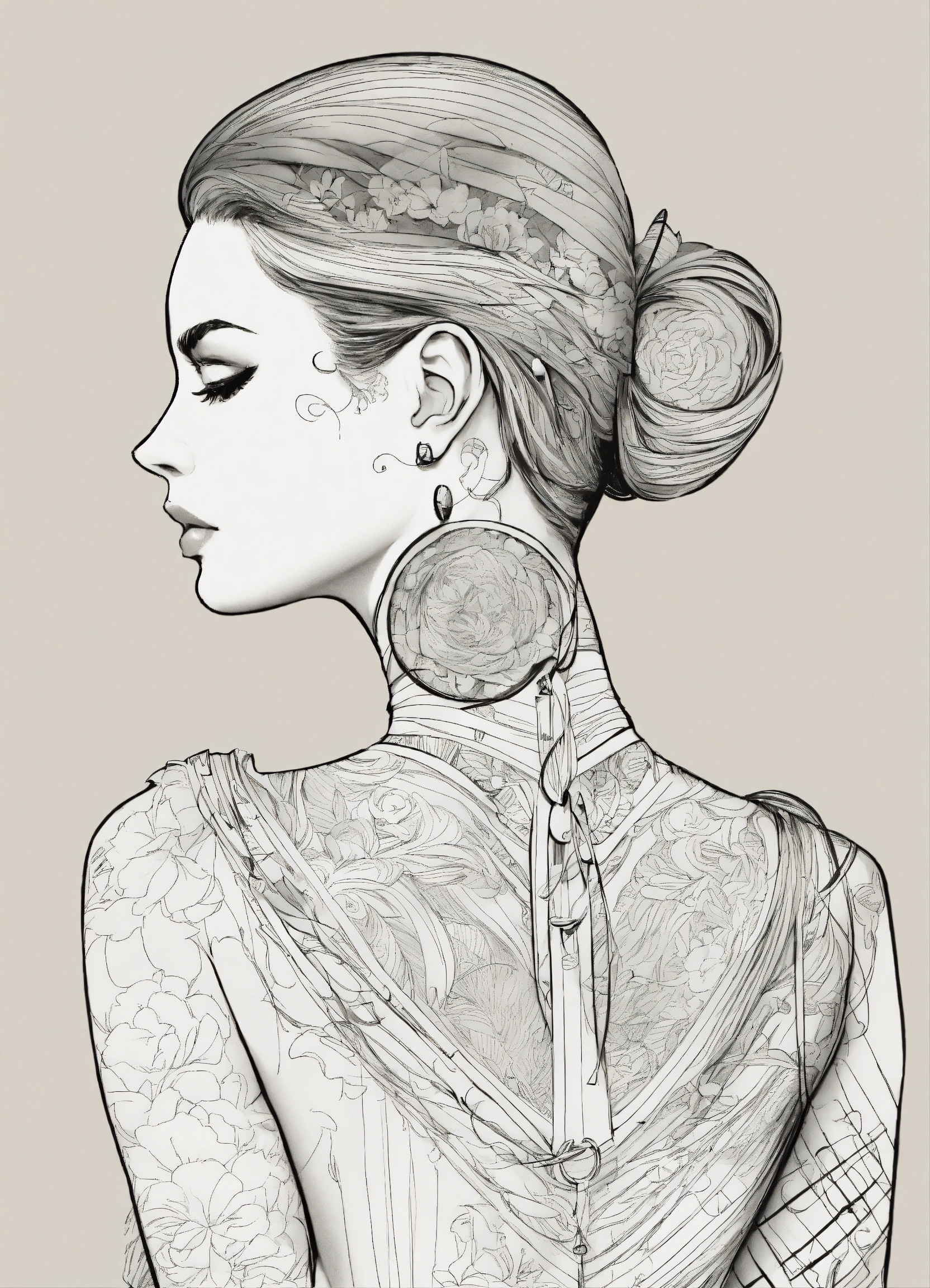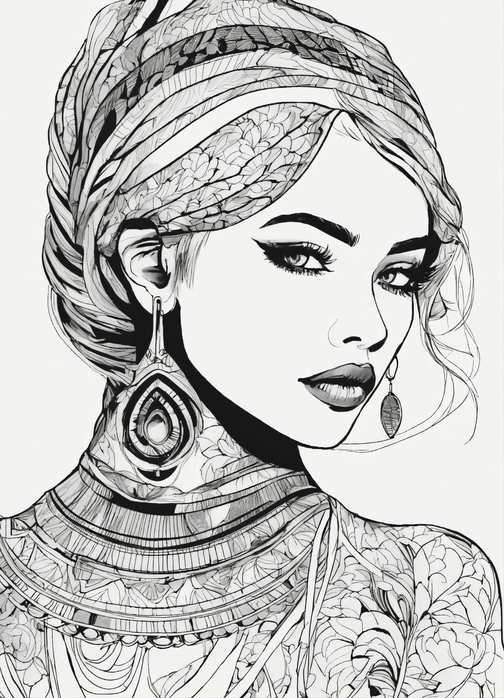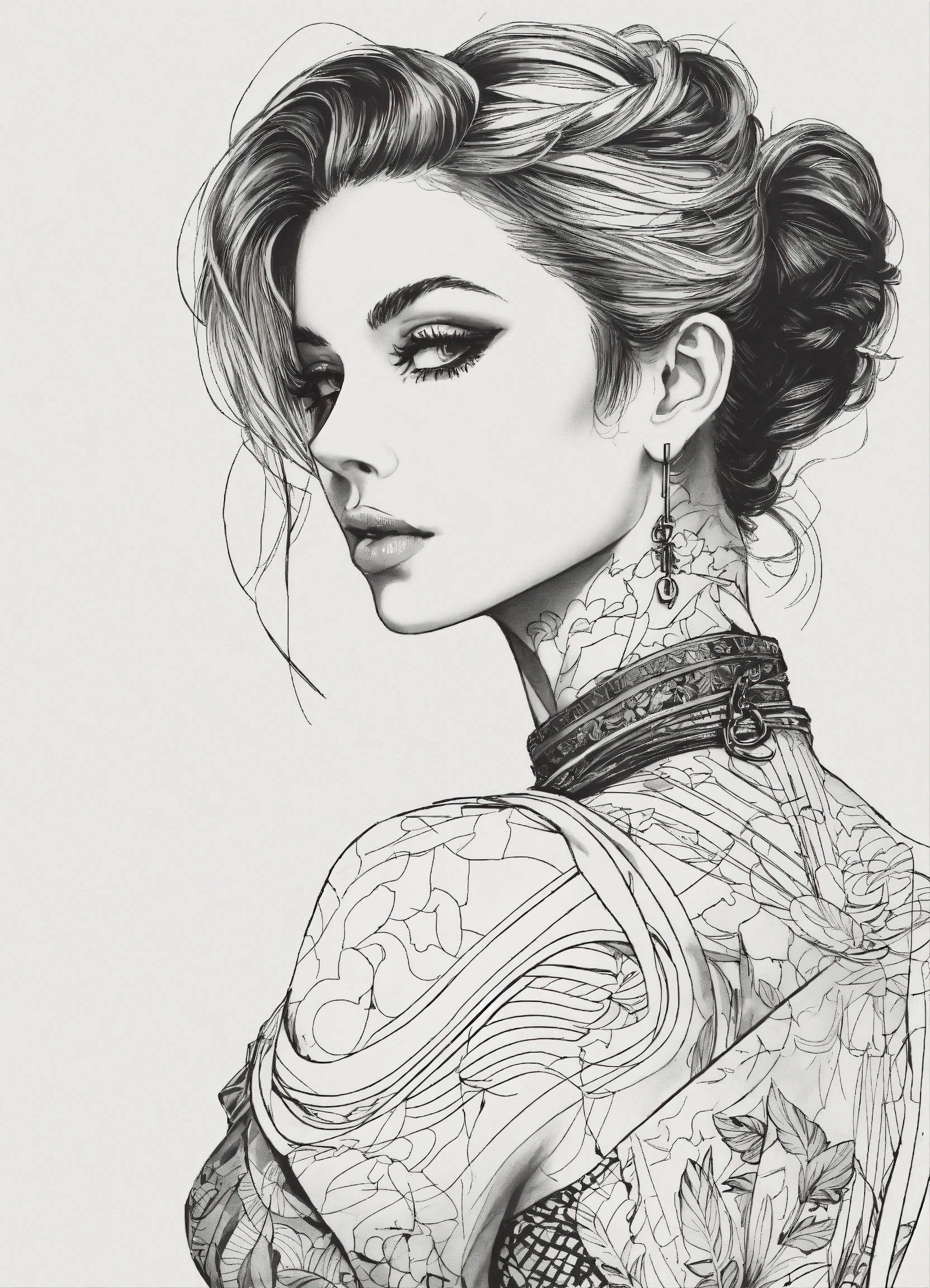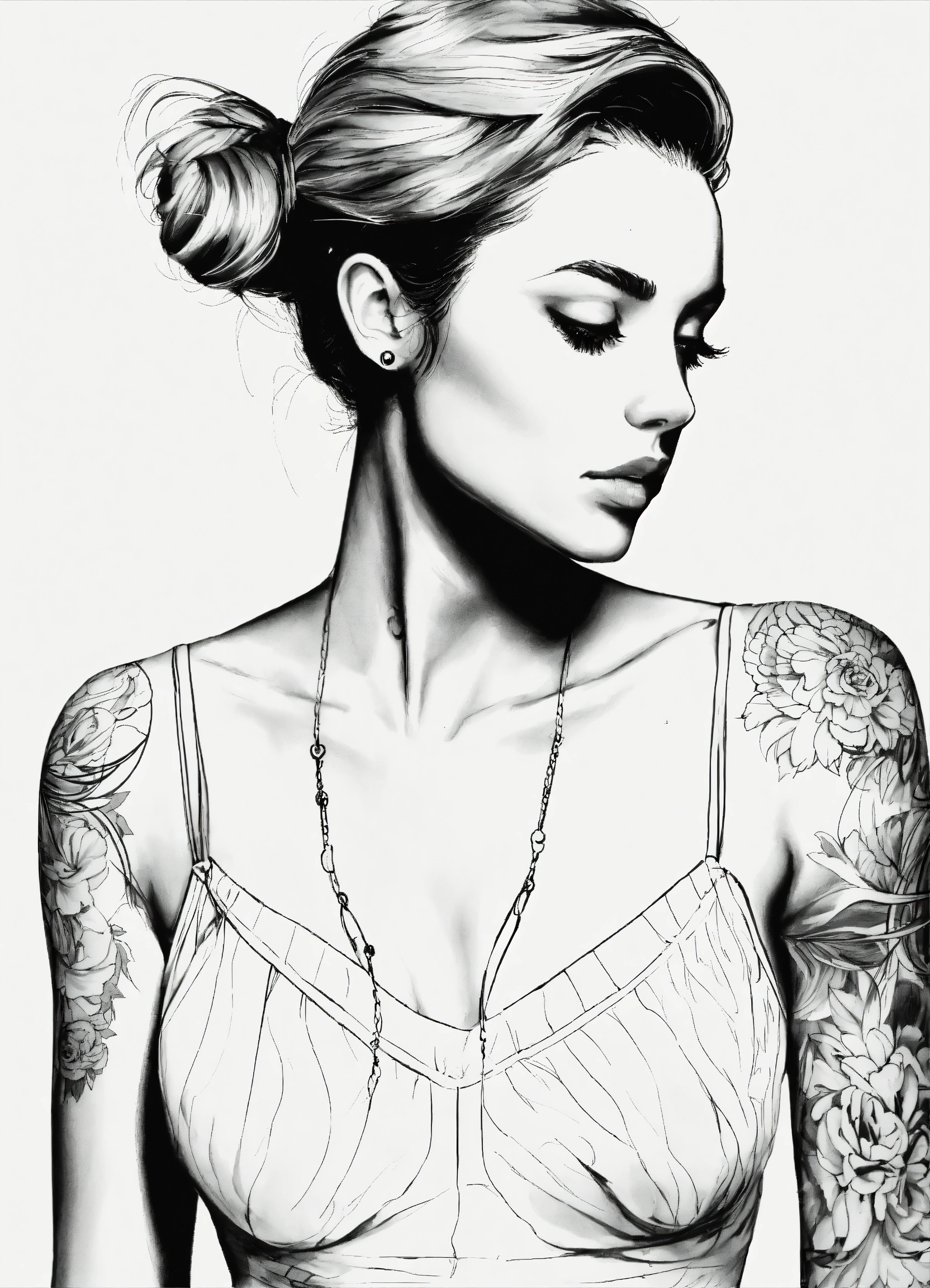 Black and white line drawing, woman, upper body, lines, shoulders, retro, neck tattoos, white background, clip art