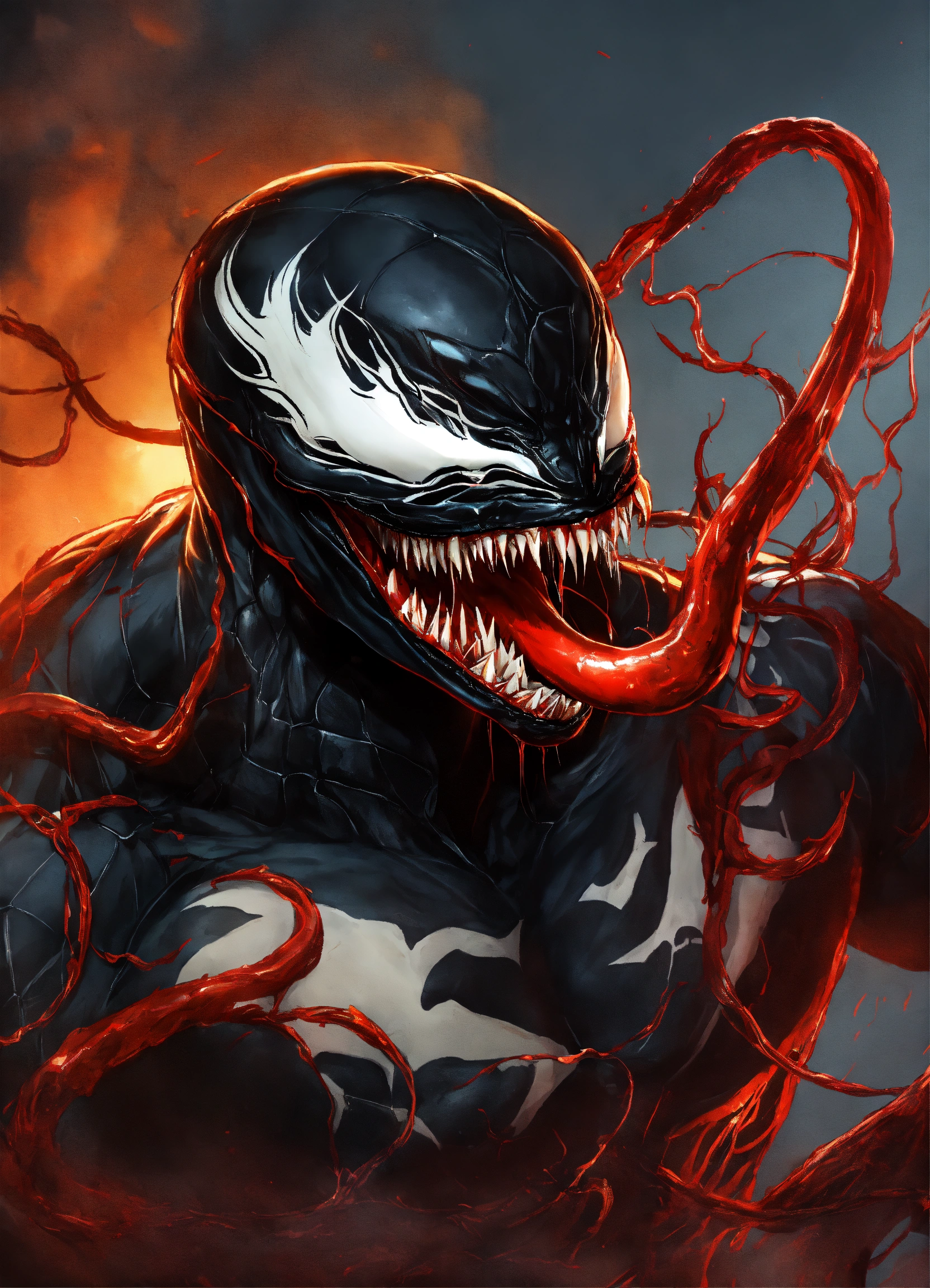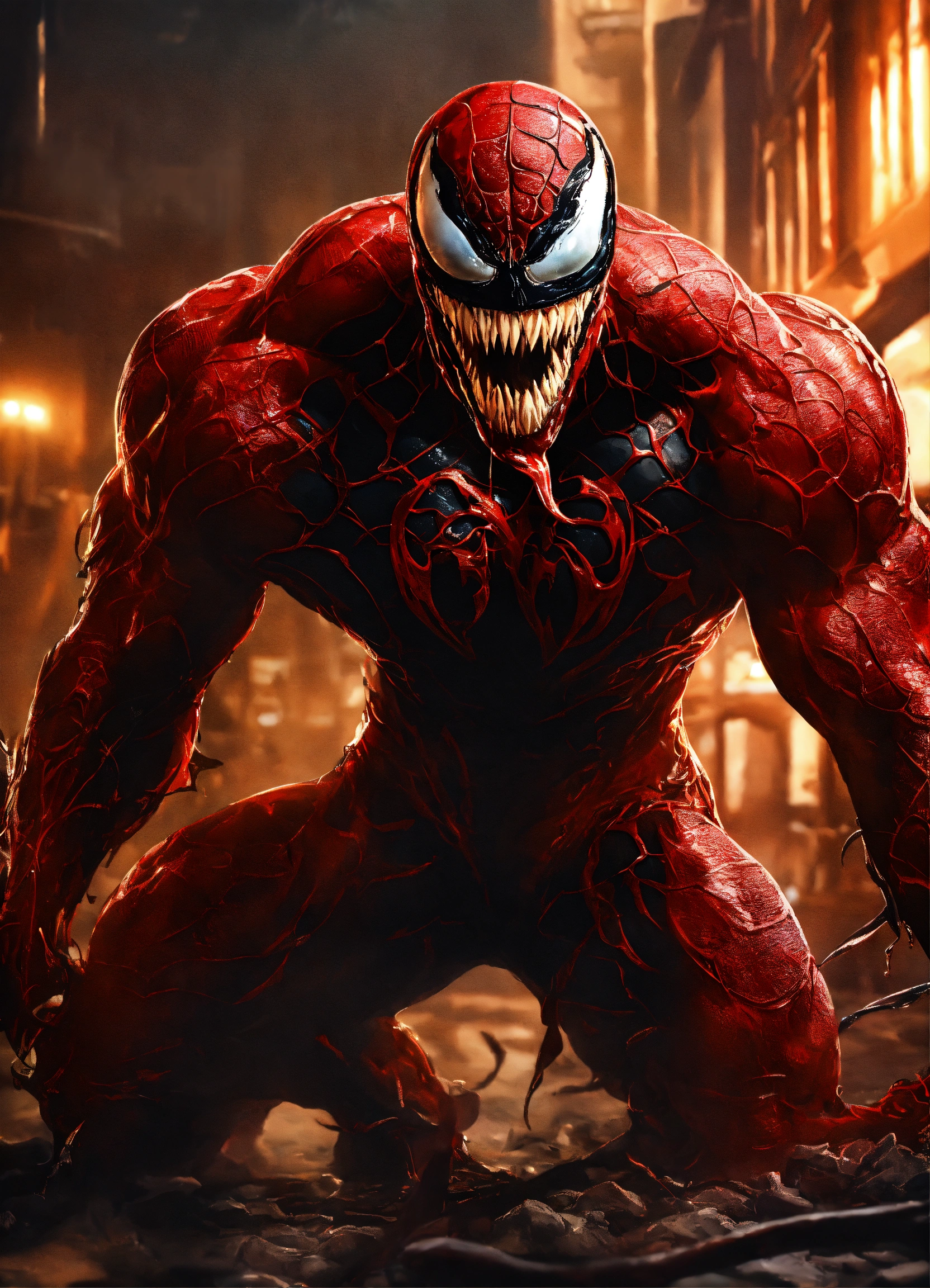 Venom, simbionte, rojo, múltiples garras, colmillos afilados, posición de ataque, total realismo, restar el color, hd 8k, cubierto de una piel roja, aterrador