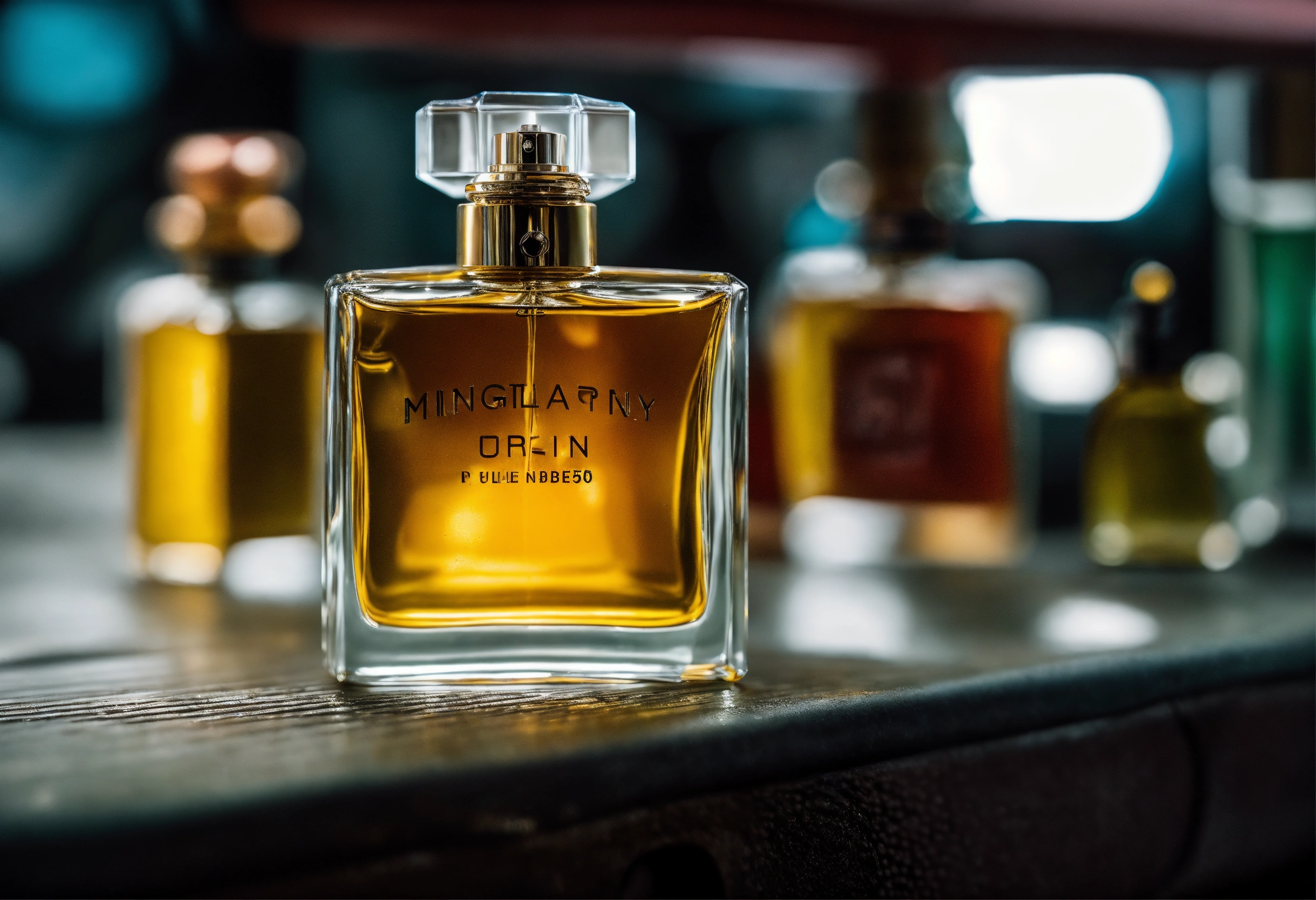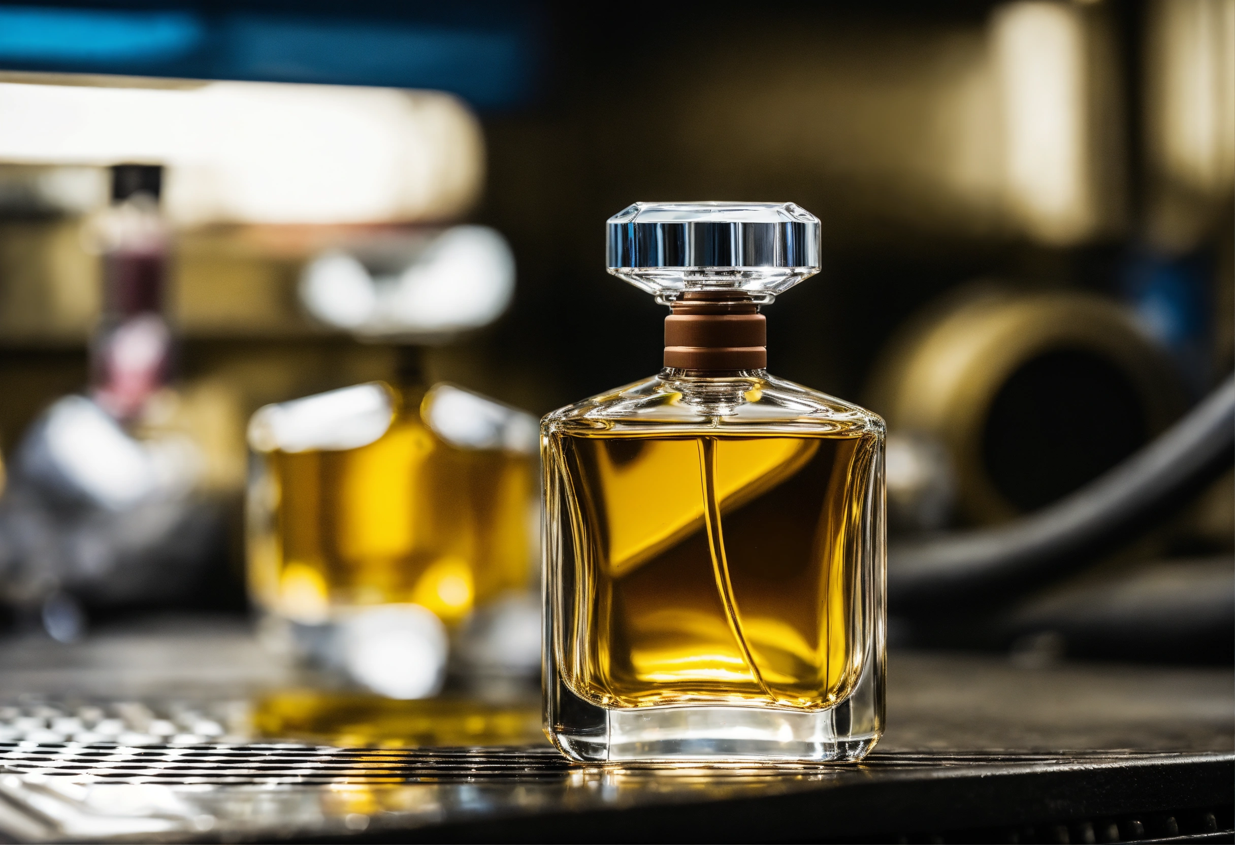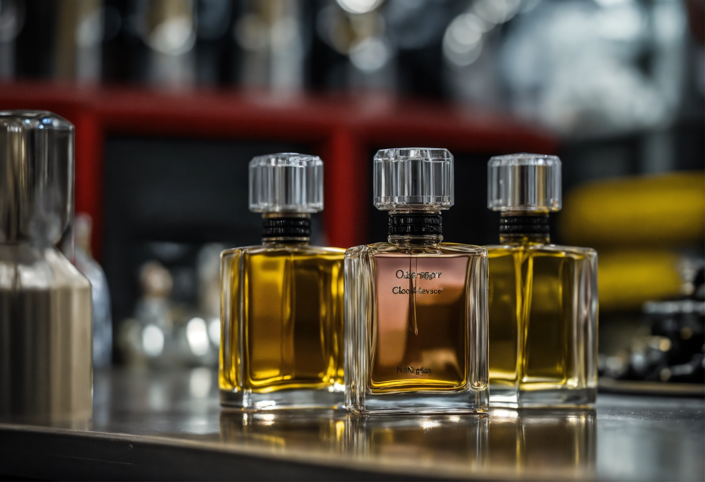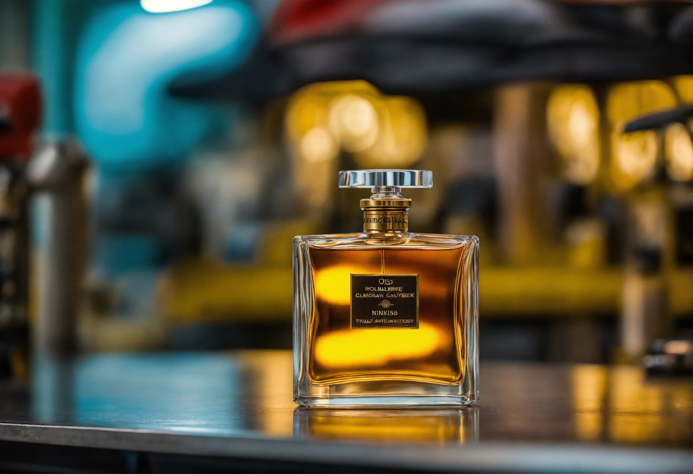 Full length view, a table full of perfume bottle, the olfactory universe of an automotive garage, where the scent of rubber tires mingles with the metallic tang of machinery, creating an industrial symphony for the senses, close-up of a perfume bottle, nikon d5600 photography