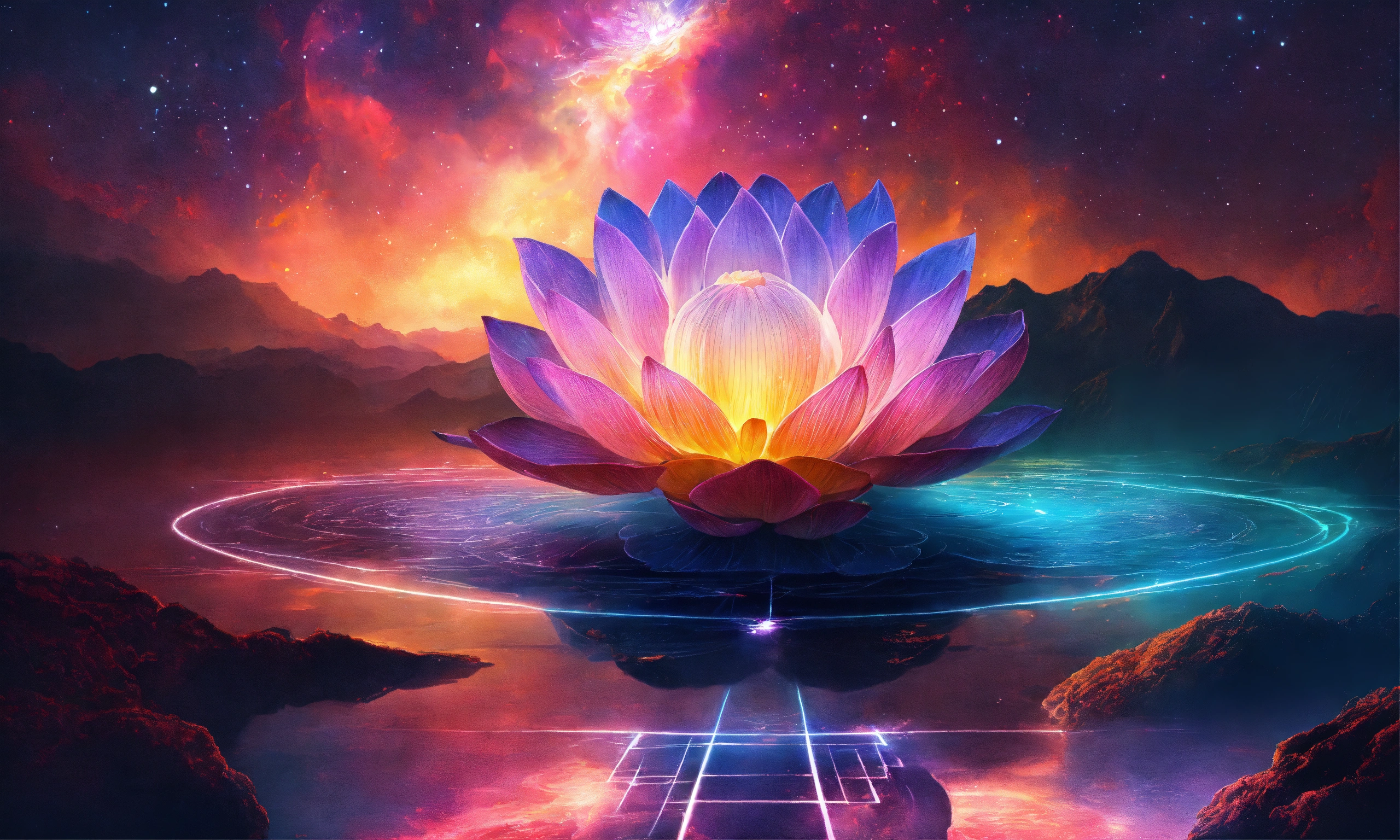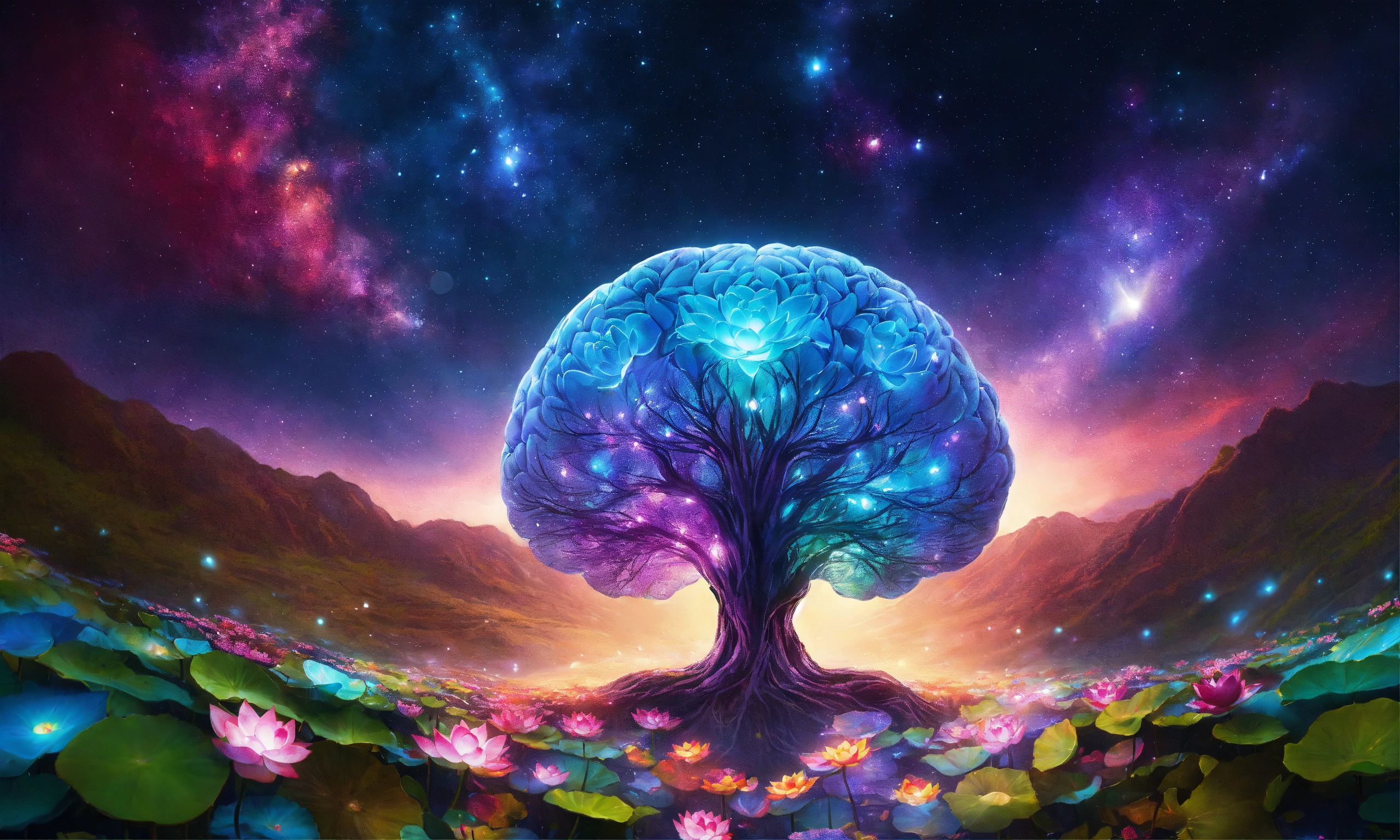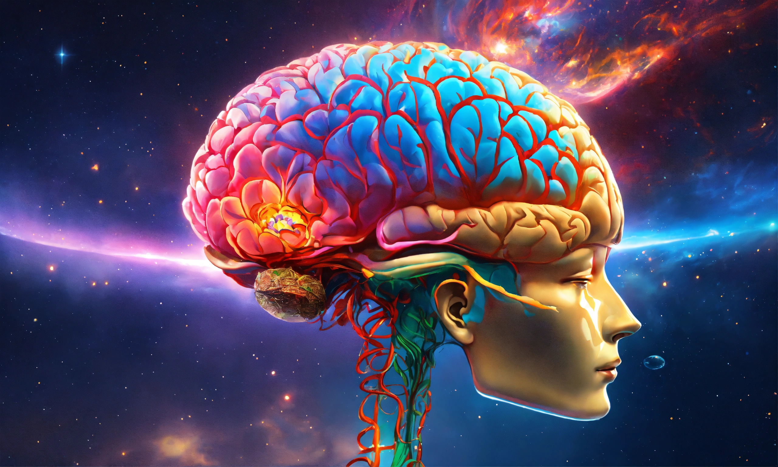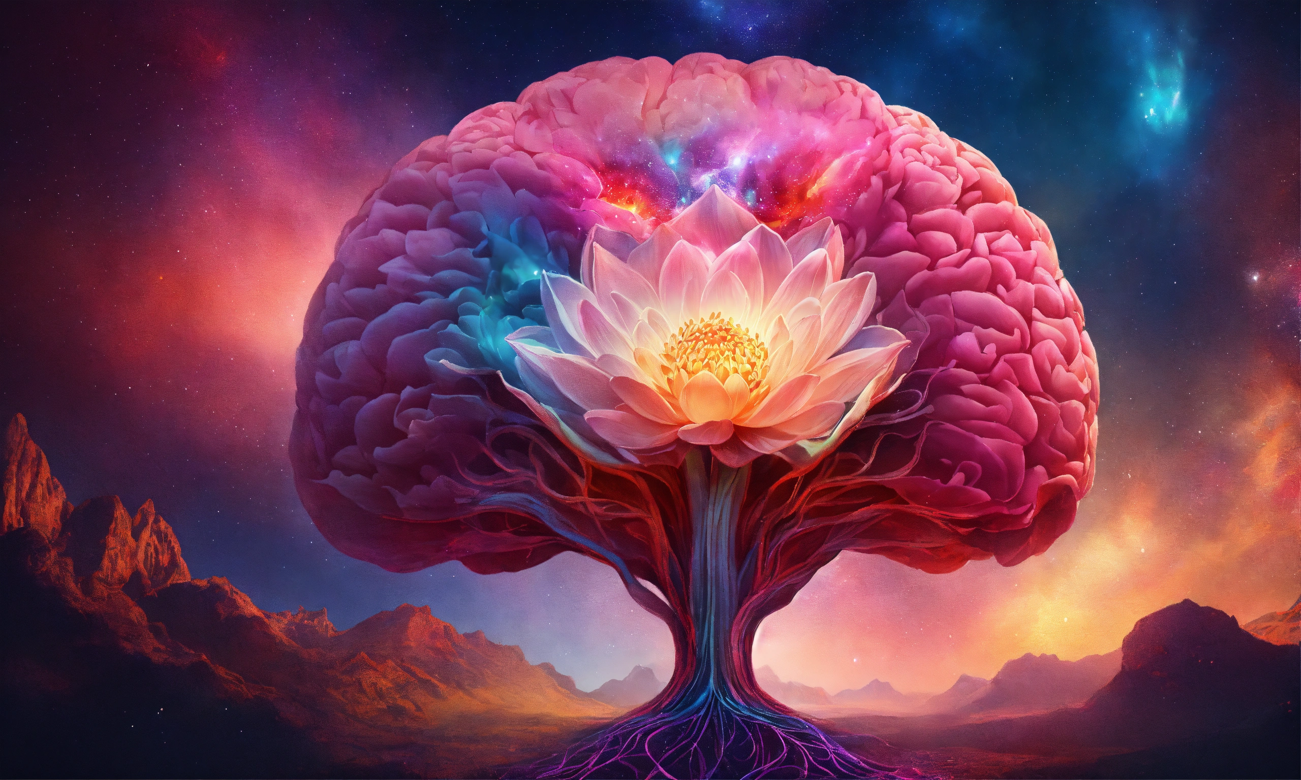 Human brain is exuding magical light of vibrant colors, put a vibrant lotus flower inside this human brain, a mesmerizing universe