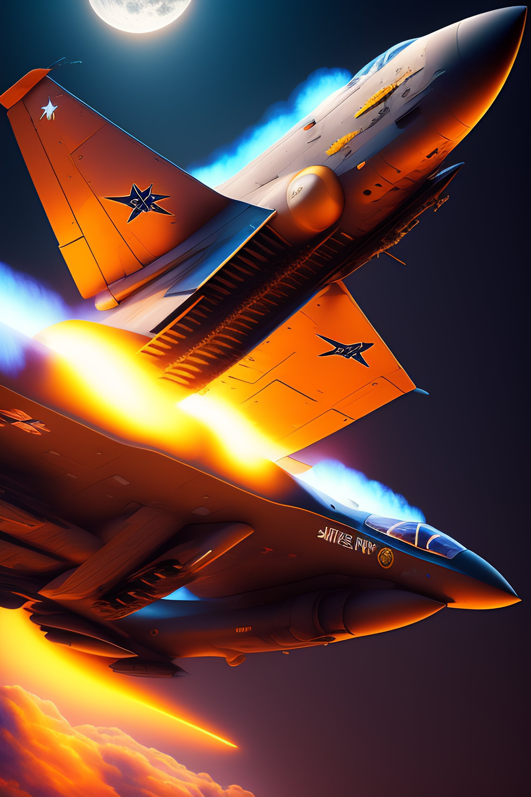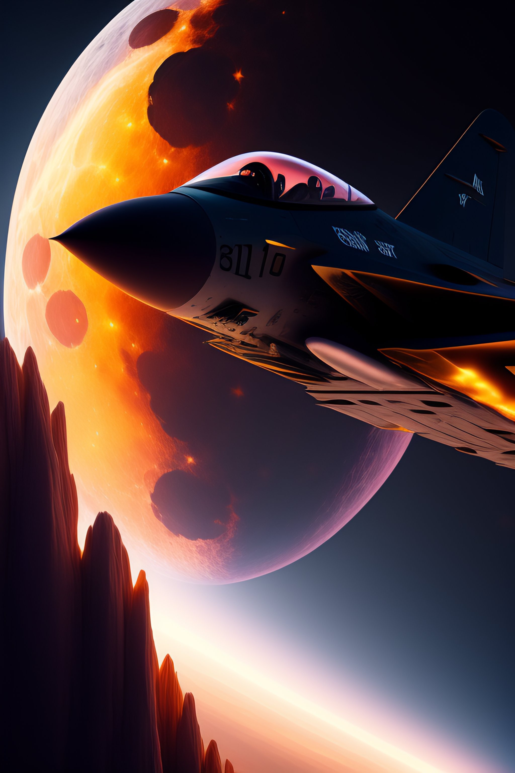 Fighter jet to the moon by artgerm and moebius, beautiful, hyperrealism, highly detailed, 8k, intricate, closeup, dynamic dramatic dark moody lighting, shadows, artstation, concept art, octane render, 8k
