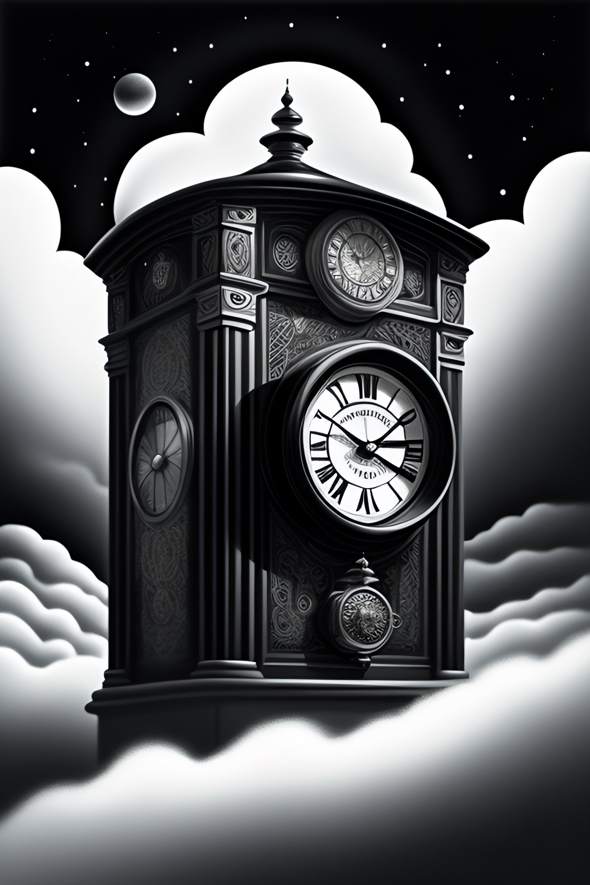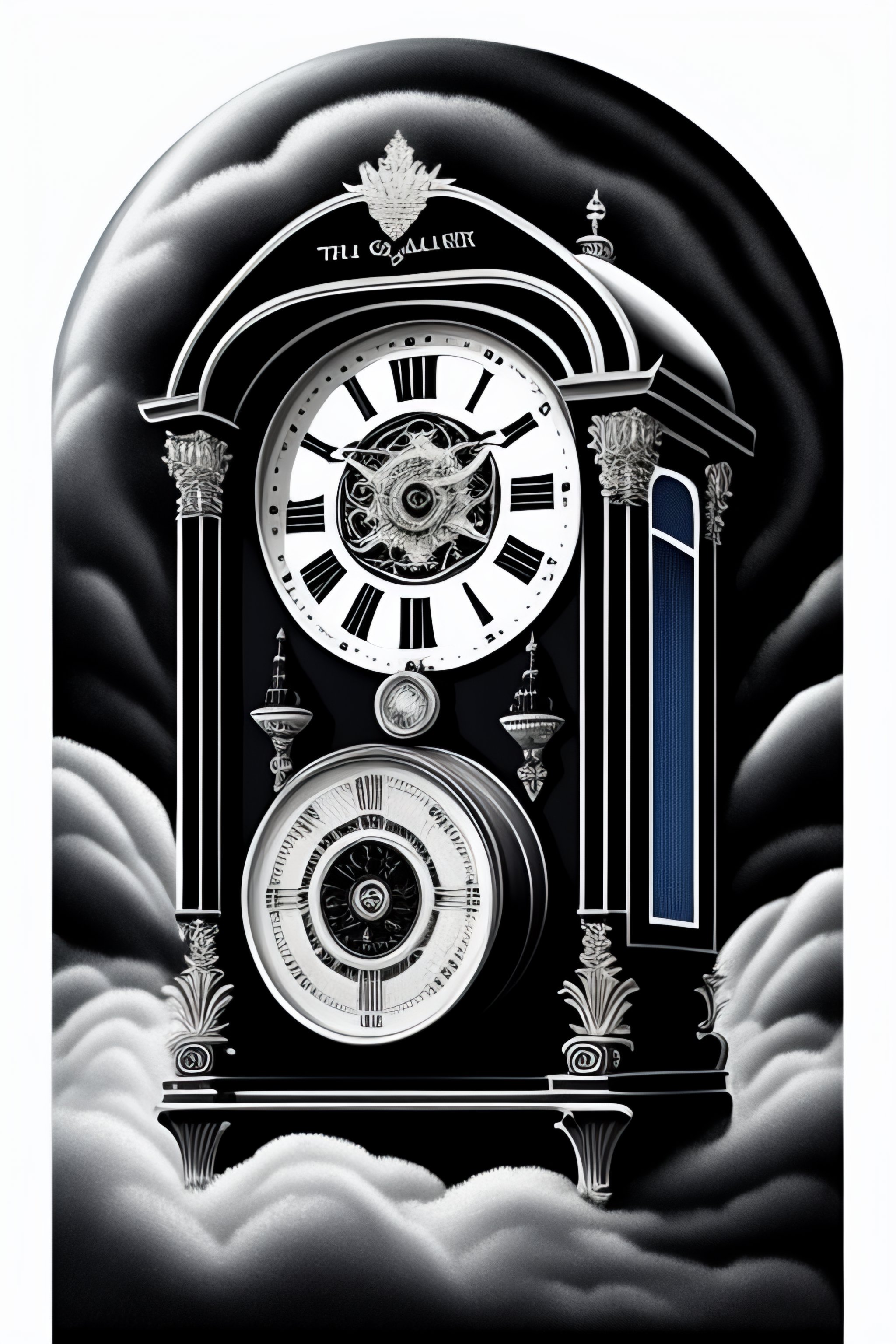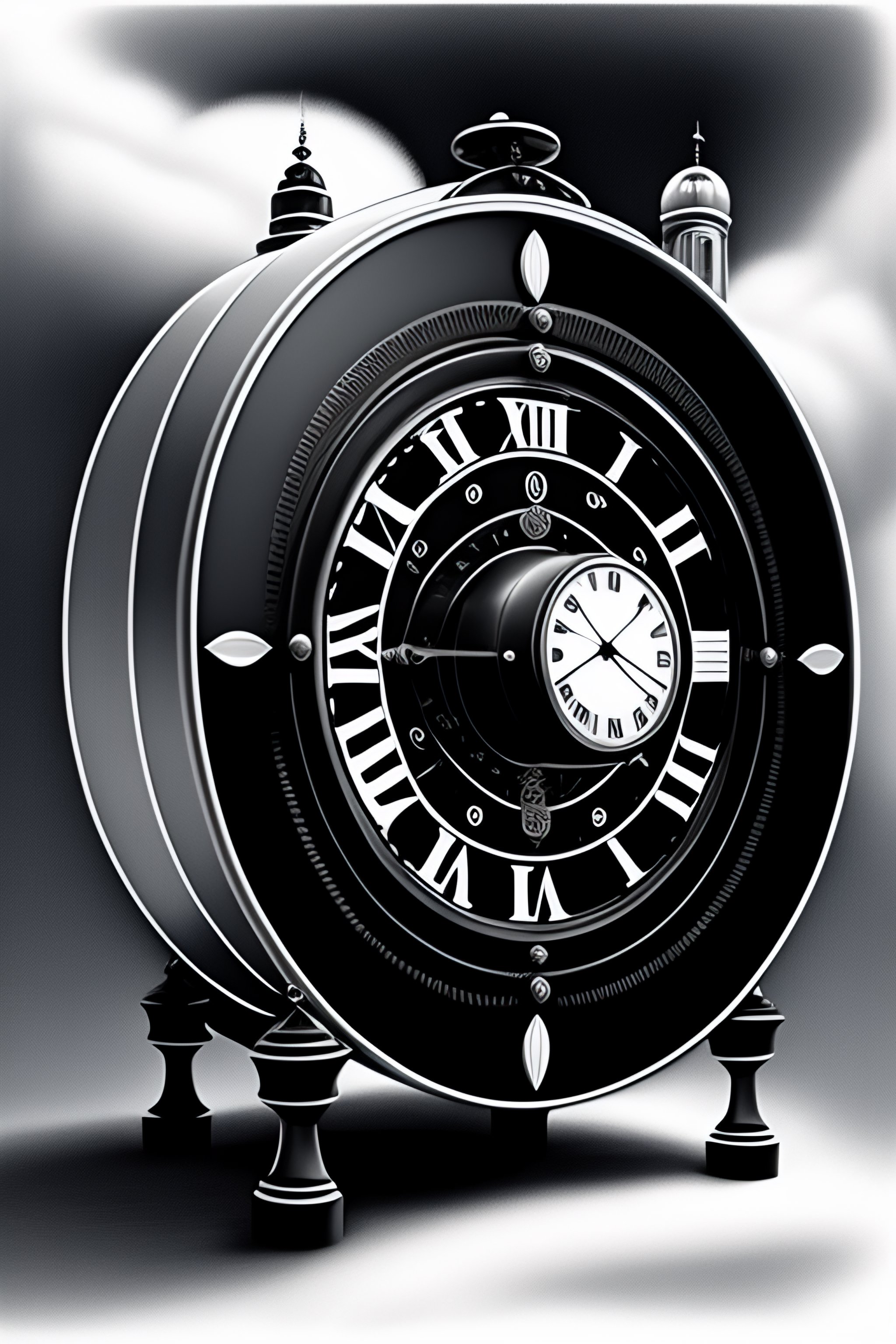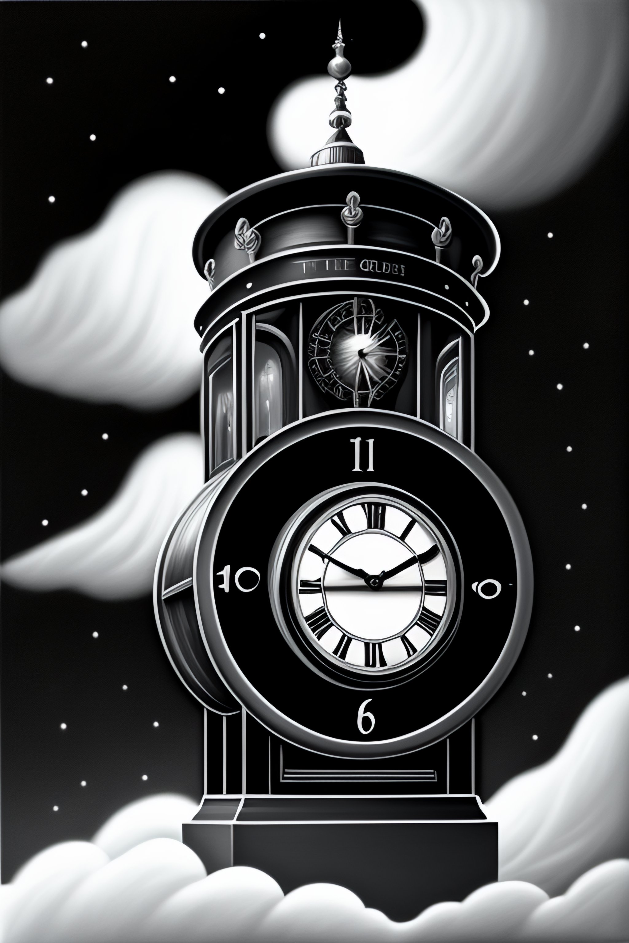 A black and white illustration of a time machine, with a clock face on the front and gears and levers visible inside. the machine is surrounded by swirling clouds and a faint blue glow, giving the impression of movement through time.