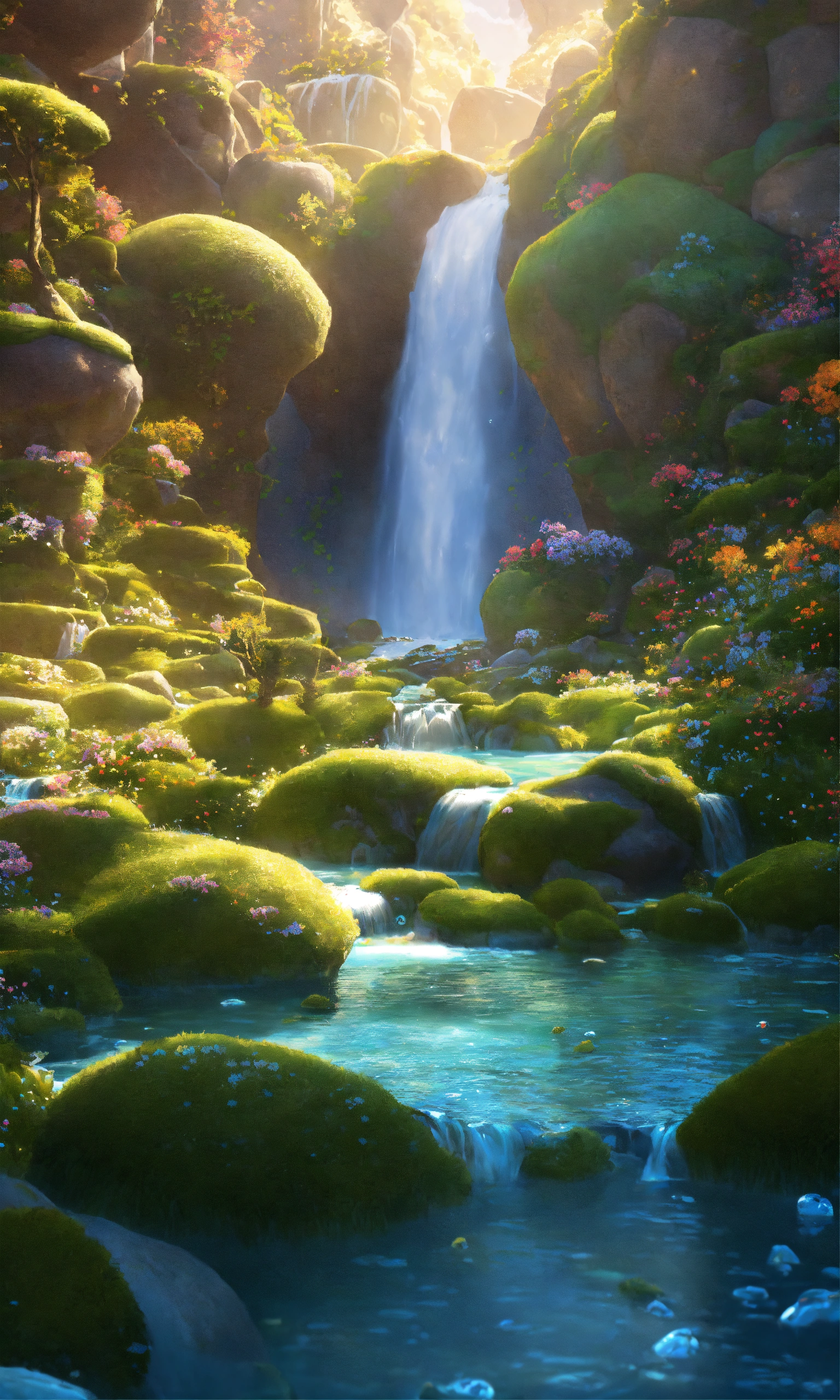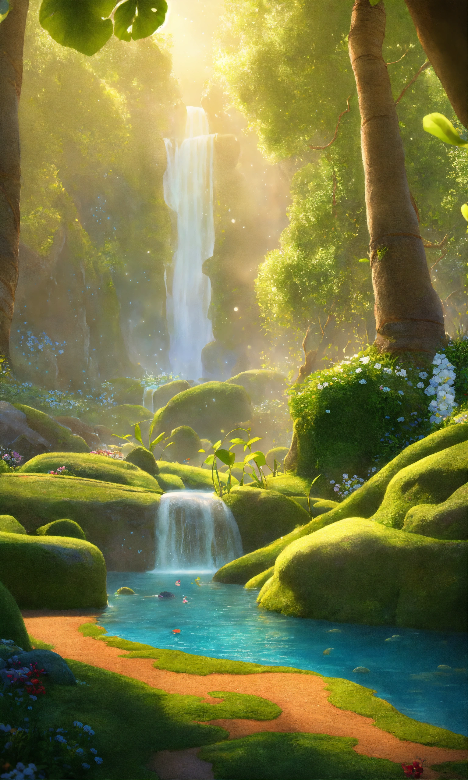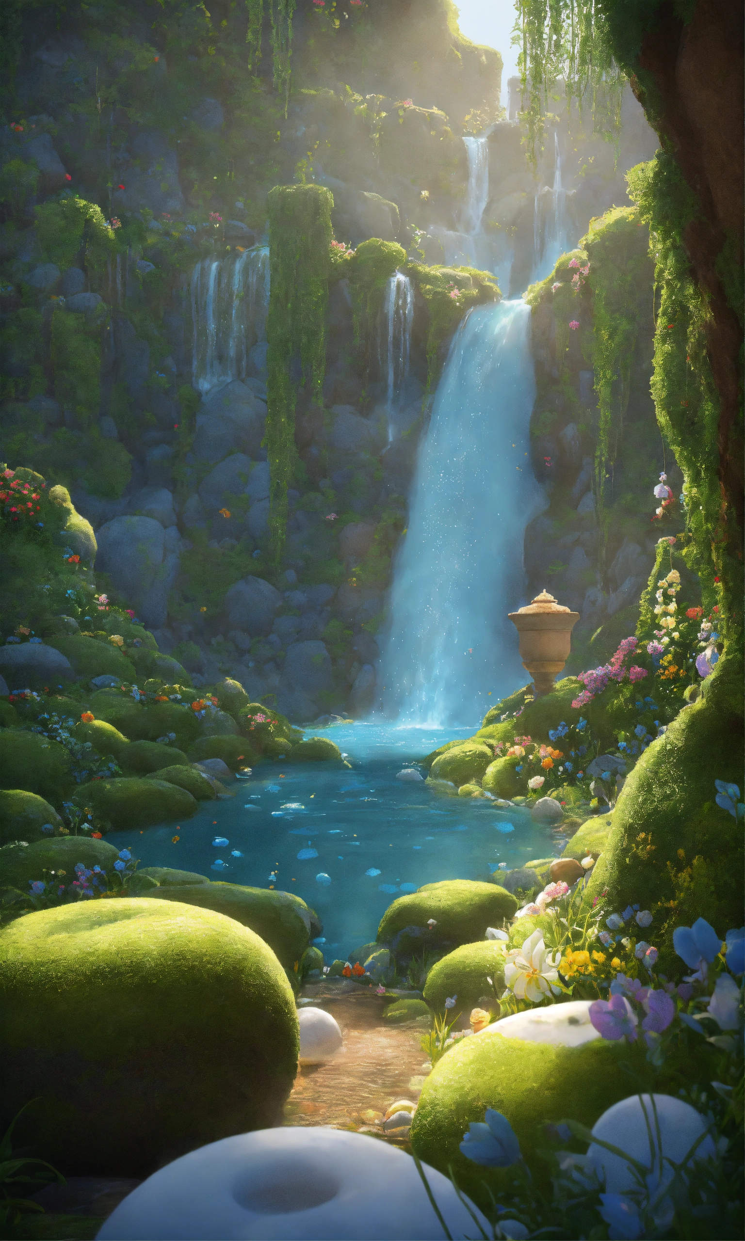 Source du paradis, l'eau de cette source est blanche comme le lait, des perles et des joyaux longent cette source, image féerique conçue par pixar
