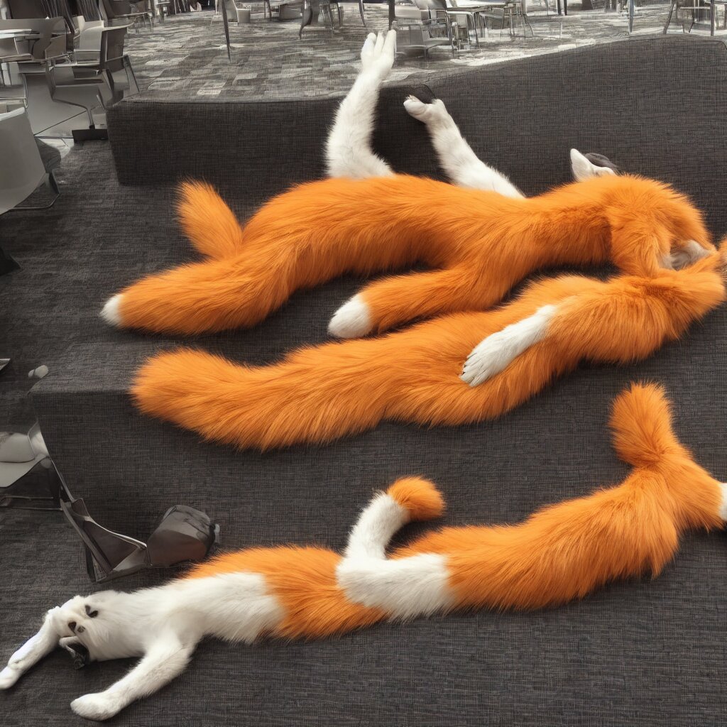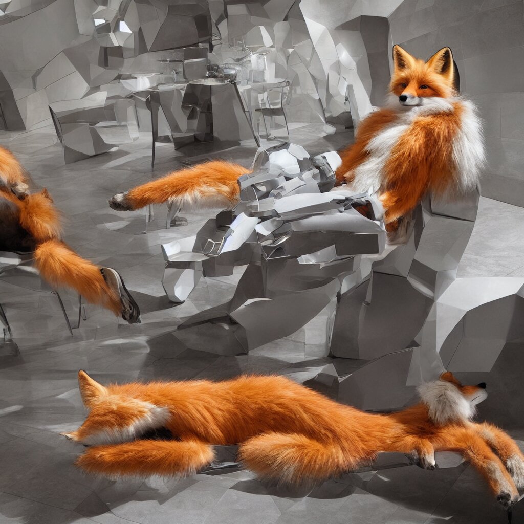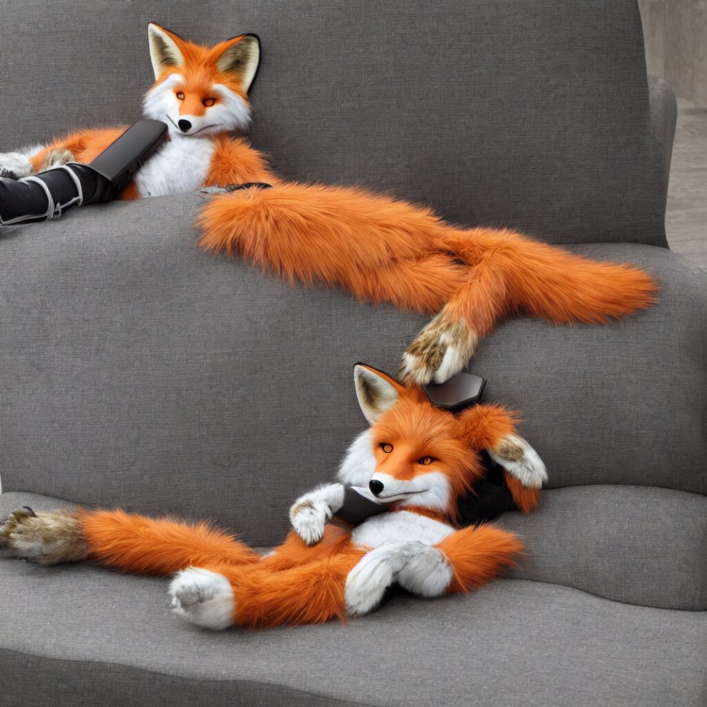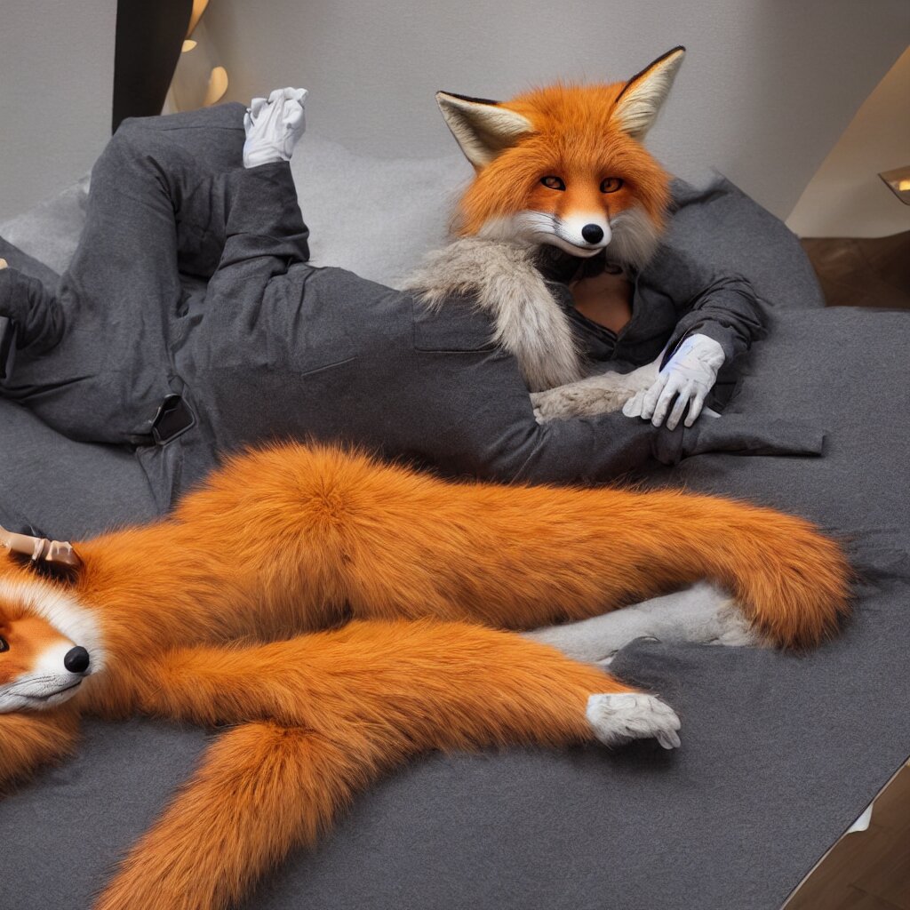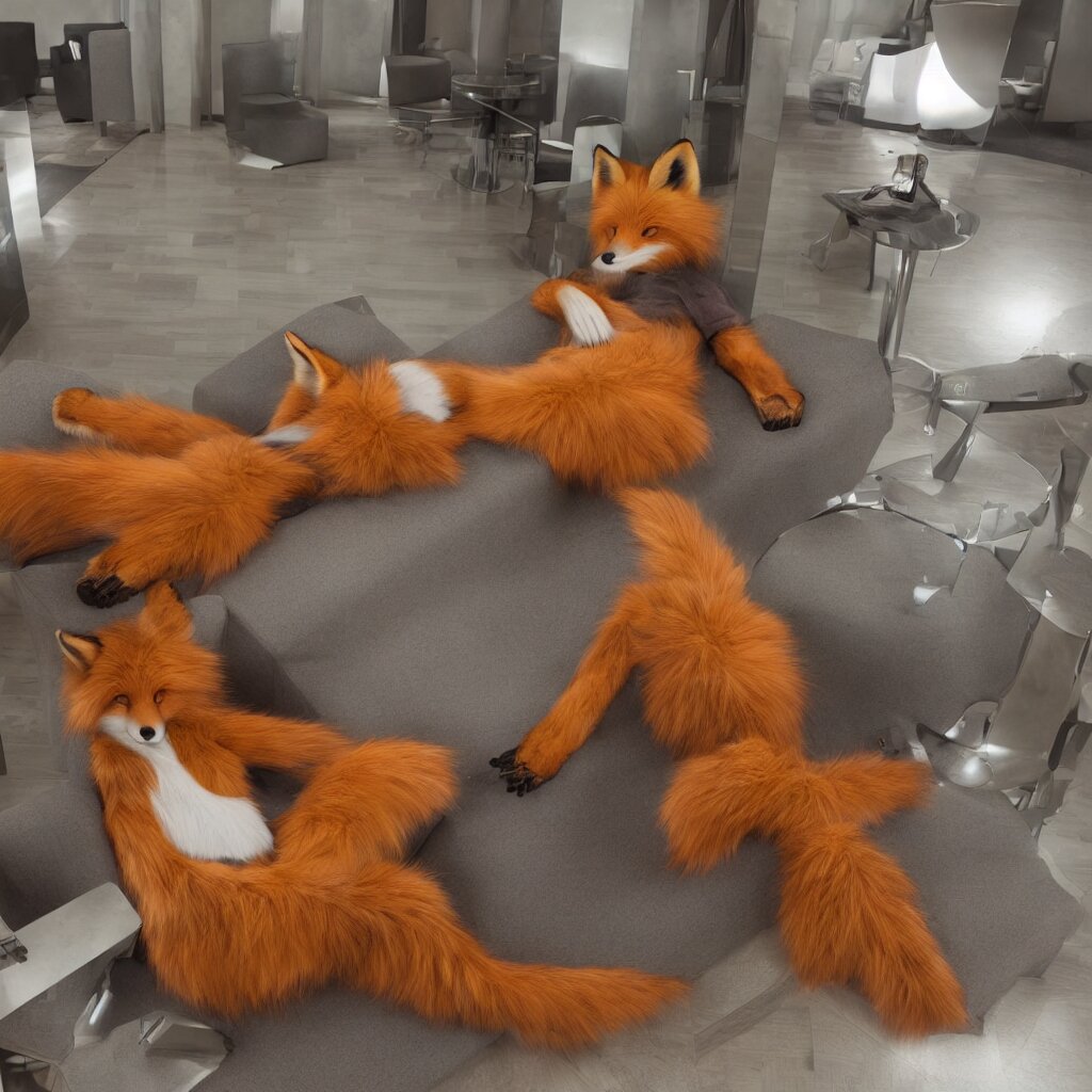 Anthropomorphic furry anthro fox lounging in a futuristic hotel