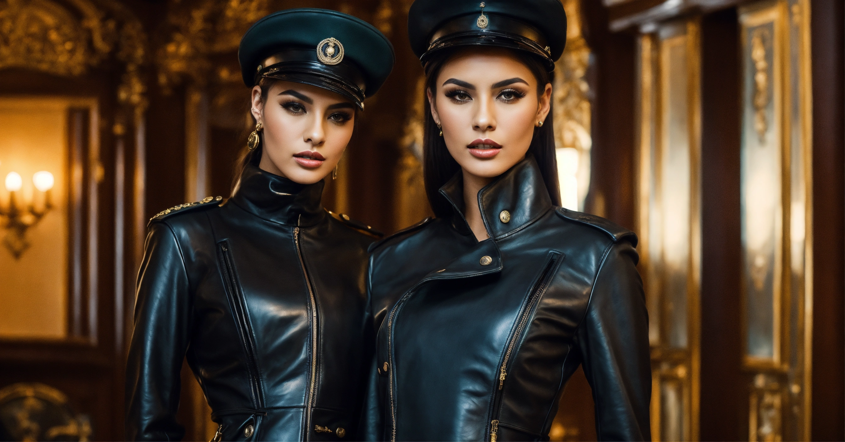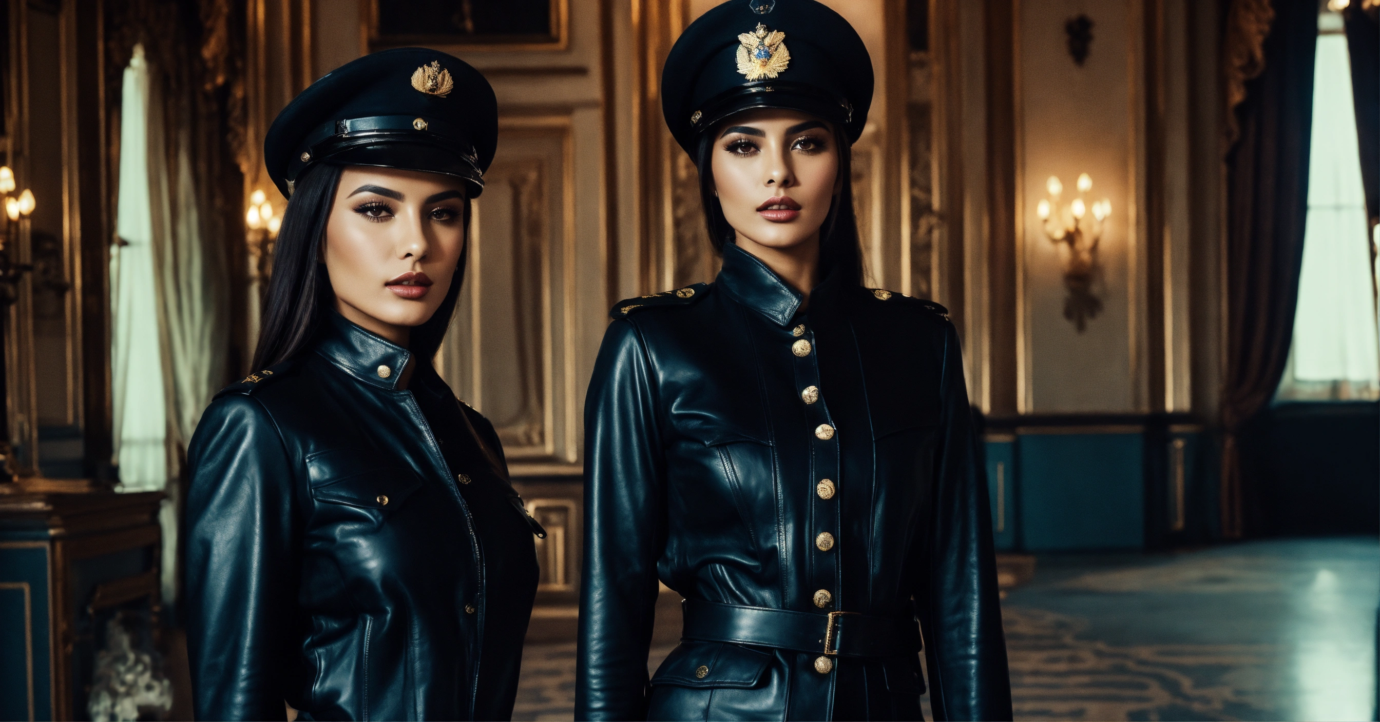 Two stunning arab mistress women fashion models, brunette straight high ponytail, long leather strict russian military jacket with buttons and epaulettes, black leather overknee boots, leather black big military cap, mansion room