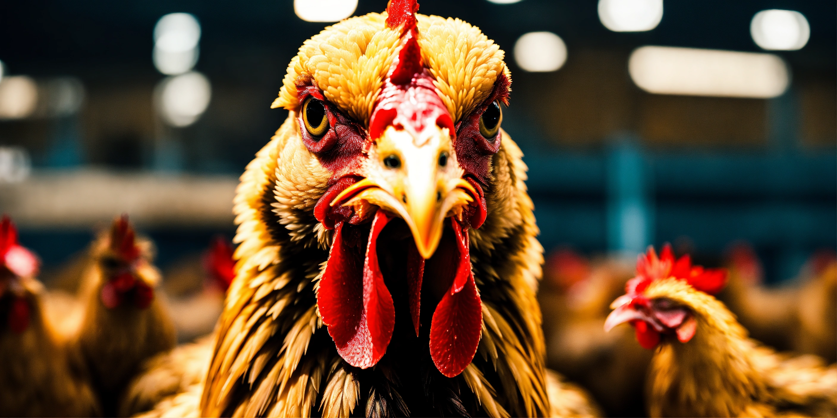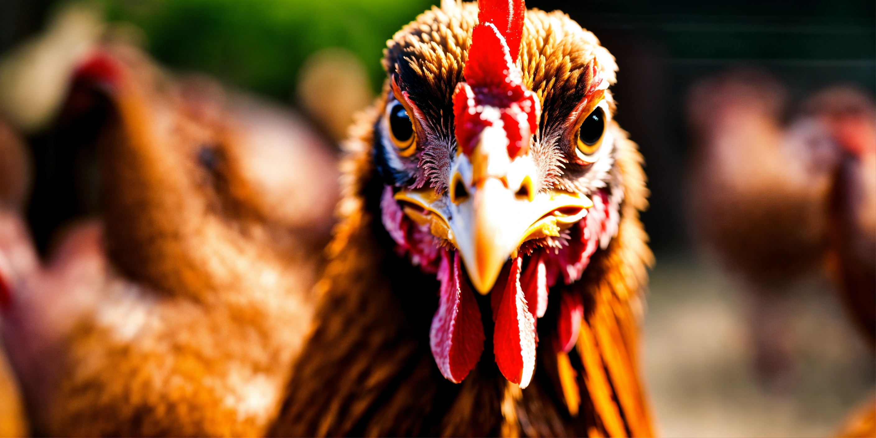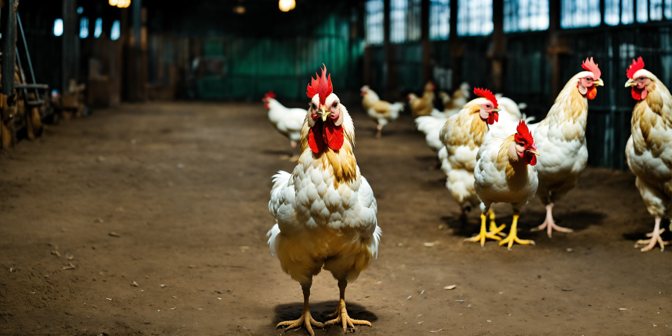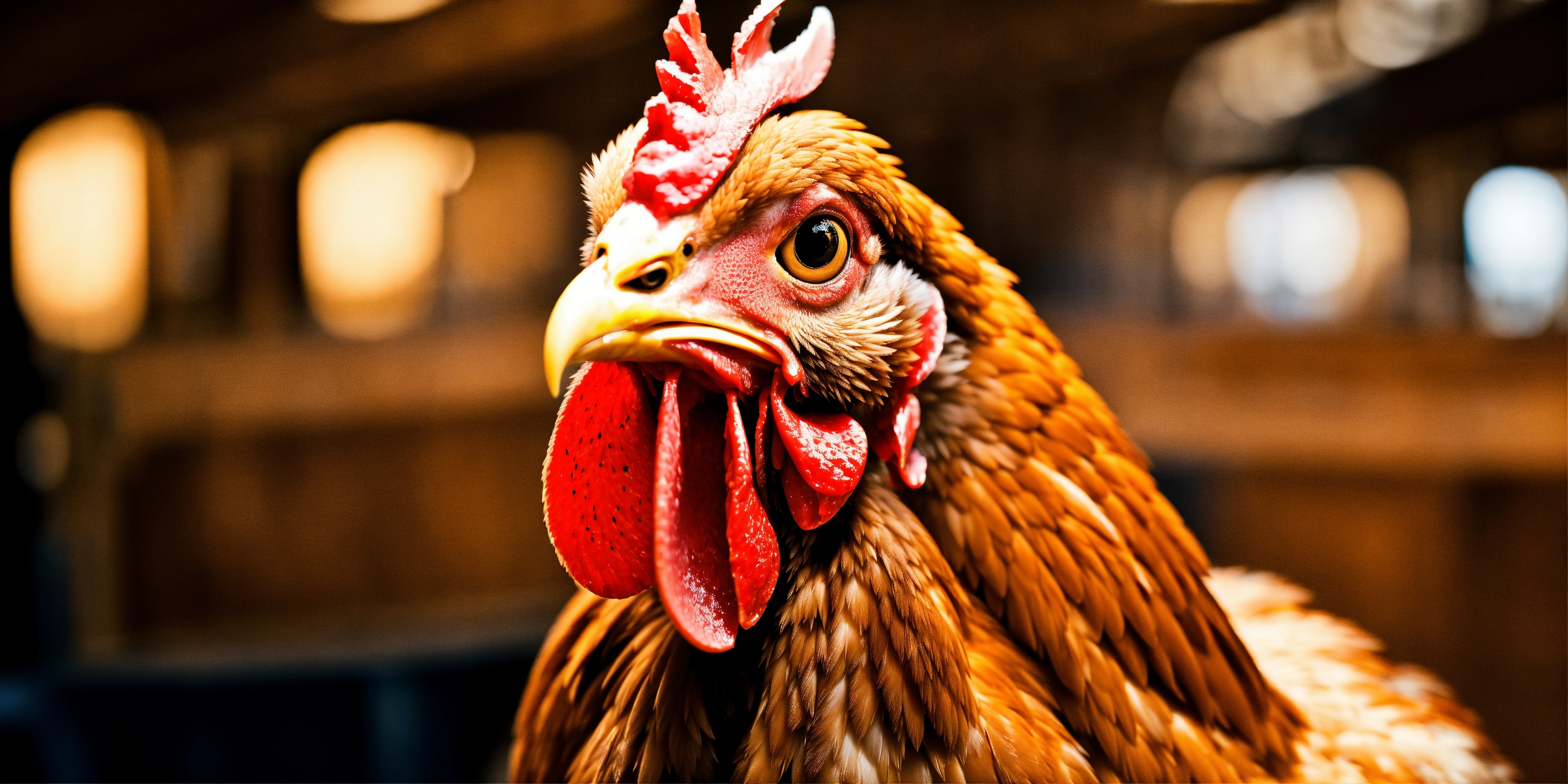 Photo of a chicken head looking into the camera standing in the middle of a large stable, high amount of blurred background