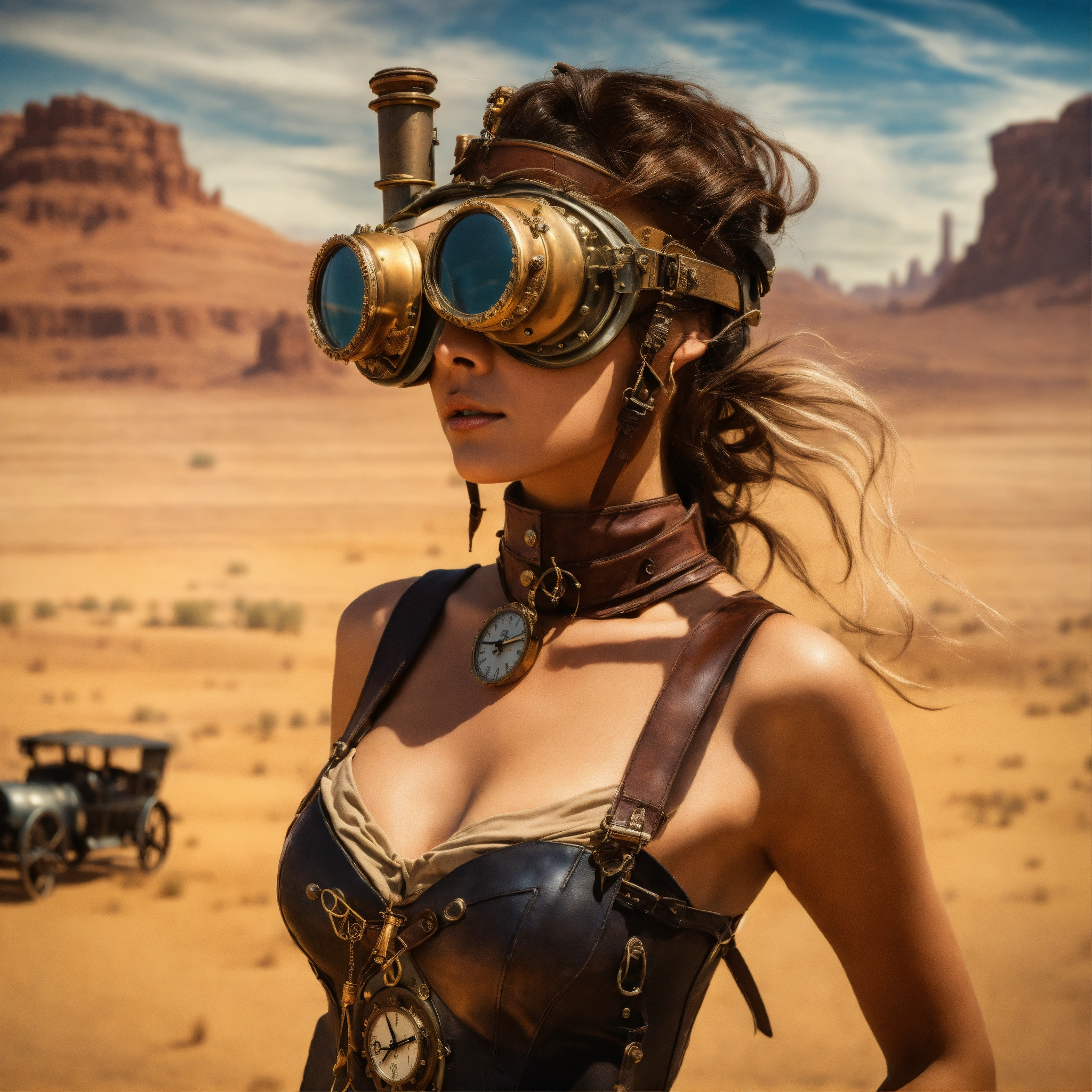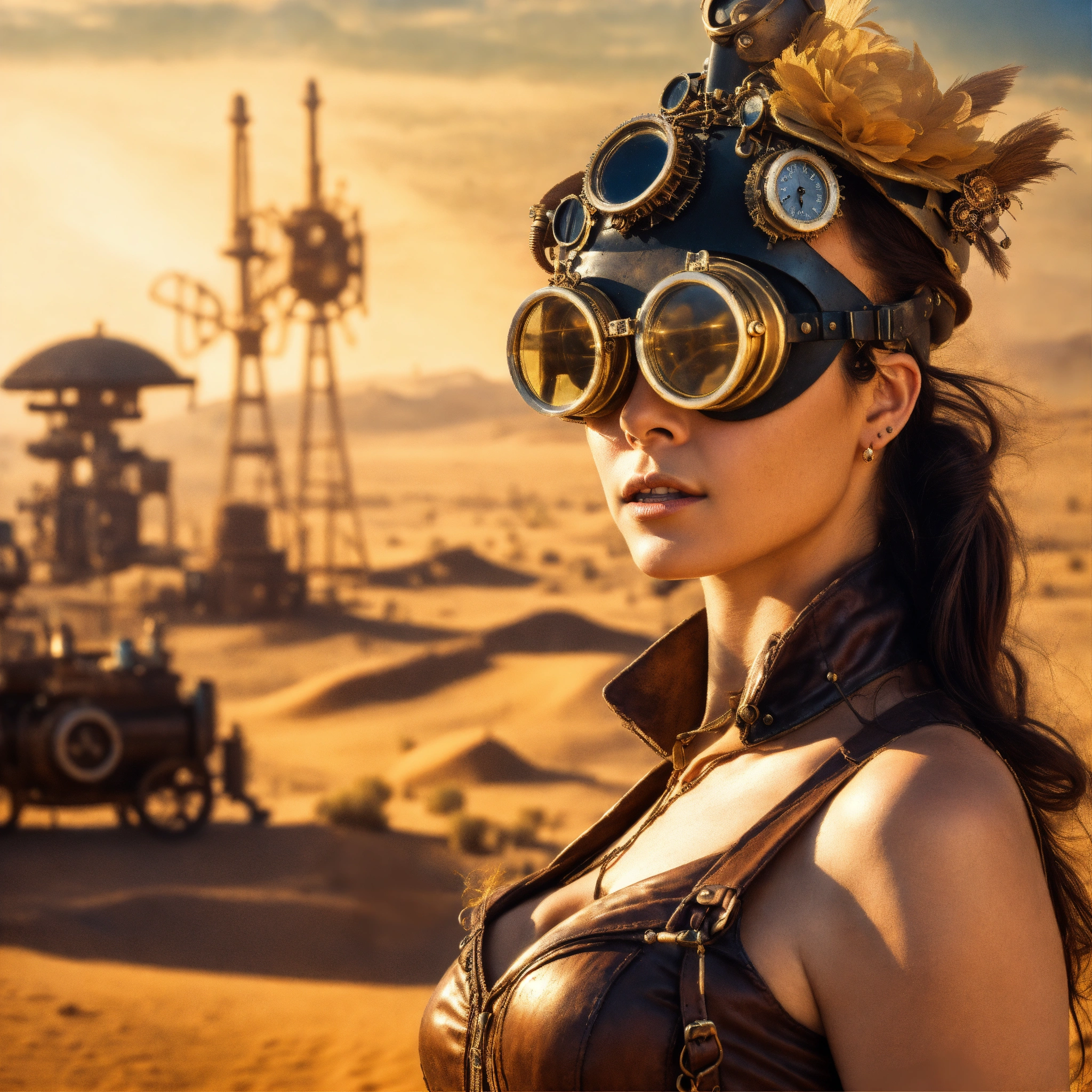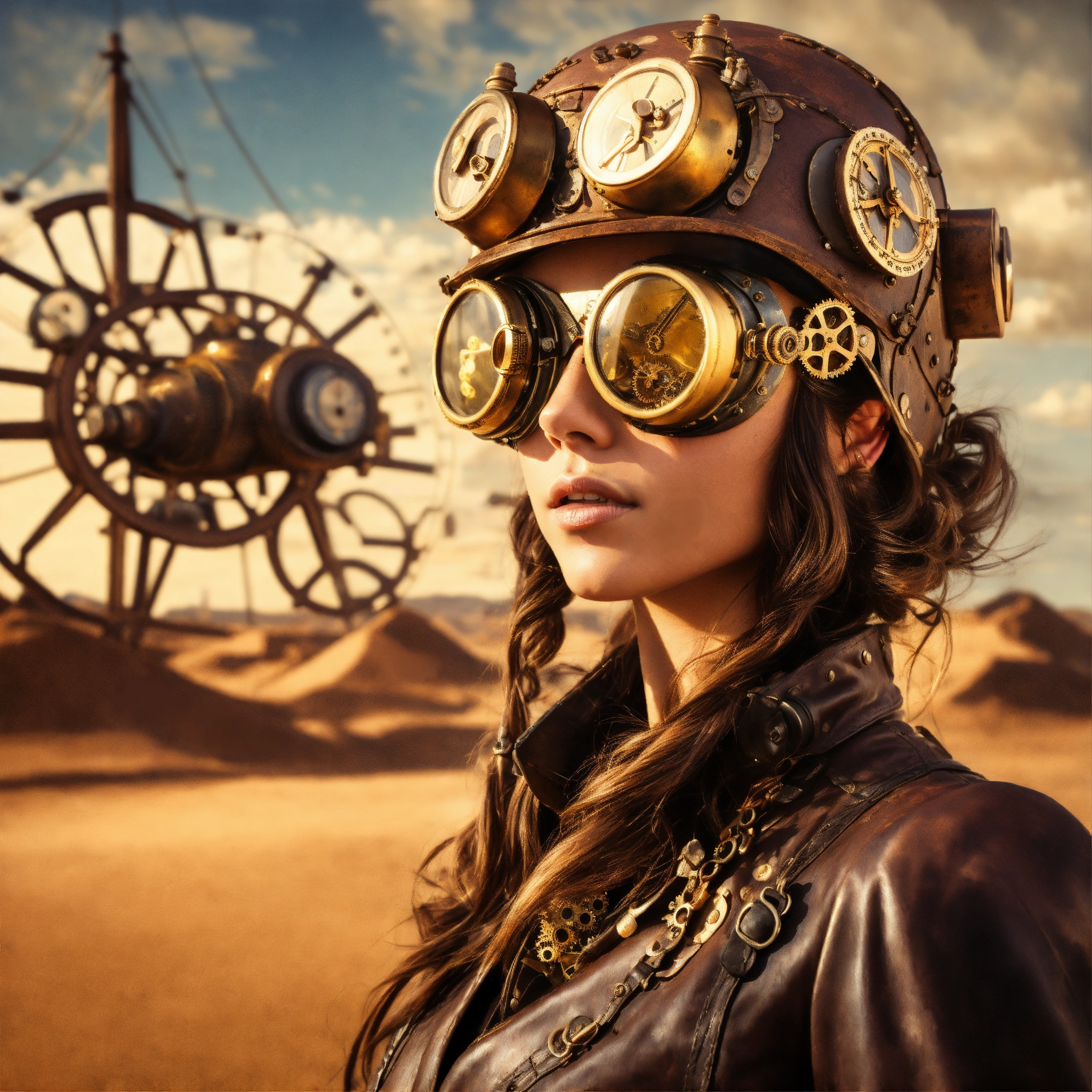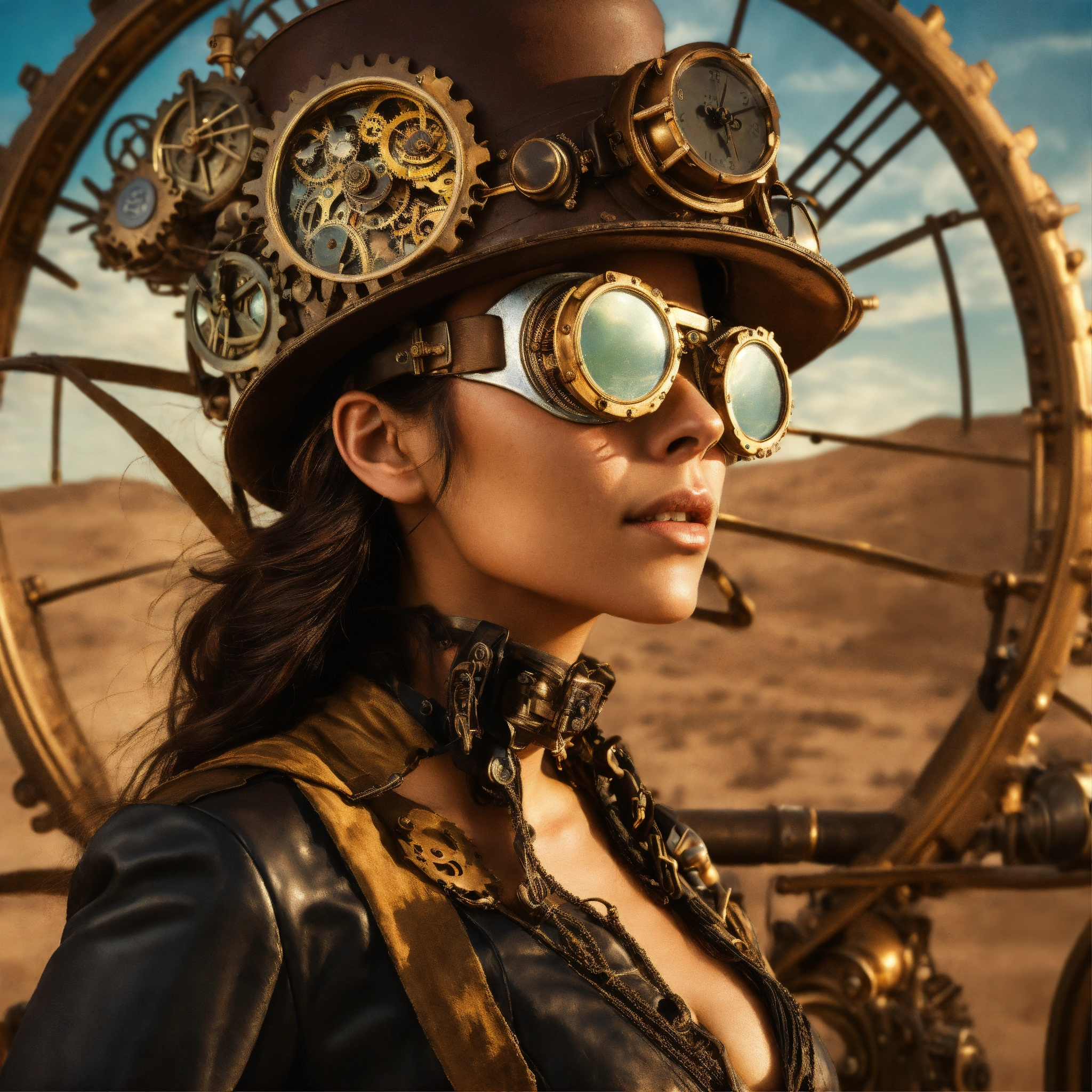 A close up steampunk brazilian model in steampunk goggles and a steampunk helmet on the background of a steampunk time machine in desert, william clien oil painting style