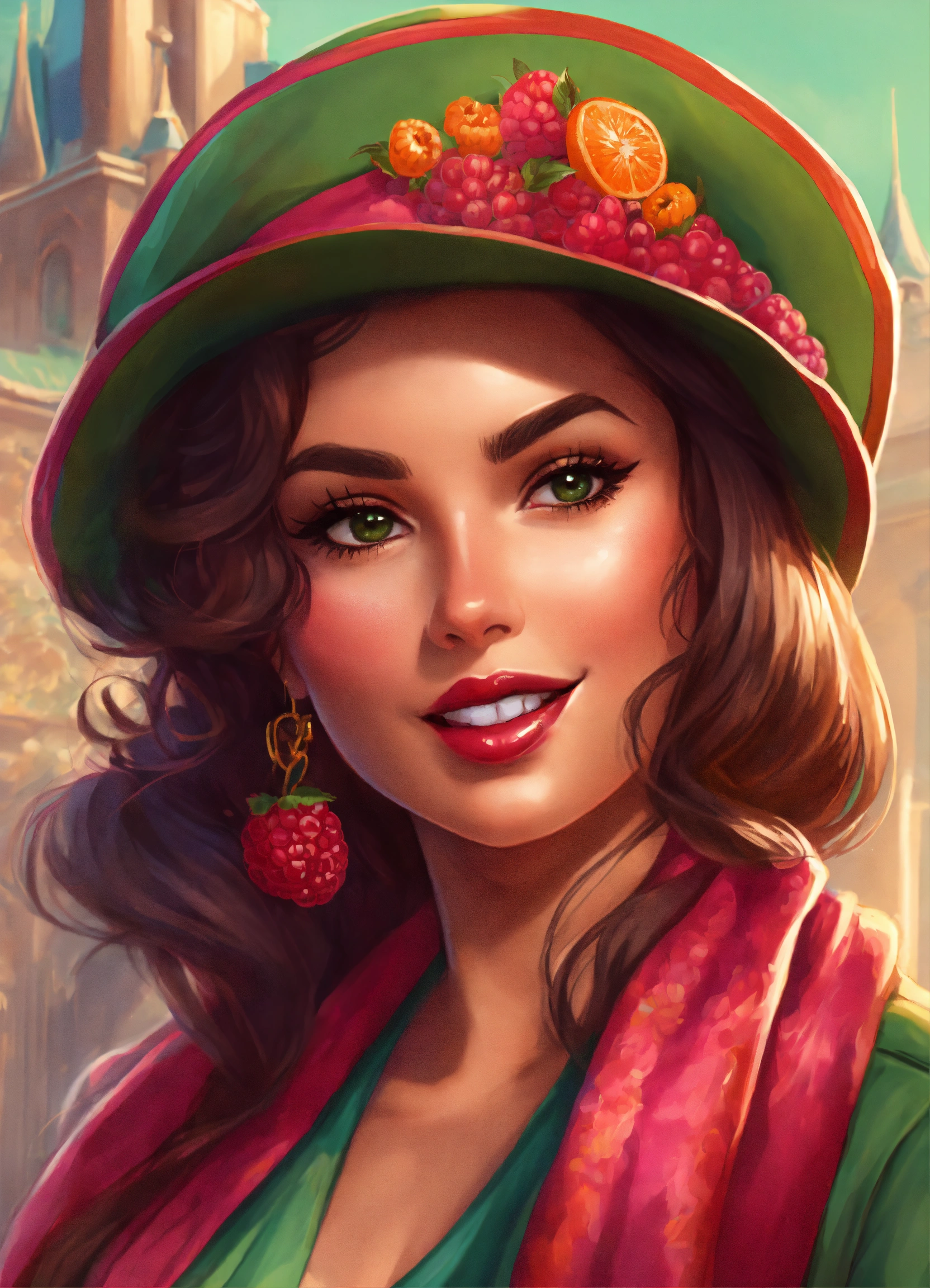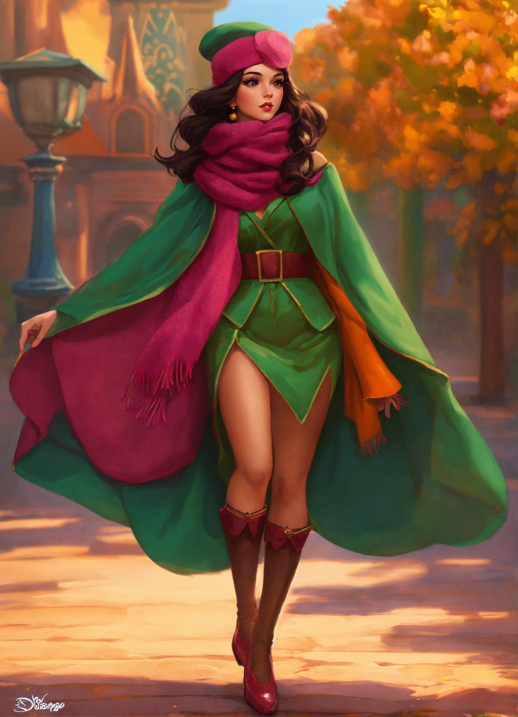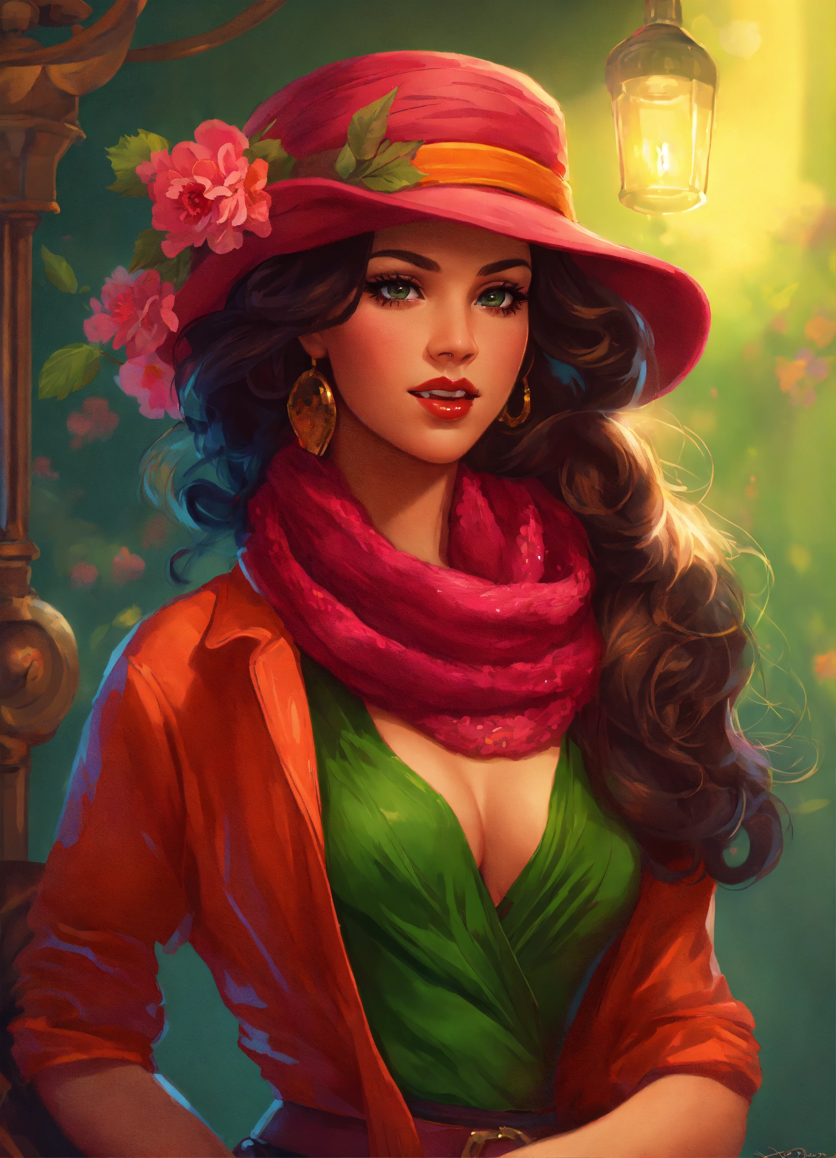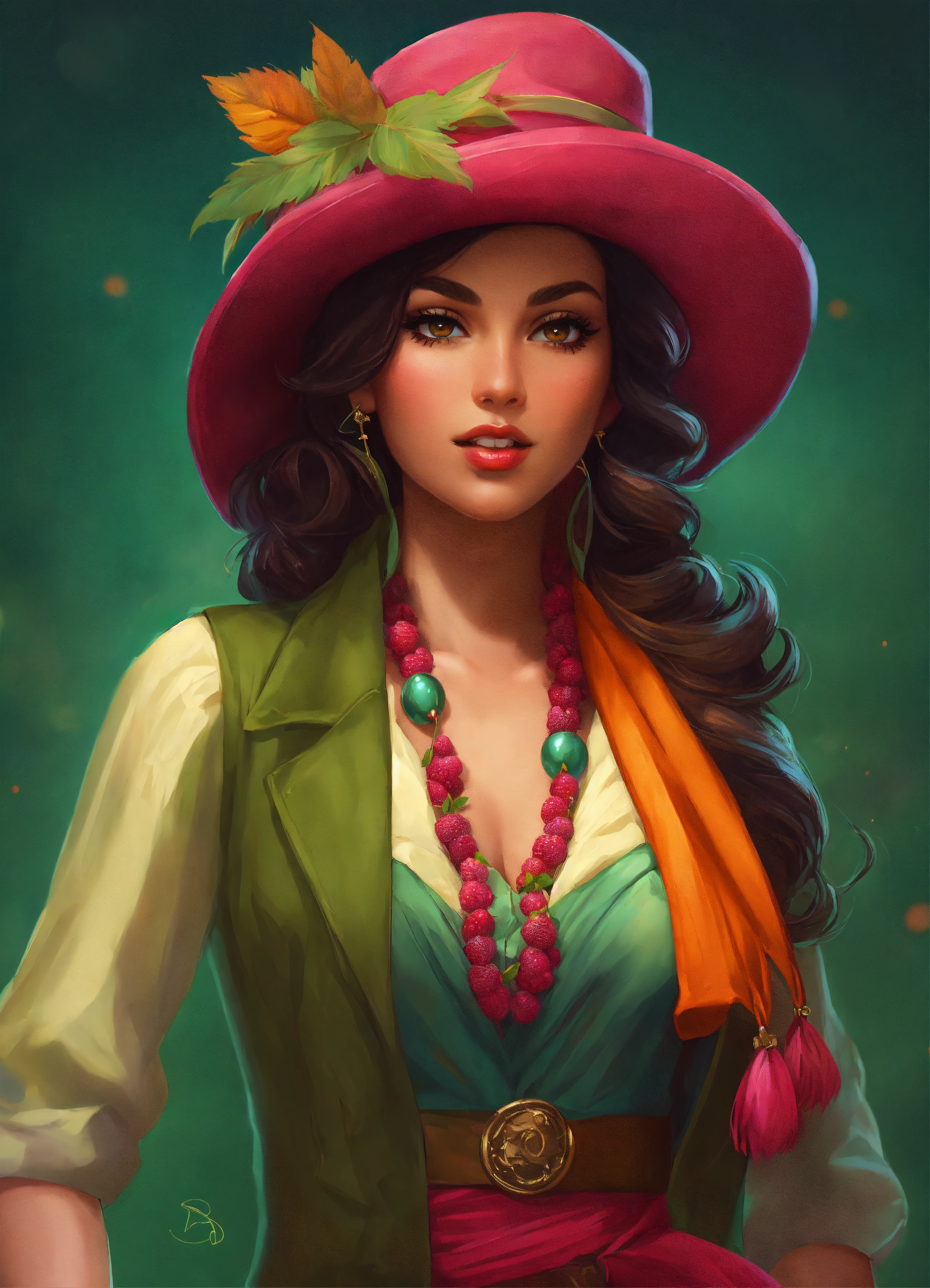 Full body, brune pinup woman, green and raspberry colors, raspberry and orange scarf and hat, disney, fantasy, pin-up, beautiful, very detailed face, animated but very realistic