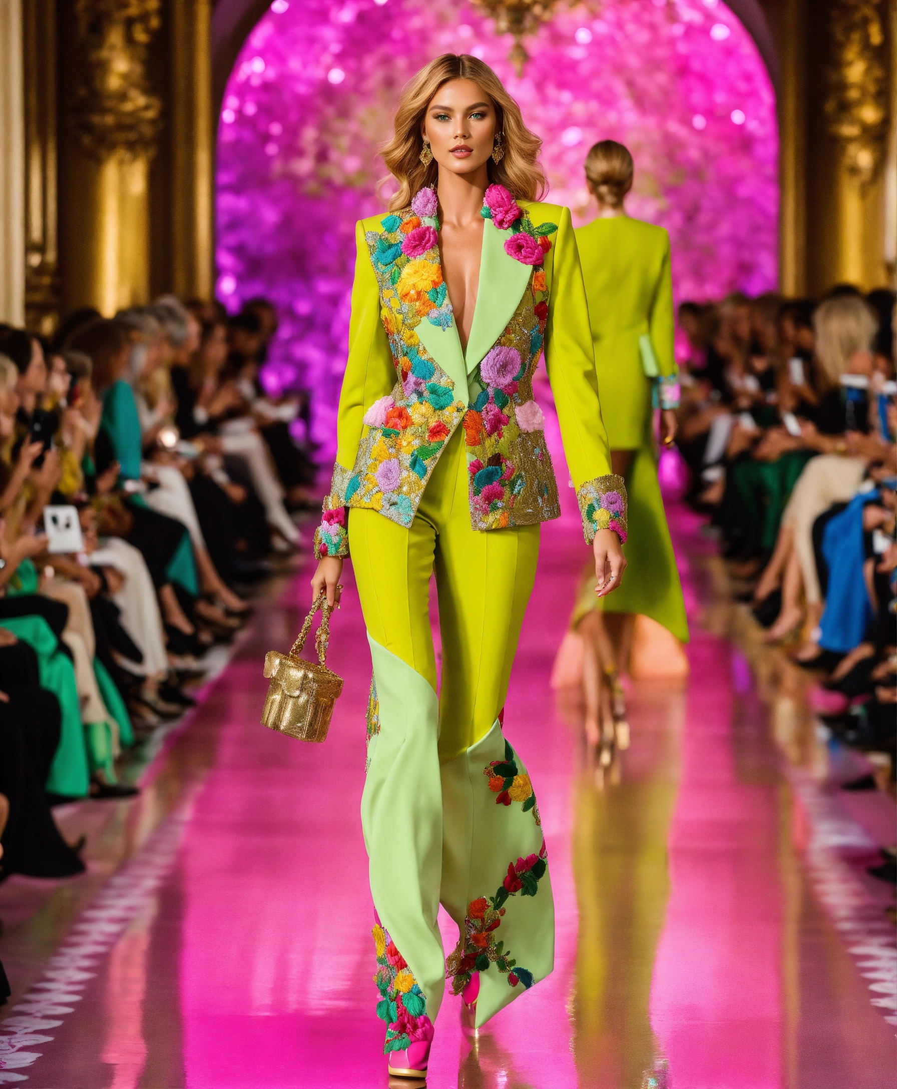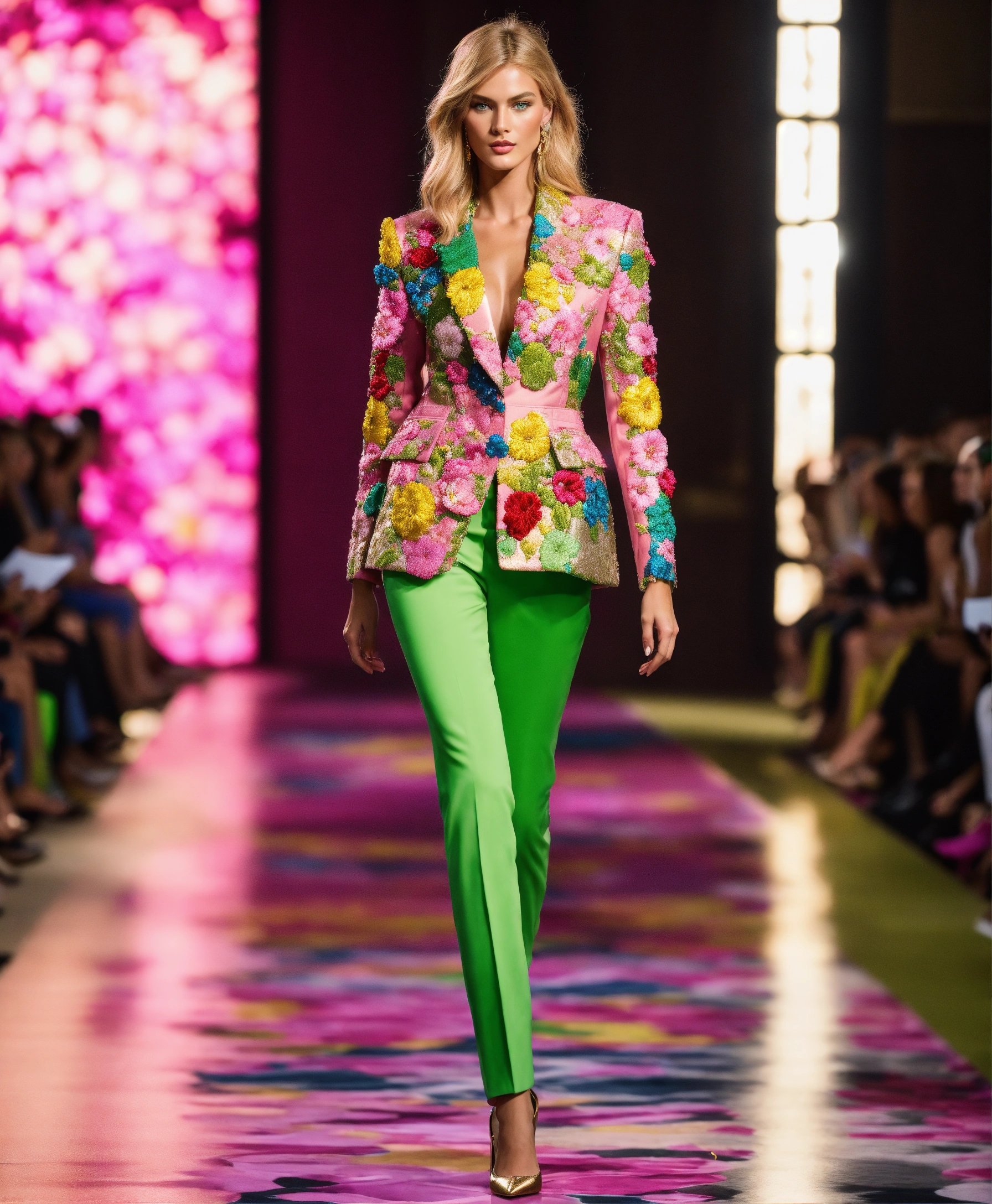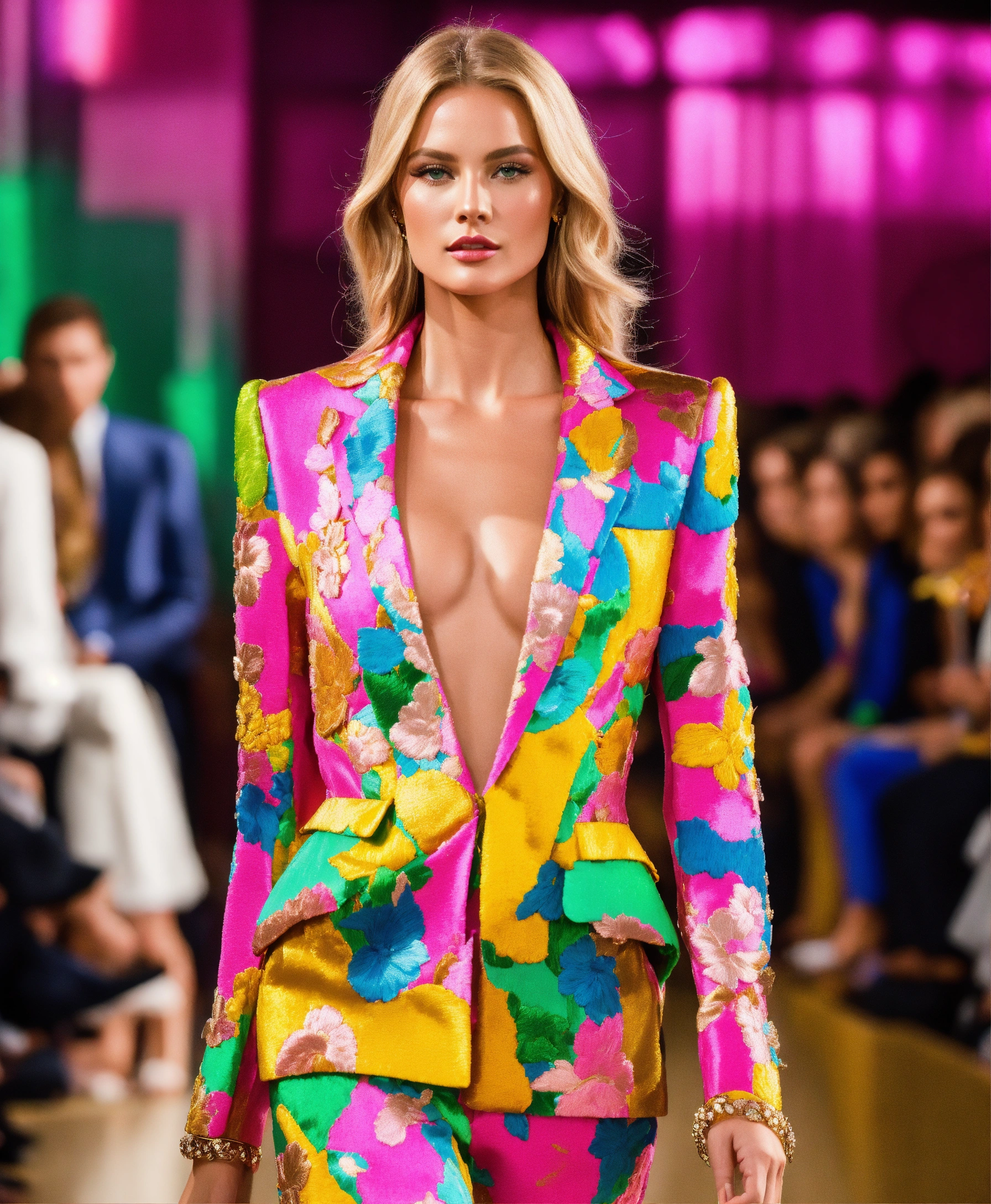 Ultra realistic full body photo of a stylish beautiful elegant german blonde supermodel walking the runway modeling summer cruise designer wear brave, paris versailles details cutouts and gold geometric pattern floral structured tailored jacket pink gold green lilac peridot silver magenta lime fuchsia yellow blue black gray copper mauve bronze haute couture embroidered contrasting colors vivid intricate bold vibrant glamorous ultimate elegance beautiful luxurious awesome wealthy opulent exquisite resplendent magnificent sublime 12k
