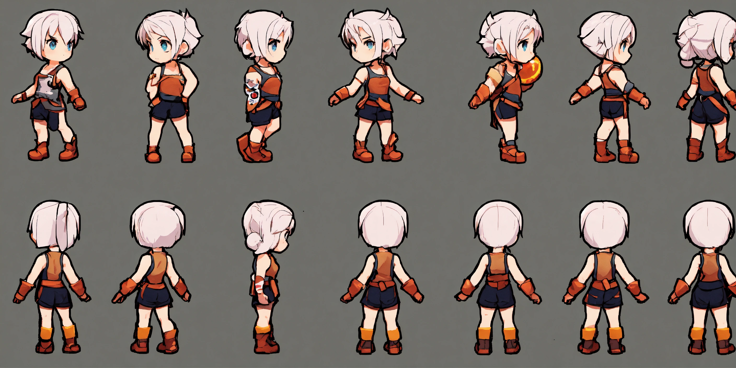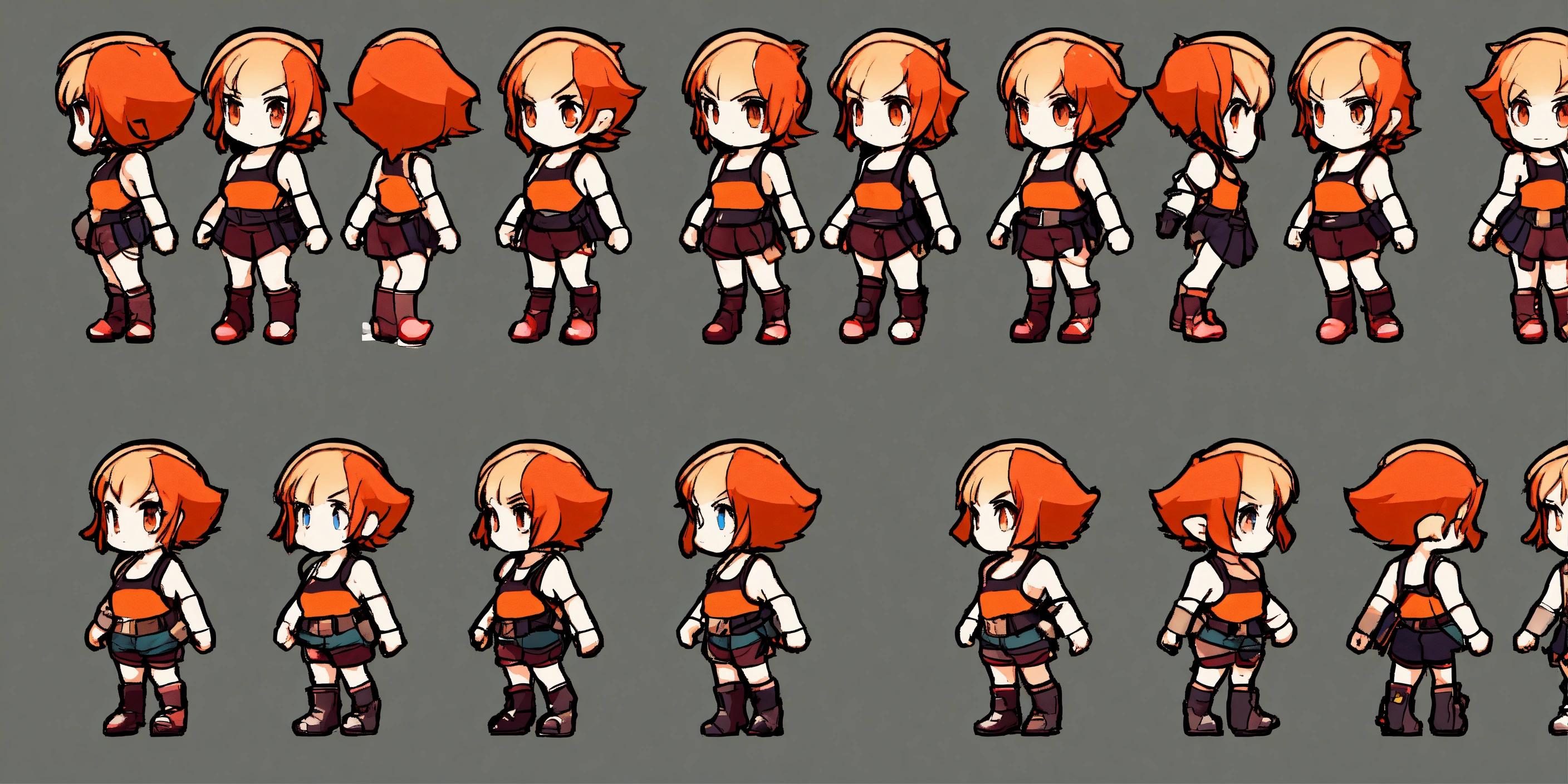 Game assets, multiple poses, sprite sheet, girl, short hair, tank top, shorts, full body view, (side view), walking, chibi proportions, blank background, artstyle from the game dungeon fighter