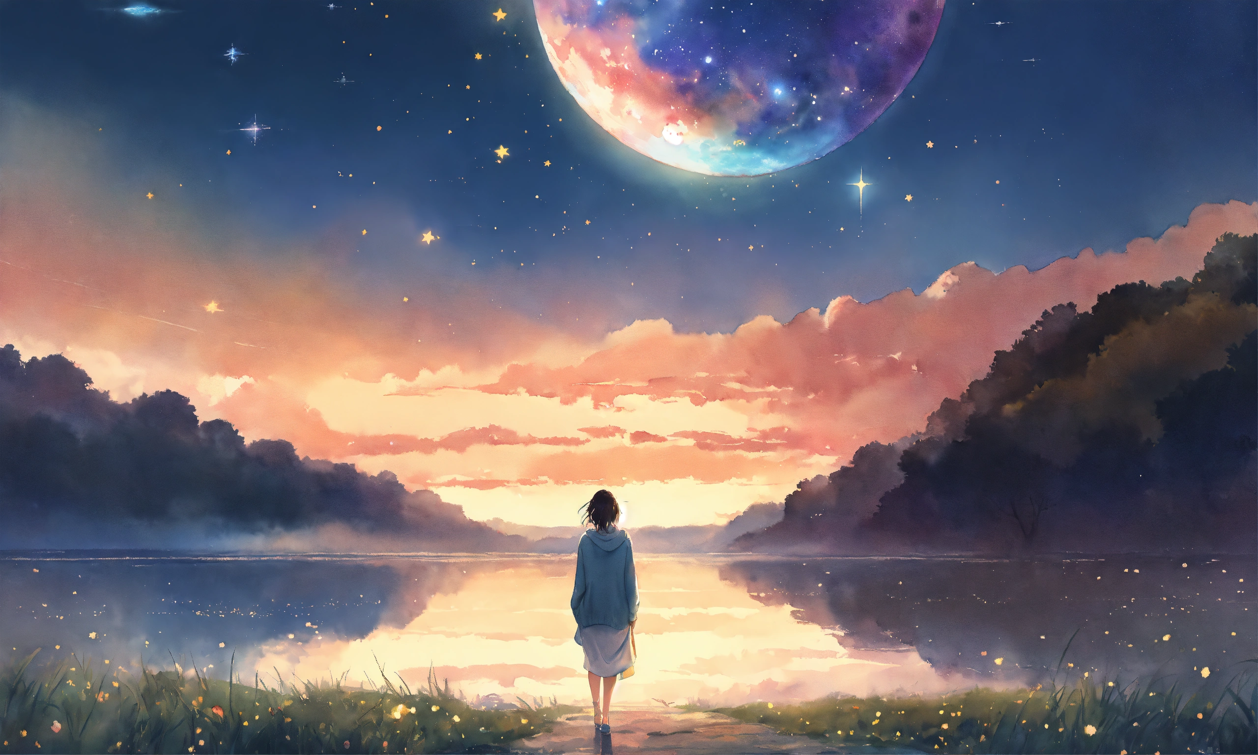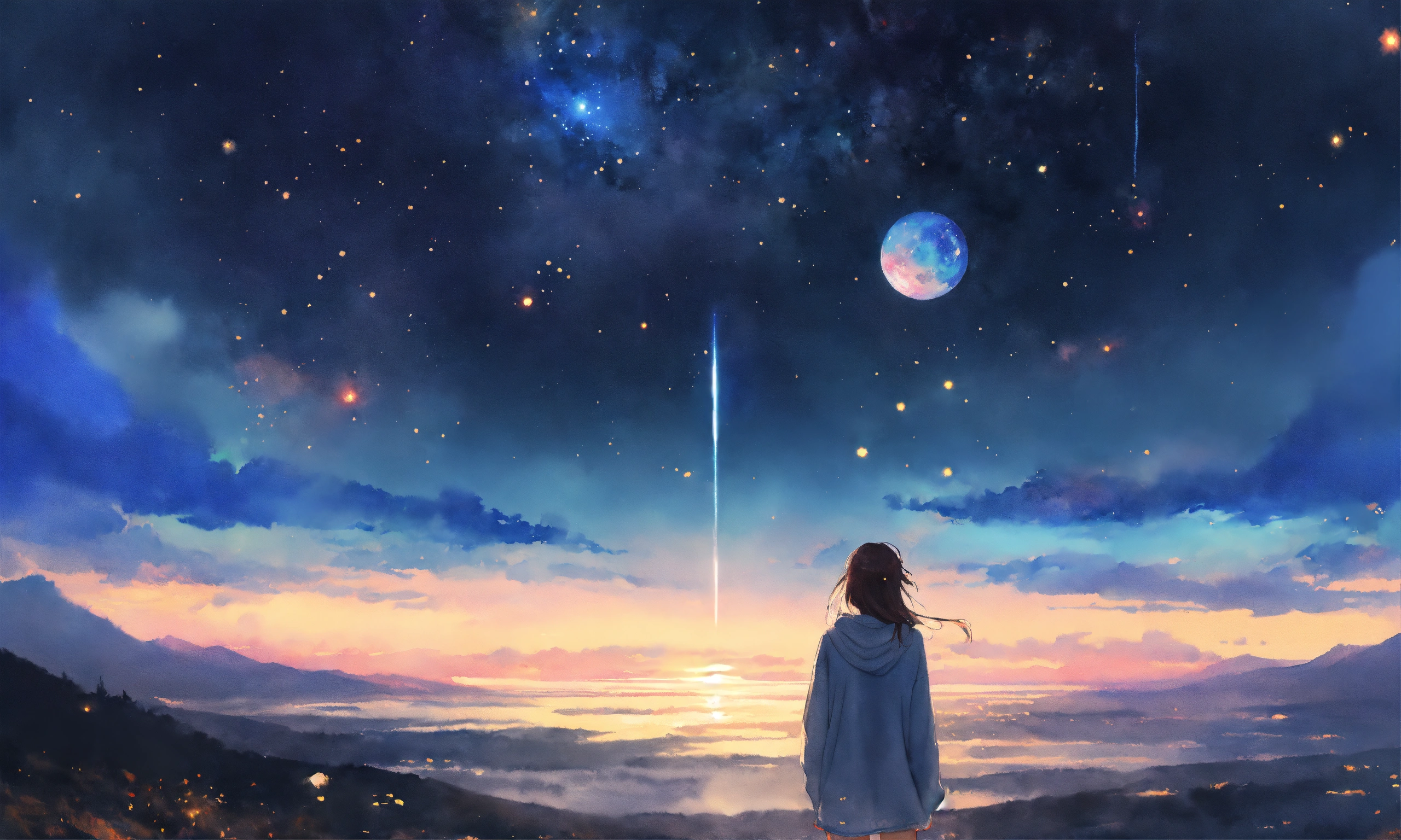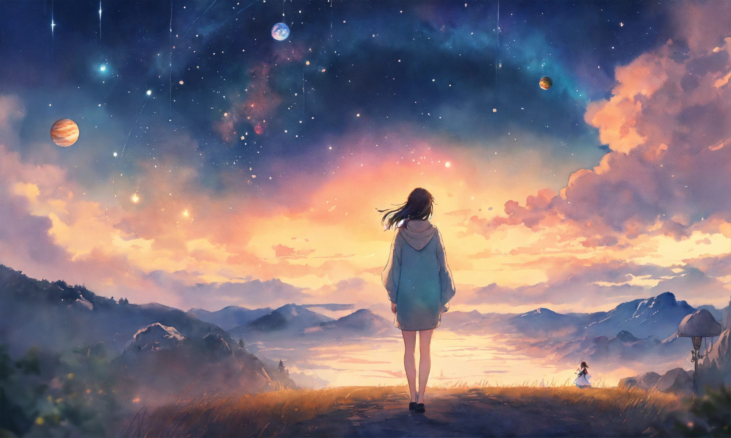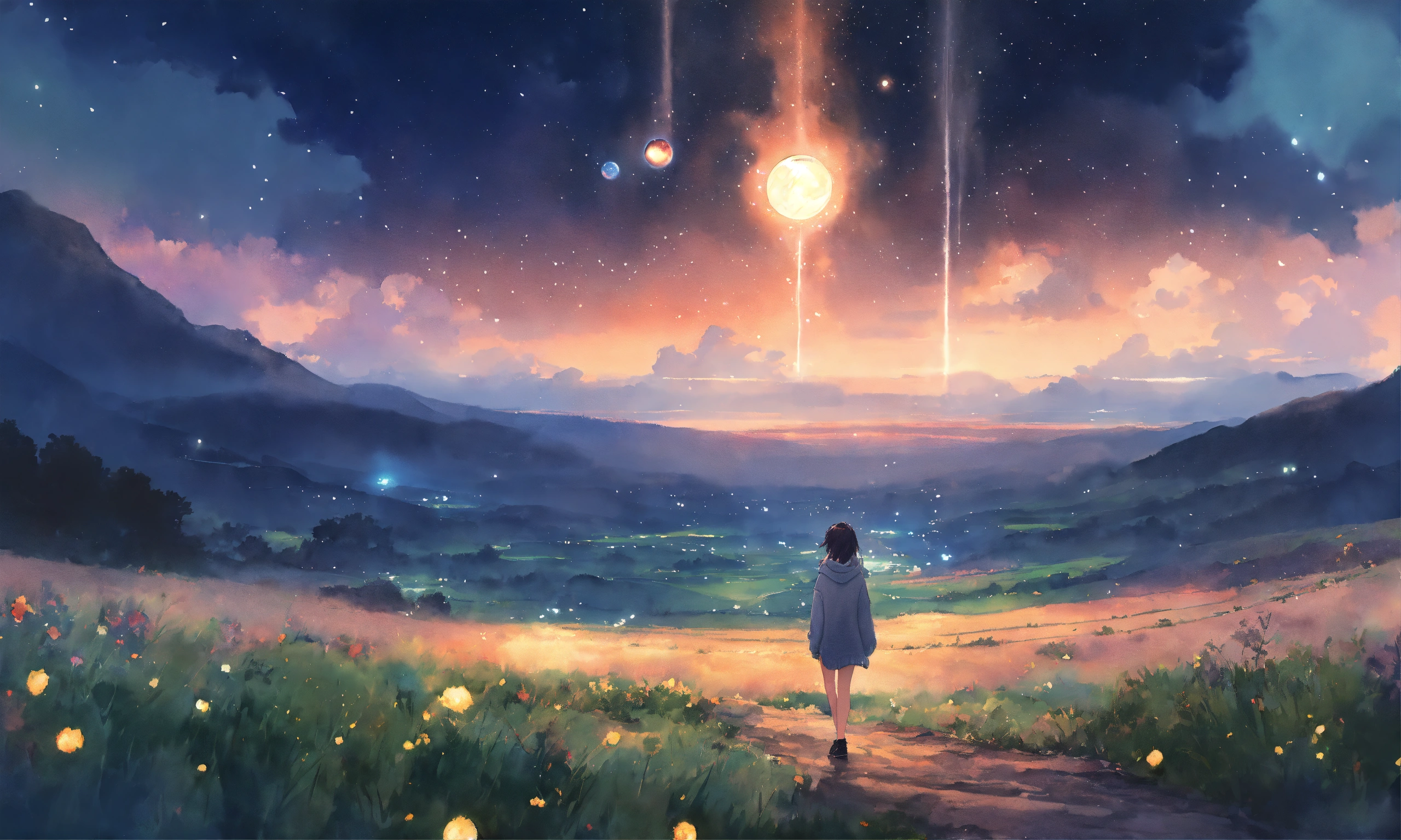 Full body watercolor illustration of a minuscule 25 years old women standing in the middle of an immense magical night setting, stars, planets, facing backwards, centered, small figure in large landscape, wearing a long boho sweater, comfortable, stylish, chic, no makeup, effortless, relaxed, casual, laid-back, beautiful light sky, low saturation, muted colors, animation, fantasy art, by makoto shinkai