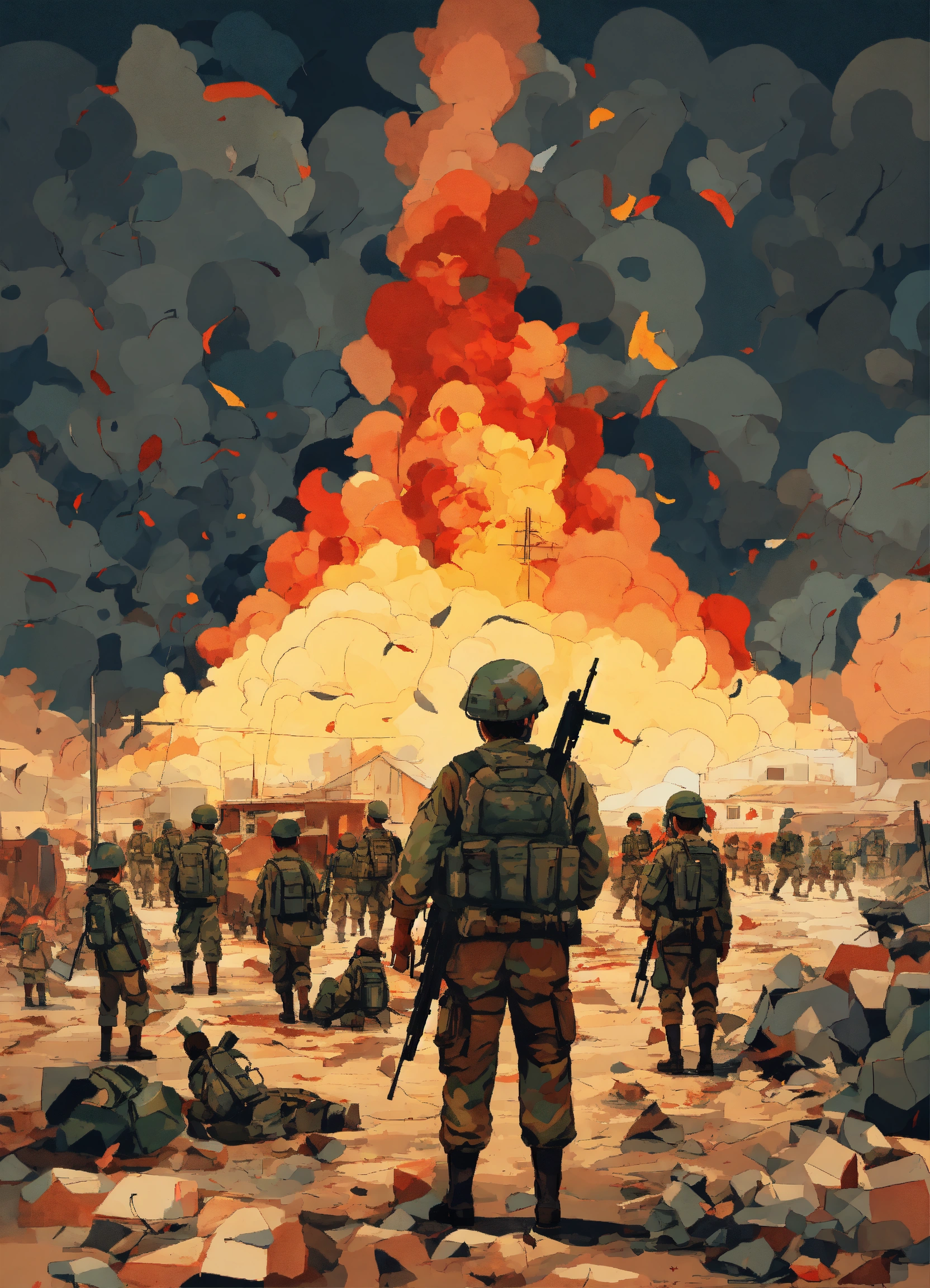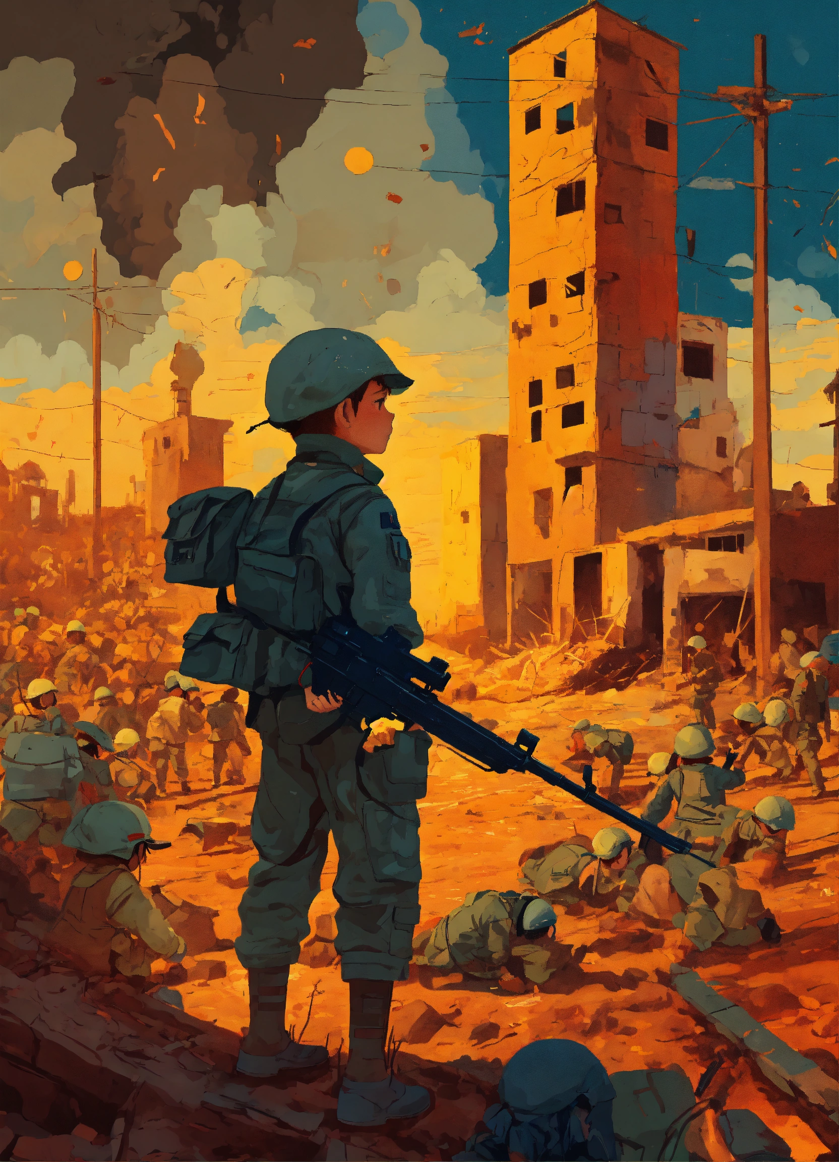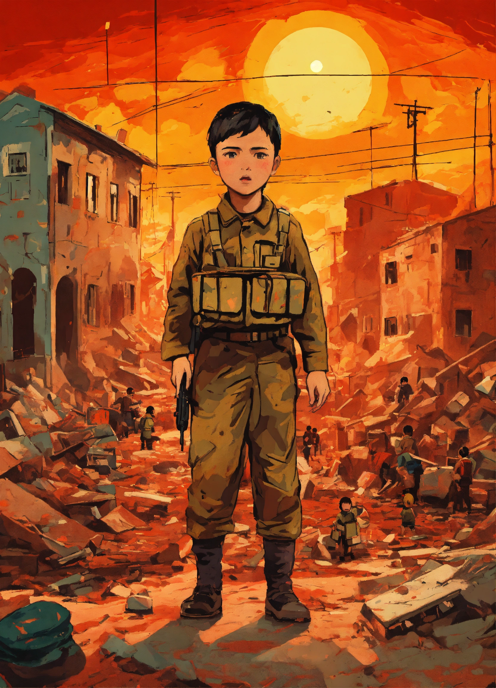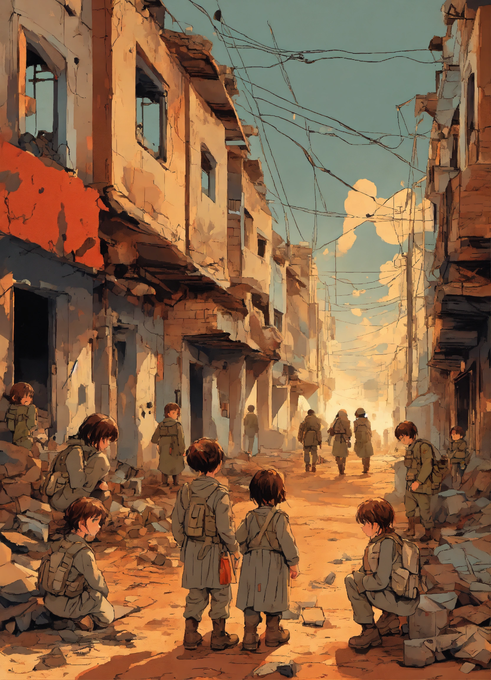 Masterpiece striking fine naive art vector illustration many children hurt vulnerable in war dystopian destruction