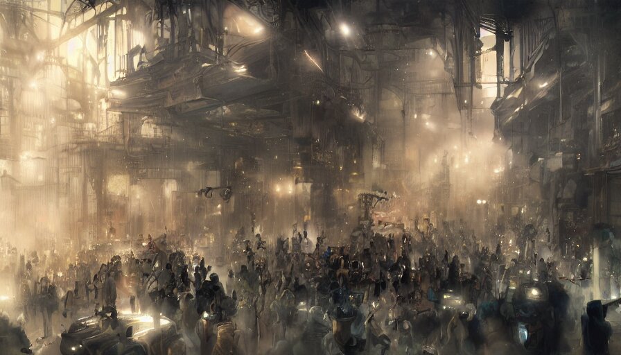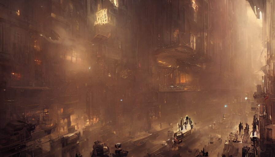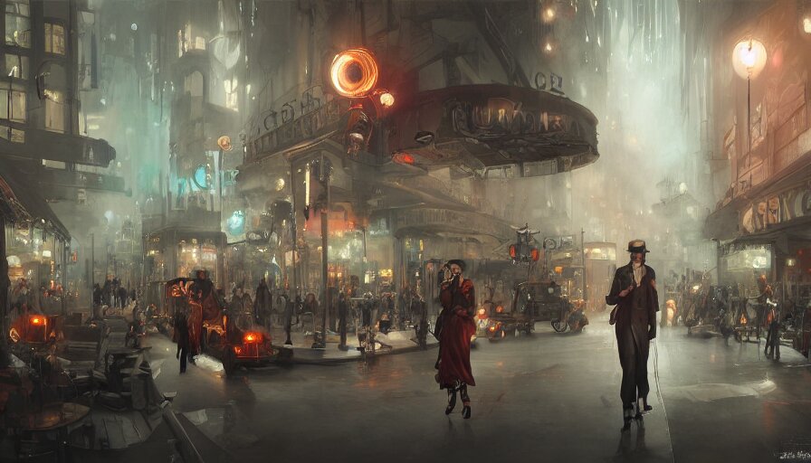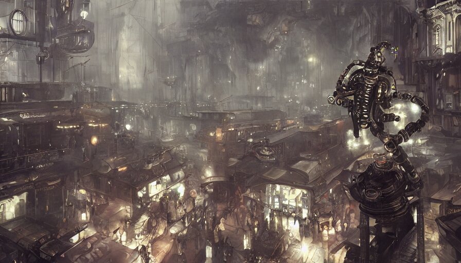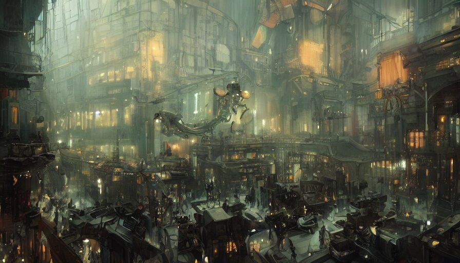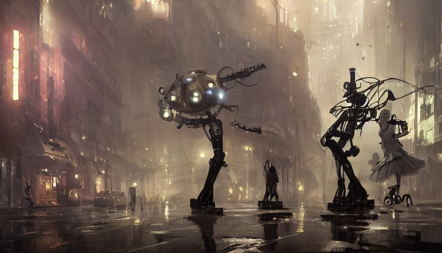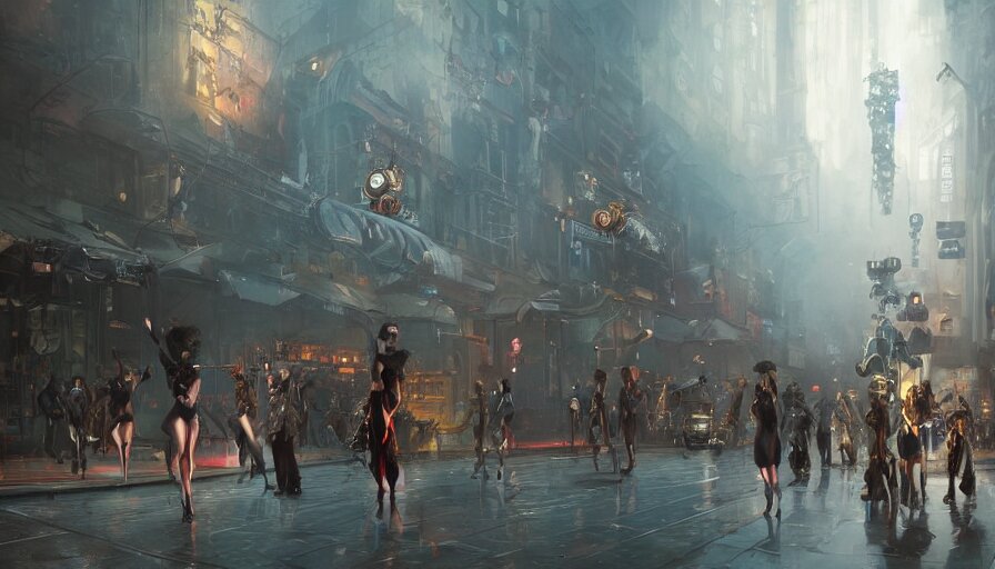 Cabaret in a dieselpunk city, steam, sexy robot dancers, epic composition, intricate, elegant, volumetric lighting, digital painting, highly detailed, artstation, sharp focus, illustration, concept art, ruan jia, steve mccurry