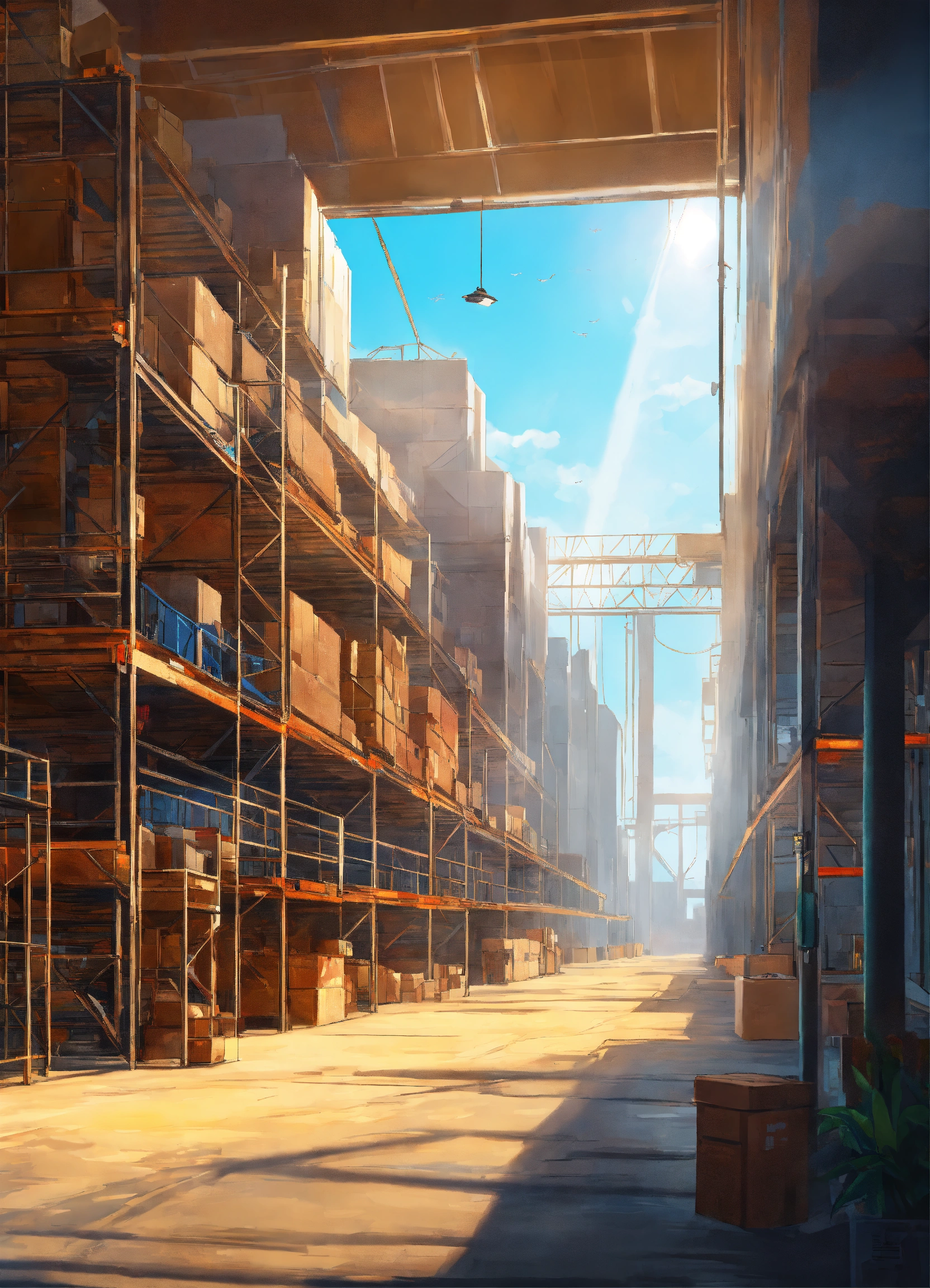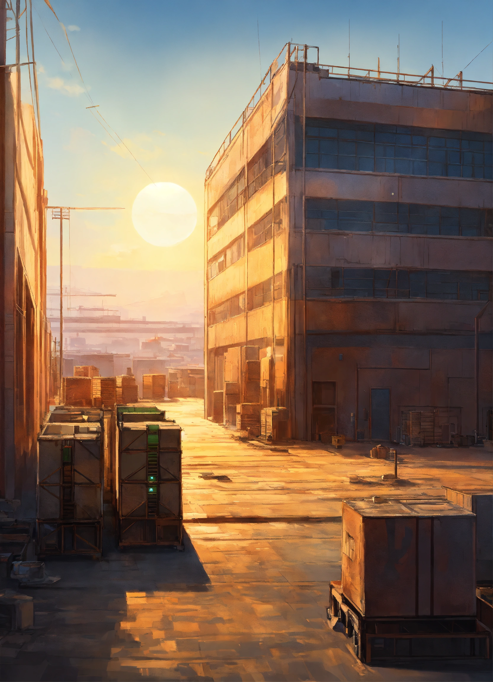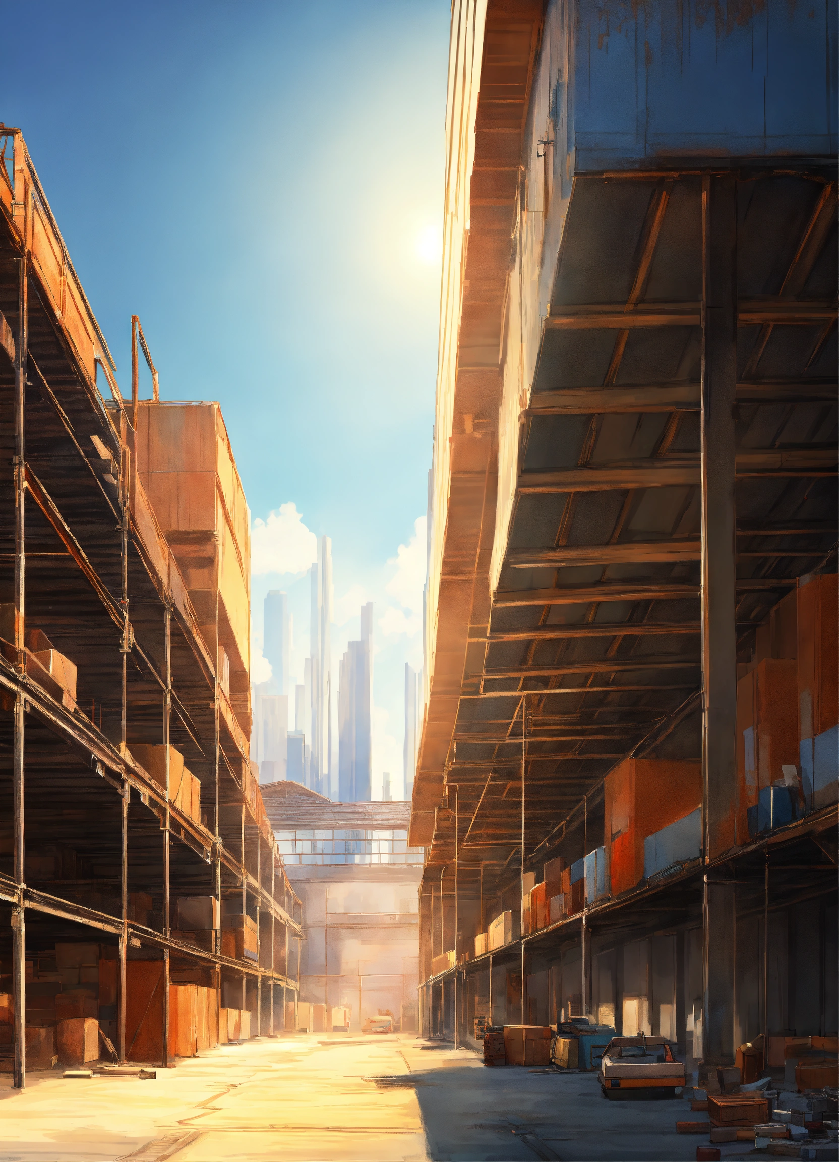 Deserted hi-tech warehouses, bright sun high above, the city in the background far far away, artsation digital painting, high detail, digital painting, high resolution 8k, realistic style