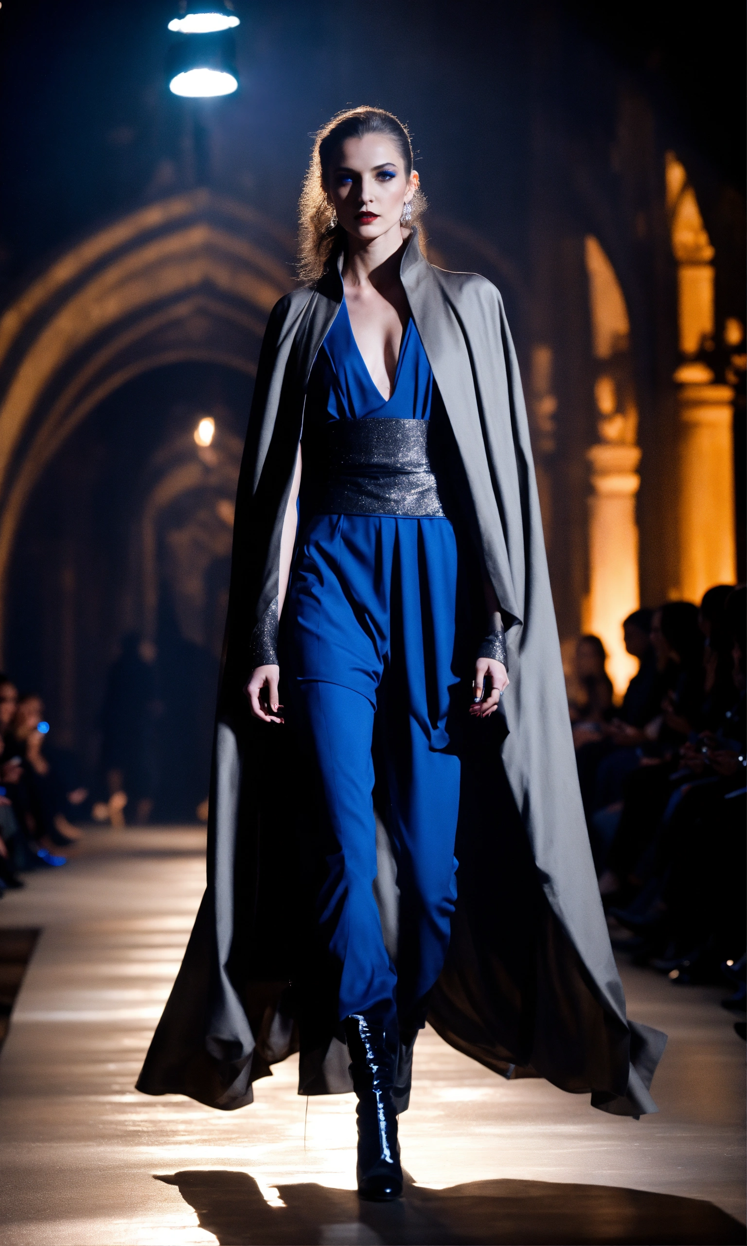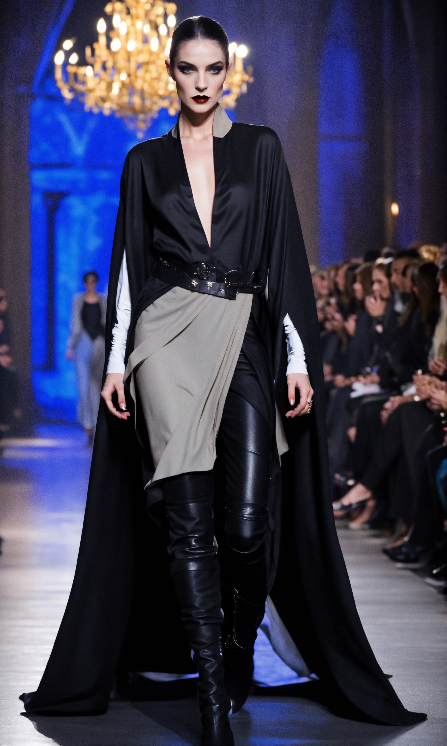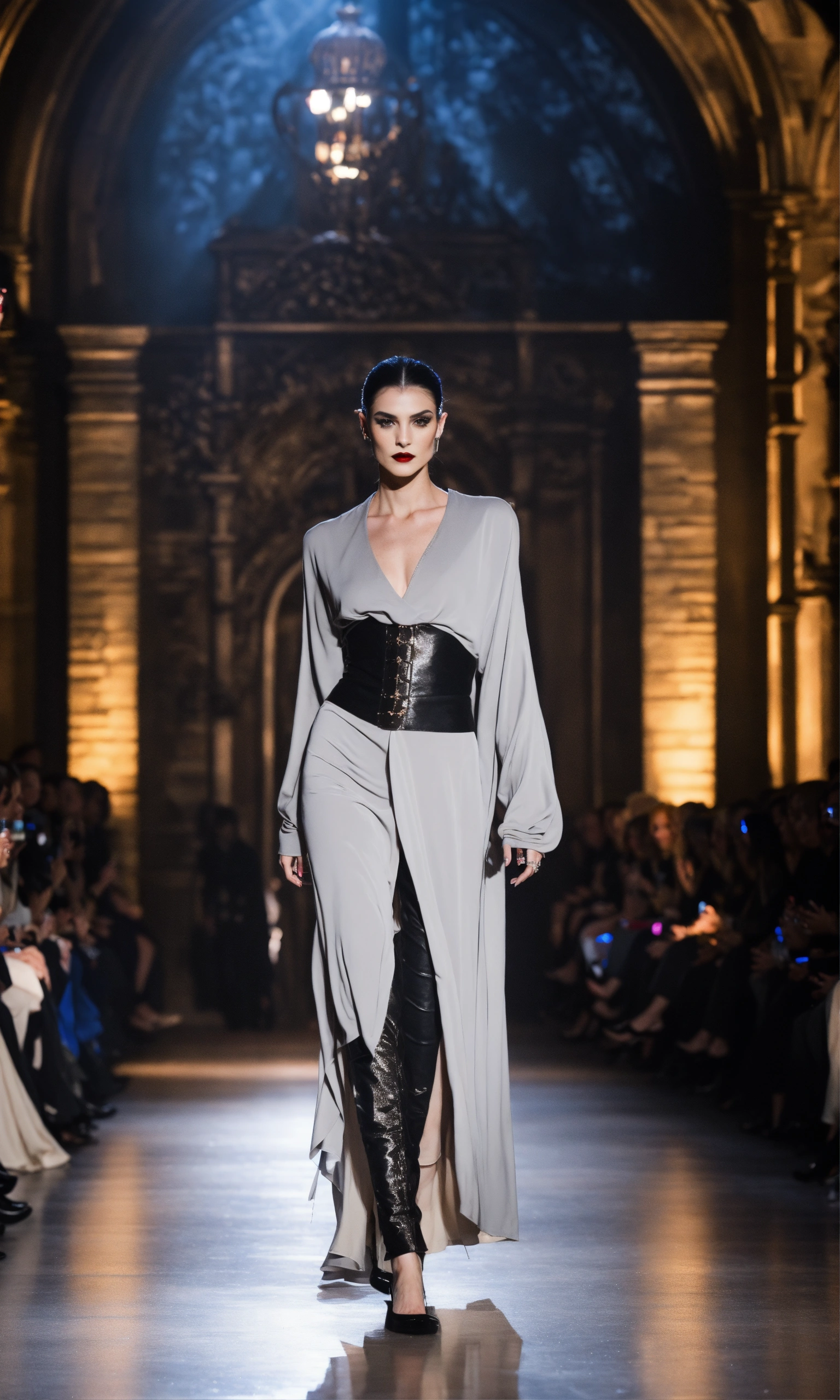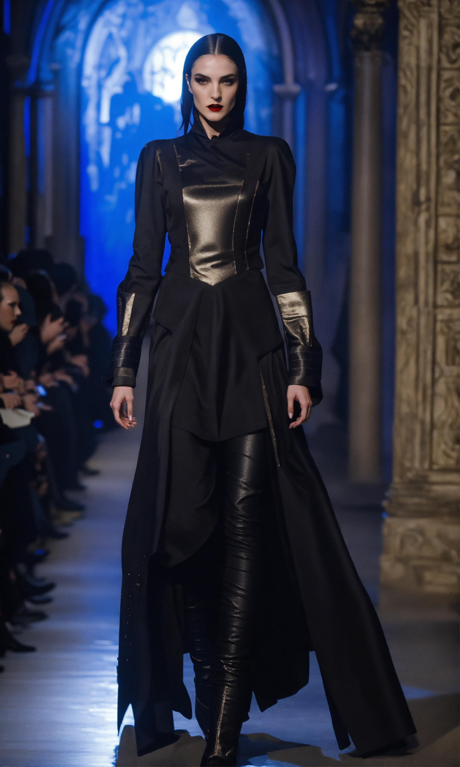 Lothlorien androgynous royal vampire walking runway during vamp fashion week wearing dolman sleeve dark donna karan vamp fashion in black, white, grey, beige, stone, metallics, shimmer walking runway in a dark goth castle with blue light
