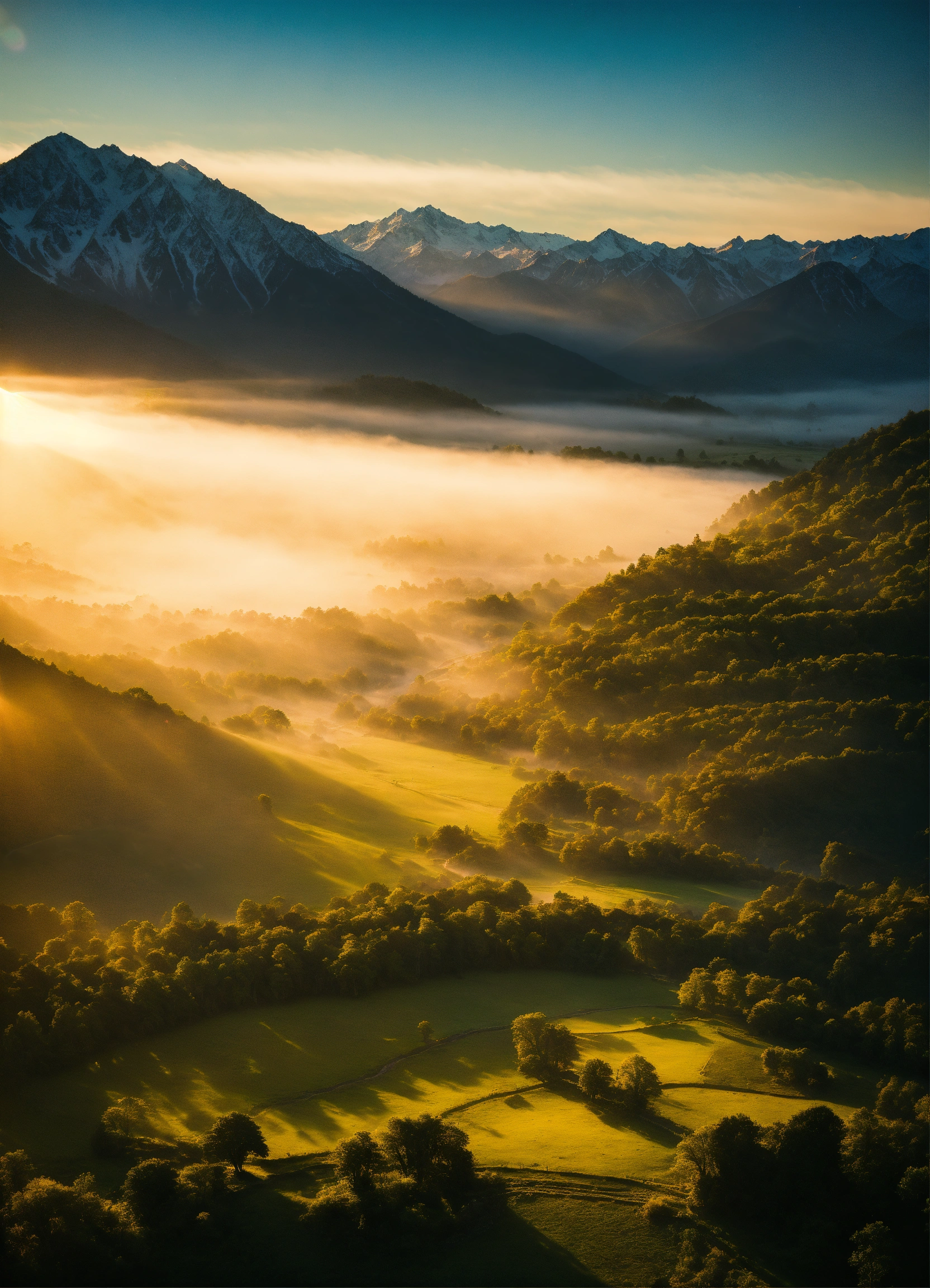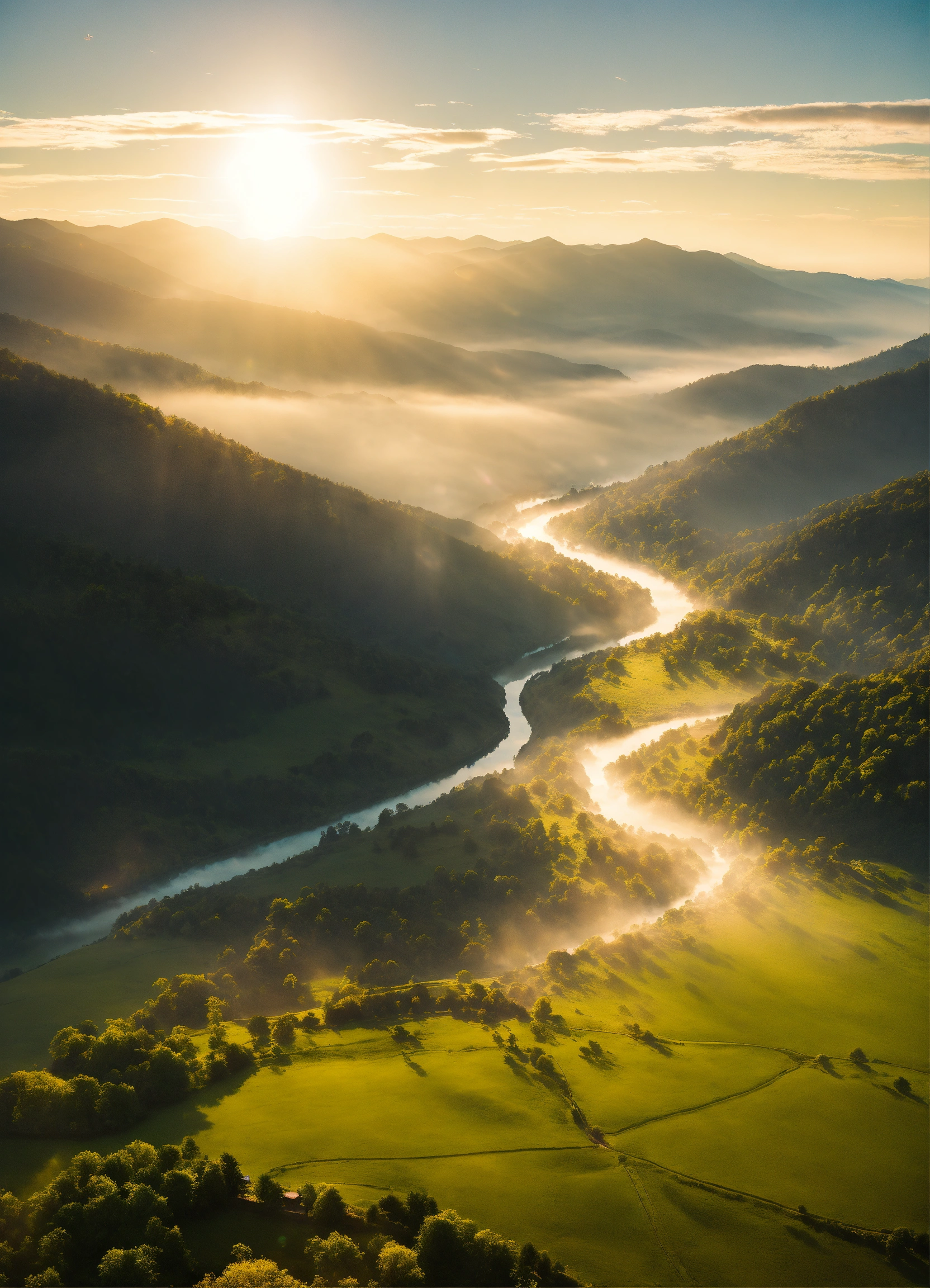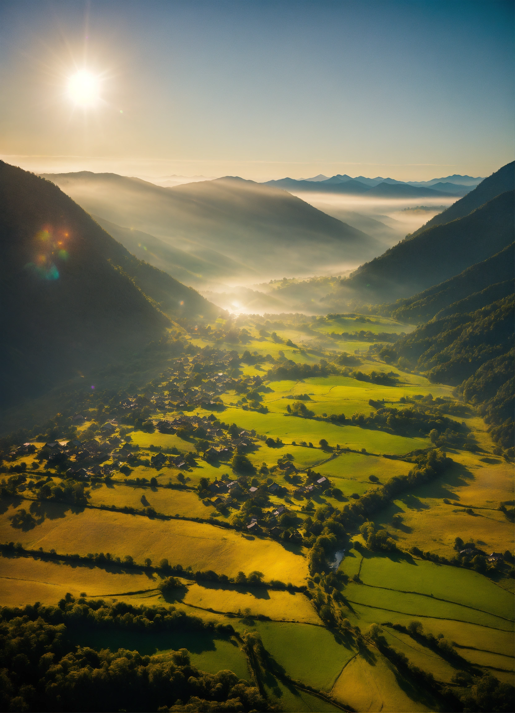 National geographic award winning drone photograph of a misty valley, mountains, bright light, film grain, lens flare, bright morning sky, kodachrome iso 200