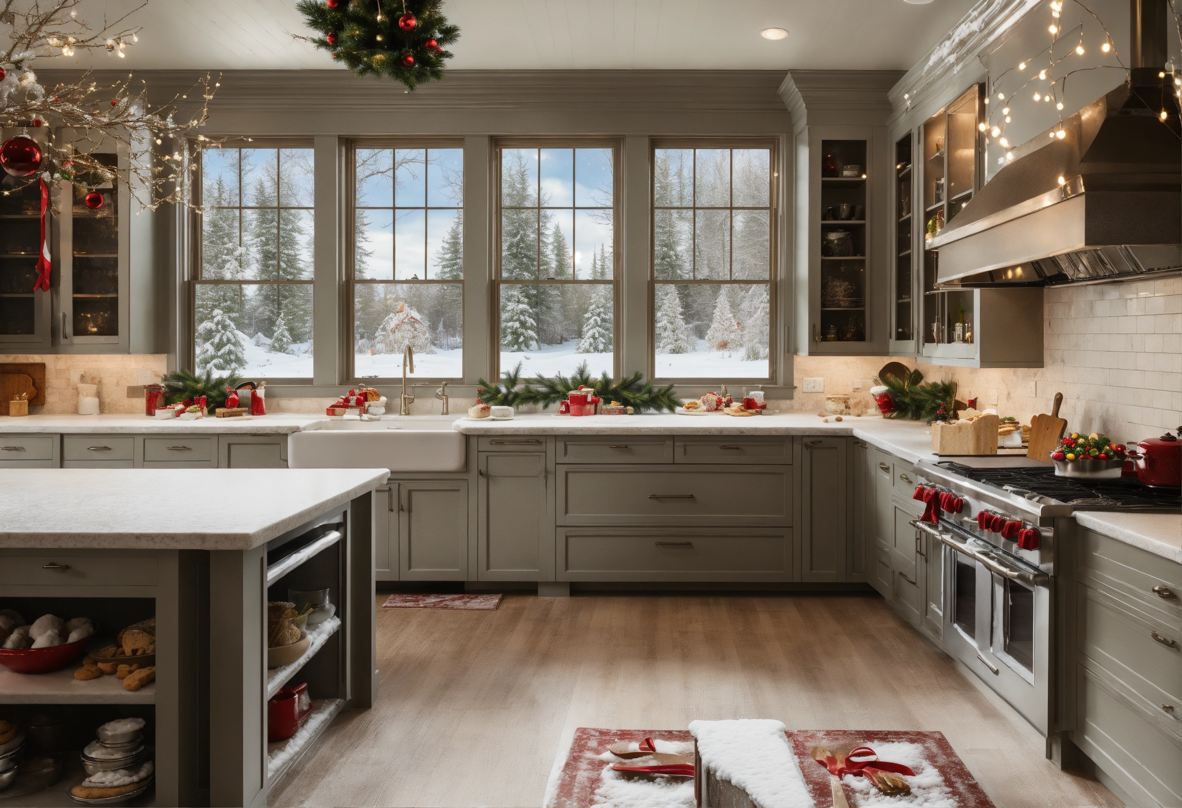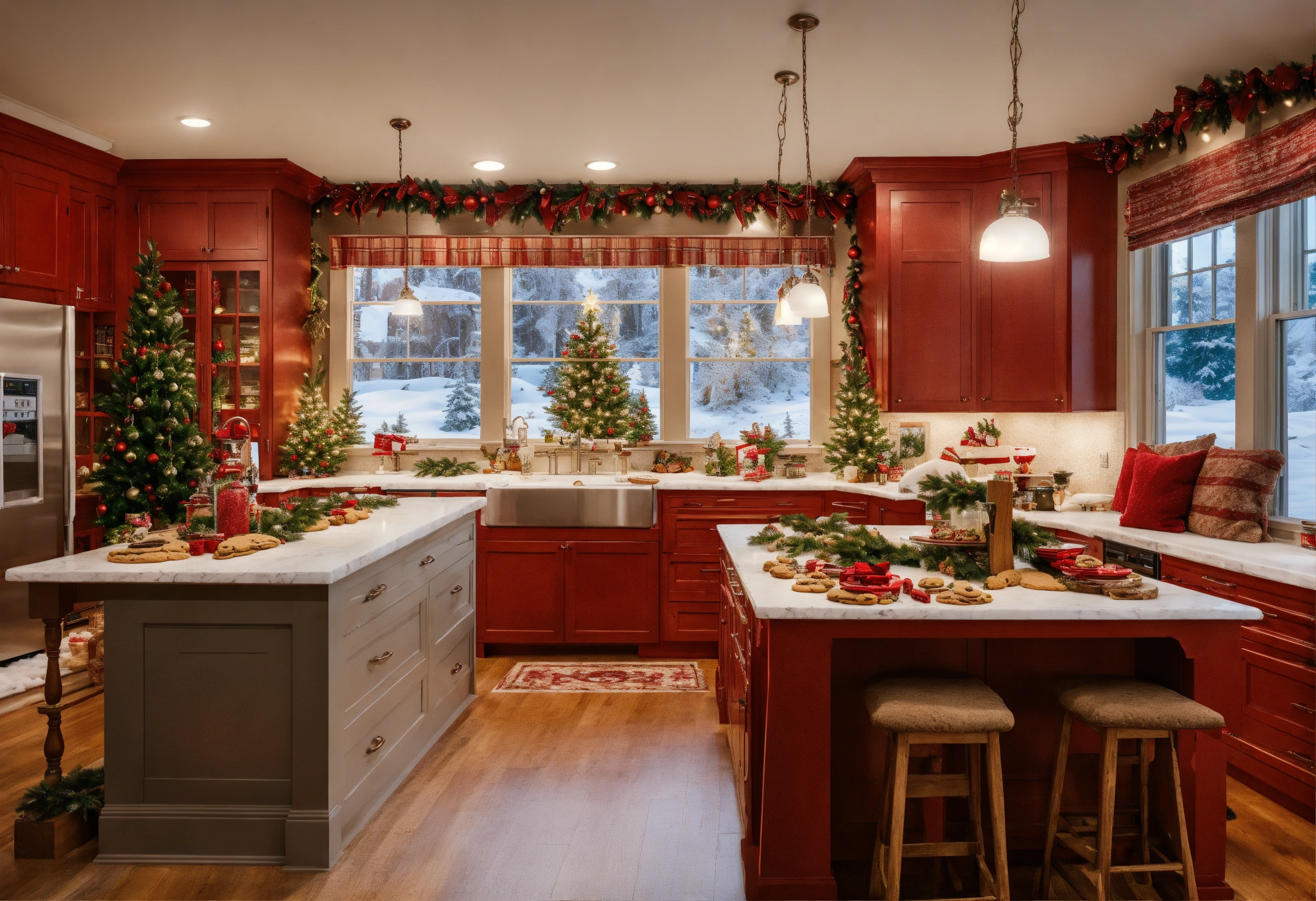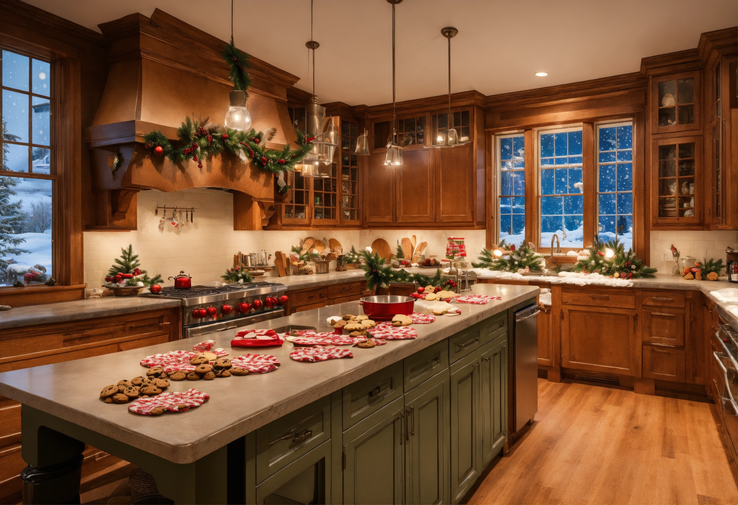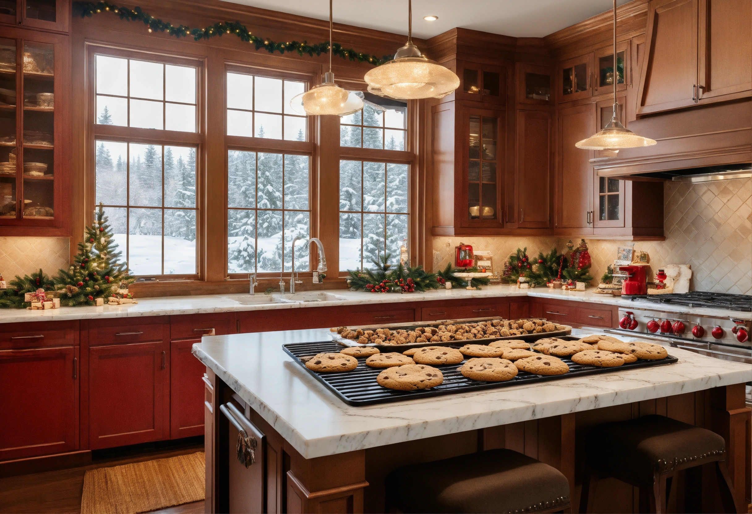 Beautiful christmas kitchen facing facing forward, messy counter with cookie sheet and cookies on island, windows in the back with snow on windows, island in the middle of kitchen, full image