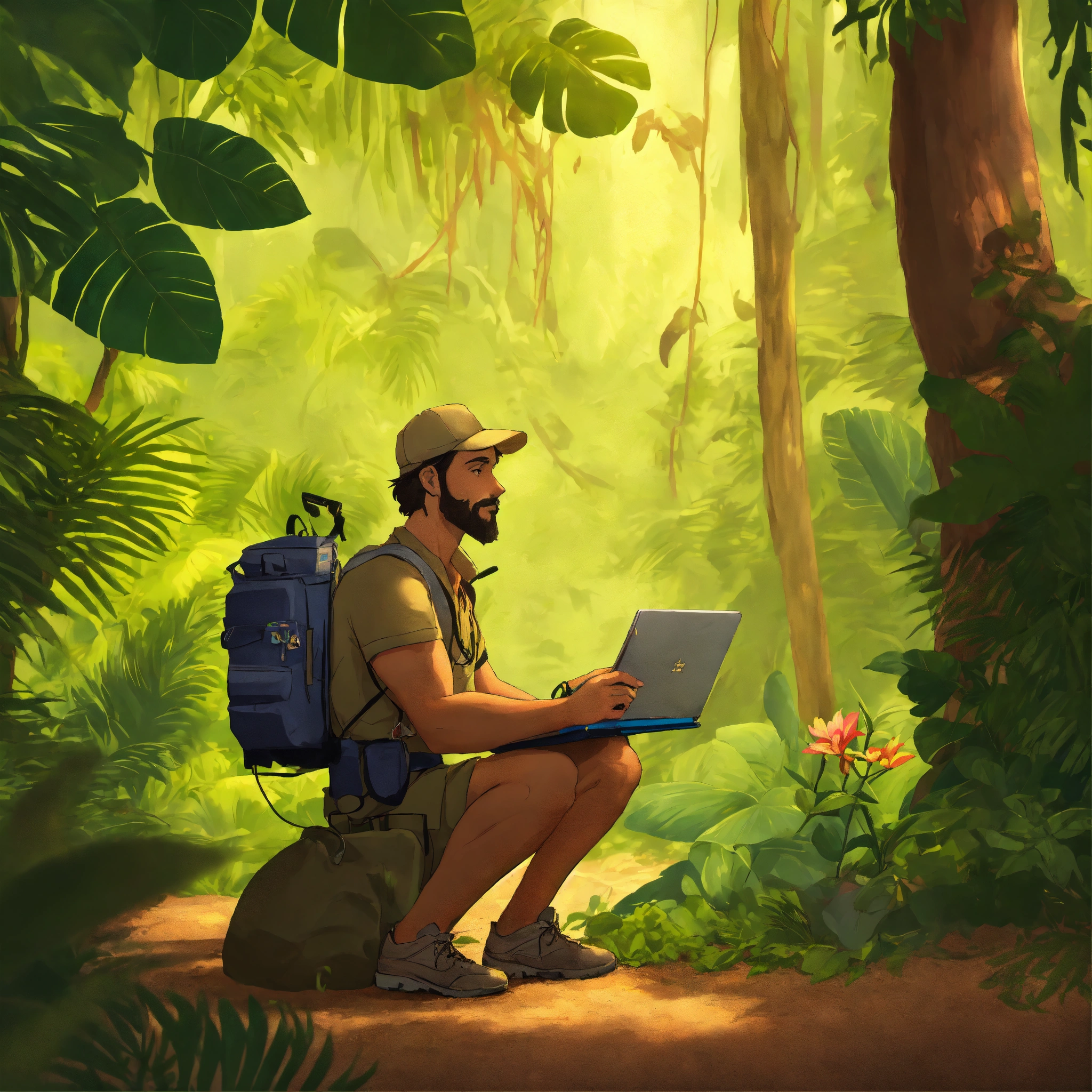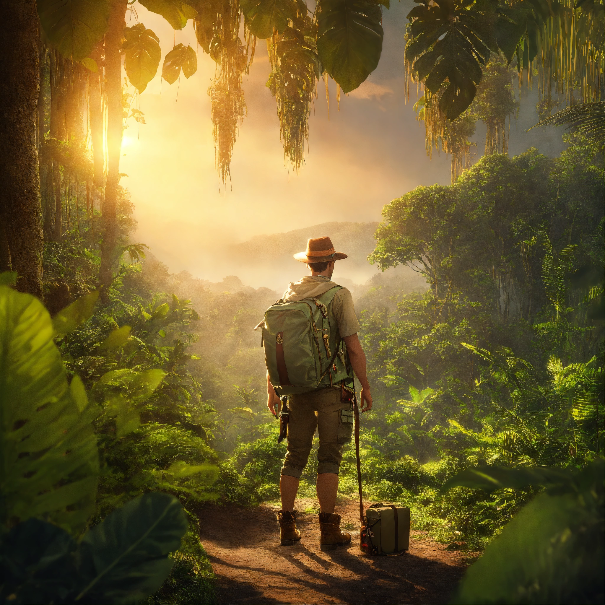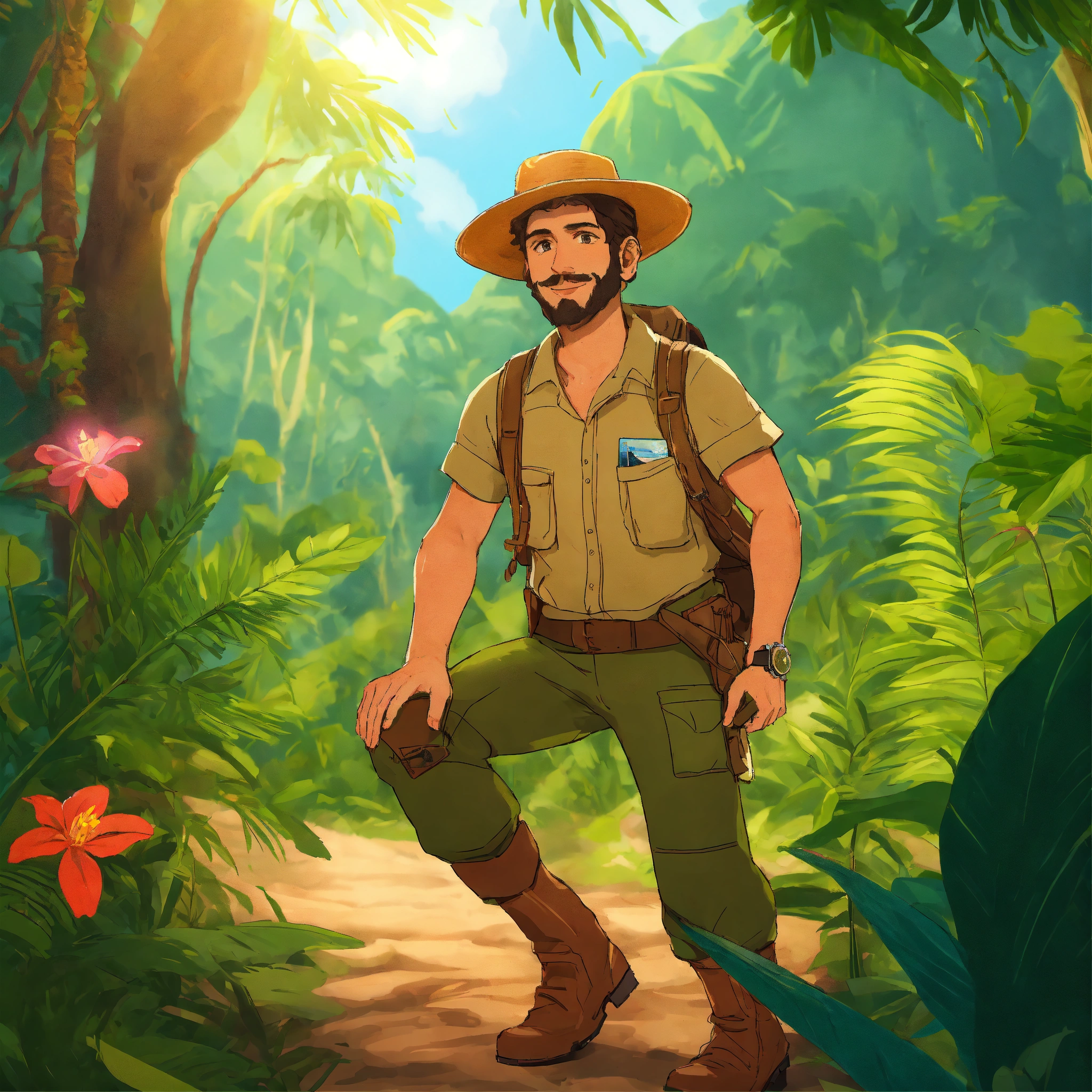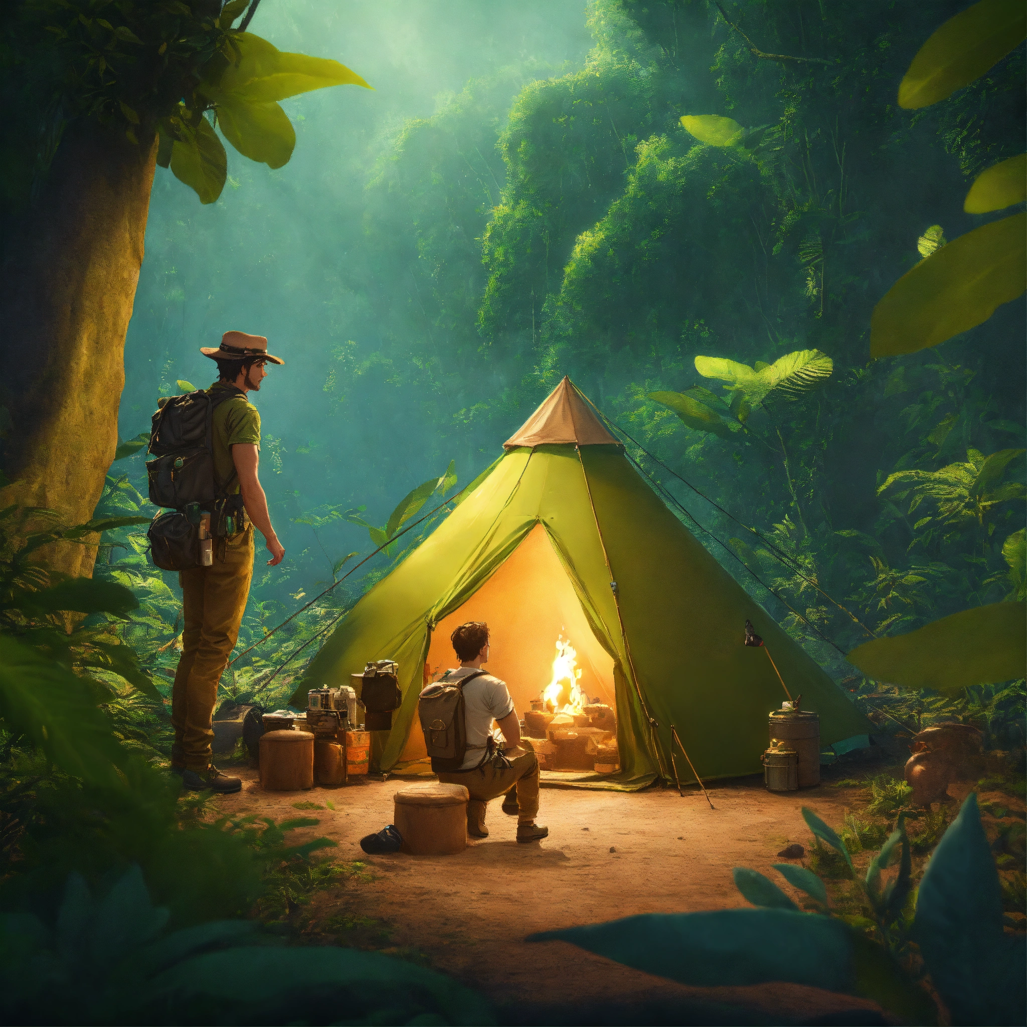 Personnage de film d'animation explorateur biologiste passionné par la faune et la flore, en arrière plan un camp d'explorateur dans une jungle luxuriante