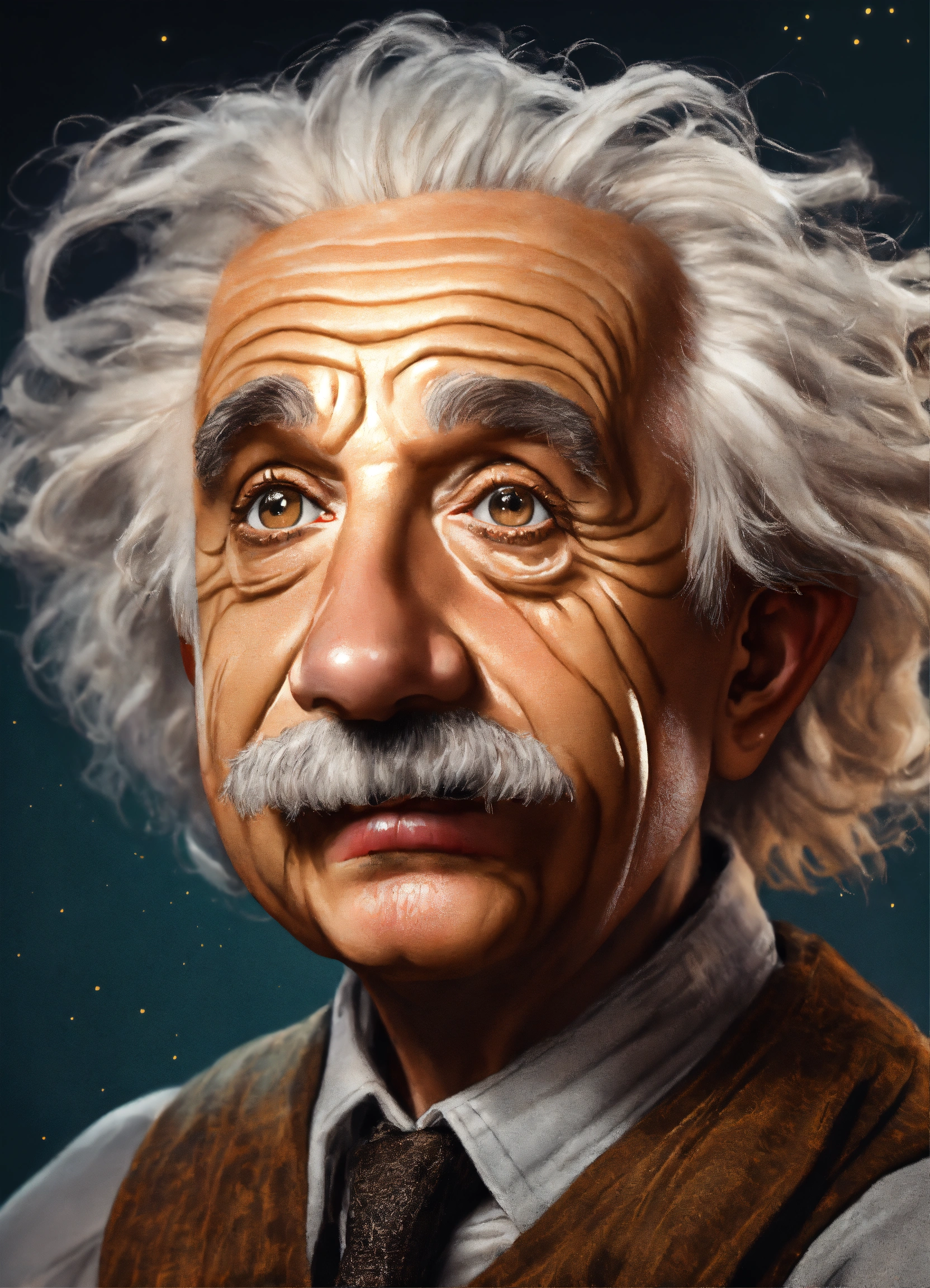 A rough but fully colored portrait sketch of an hillarious and exxagerated cartoon albert einstein with brown eyes and white hair, he has a very very very very unrealistic and funny and surreal and overdone big head and and a thin neck and a very very thin little body, inspired by chibi and kim possible and butcher billy and photos of freud, intricate details, hyperdetailed, perfect quality, very detailed, 8k, high resolution, inticrate details, detailed textures, sharp focus, ultra-high pixel detail, intricate, high-quality, incredibly detailed, masterpiece, ultra-detailed, professional photography, zoom, reduced color palette, closed mouth