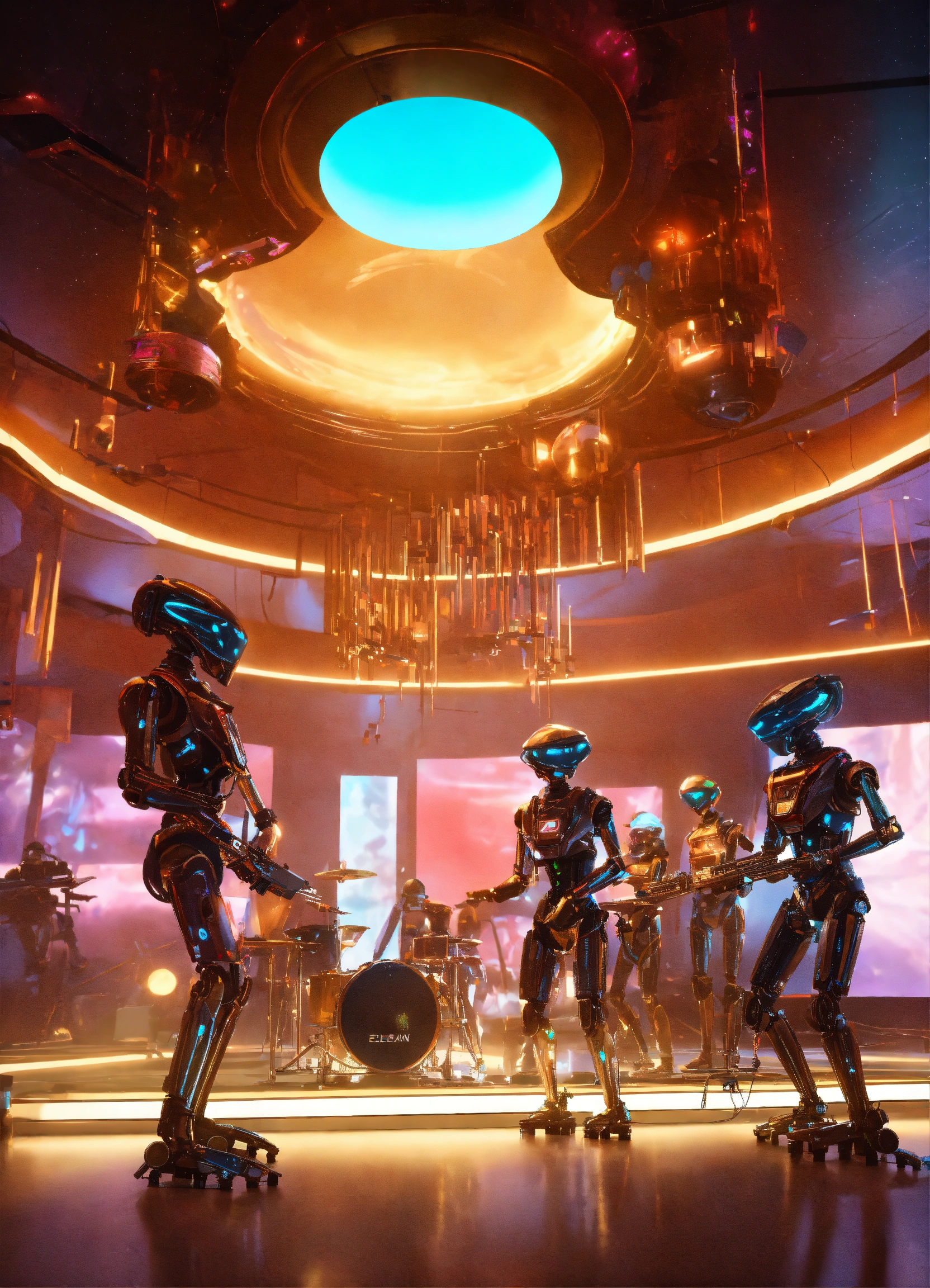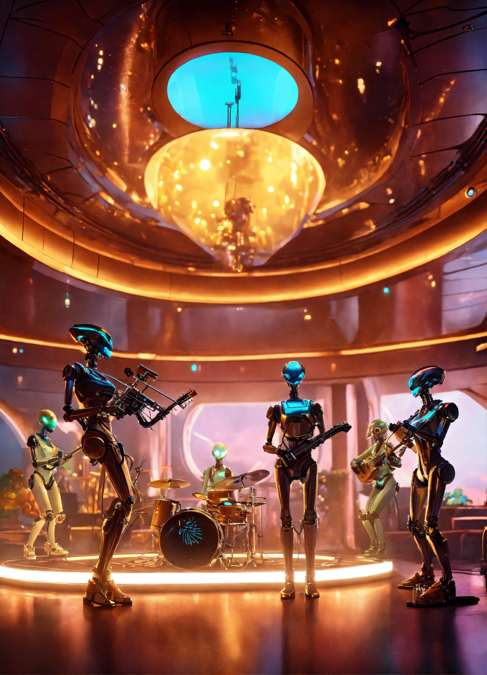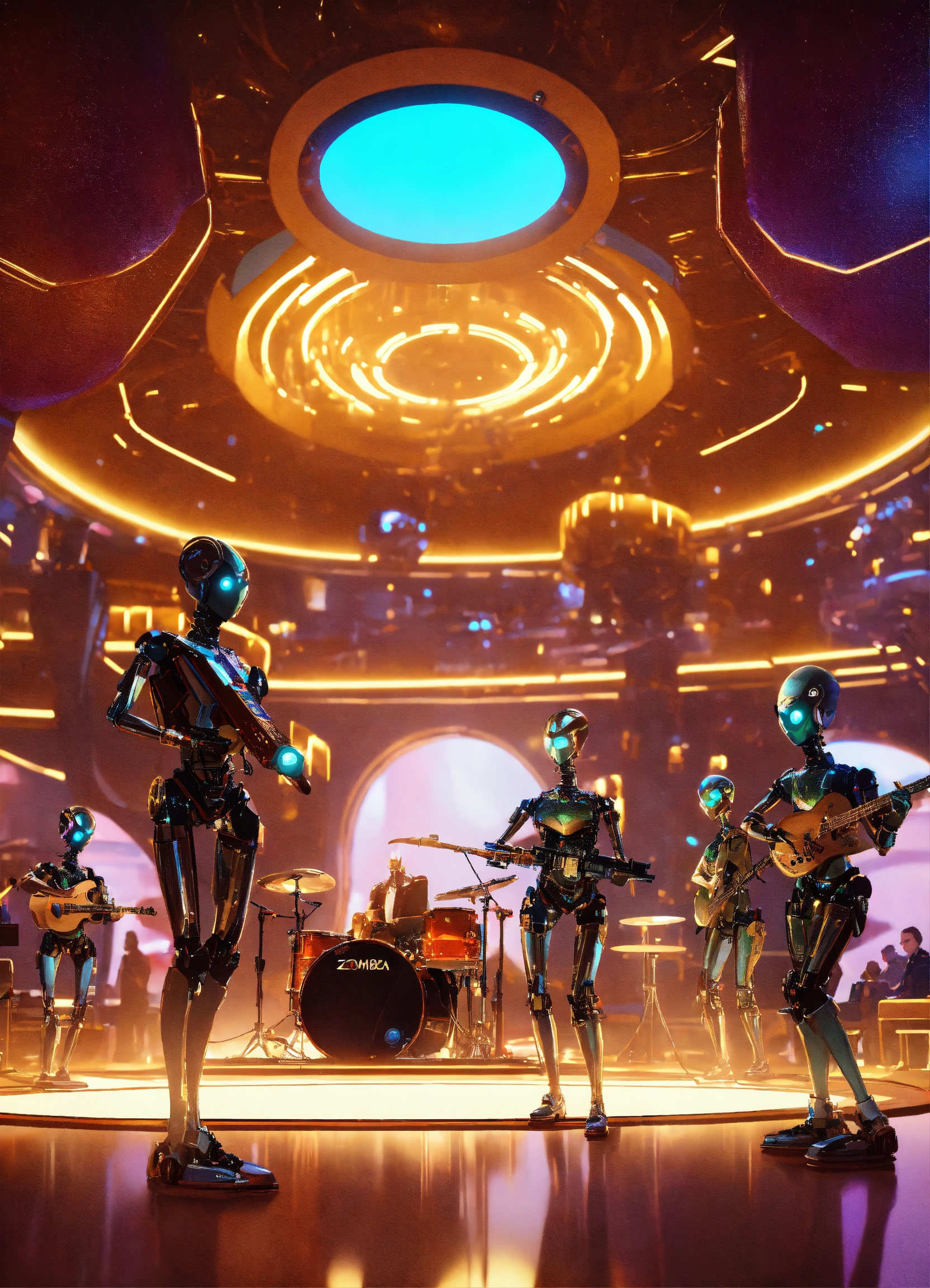 Band of 4 robot musicians with alien electric instruments playing hypnotic music on stage to a crowd of zombie like people in a luxury space port lounge reception area, realistic, futuristic, sci-fi, 8k, unreal engine, pixar, disney, zaha hadid