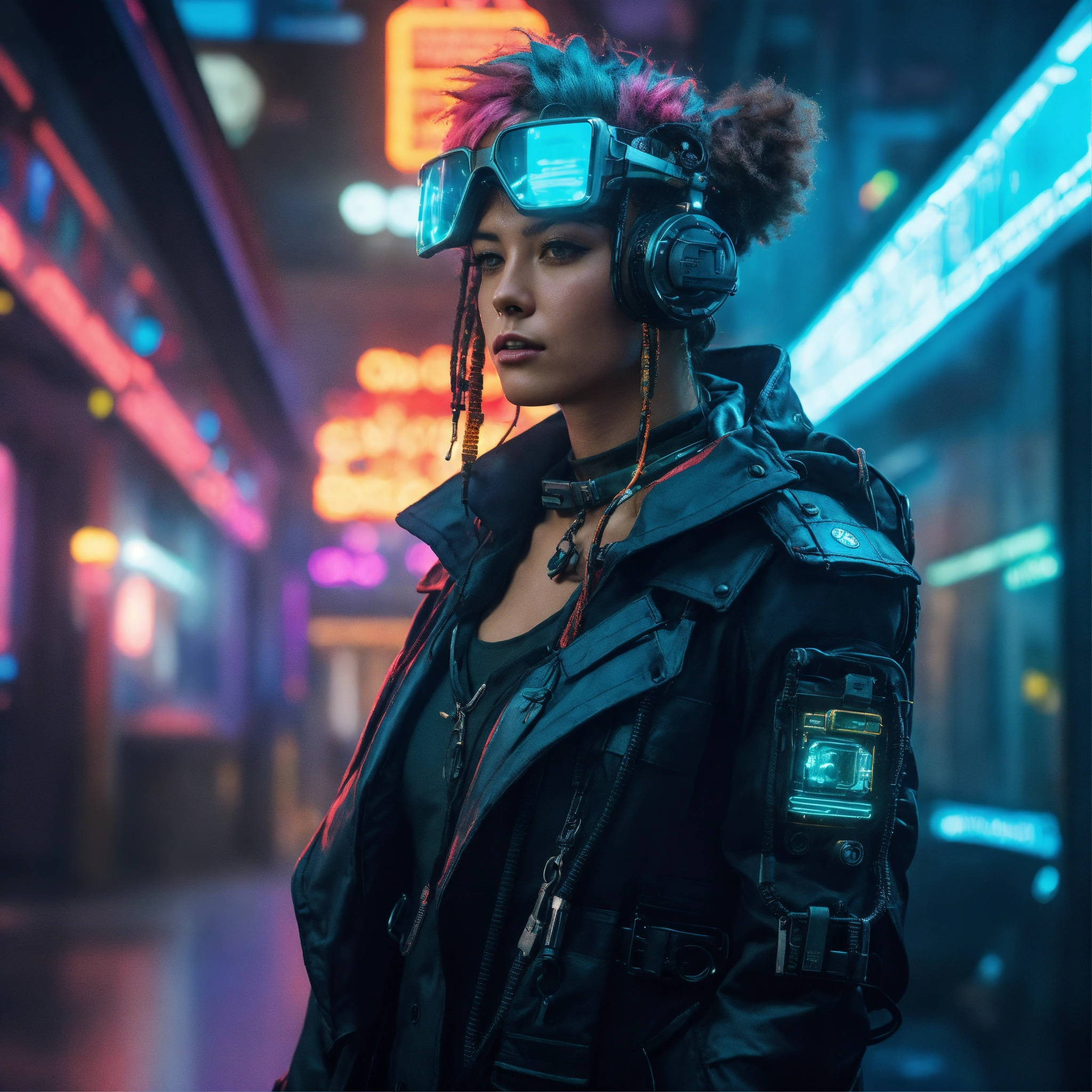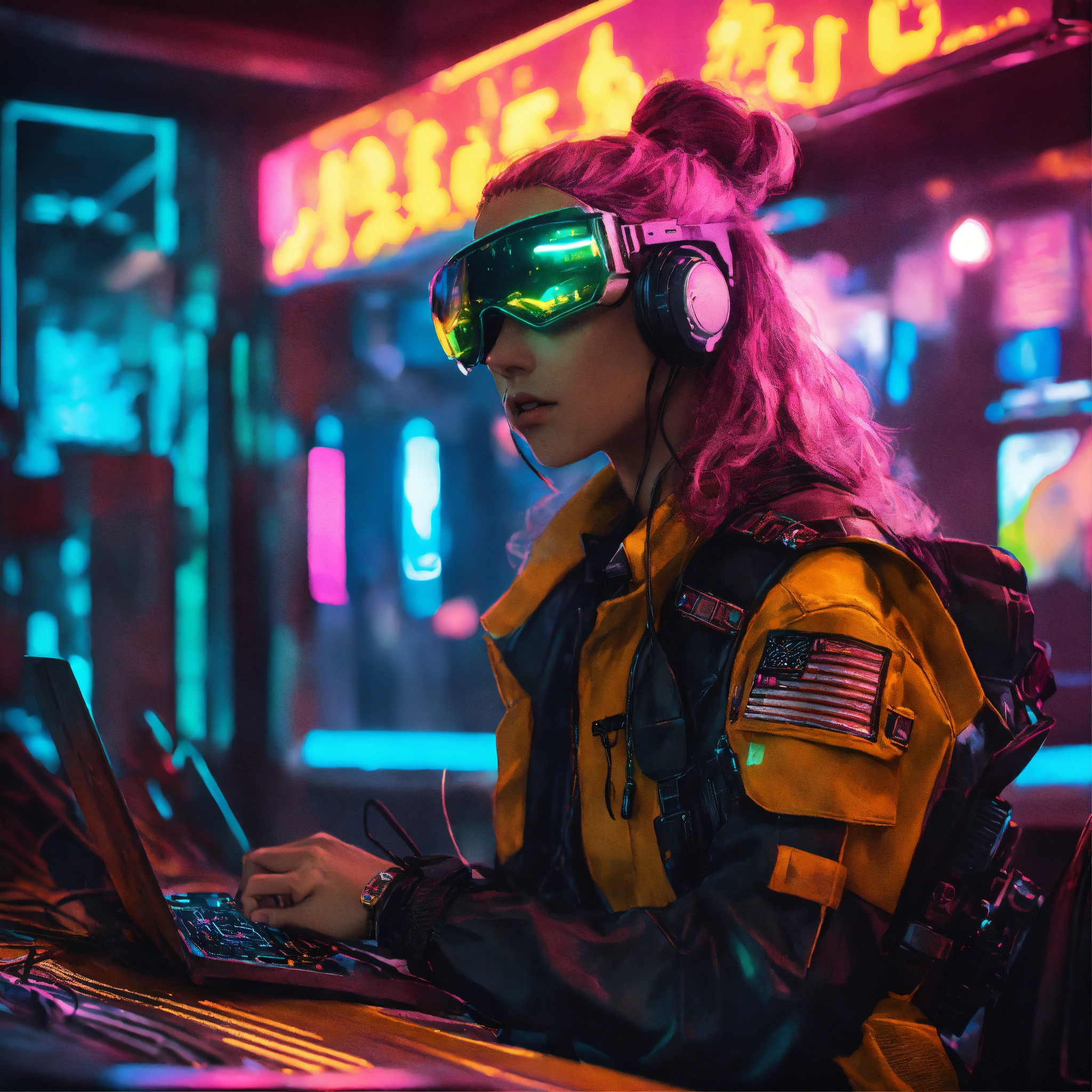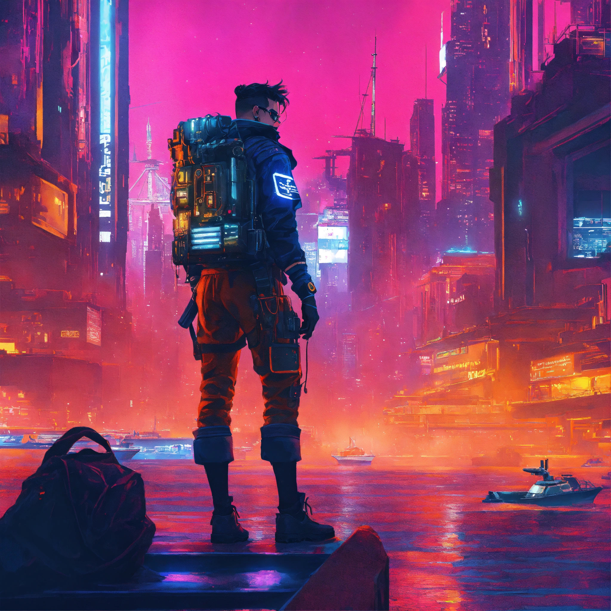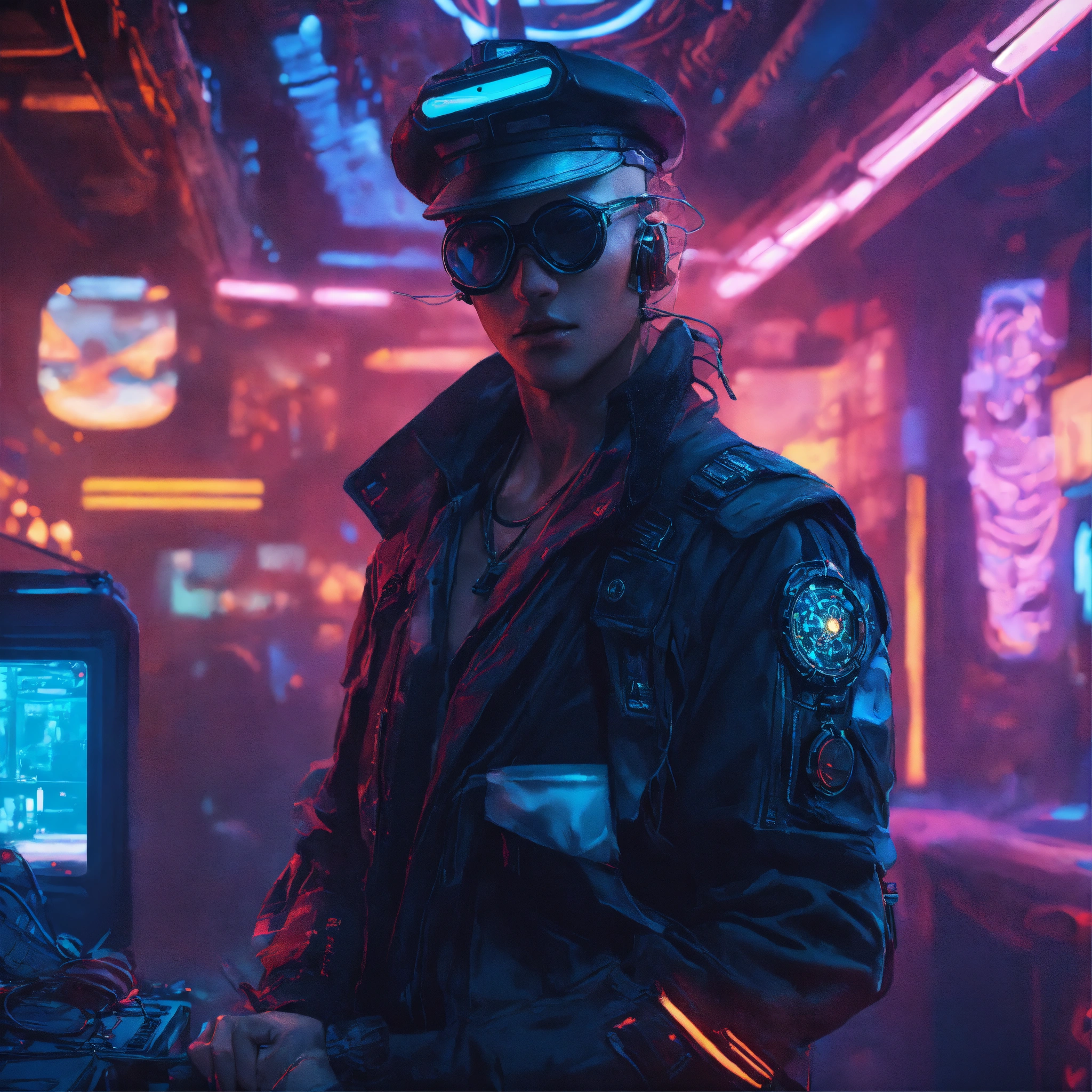Create a stunning image of a cyberpunk aesthetic sailor character using resources available on the internet. the character should exude the rugged charm of a classic sailor while incorporating modern cyberpunk elements. find images of traditional sailors, making sure they evoke the timeless spirit of the sea. then, incorporate images of futuristic maritime or urban landscapes, neon lights, advanced technological elements, augmented reality, or other cyberpunk aesthetic components to transform the backdrop. ensure that the resulting image is both harmonious and captivating, with remarkable details and a clever play of color and lighting. the sailor should be the central focus, seamlessly integrating with the cyberpunk environment. the result should be an image that combines the tradition of seafaring with the innovation of cyberpunk, capturing the essence of adventure and intrigue.