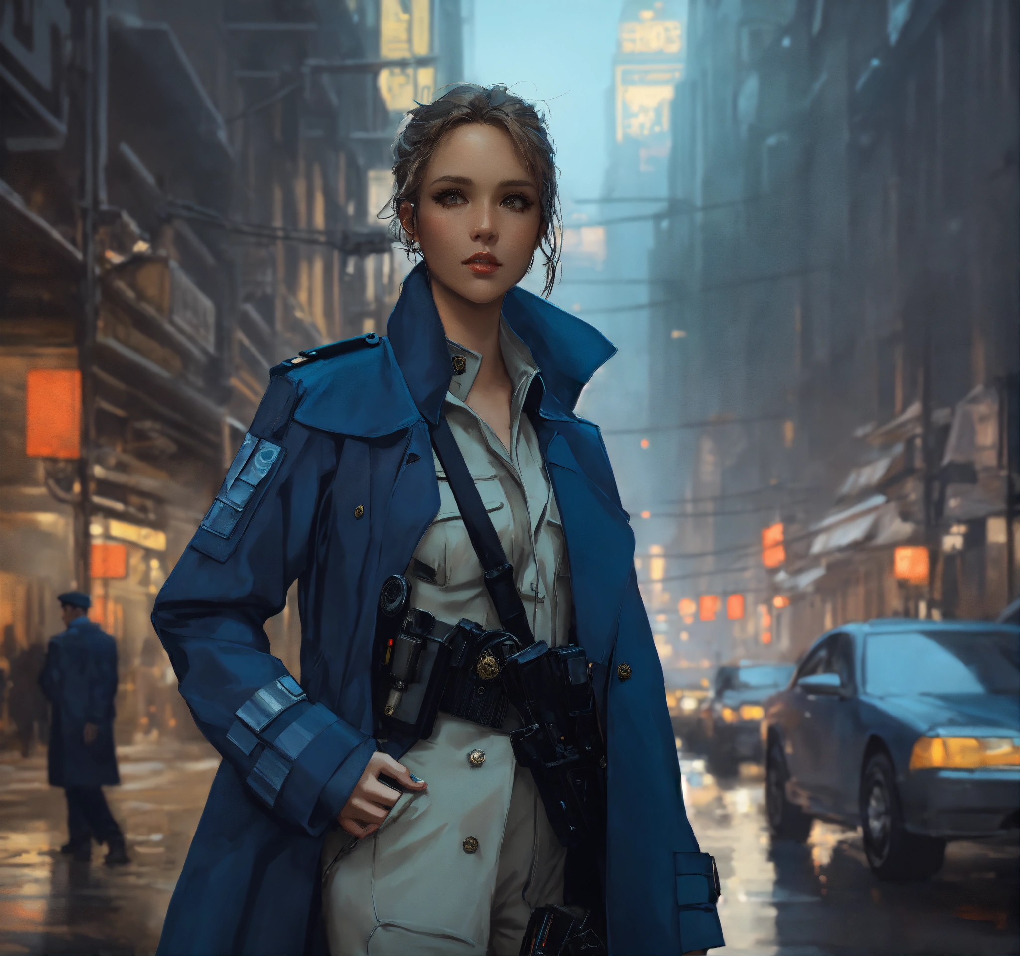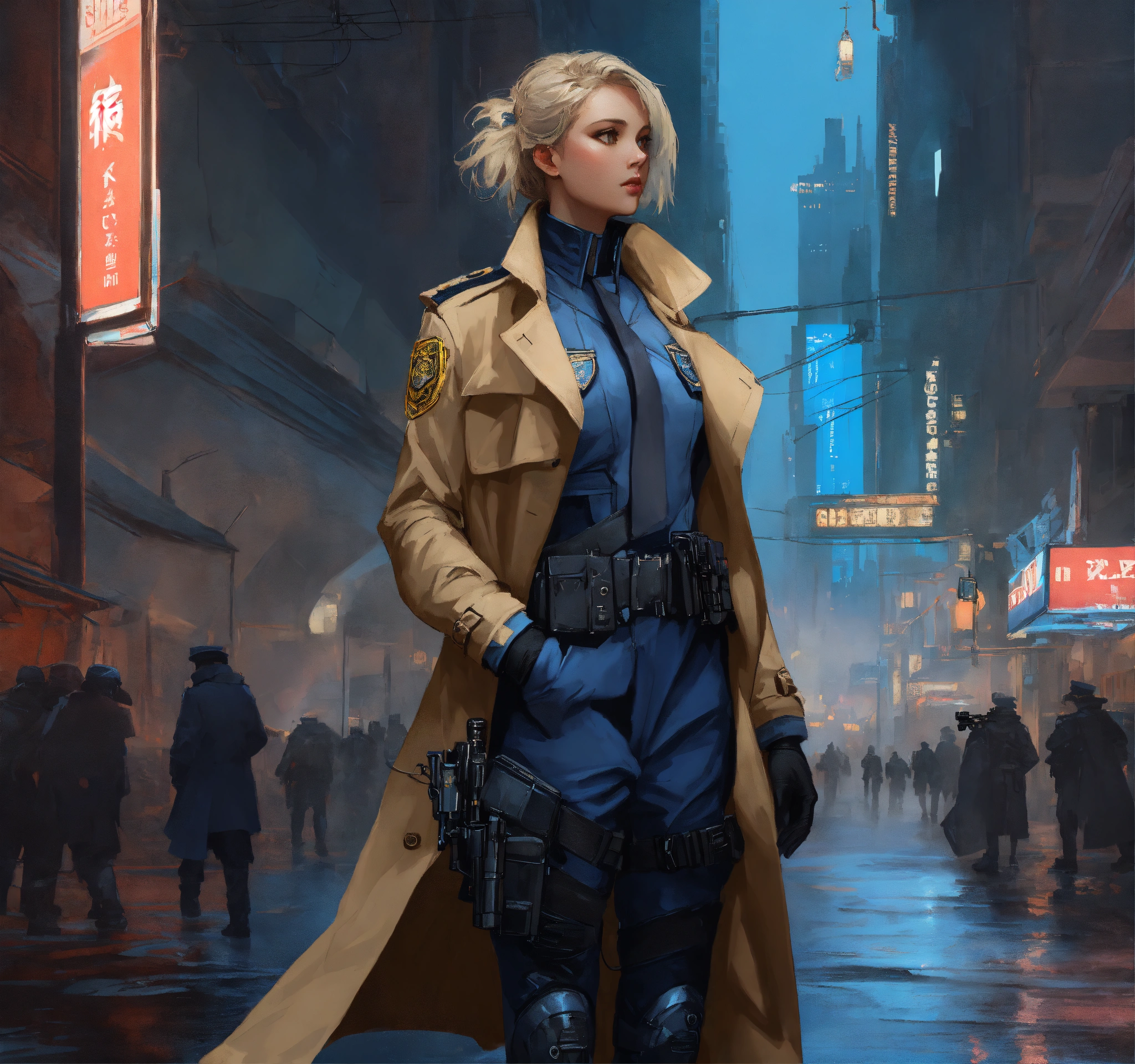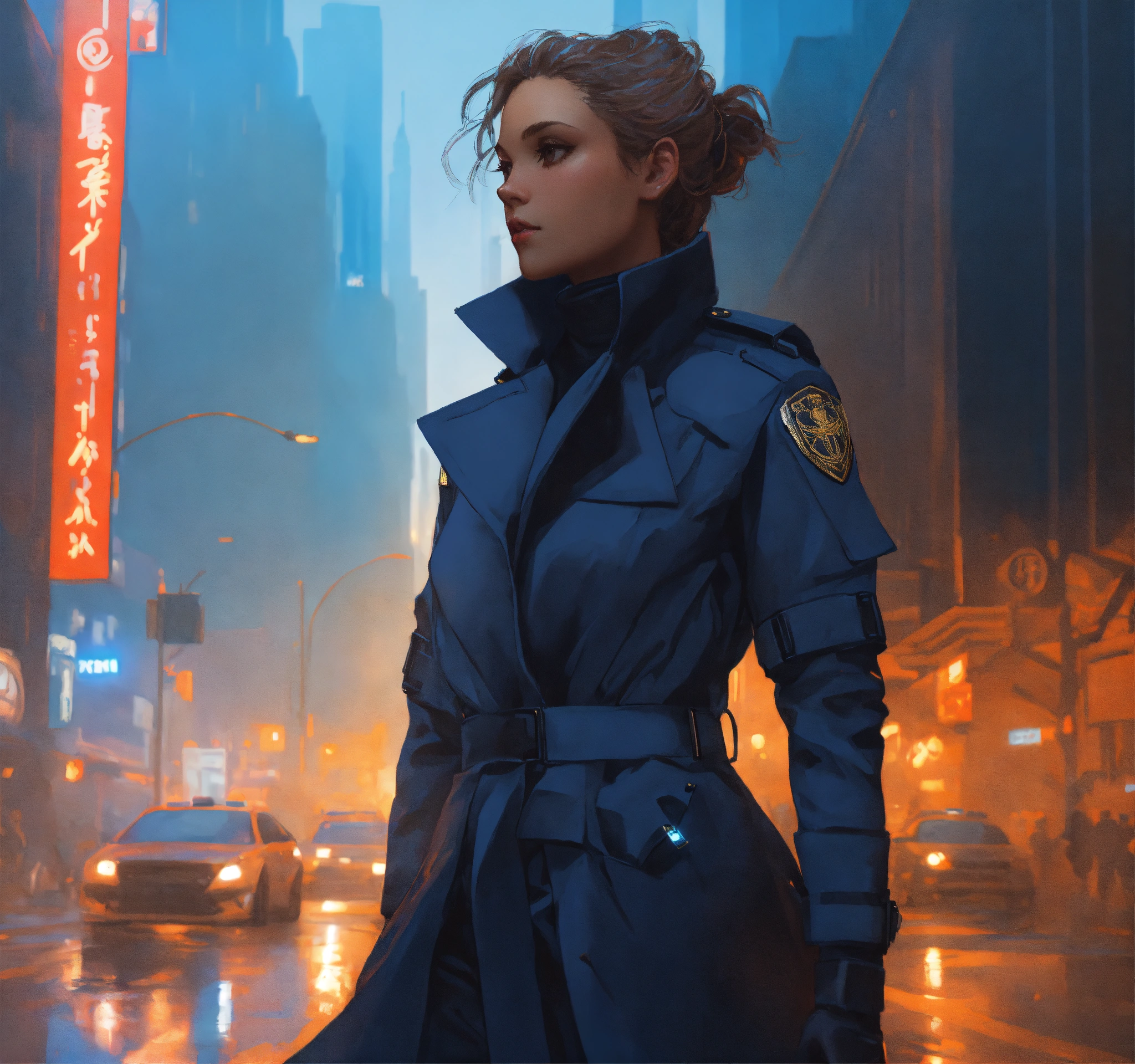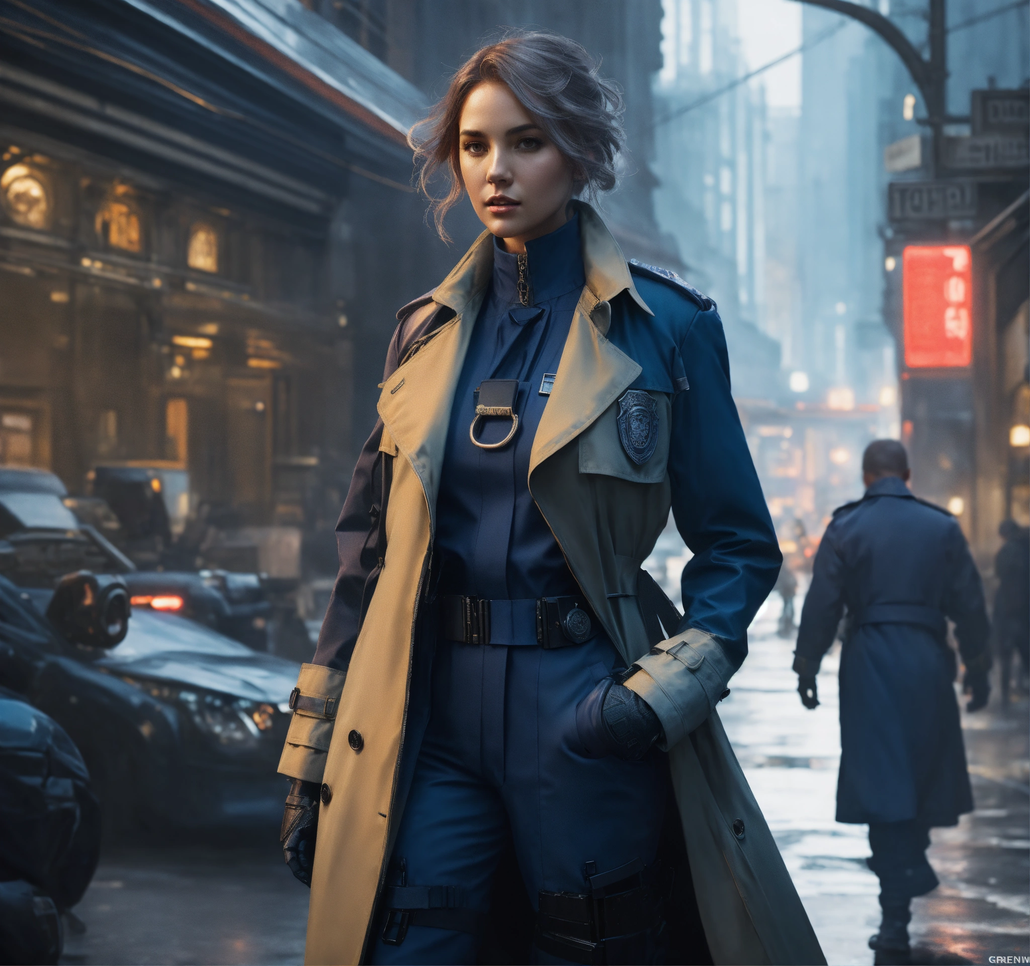 Female cop wearing a light light navy blue exo suit and trench coat, dark dystopian city, greg rutkowski, alphonse mucha, wlop