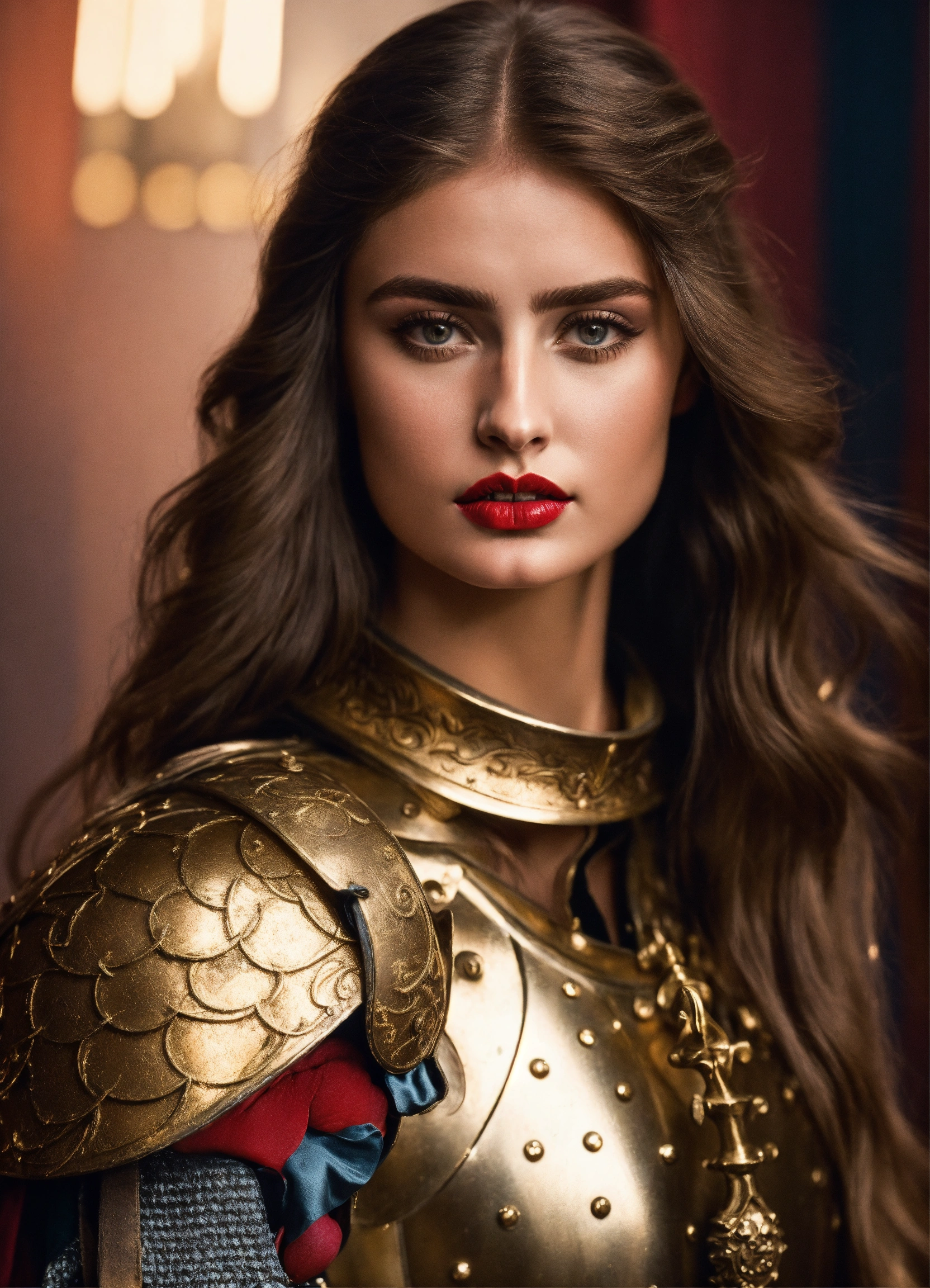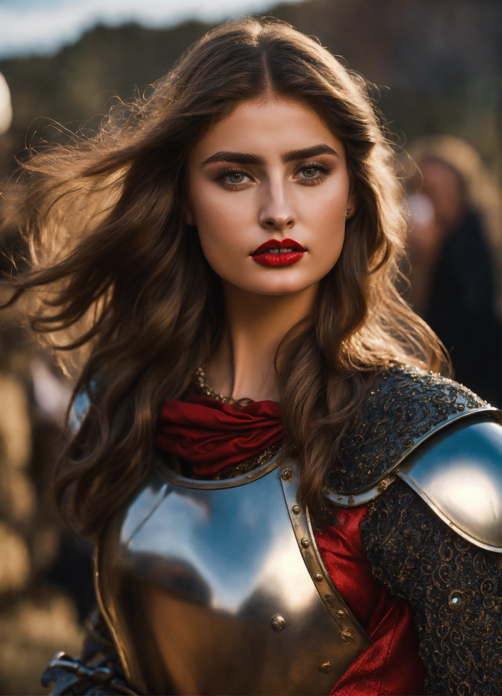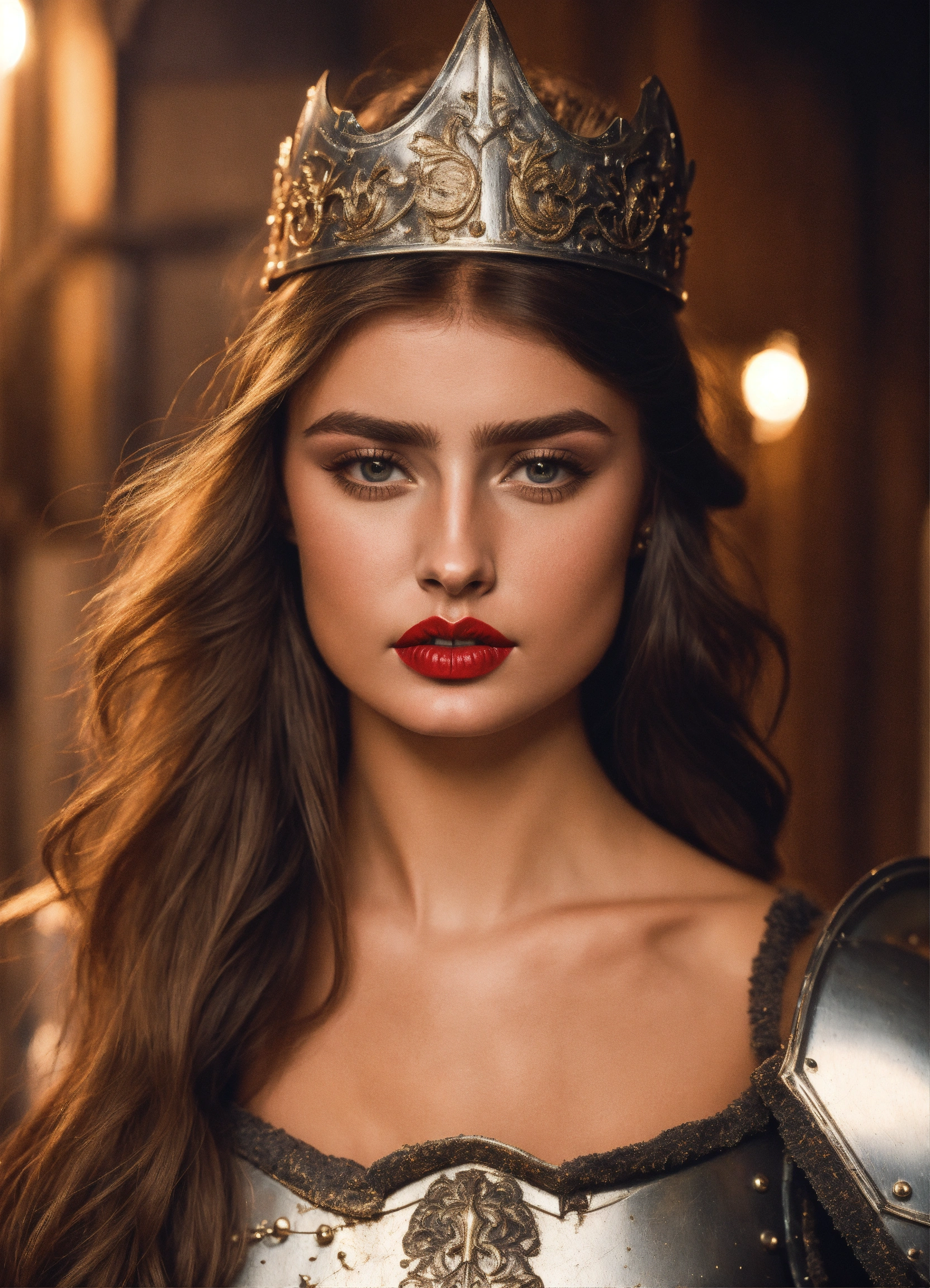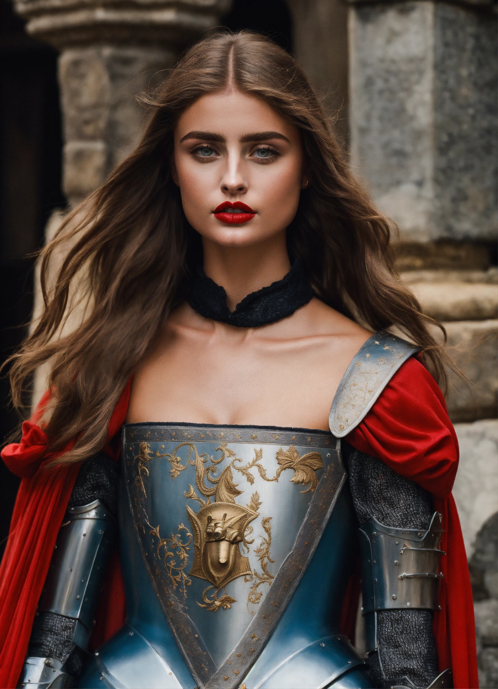 Photo quality portrait of taylor hill as a mediaeval knight in shining armor with flowing hair, red lips and a stern expression