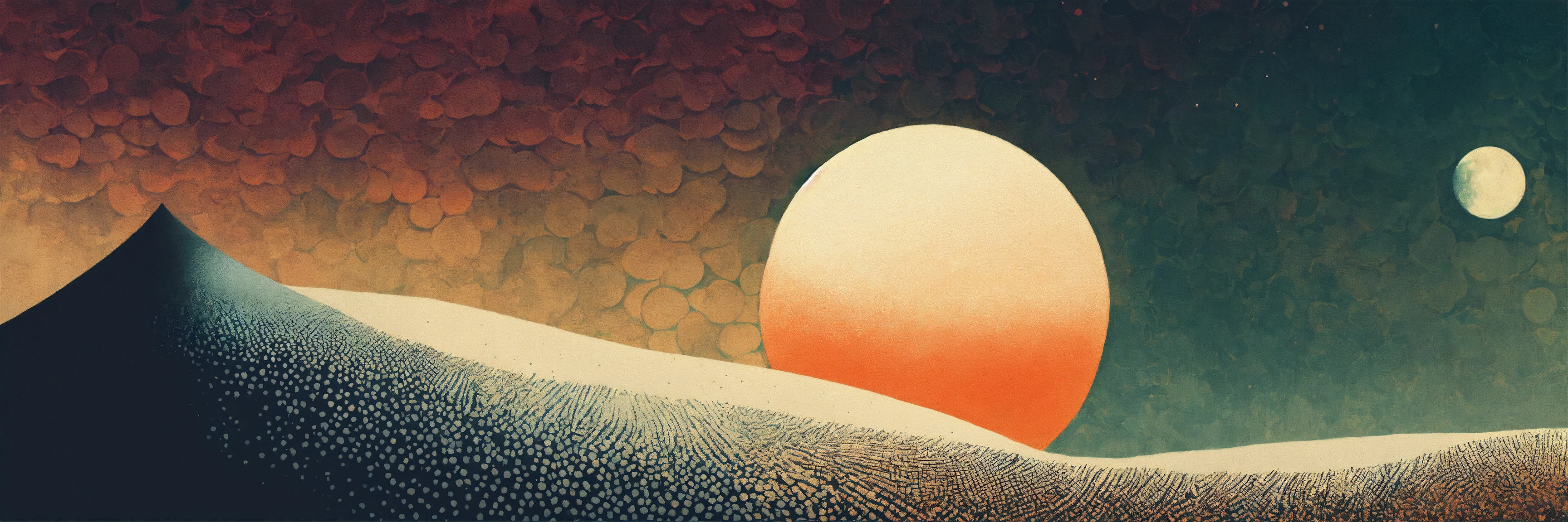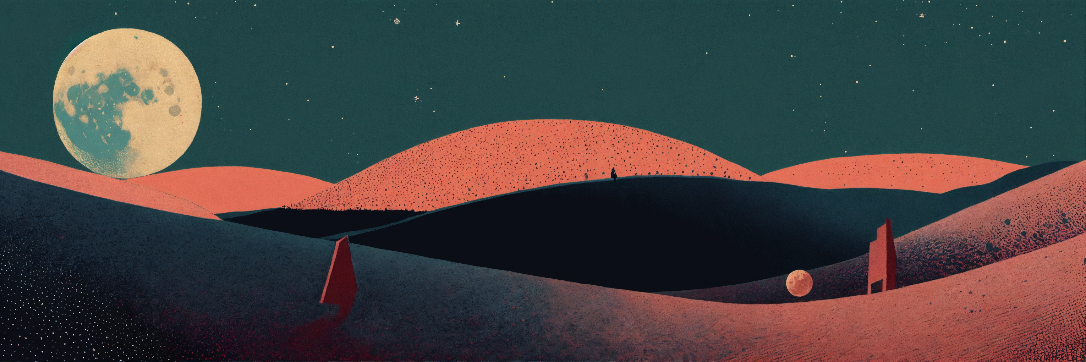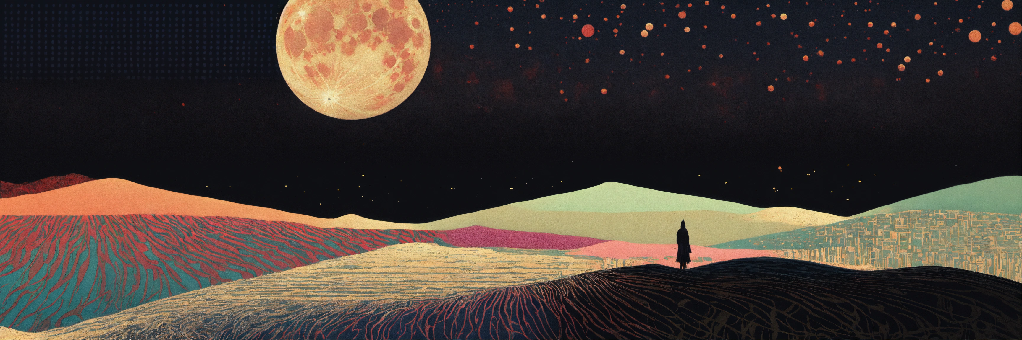 Moon profile + halftone pattern + editorial illustration of the memento morti + higly textured, genre defining mixed media collage painting + fringe absurdism + award winning halftone pattern illustration + simple flowing shapes + subtle shadows + paper texture + minimalist color scheme + inspired by zdzisław beksiński.