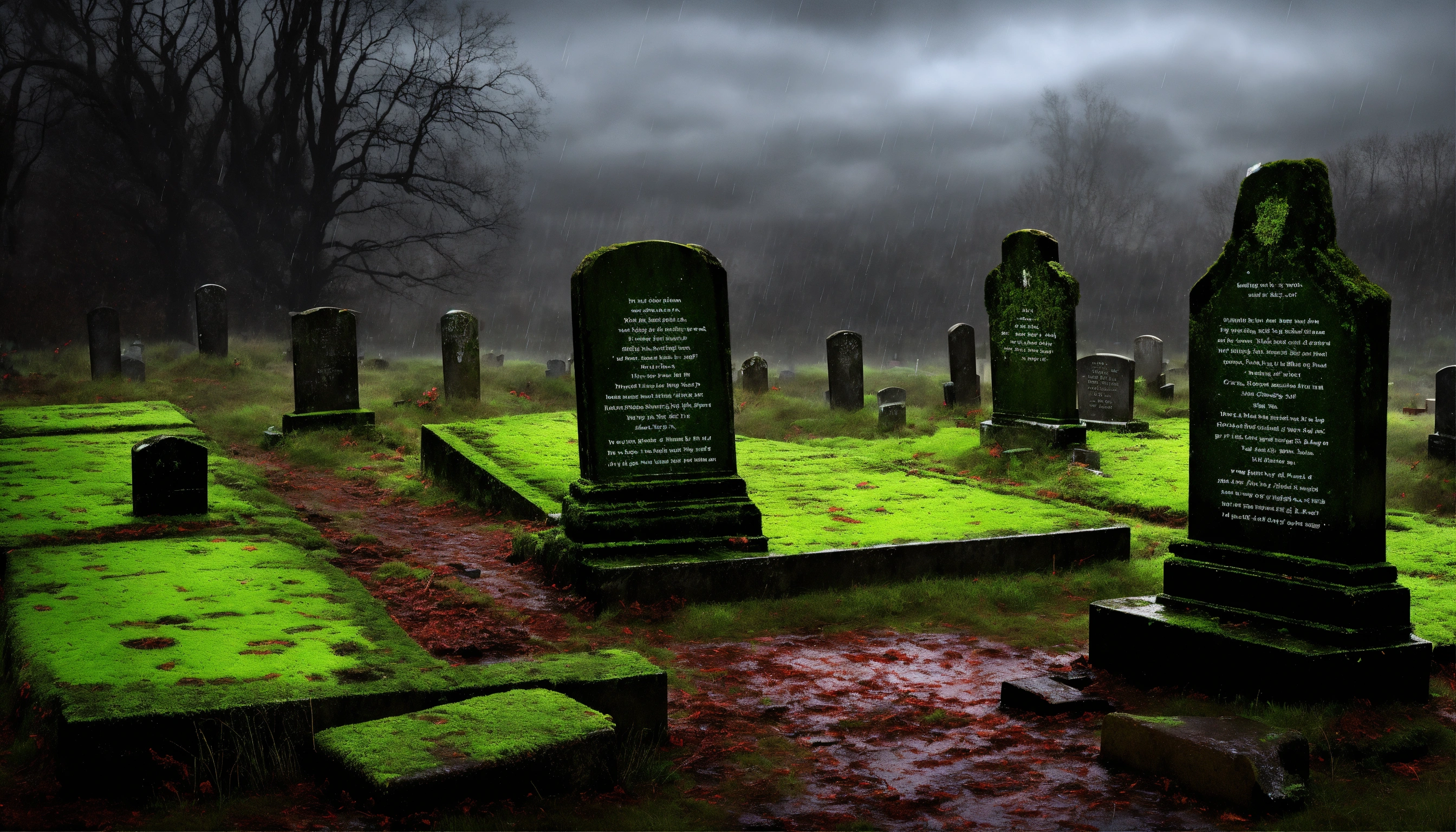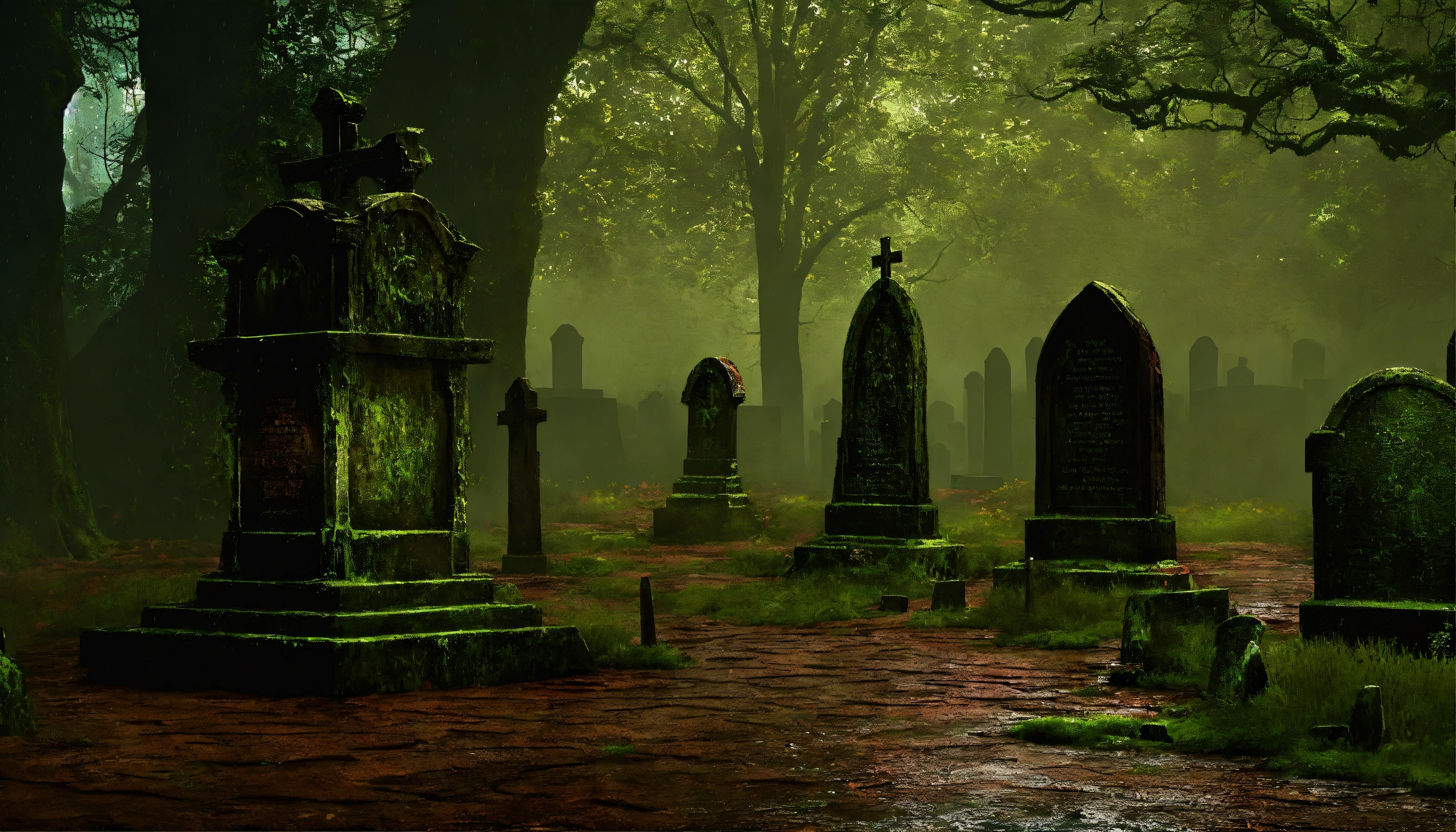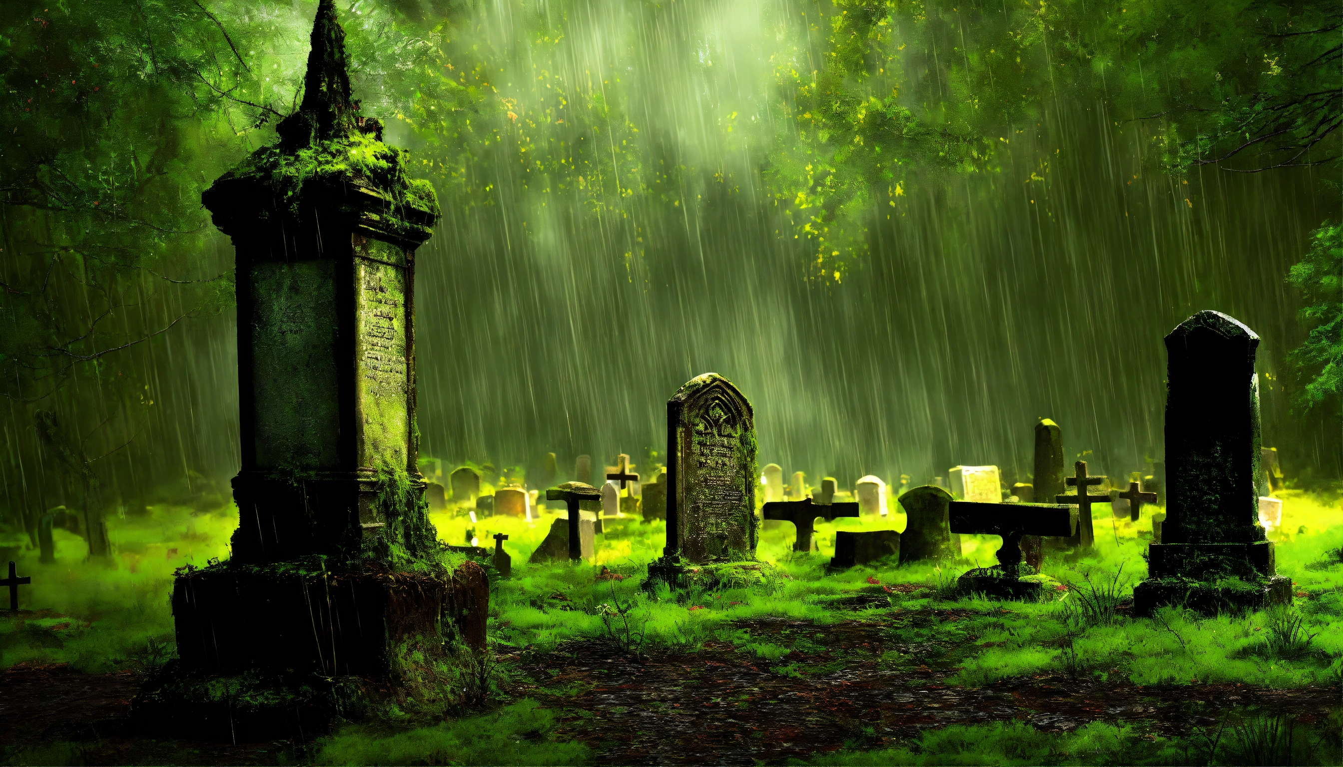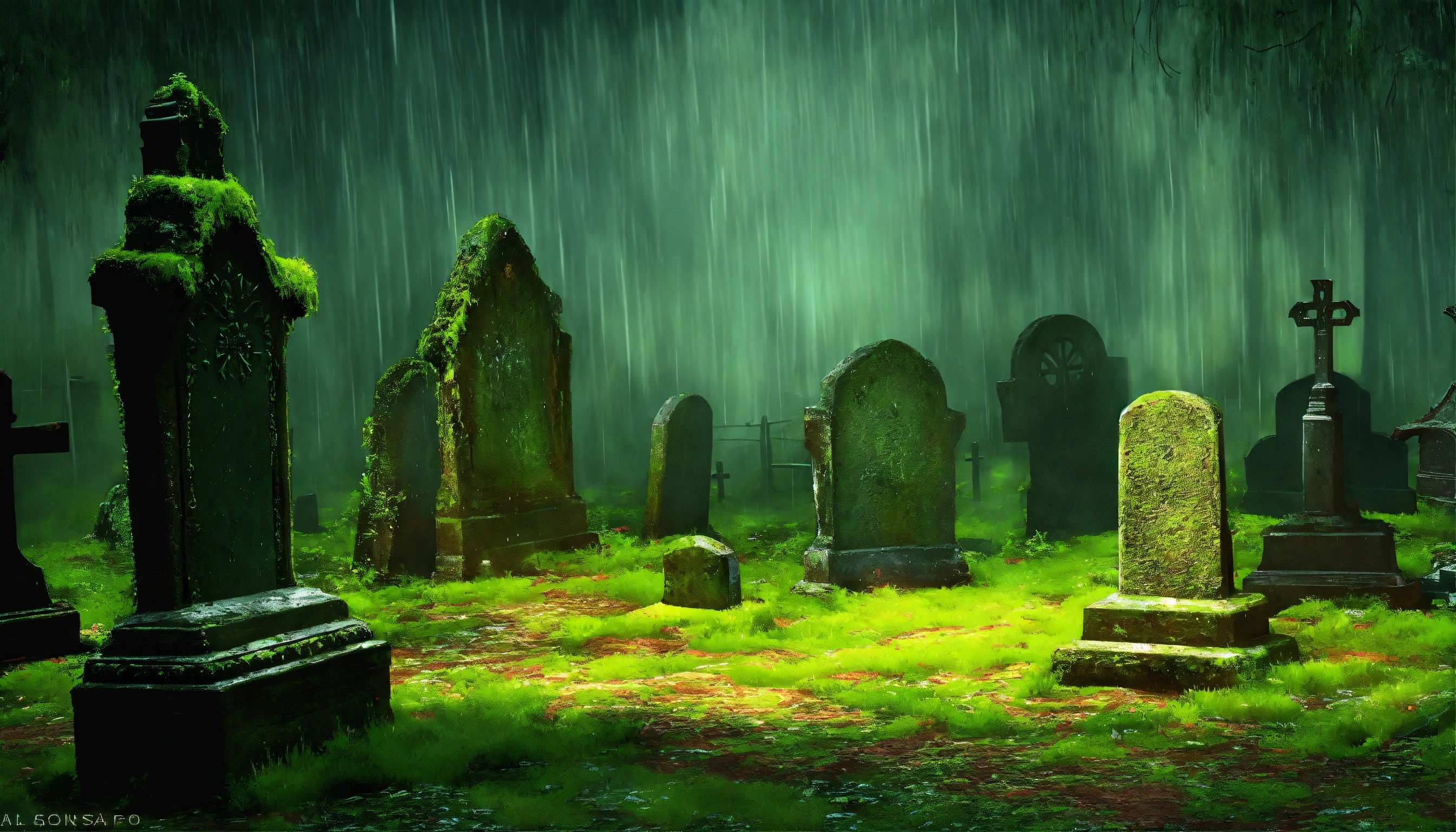 Old mossy gravestones on a spucky dark gravejard in the rain digital art