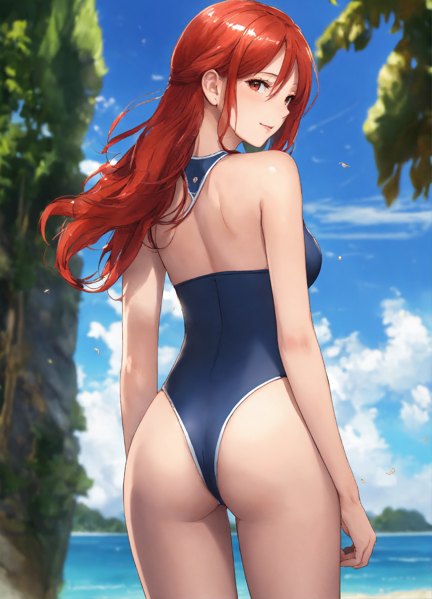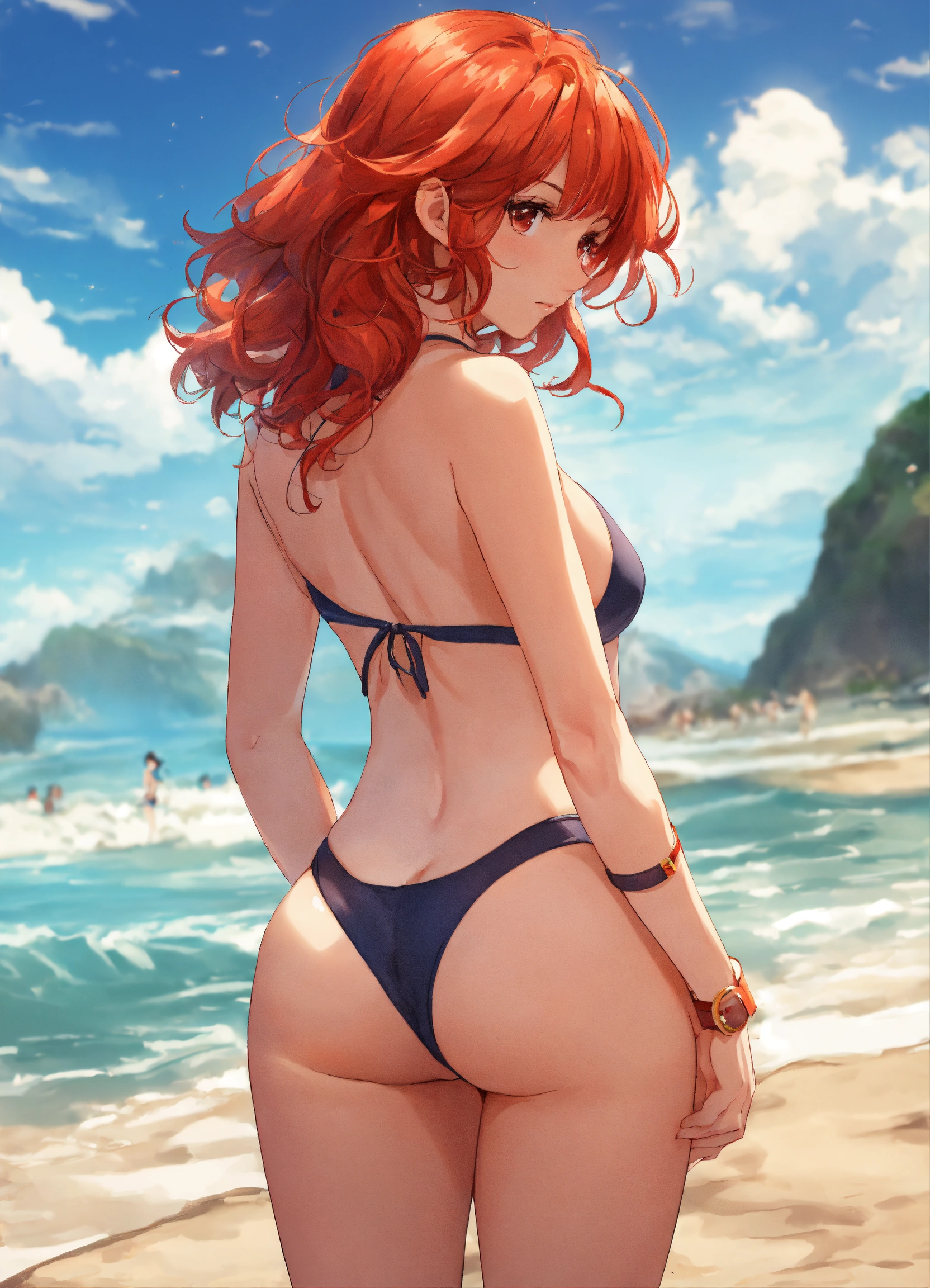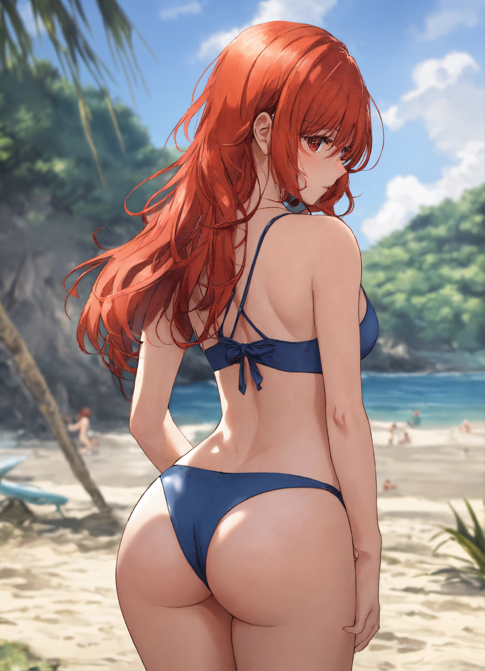 A beautiful red-headed woman wearing a swimsuit, back, big rear, realistic, anime style, beautiful, legs, beach, sunny